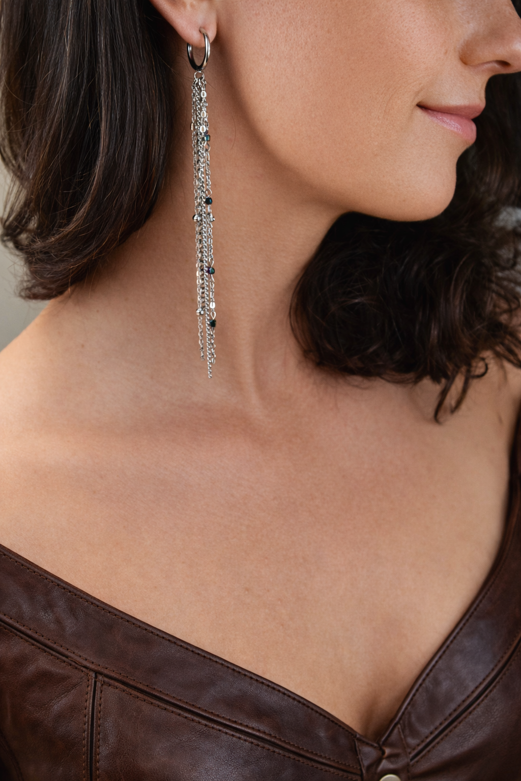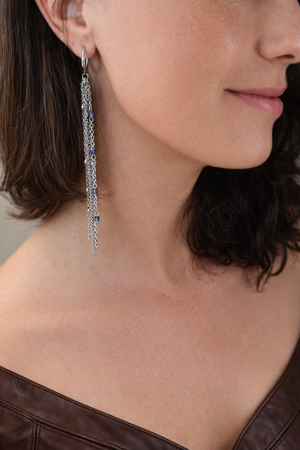 Diese langen silbernen Kettenohrringe mit Regenbogen-Details sind mutig, edgy und voller verspielter Energie.