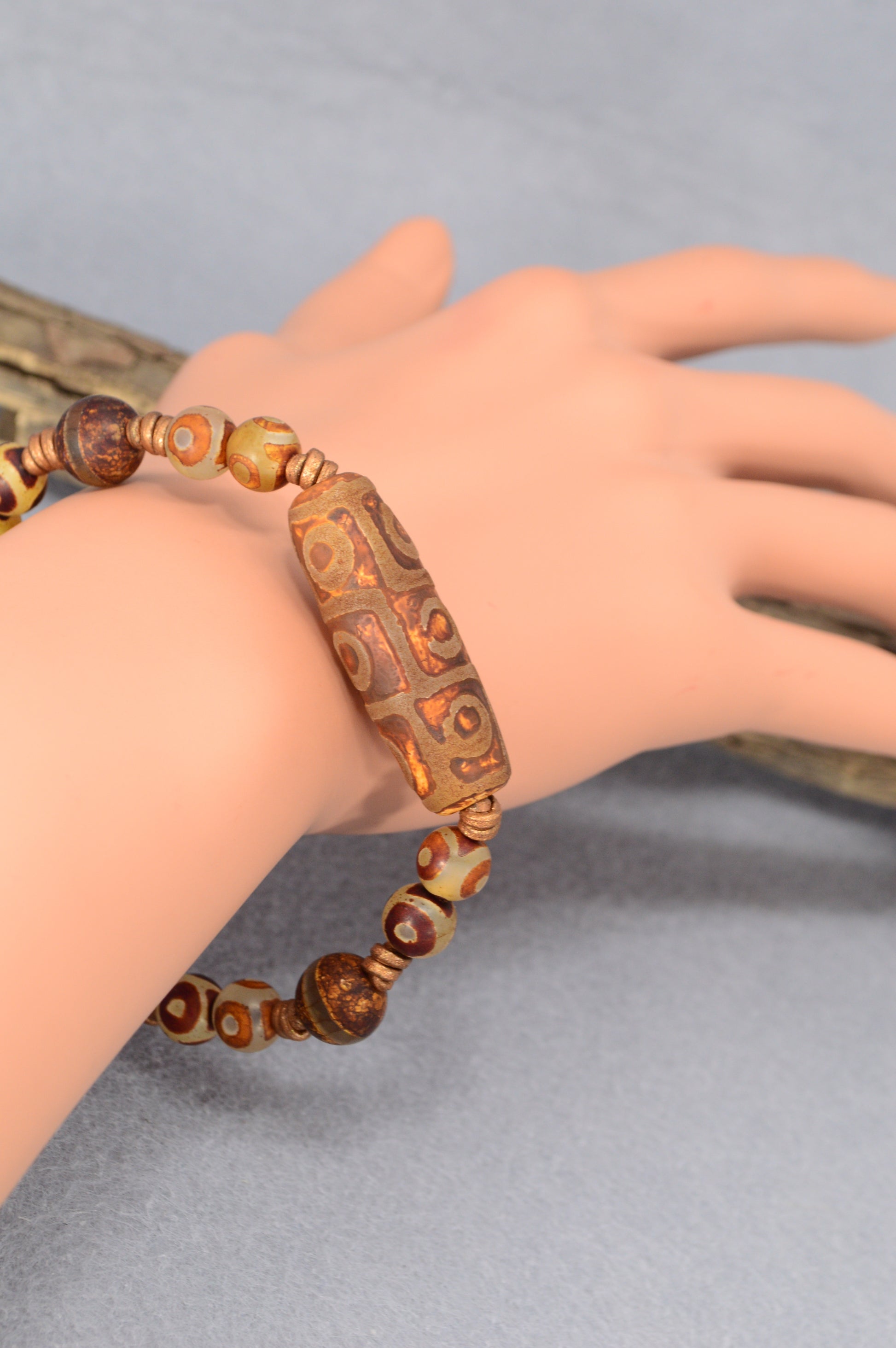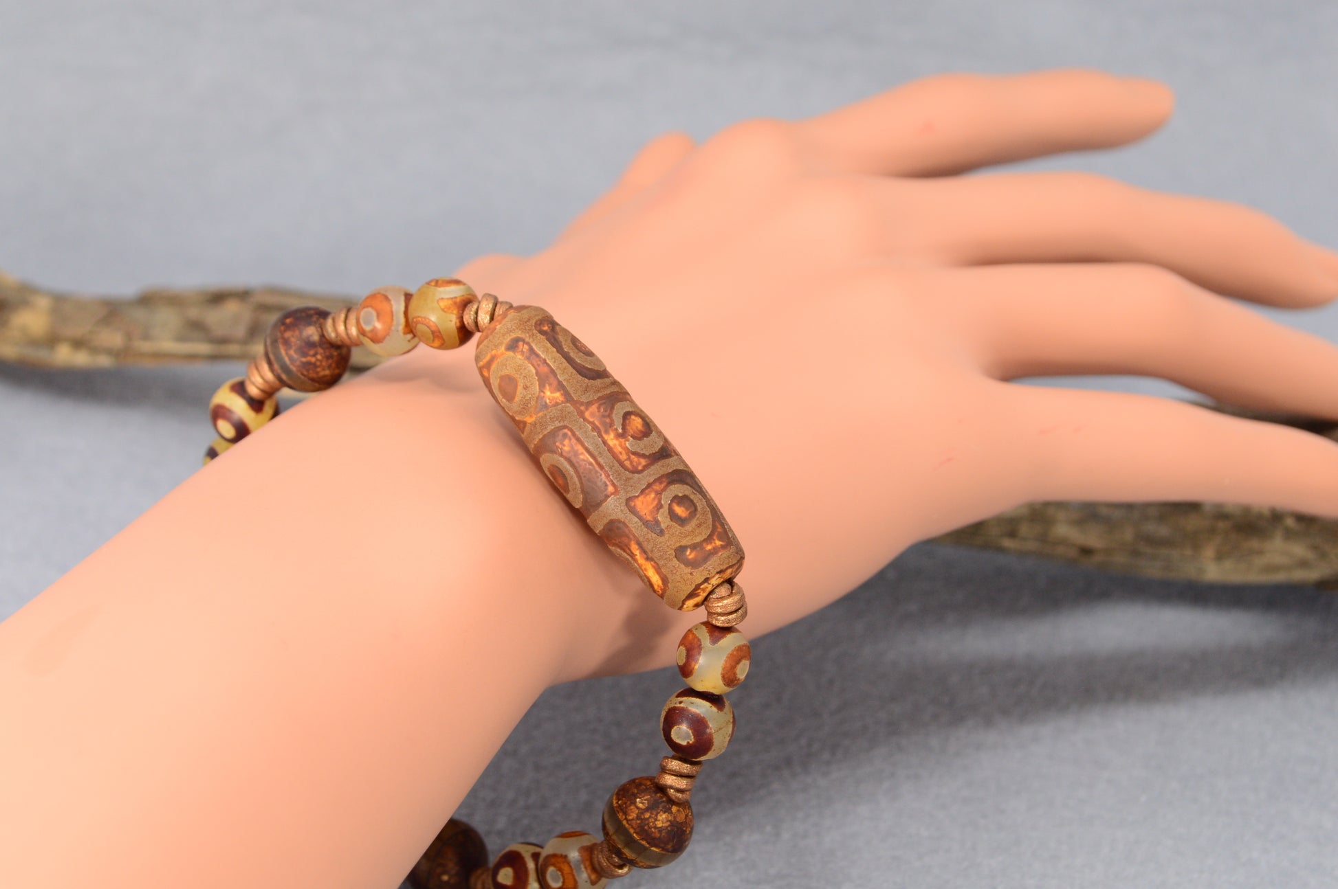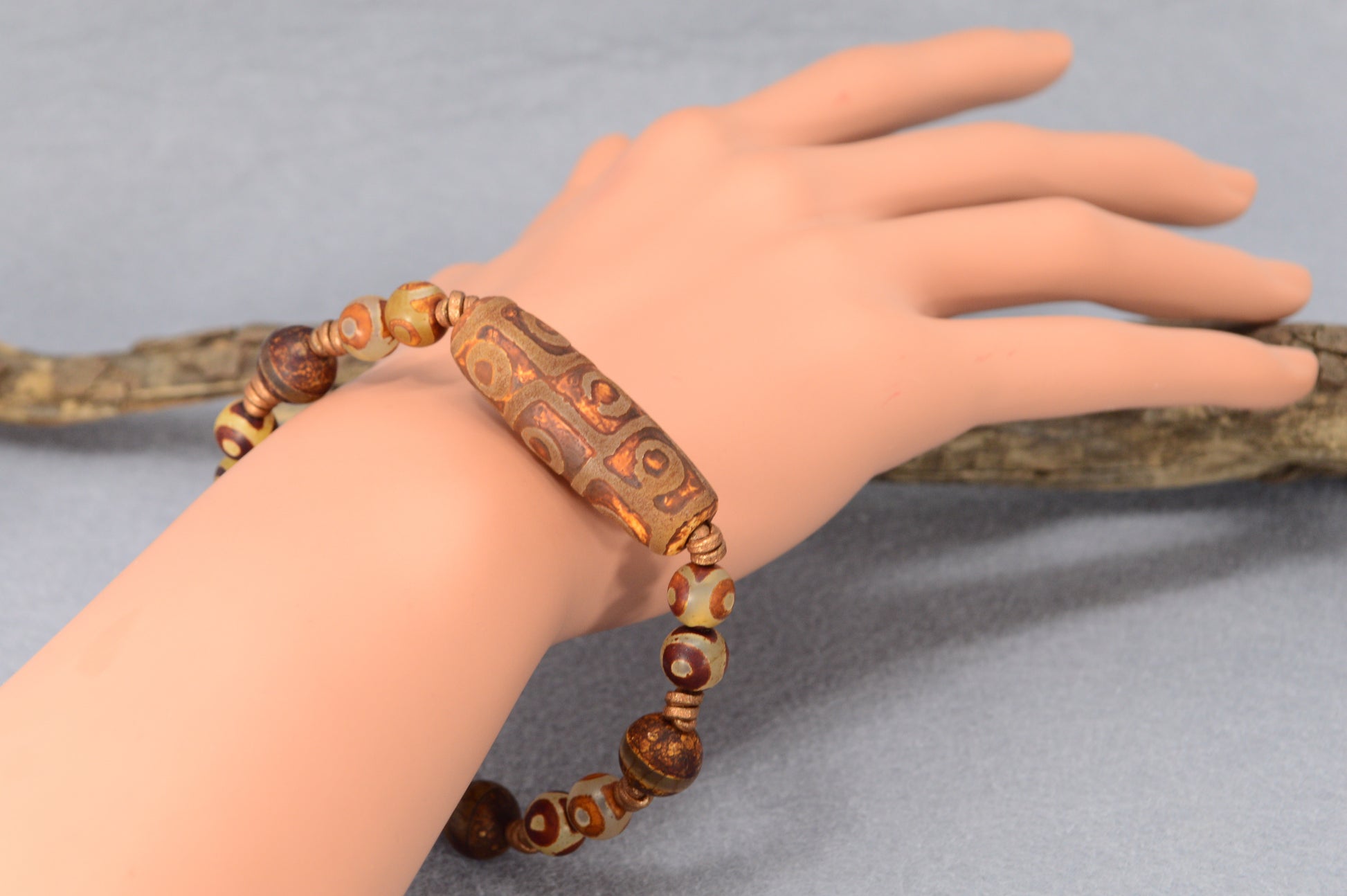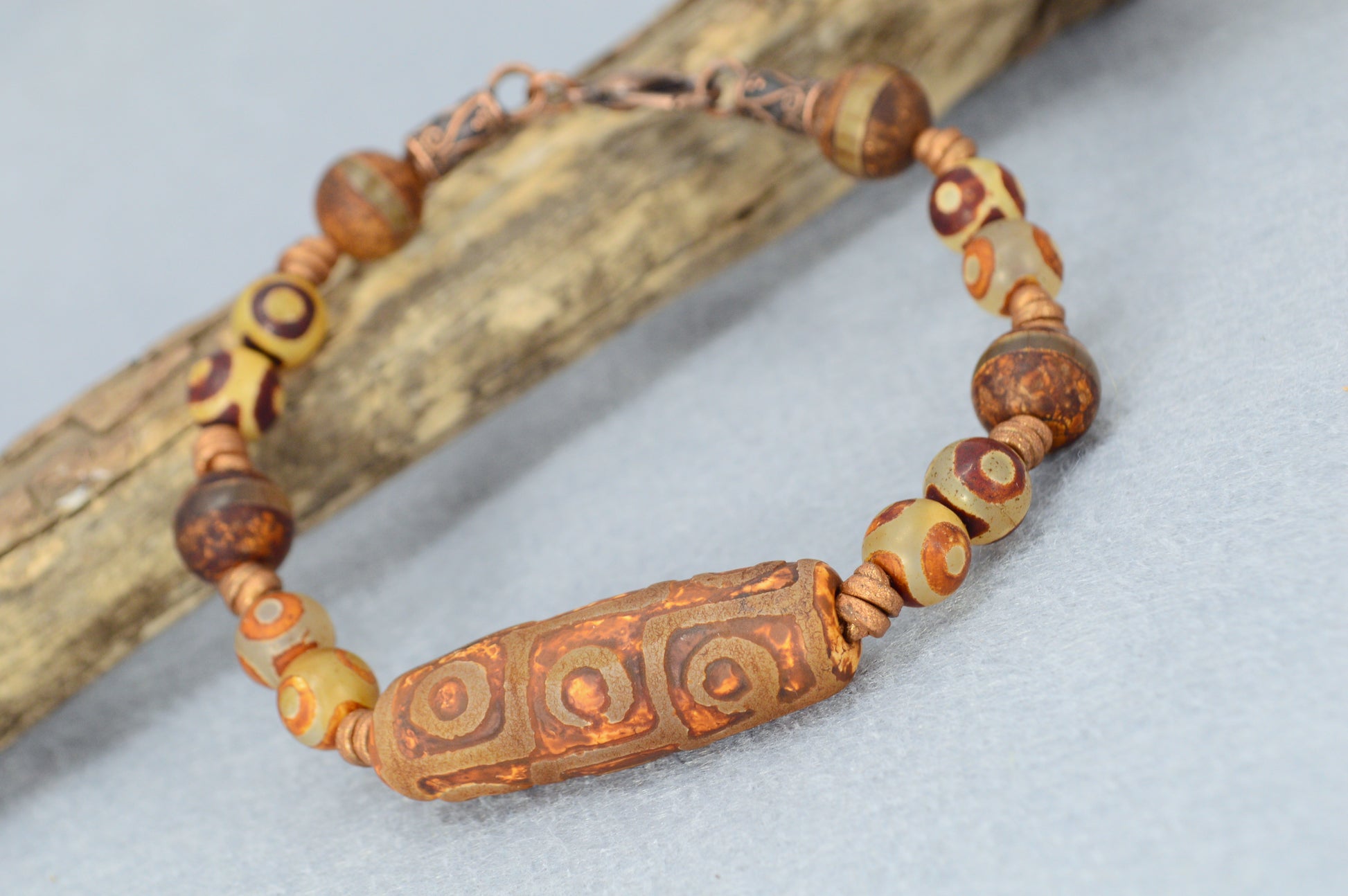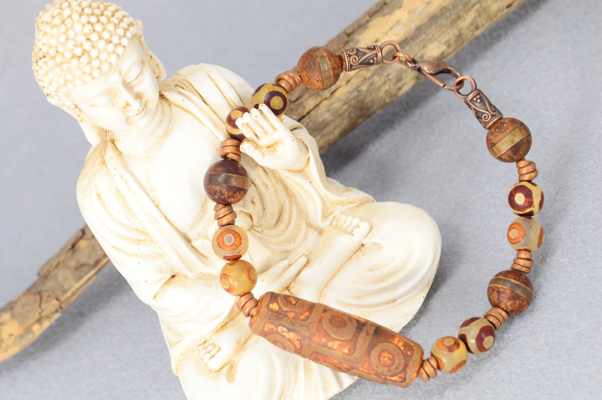 Tauche ein in die Energie uralter Weisheit mit diesem unisex tibetischen Dzi-Perlenarmband, handgefertigt aus kraftvollen Achatperlen und einem markanten Dzi-Mittelstück.