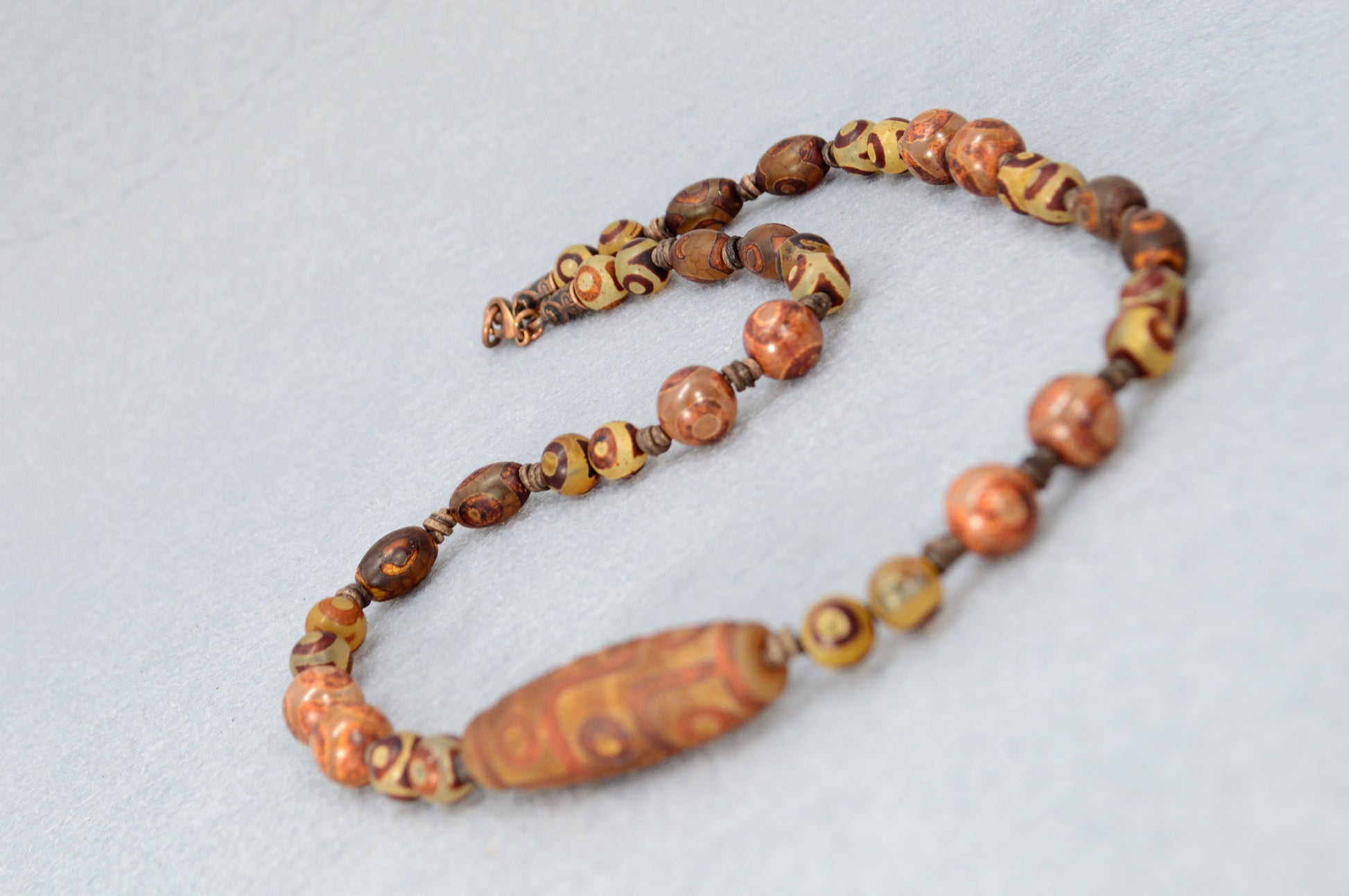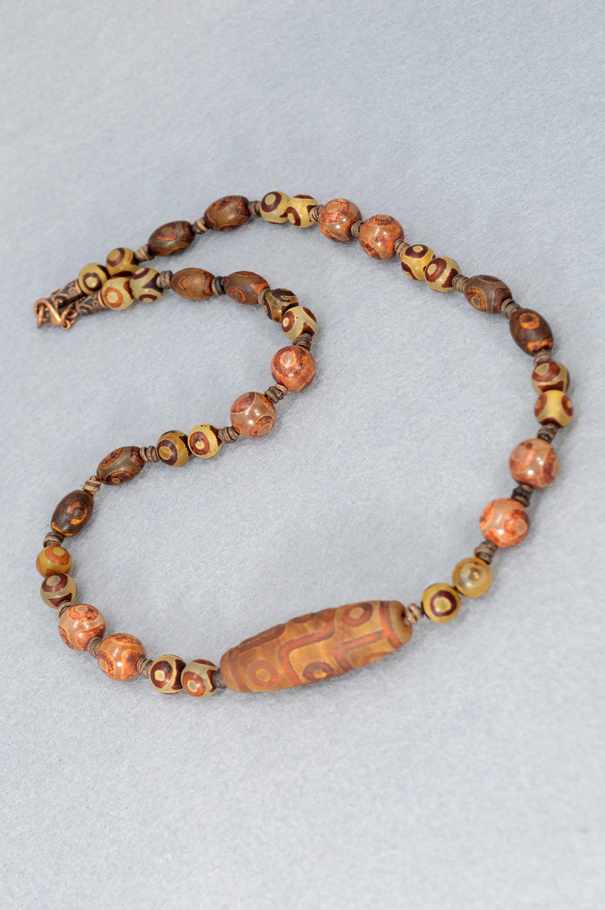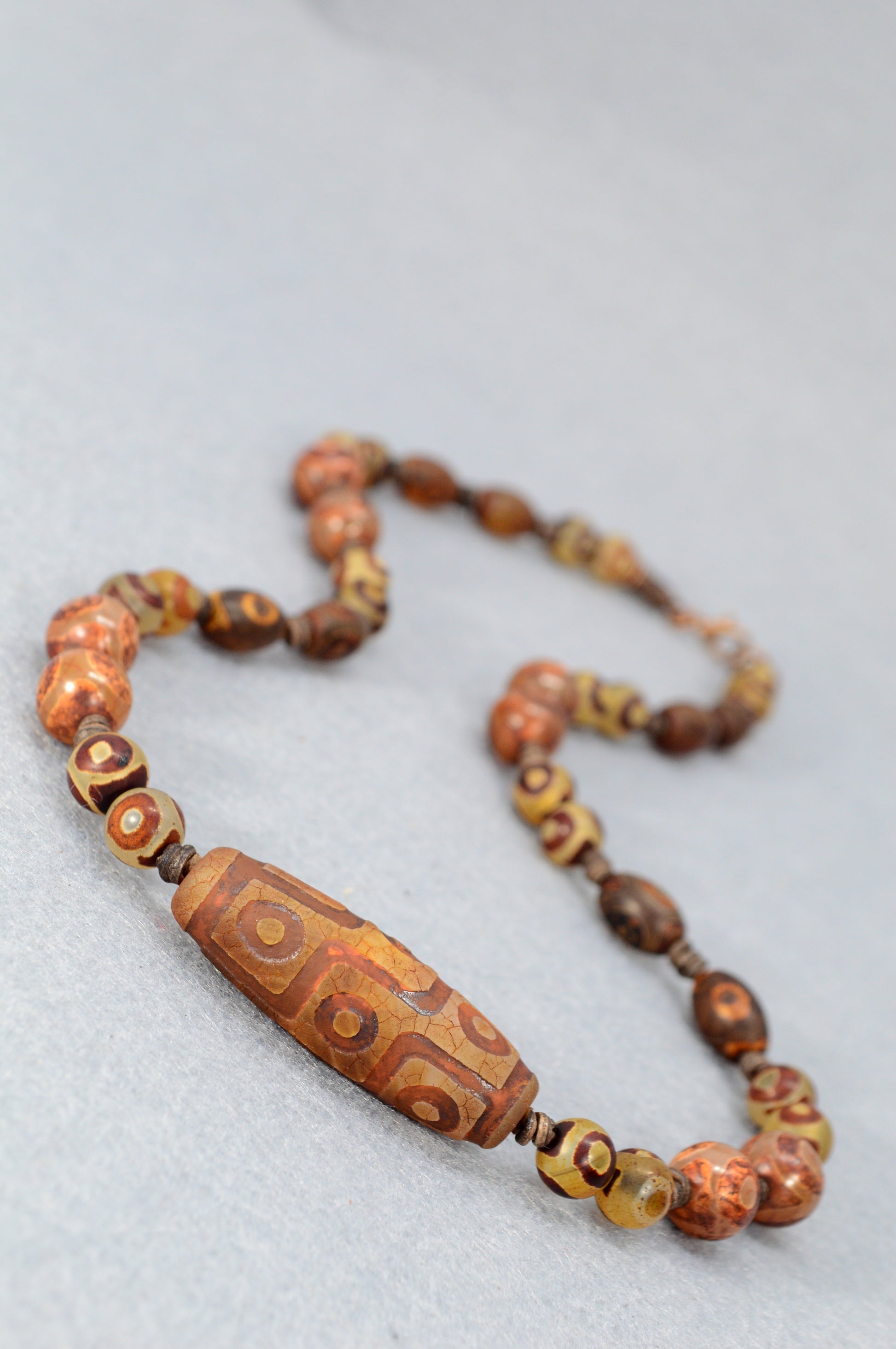 Sorgfältig von Hand gefertigt aus natürlichen Achatperlen und einem traditionellen tibetischen Dzi-Mittelstück, ist diese Halskette ein bedeutungsvolles Stück spirituellen Schmucks.