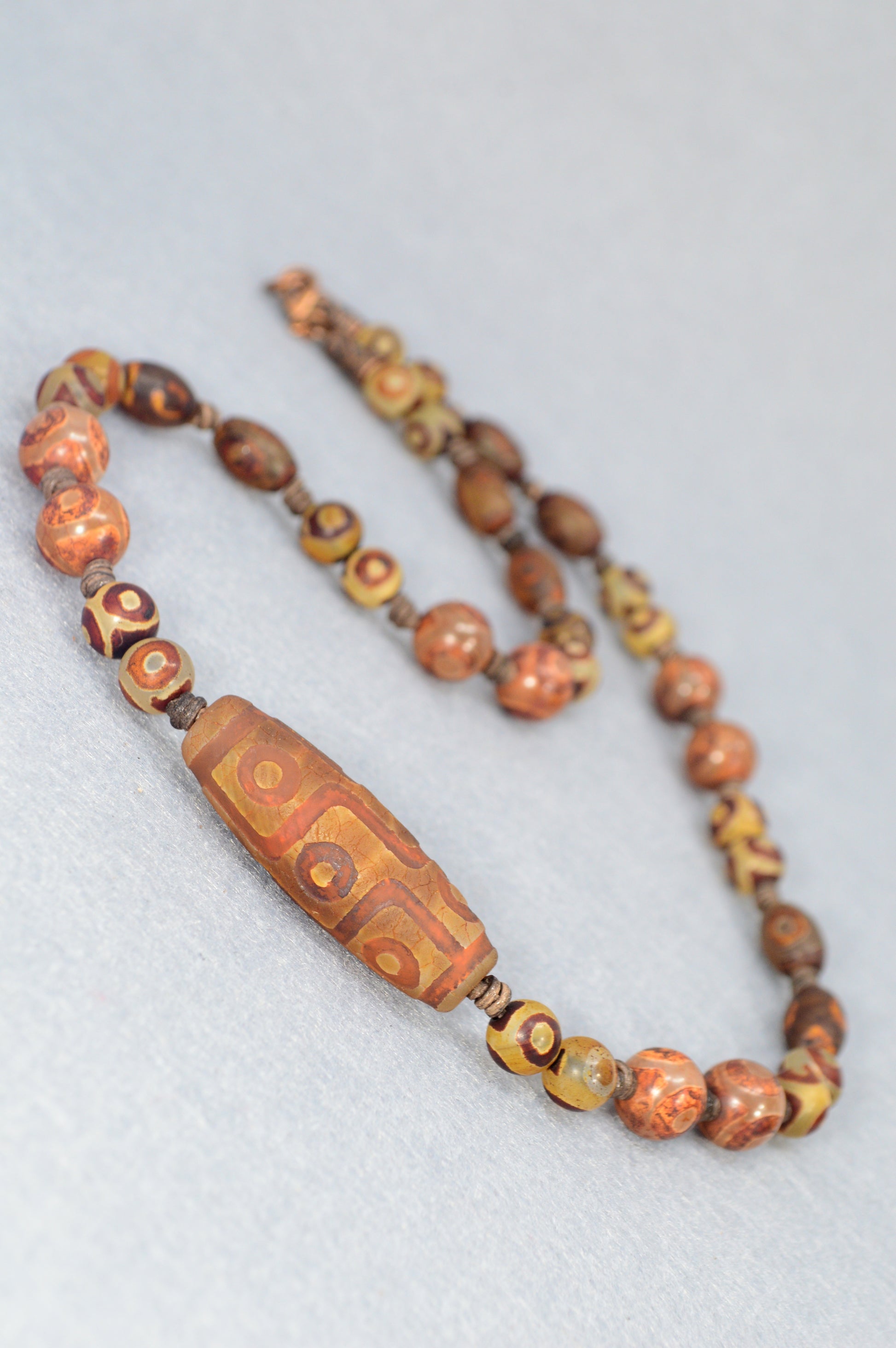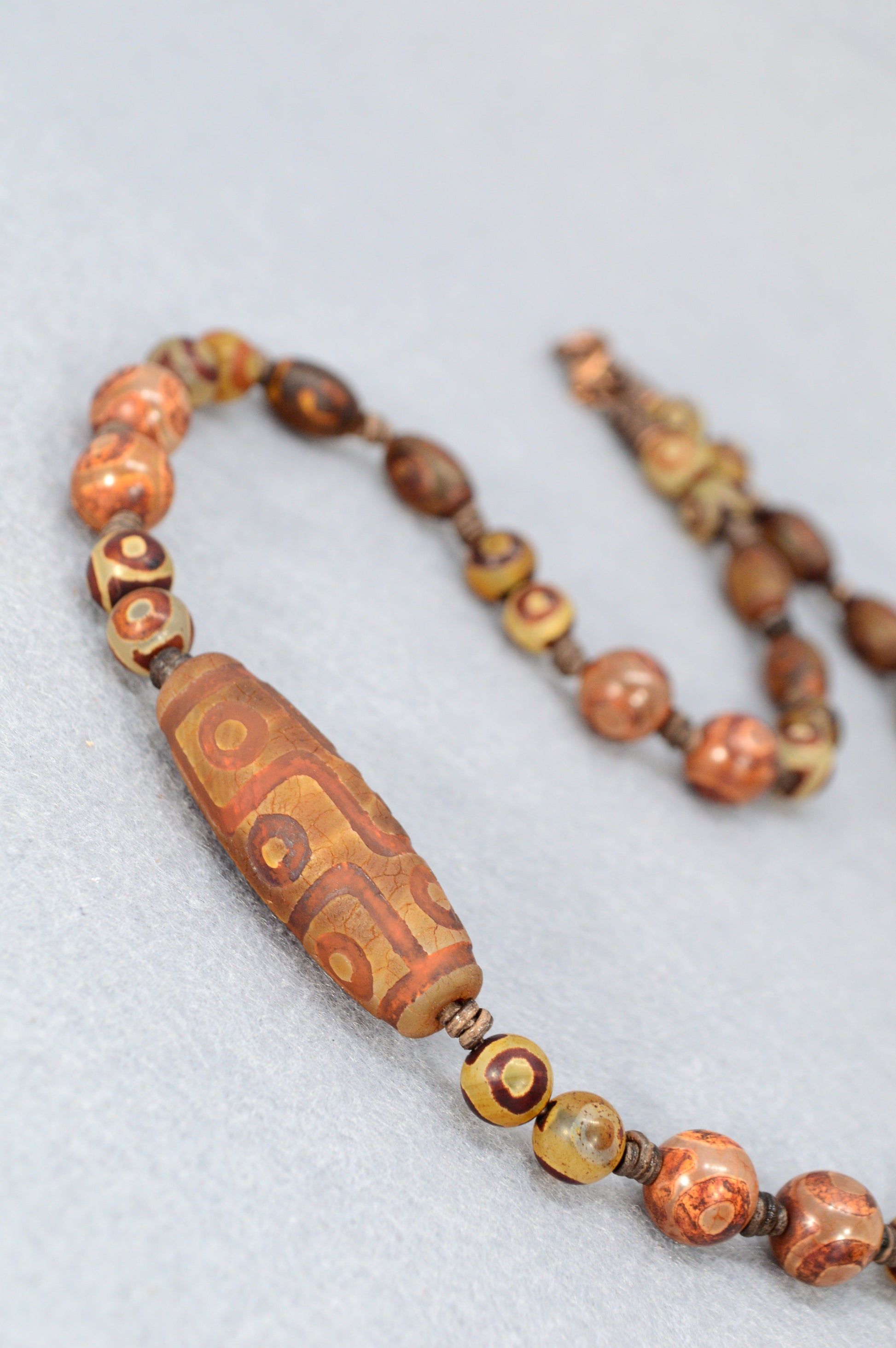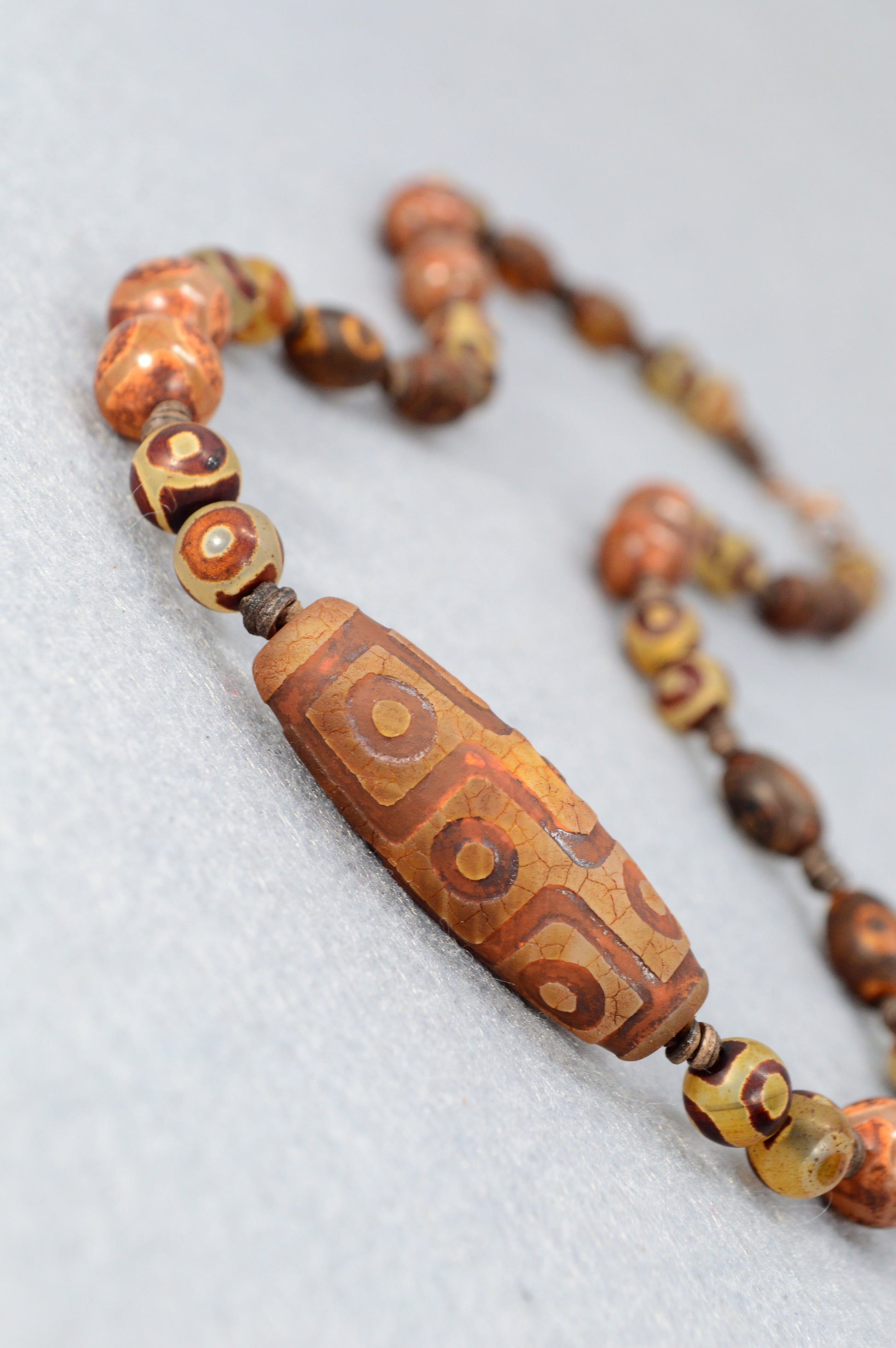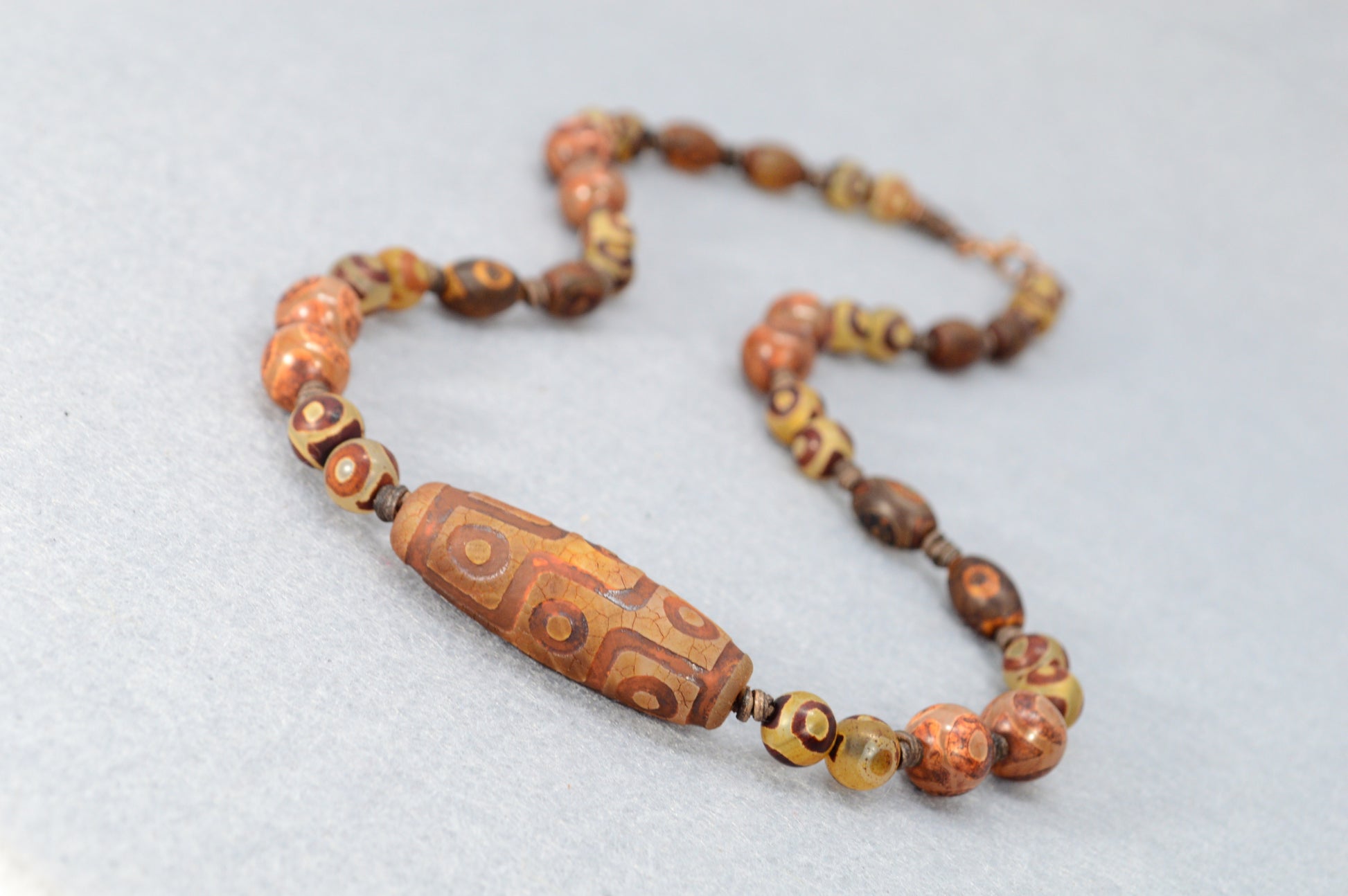 Sorgfältig von Hand gefertigt aus natürlichen Achatperlen und einem traditionellen tibetischen Dzi-Mittelstück, ist diese Halskette ein bedeutungsvolles Stück spirituellen Schmucks.