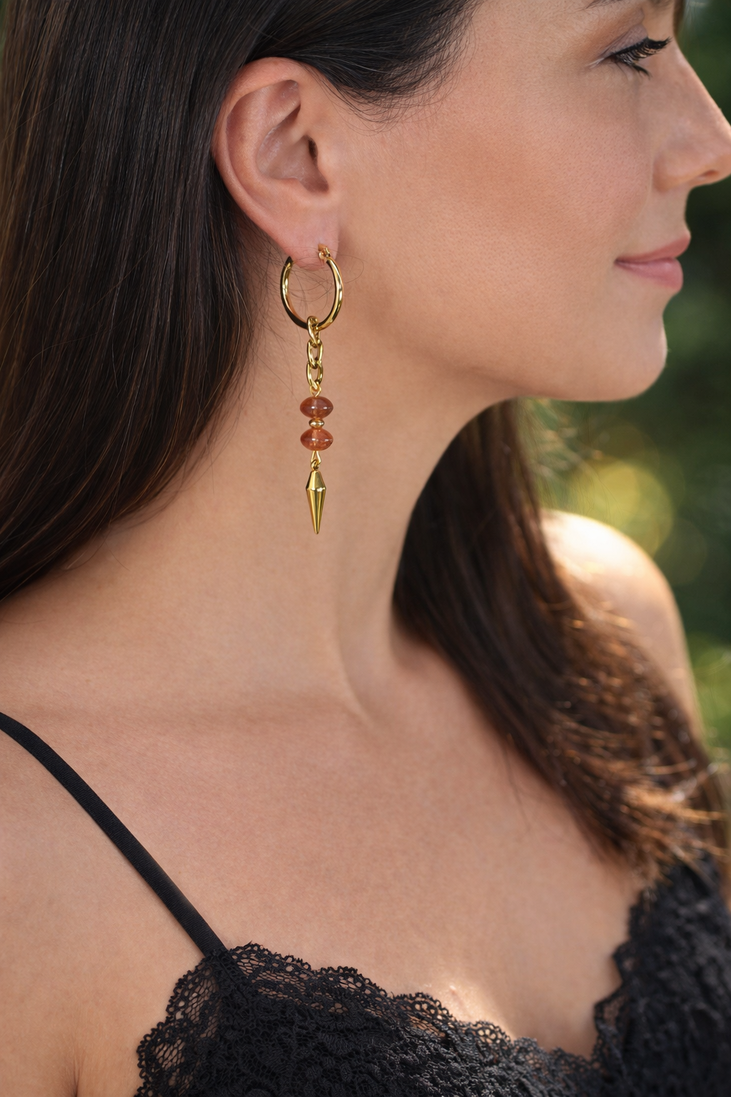 Dale un toque llamativo a tu estilo con estos aros dorados decorados con cuentas de vidrio checo premium y un elegante colgante en forma de punta de acero inoxidable.
