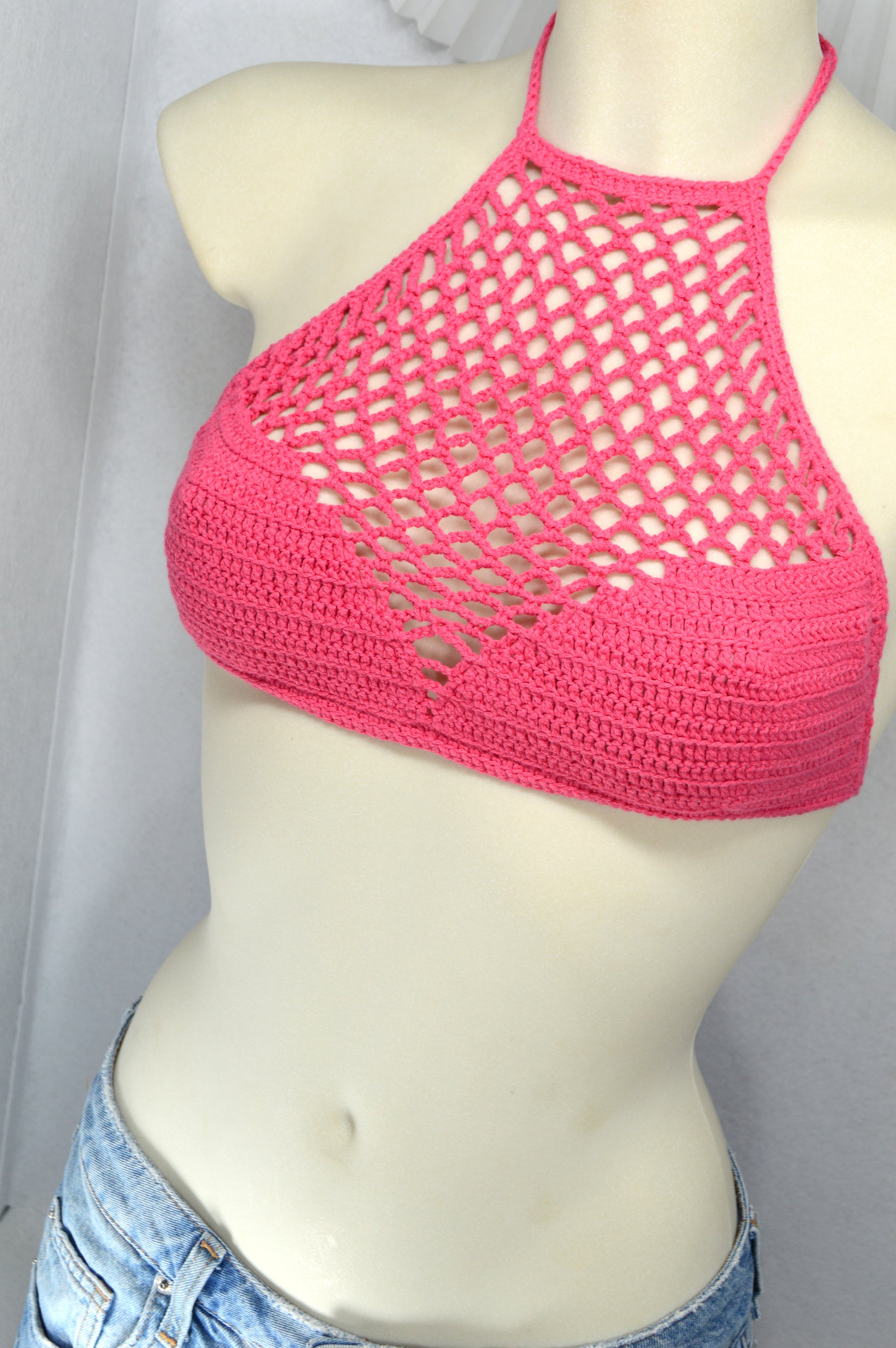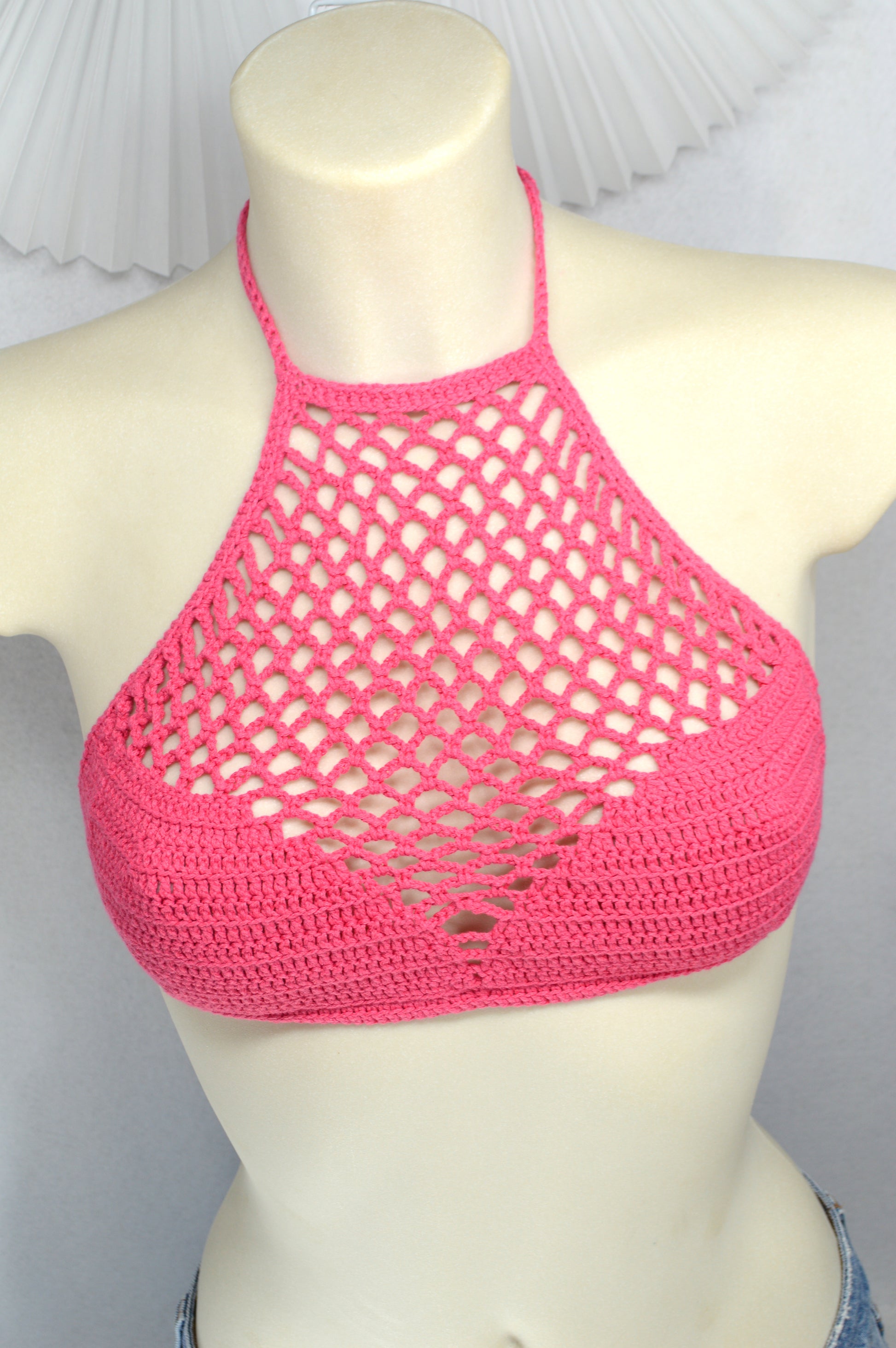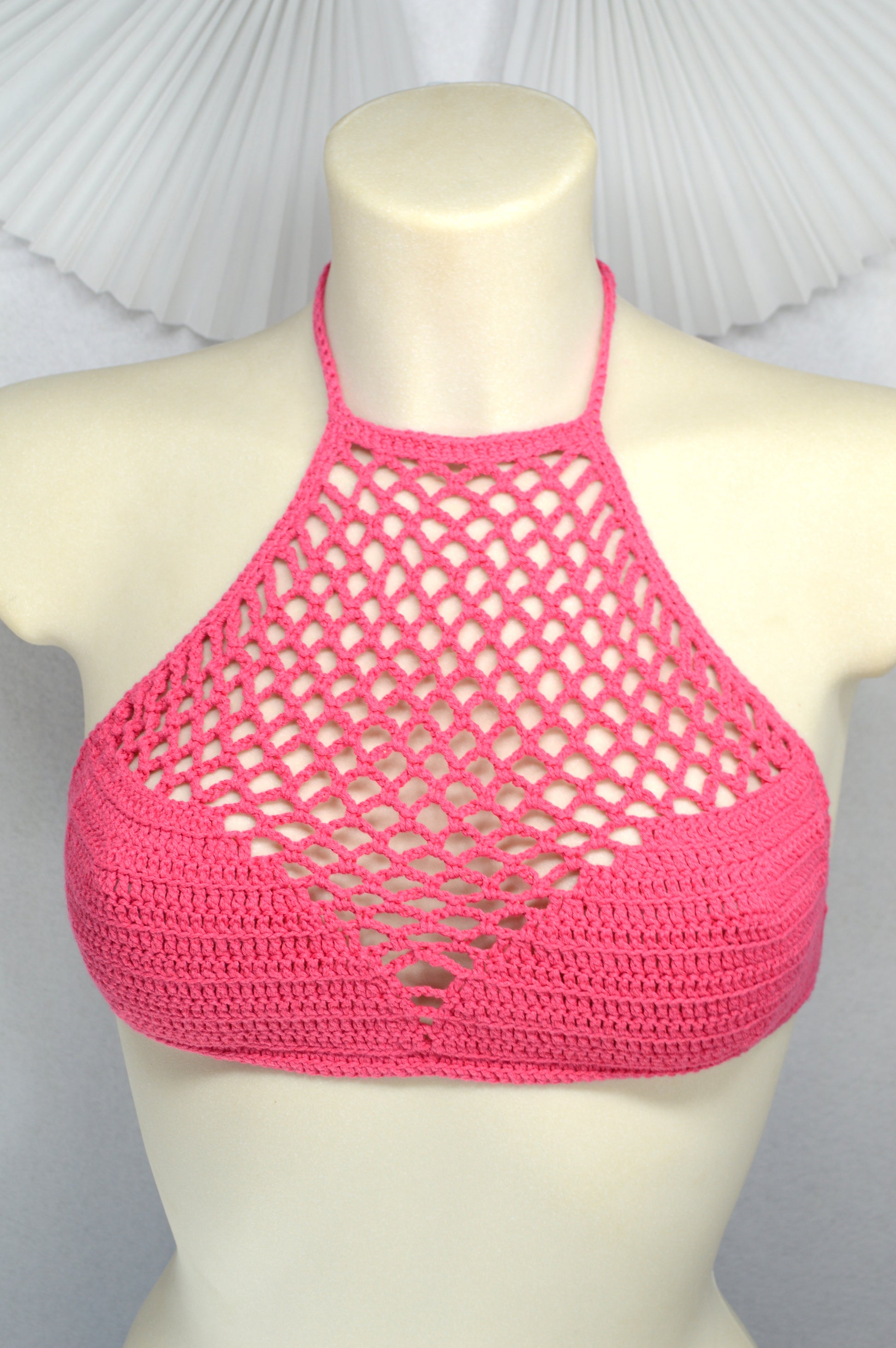 Bright and bold, this pink crochet halter top is a statement boho piece designed for beach days, festivals, and summer adventures. The openwork crochet pattern highlights the neckline while the solid underbust section provides comfort and light support. Made from a viscose and nylon blend, this crochet bikini top is soft, breathable, stretchy, and quick-drying, making it perfect both as swimwear and as a stylish summer crop top. Ideal for beach outfits, festival looks, rave wear, and bohemian layering. The vibrant pink color adds a playful, confident touch to any warm-weather wardrobe.