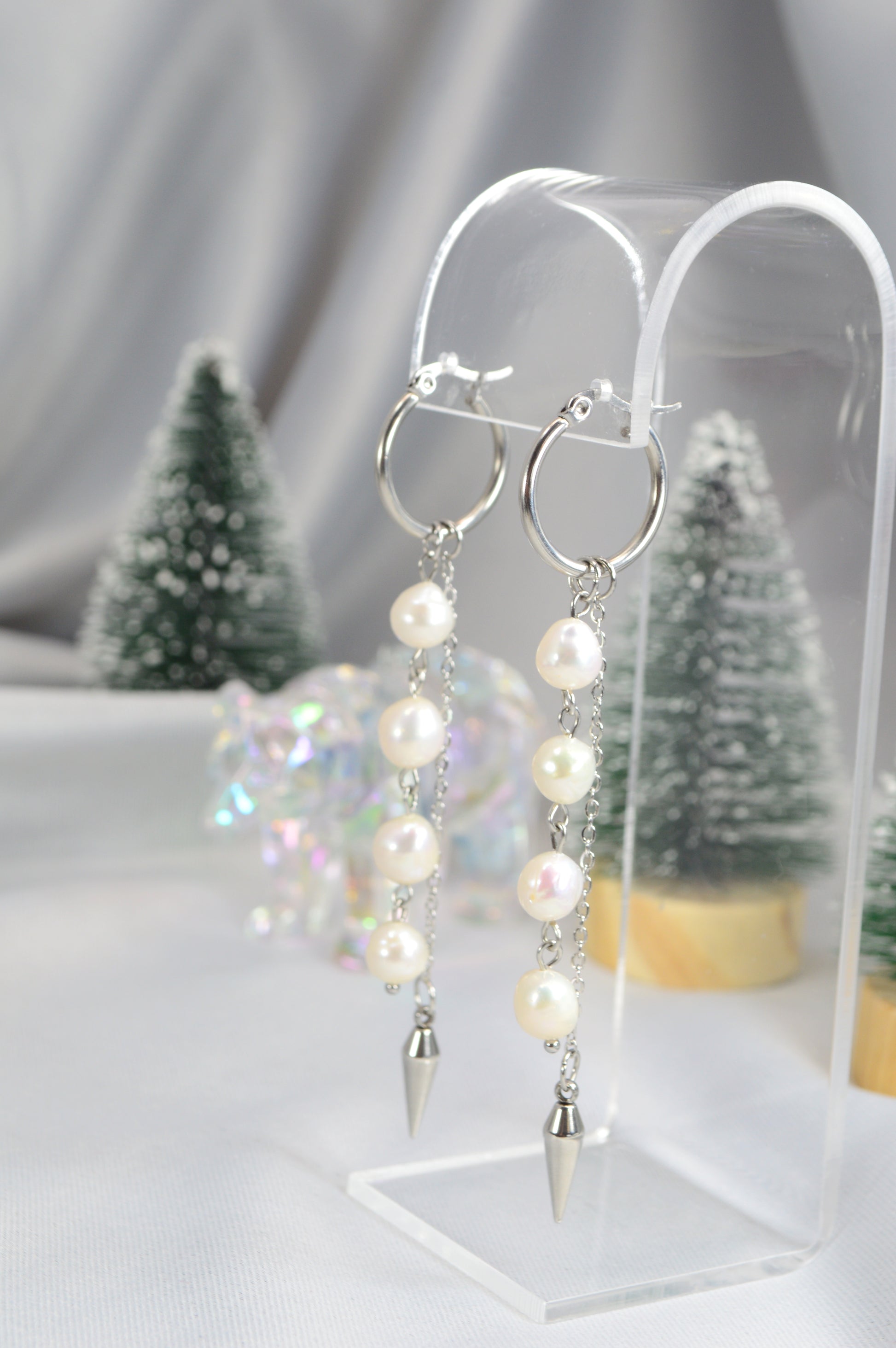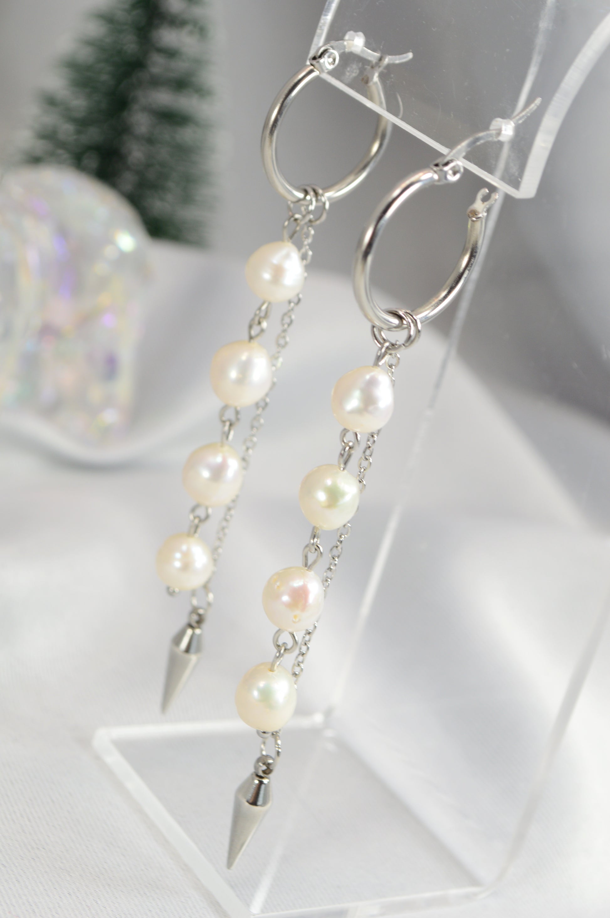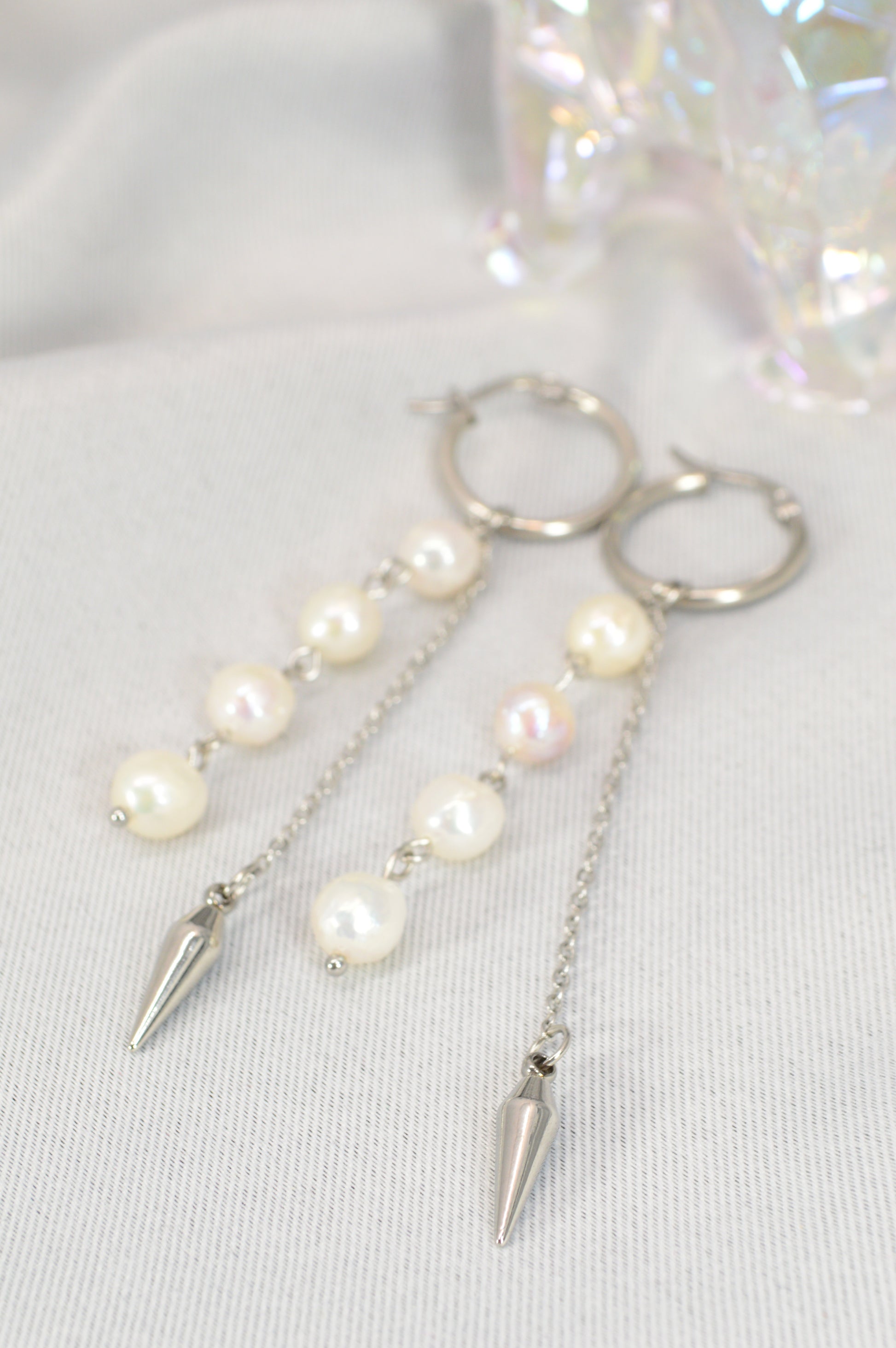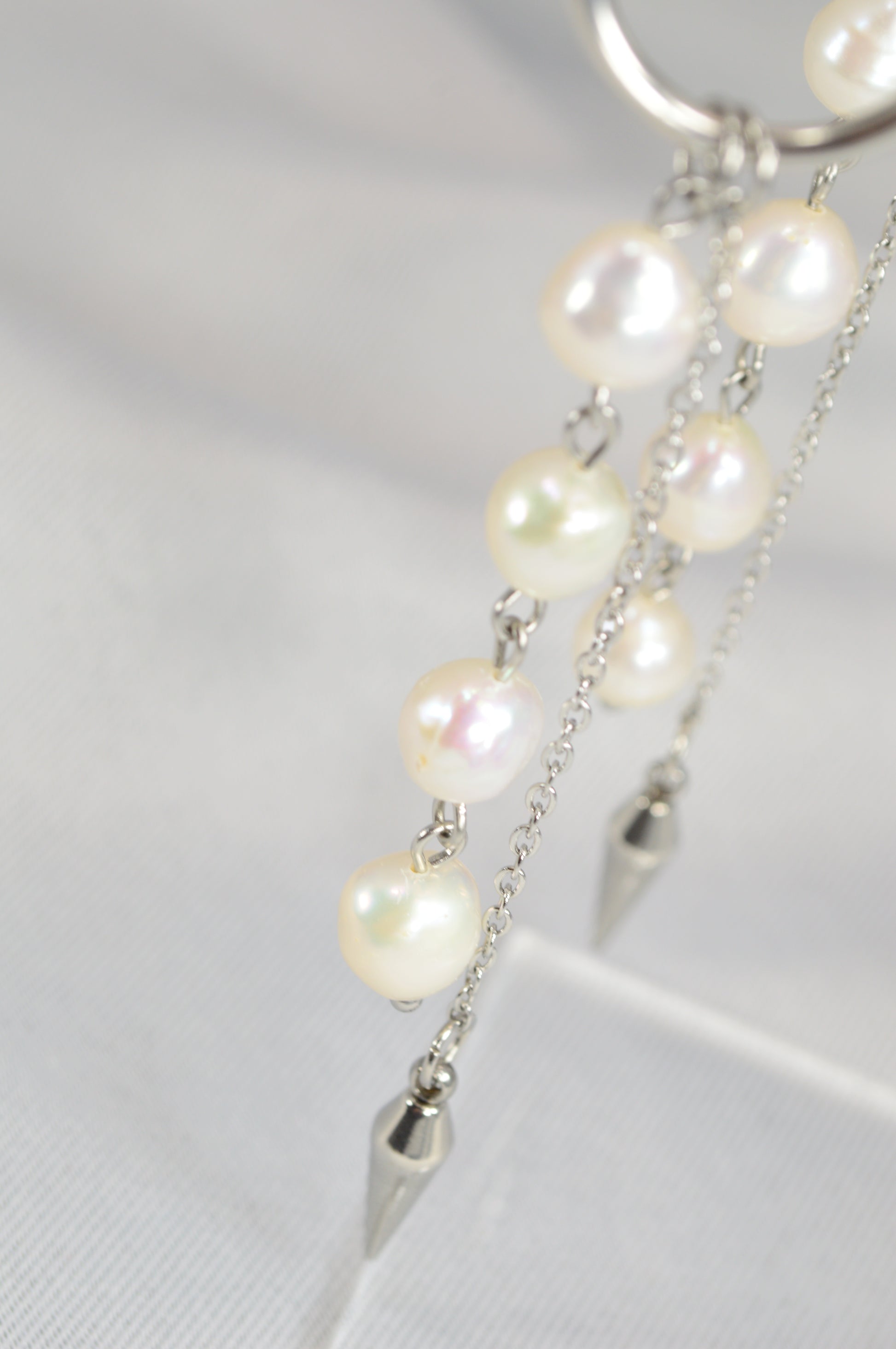 Elegant baroque pearl drop earrings on minimalist hoops — available in silver and gold. Each earring features a cascade of natural baroque pearls ending with a sleek metal spike, creating a perfect mix of softness and edge. These earrings work beautifully for both casual and evening looks: pair the silver with cool-tone outfits, denim, minimalist streetwear; choose the gold for warm palettes, dresses, or anything that needs a touch of luxe.