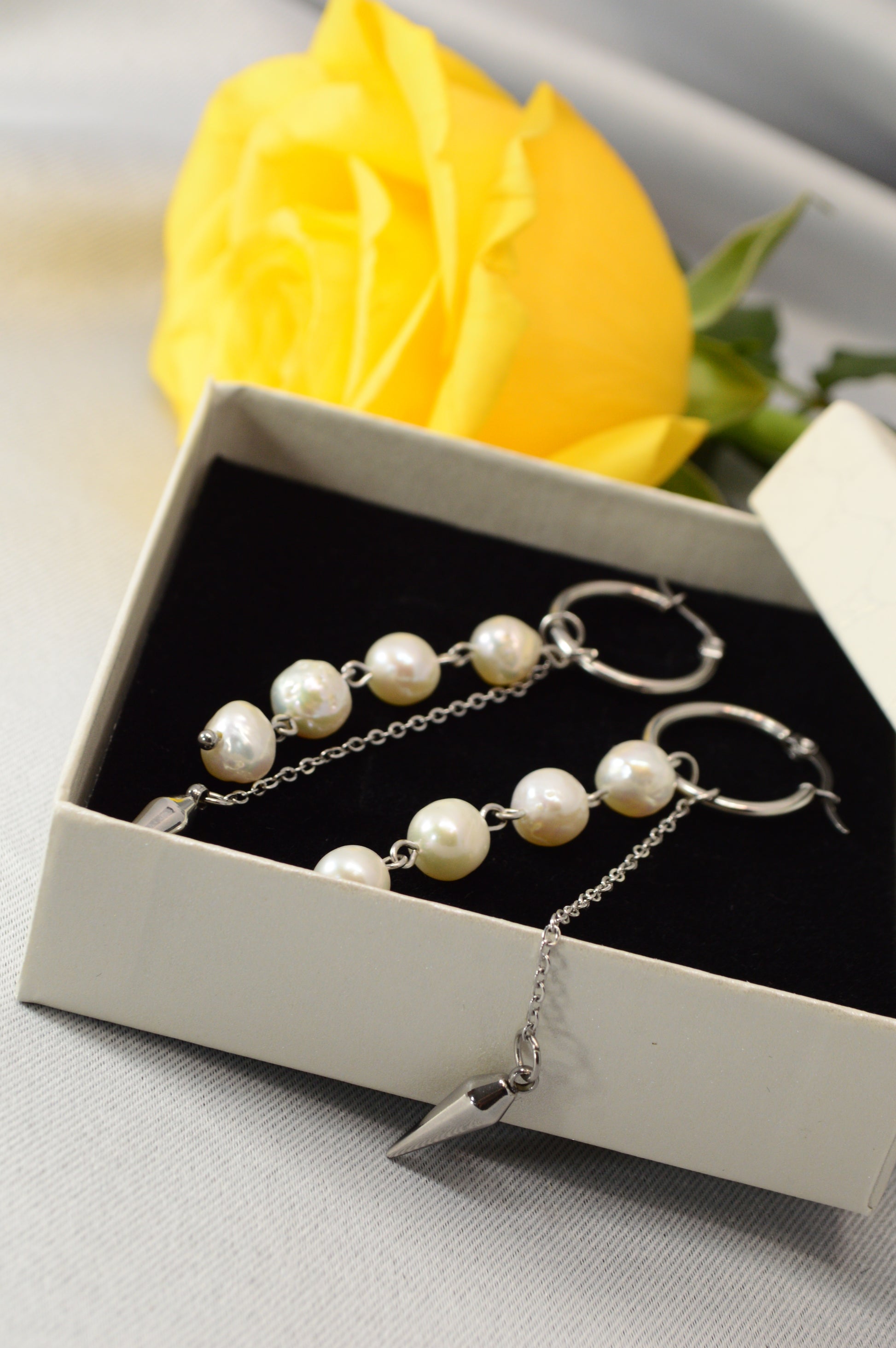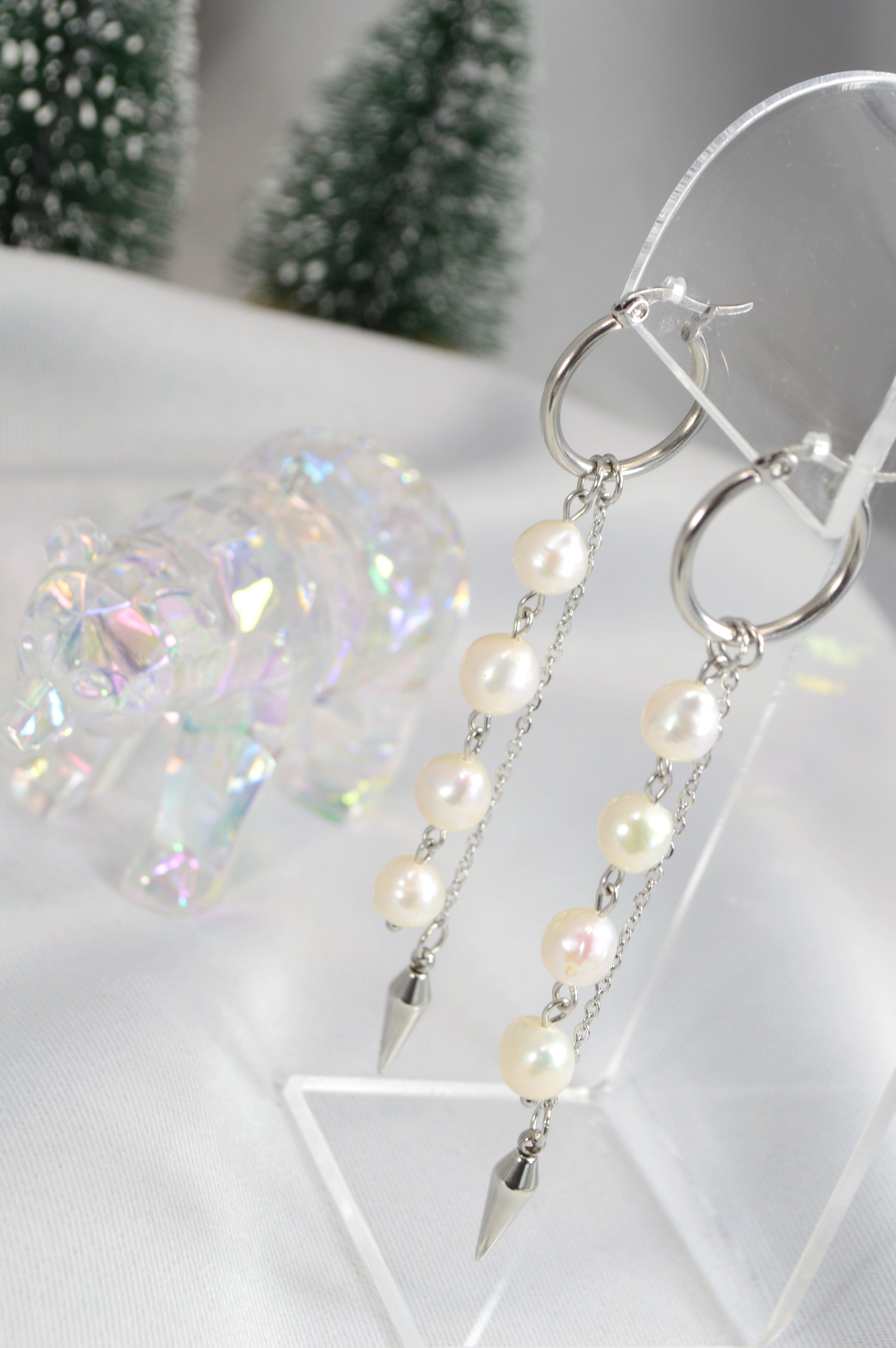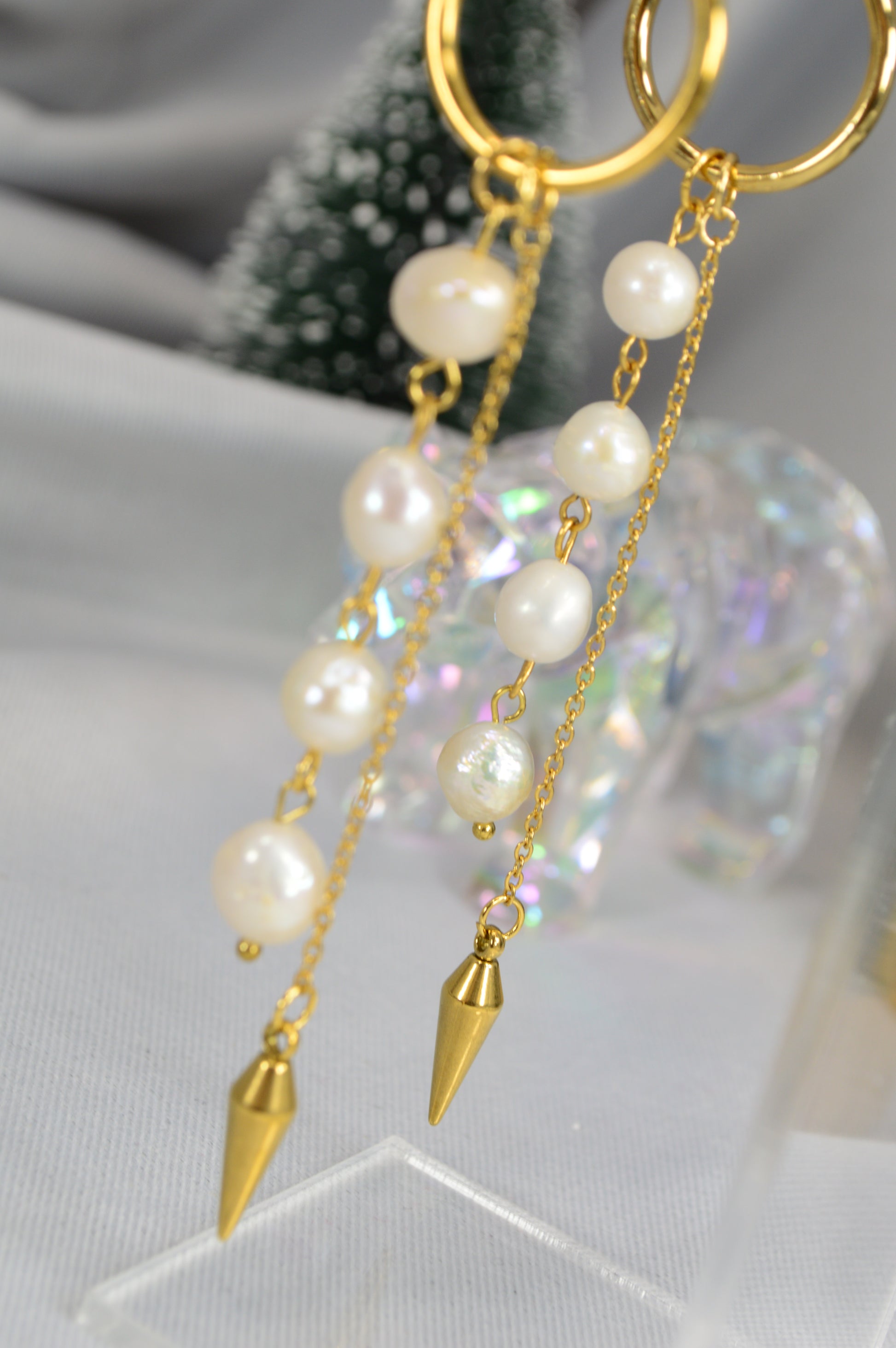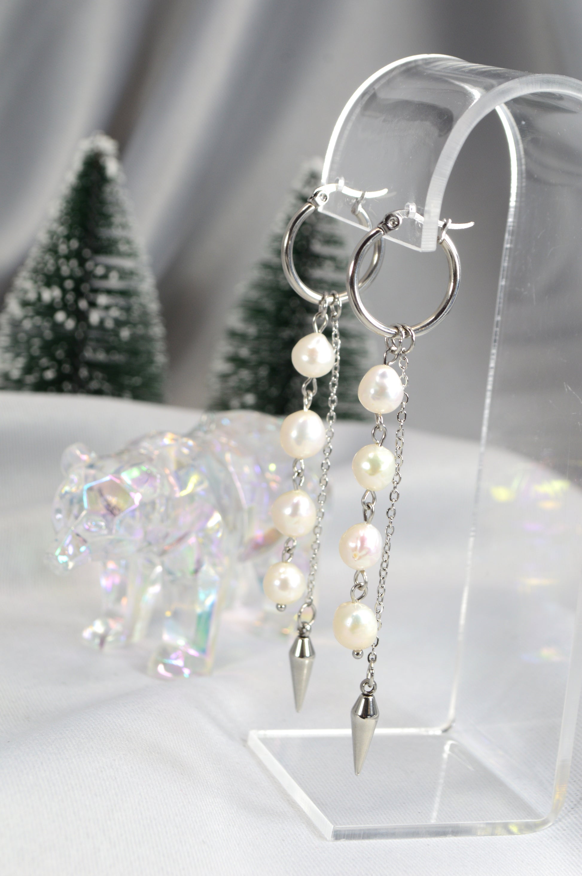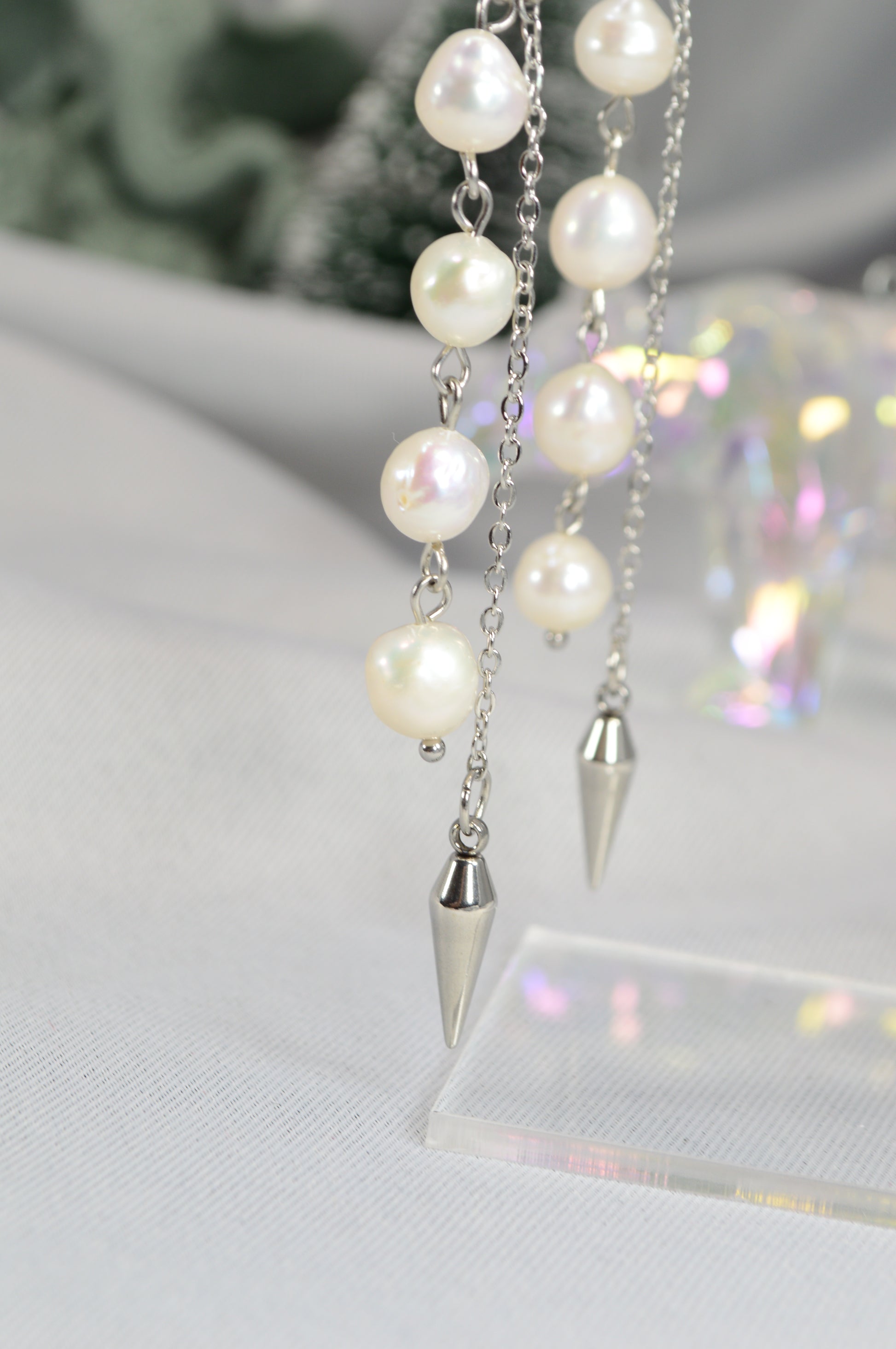Elegant baroque pearl drop earrings on minimalist hoops — available in silver and gold. Each earring features a cascade of natural baroque pearls ending with a sleek metal spike, creating a perfect mix of softness and edge. These earrings work beautifully for both casual and evening looks: pair the silver with cool-tone outfits, denim, minimalist streetwear; choose the gold for warm palettes, dresses, or anything that needs a touch of luxe.