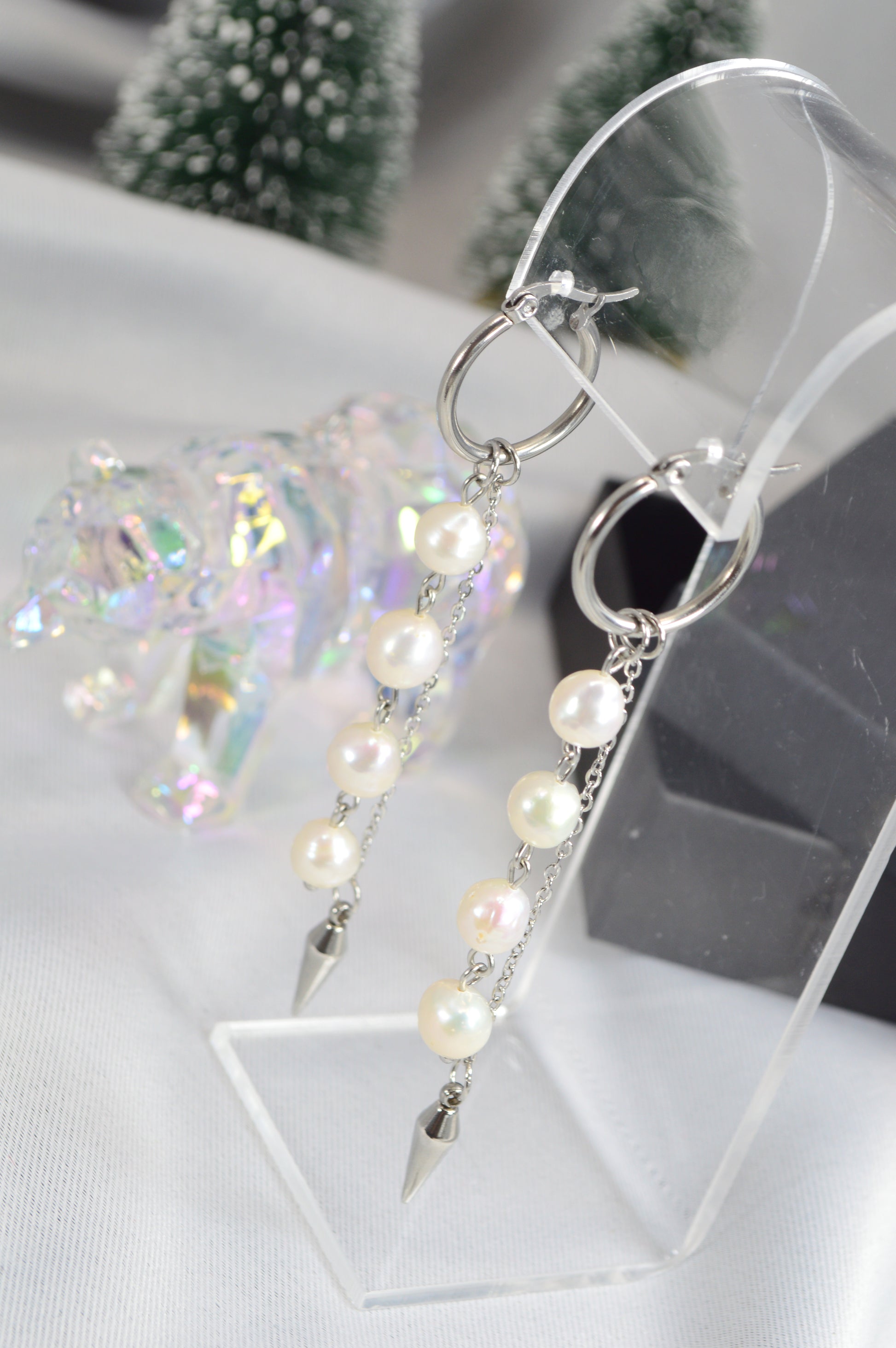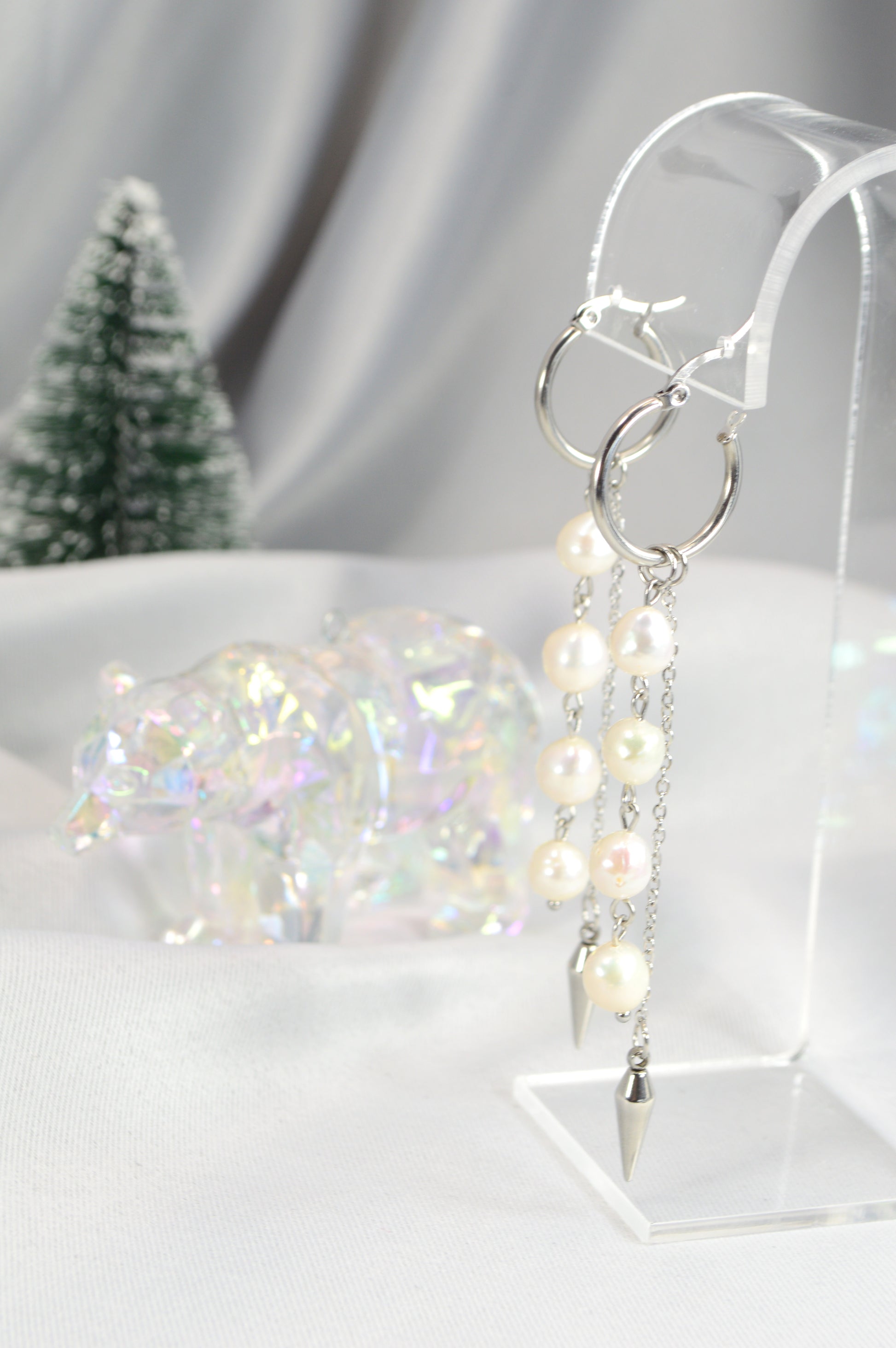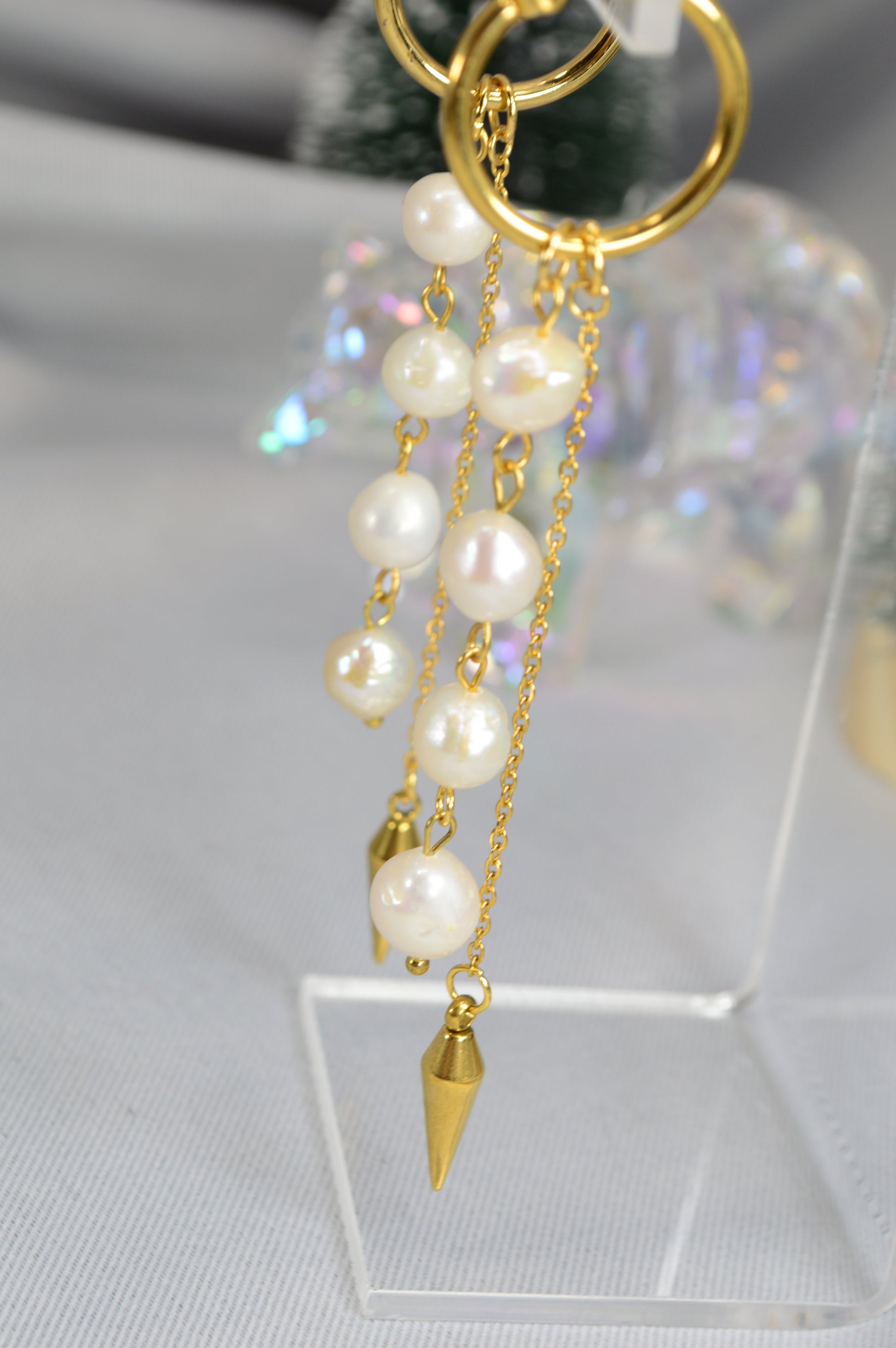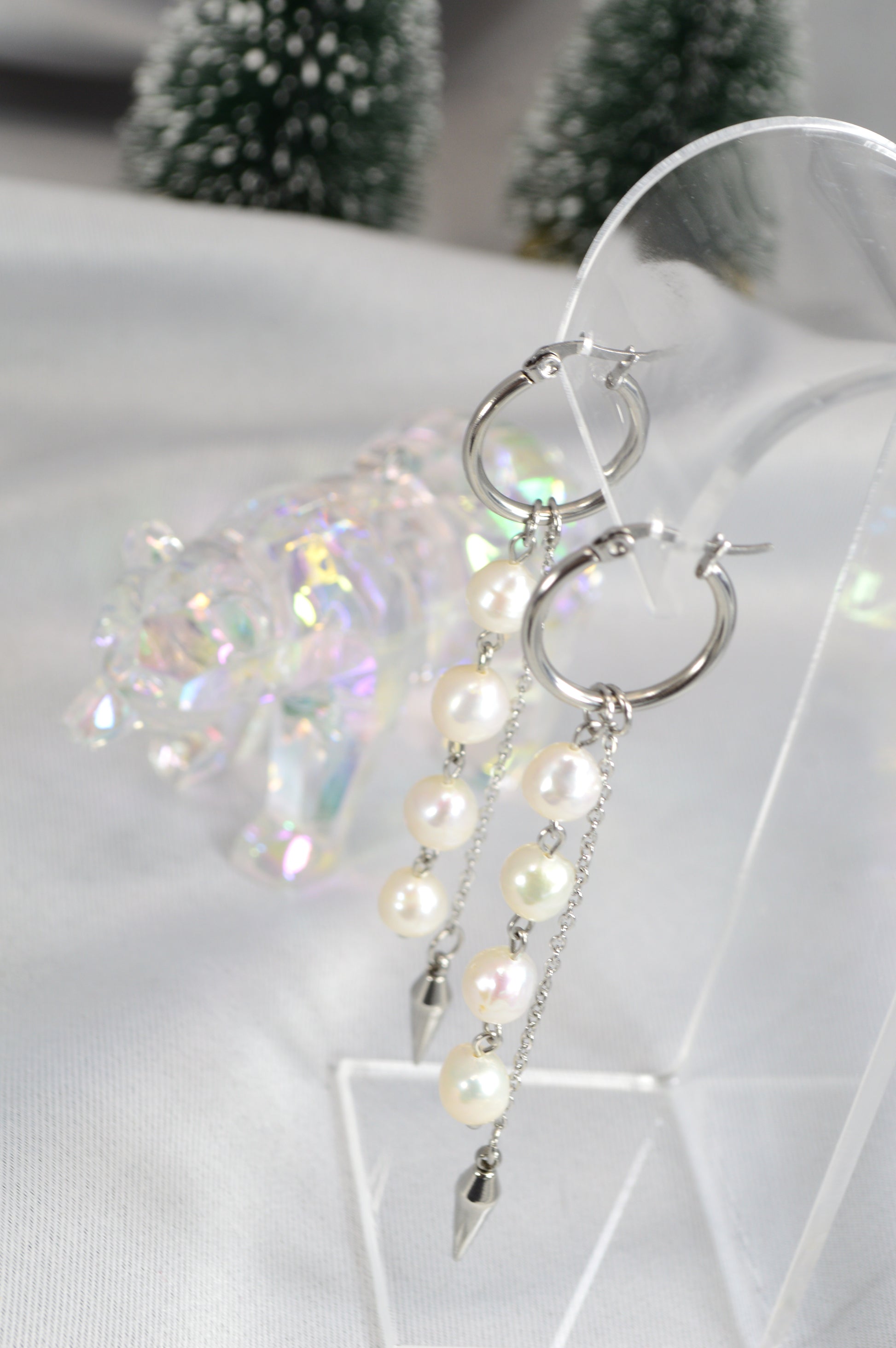 Elegant baroque pearl drop earrings on minimalist hoops — available in silver and gold. Each earring features a cascade of natural baroque pearls ending with a sleek metal spike, creating a perfect mix of softness and edge. These earrings work beautifully for both casual and evening looks: pair the silver with cool-tone outfits, denim, minimalist streetwear; choose the gold for warm palettes, dresses, or anything that needs a touch of luxe.