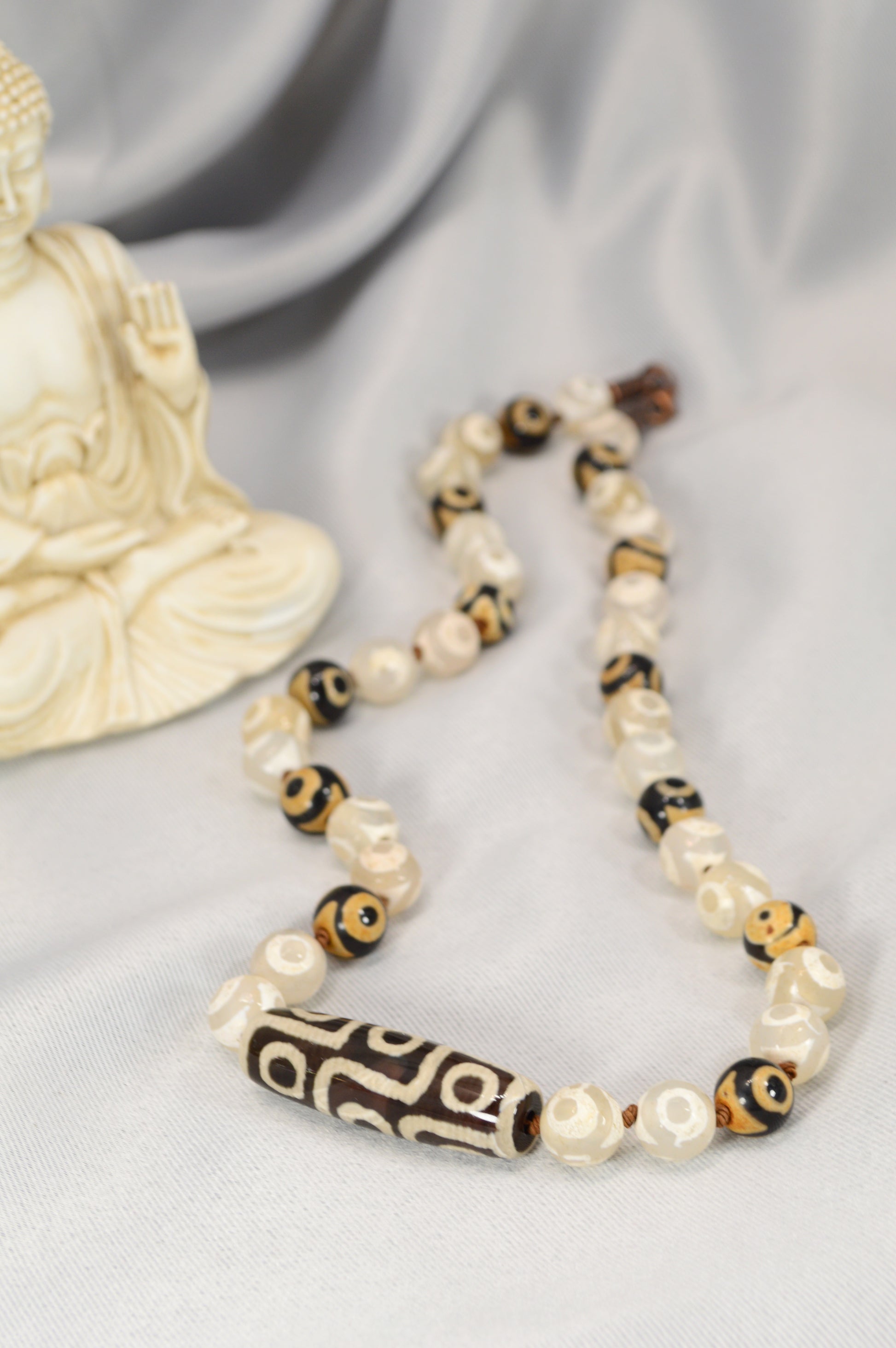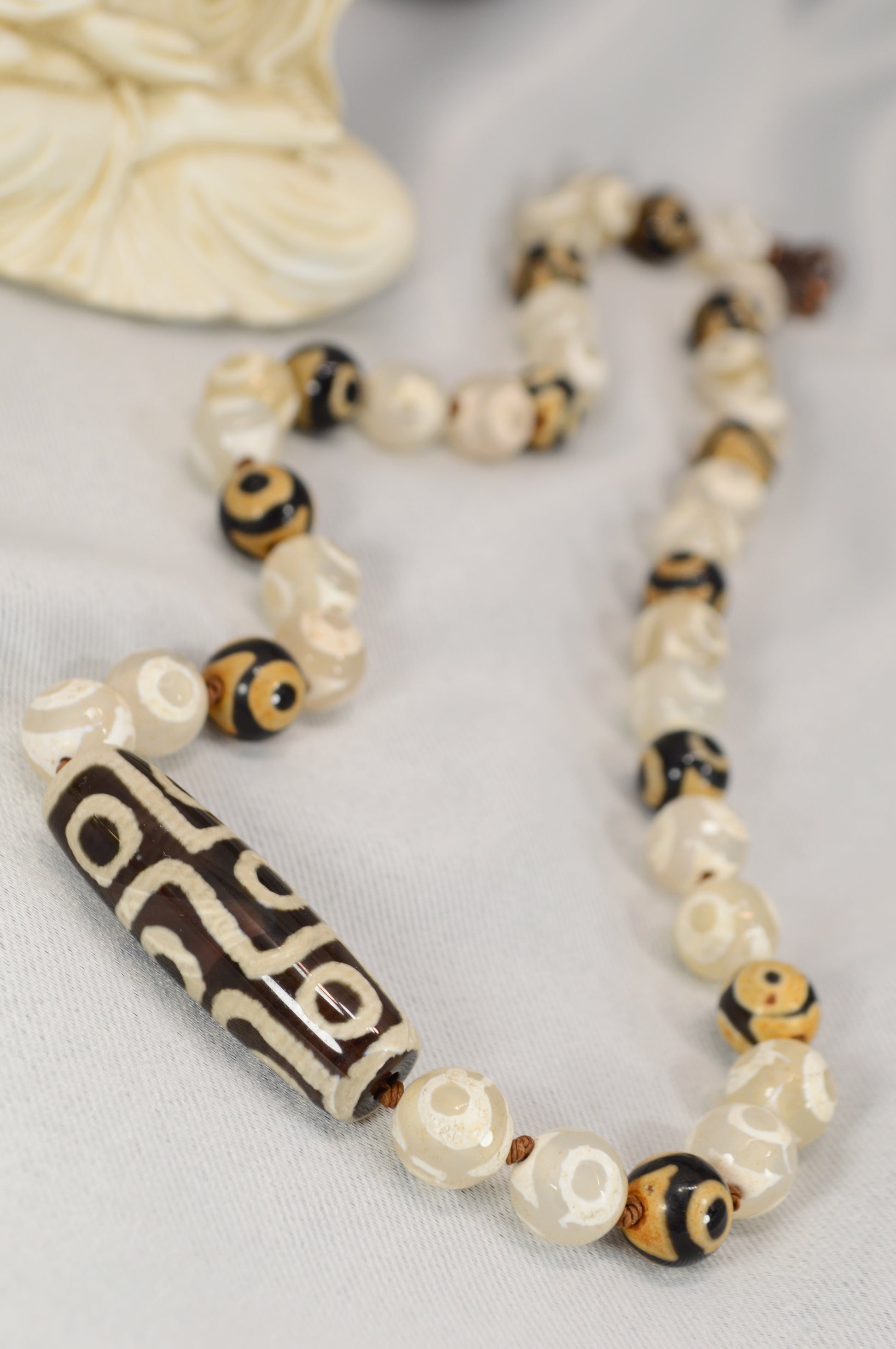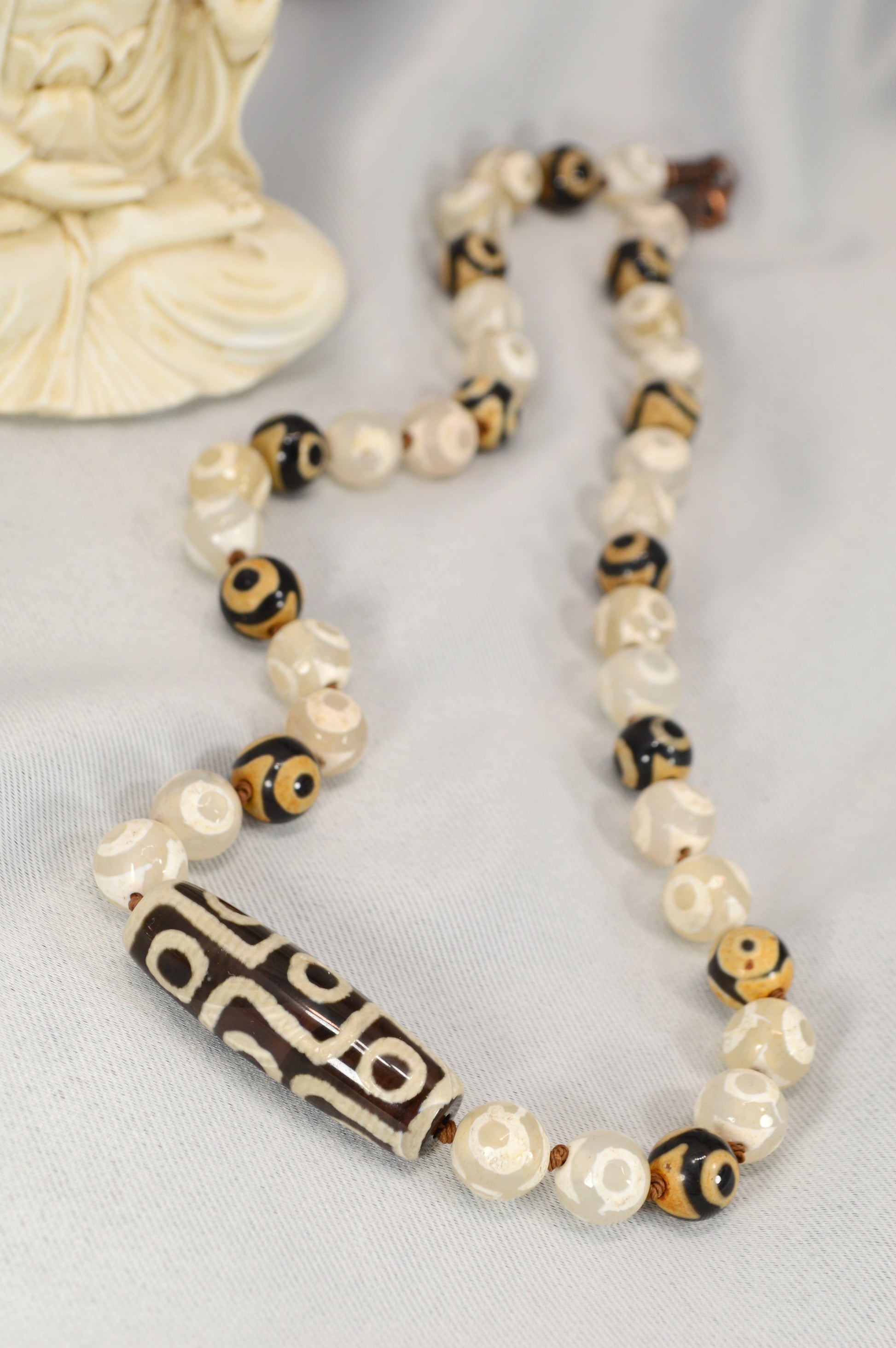 Black & Ivory Tibetan Dzi Bead Necklace – Boho Spiritual Amulet / Unisex Protection Jewelry