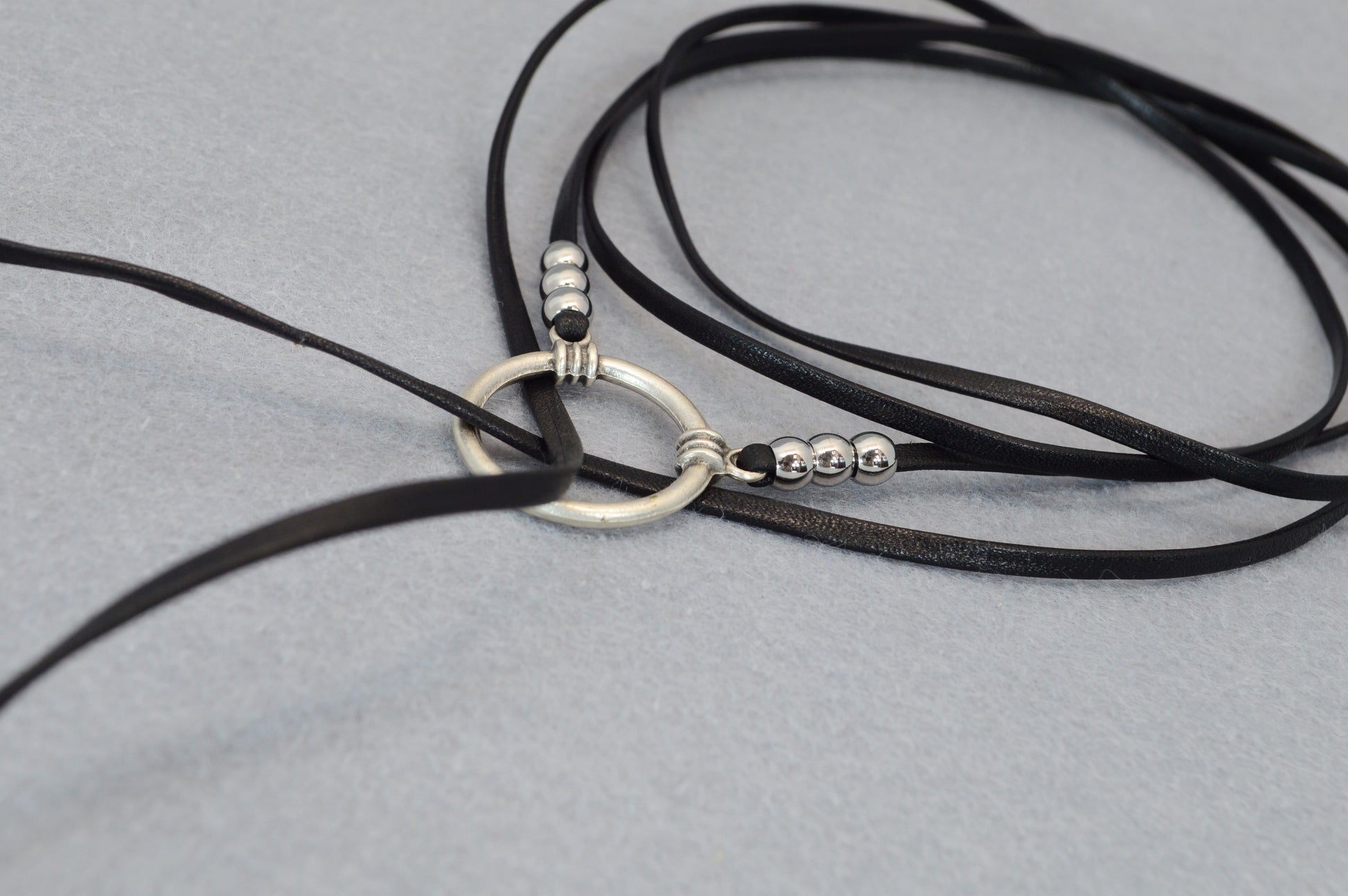 Black Leather Choker Necklace with Silver Ring – Adjustable Wrap, Boho Punk Gothic Minimalist Statement Jewelry, Unisex Trend Fall 2025