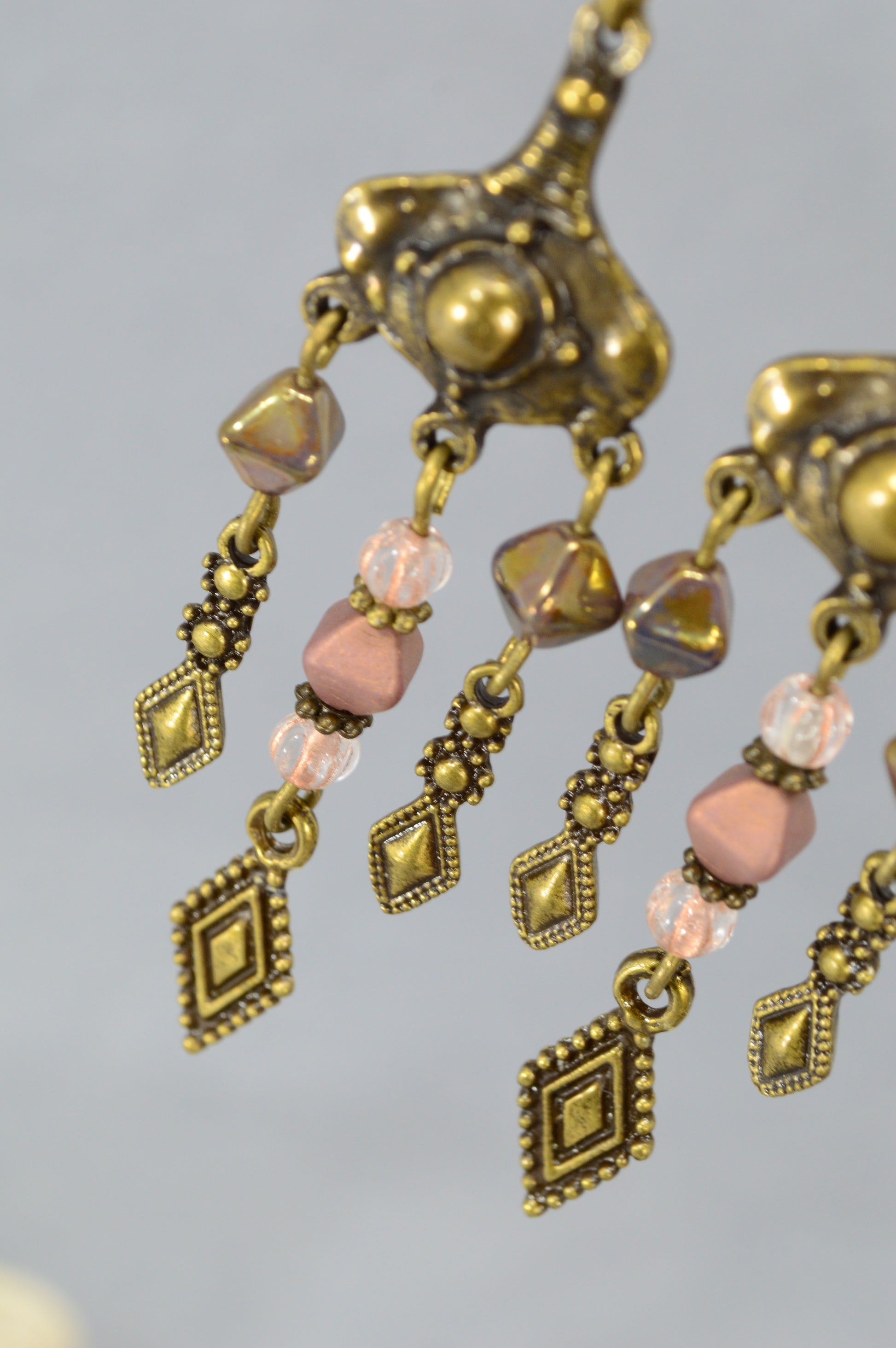 These boho bronze chandelier earrings feature soft peach-toned Czech glass beads paired with ornate vintage-style metalwork and delicate geometric charms. At 3.7" in length, they create an elegant elongated silhouette with graceful movement and a warm artisan glow. The mix of faceted, matte and iridescent Czech beads gives the earrings a romantic gypsy, tribal and handcrafted aesthetic, perfect for flowy dresses, festival outfits, earthy bohemian layers or adding a unique accent to everyday neutrals. A beautiful gift for anyone who loves expressive jewelry with color, texture and old-world charm.