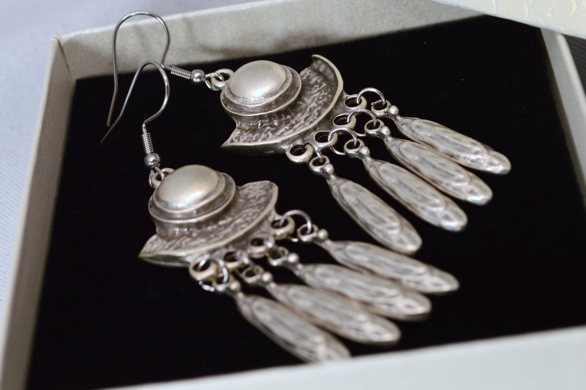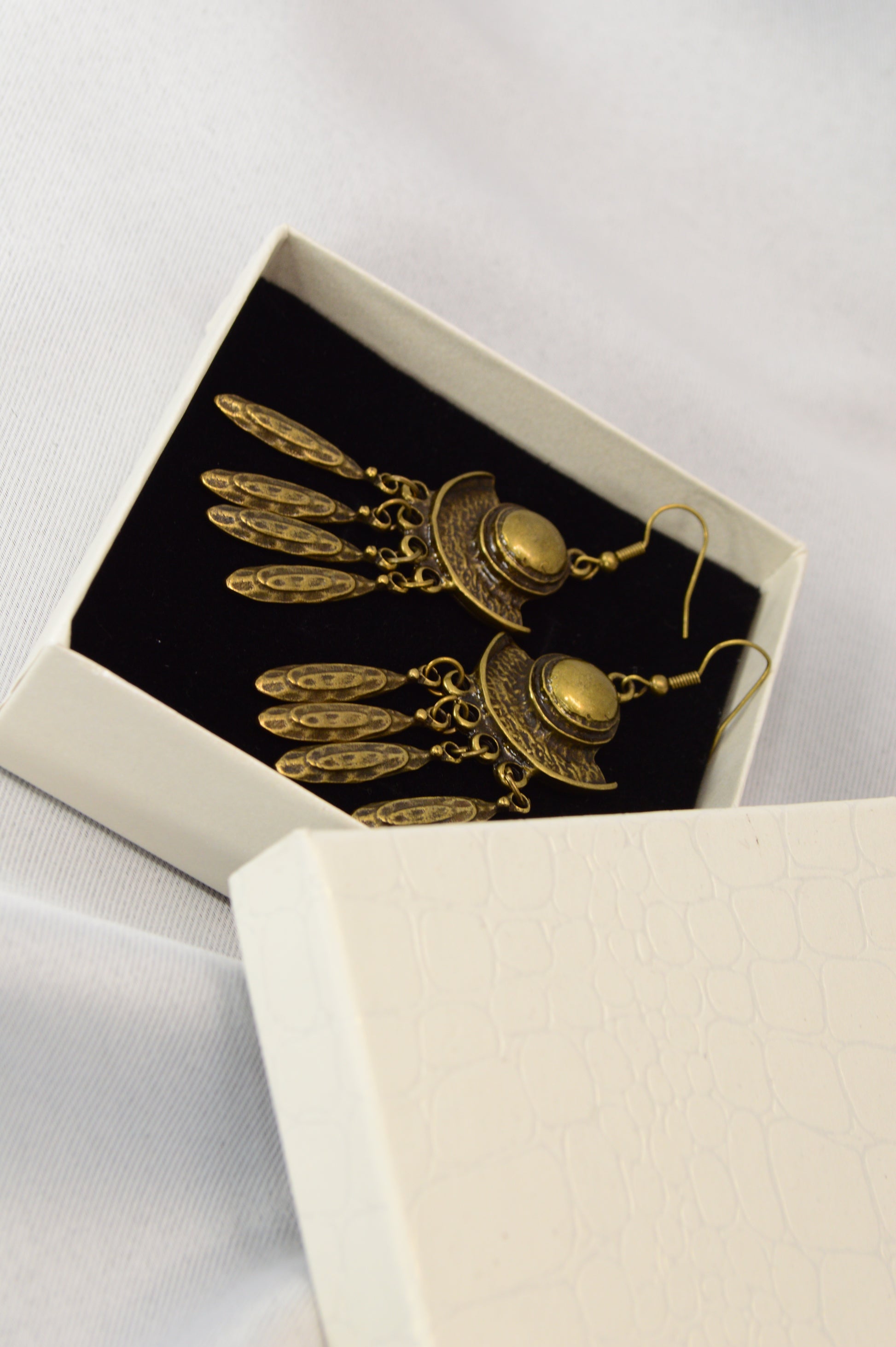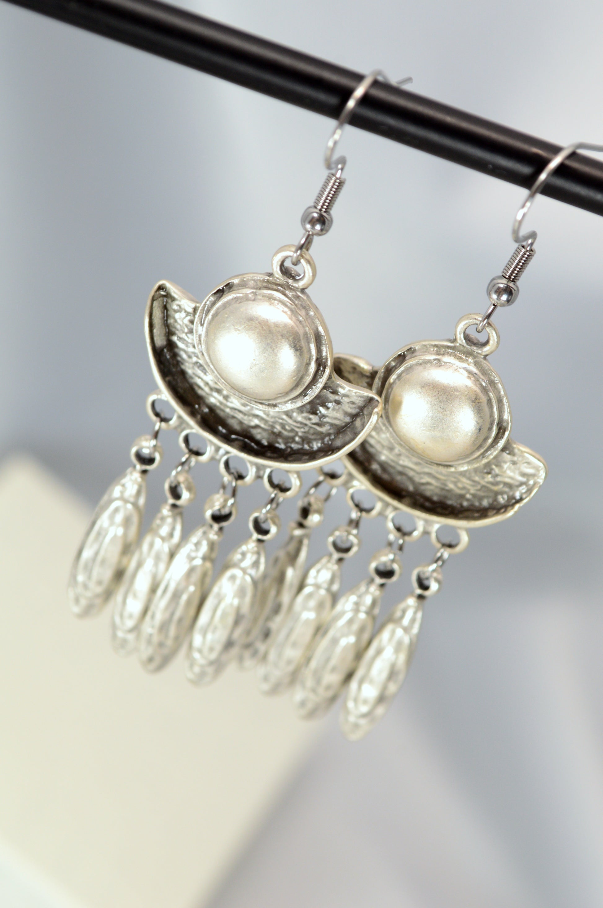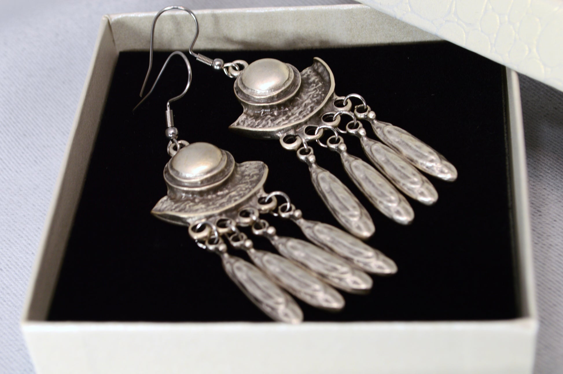 These boho crescent-shaped dangle earrings measure 7.5 cm (3") in length, giving them an elegant, eye-catching movement. Available in two expressive finishes — bright antique silver and warm aged bronze — they blend a bold vintage charm with a handcrafted ethnic, gypsy and tribal feel. The textured crescent top and dangling charms make them perfect for bohemian outfits, festivals, beach looks or adding character to simple everyday wear. A thoughtful gift for anyone who loves artistic statement jewelry with retro flair. The silver tone adds a cool shimmering accent, while the bronze finish brings depth and a warm rustic vibe, easy to style with natural fabrics and layered boho looks.