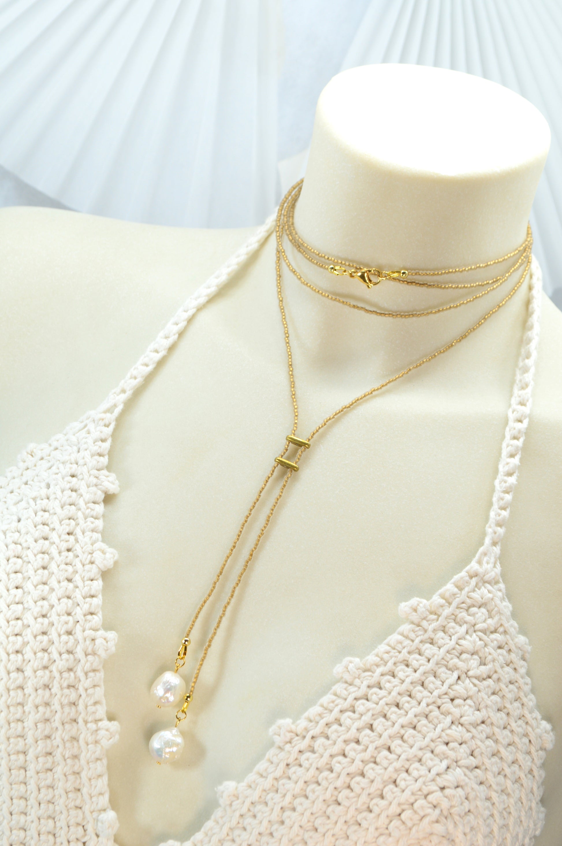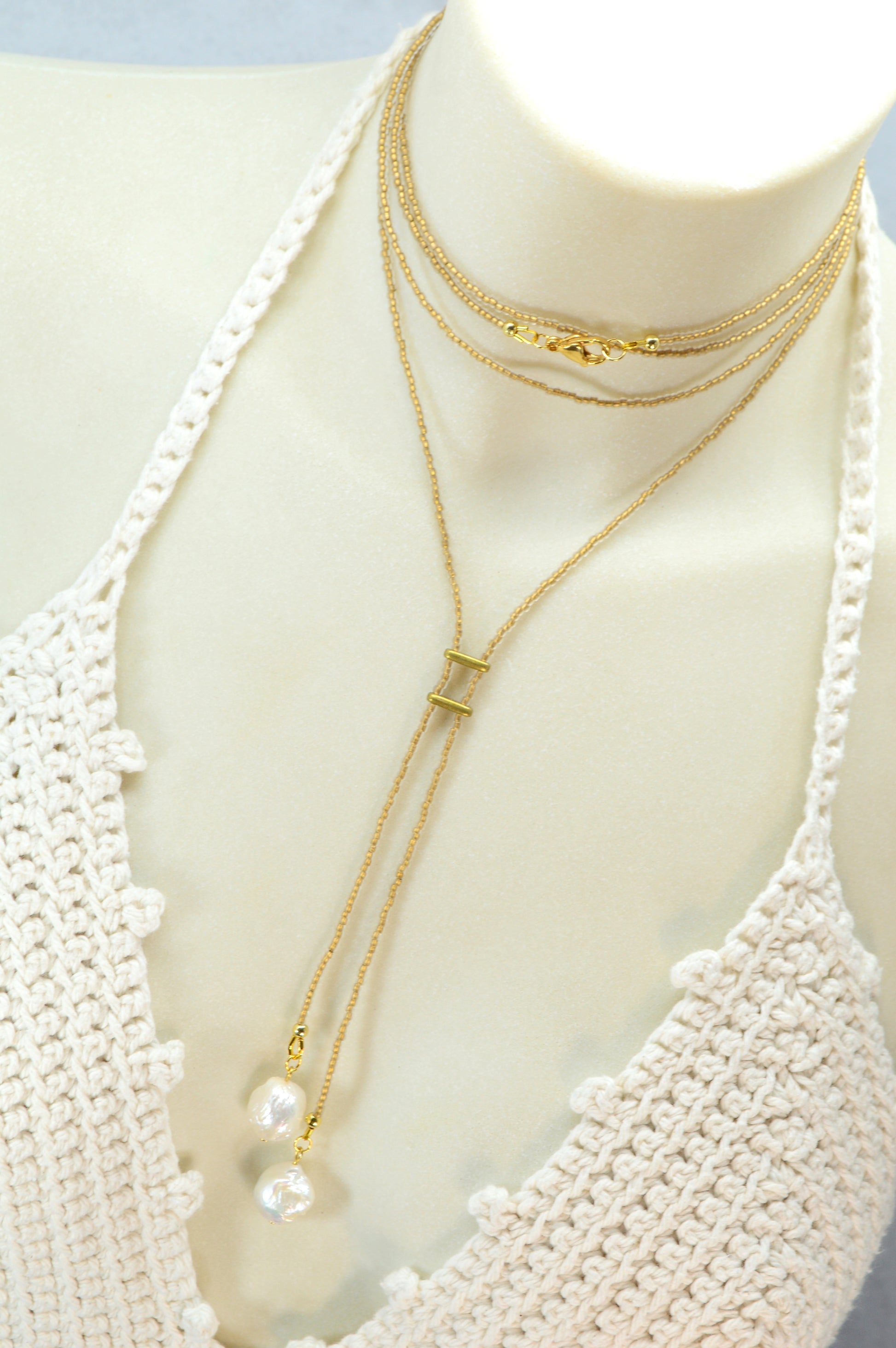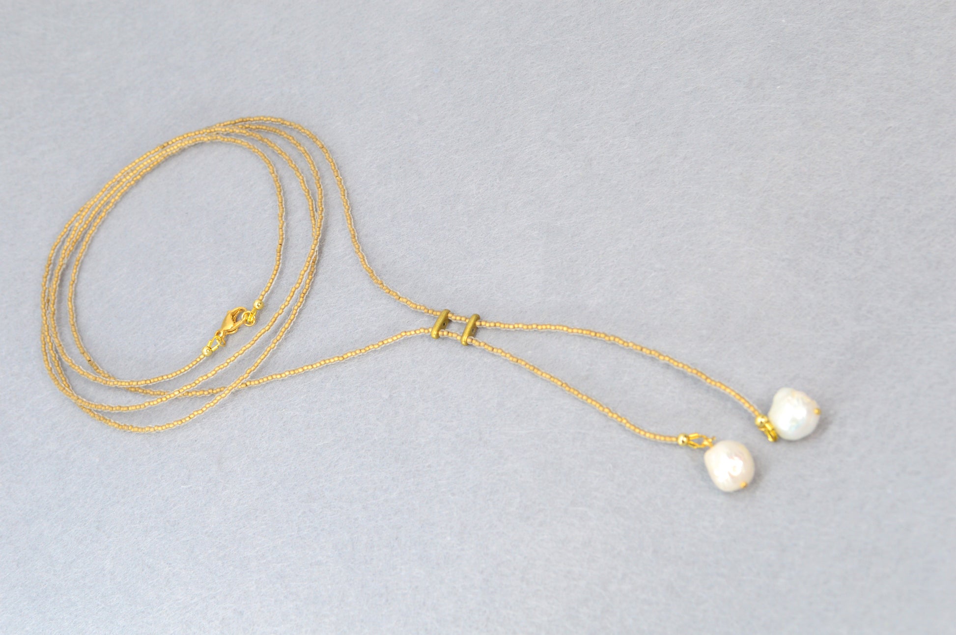 Boho Gold Beaded Lariat Necklace – Minimalist Wrap Y Necklace with Baroque Freshwater Pearls – Layered Handmade Jewelry