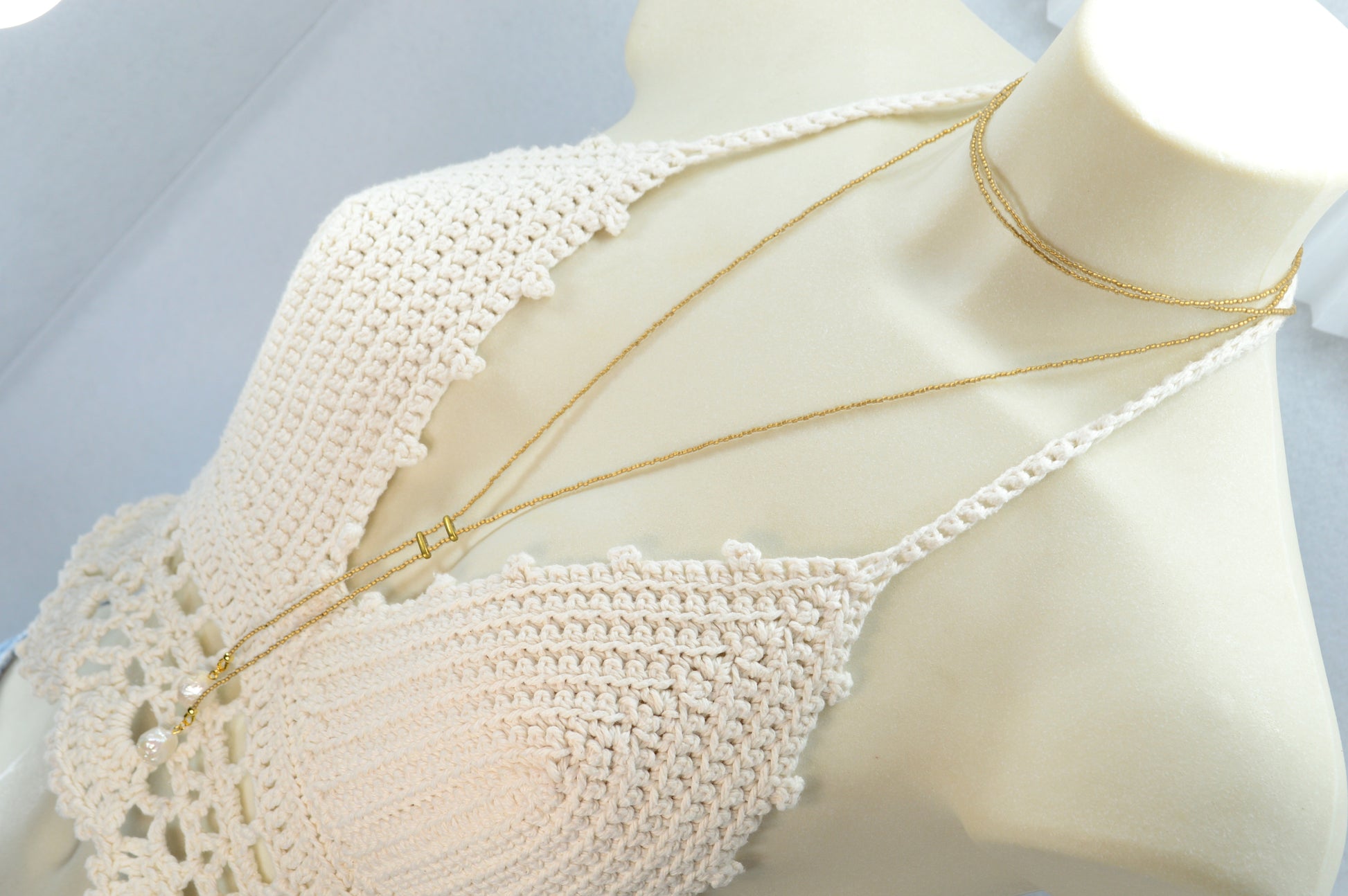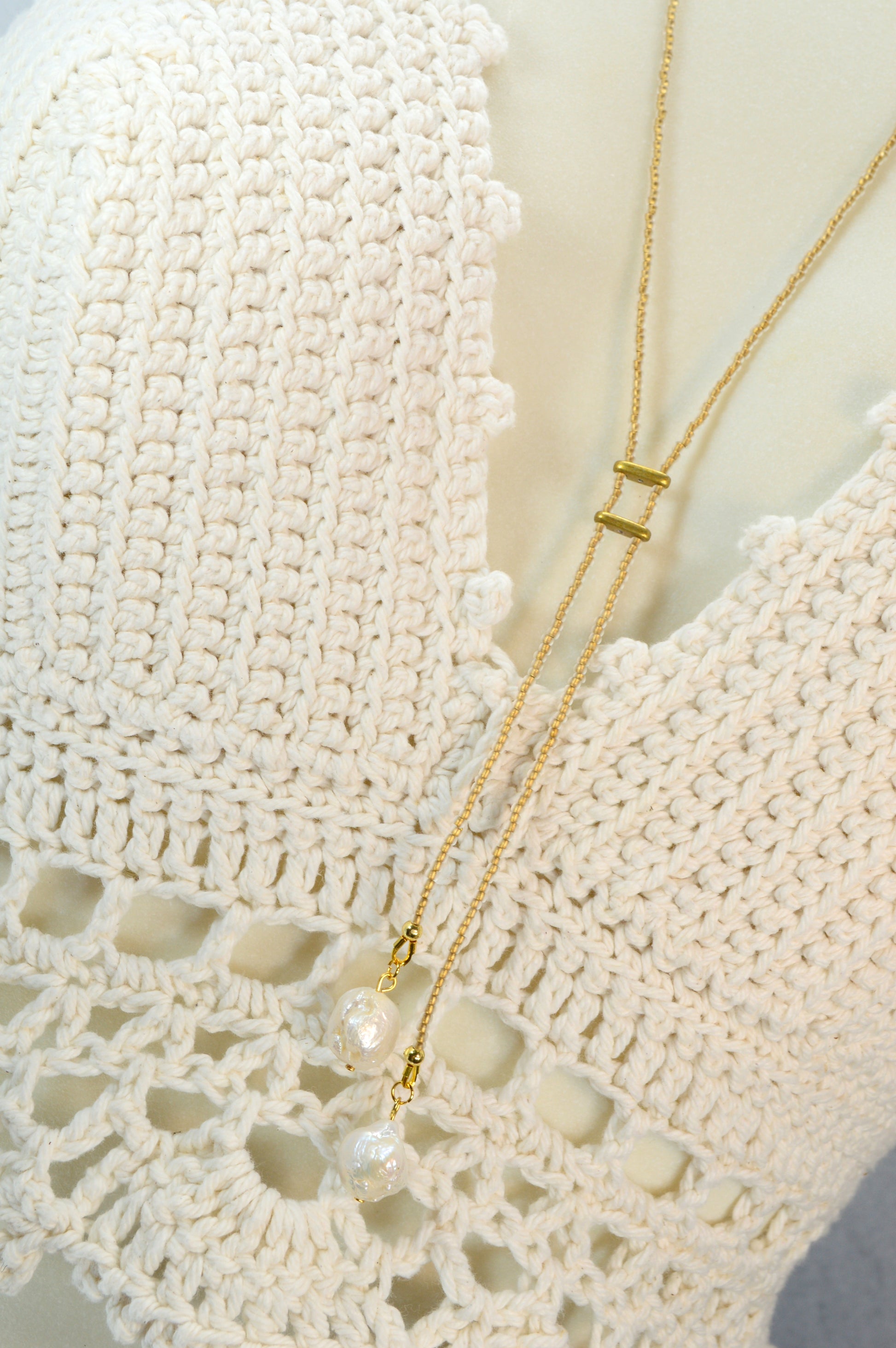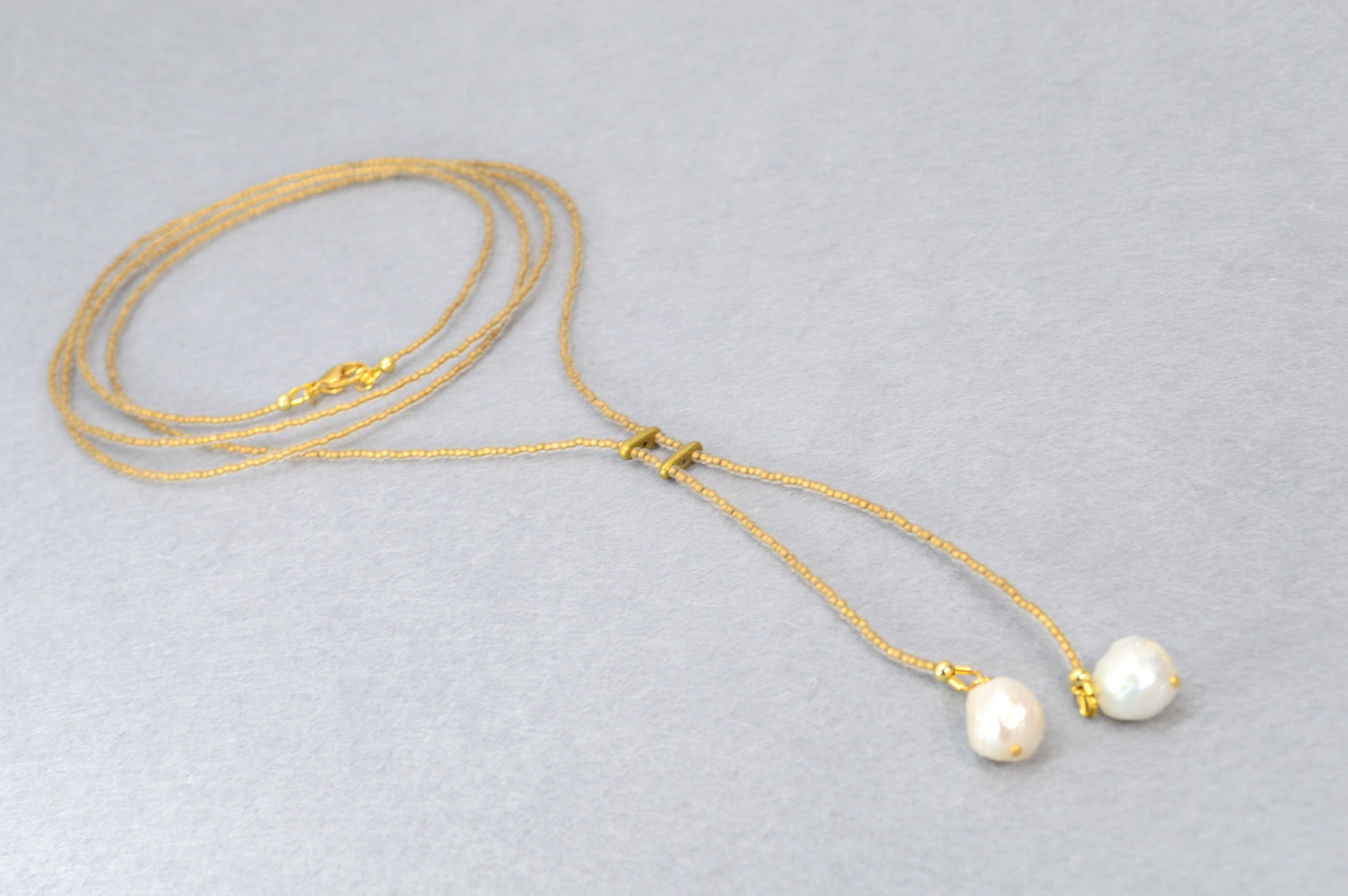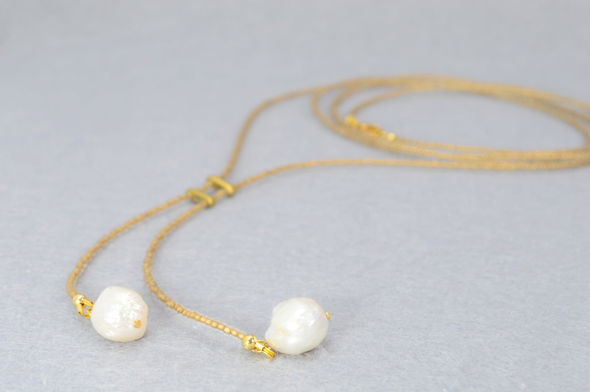 Boho Gold Beaded Lariat Necklace – Minimalist Wrap Y Necklace with Baroque Freshwater Pearls – Layered Handmade Jewelry