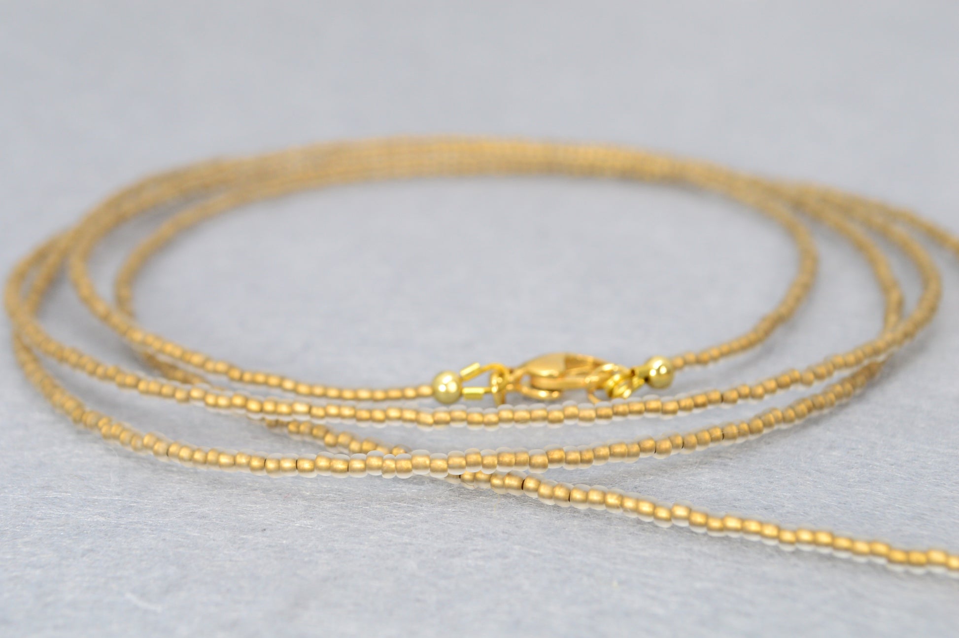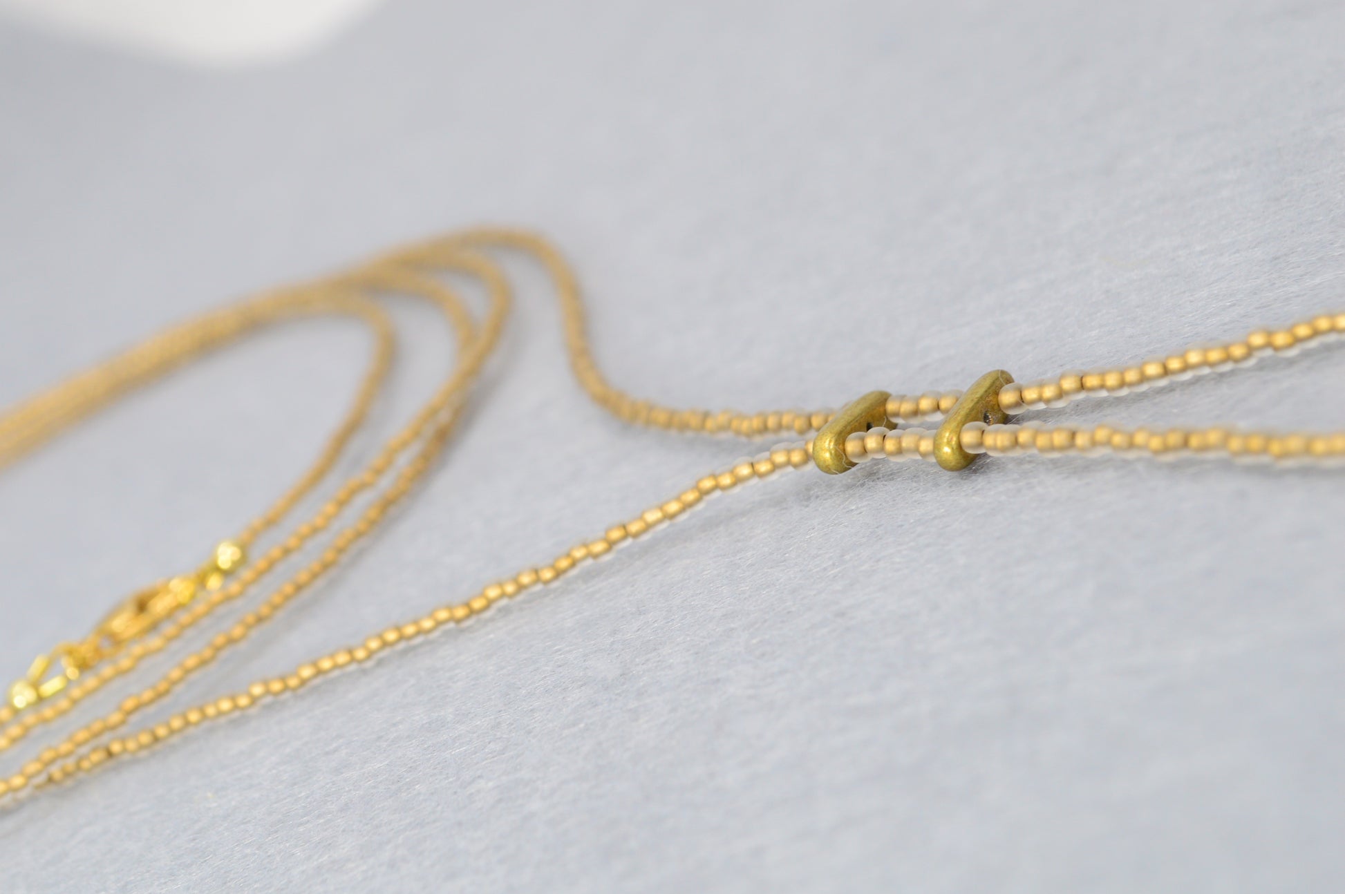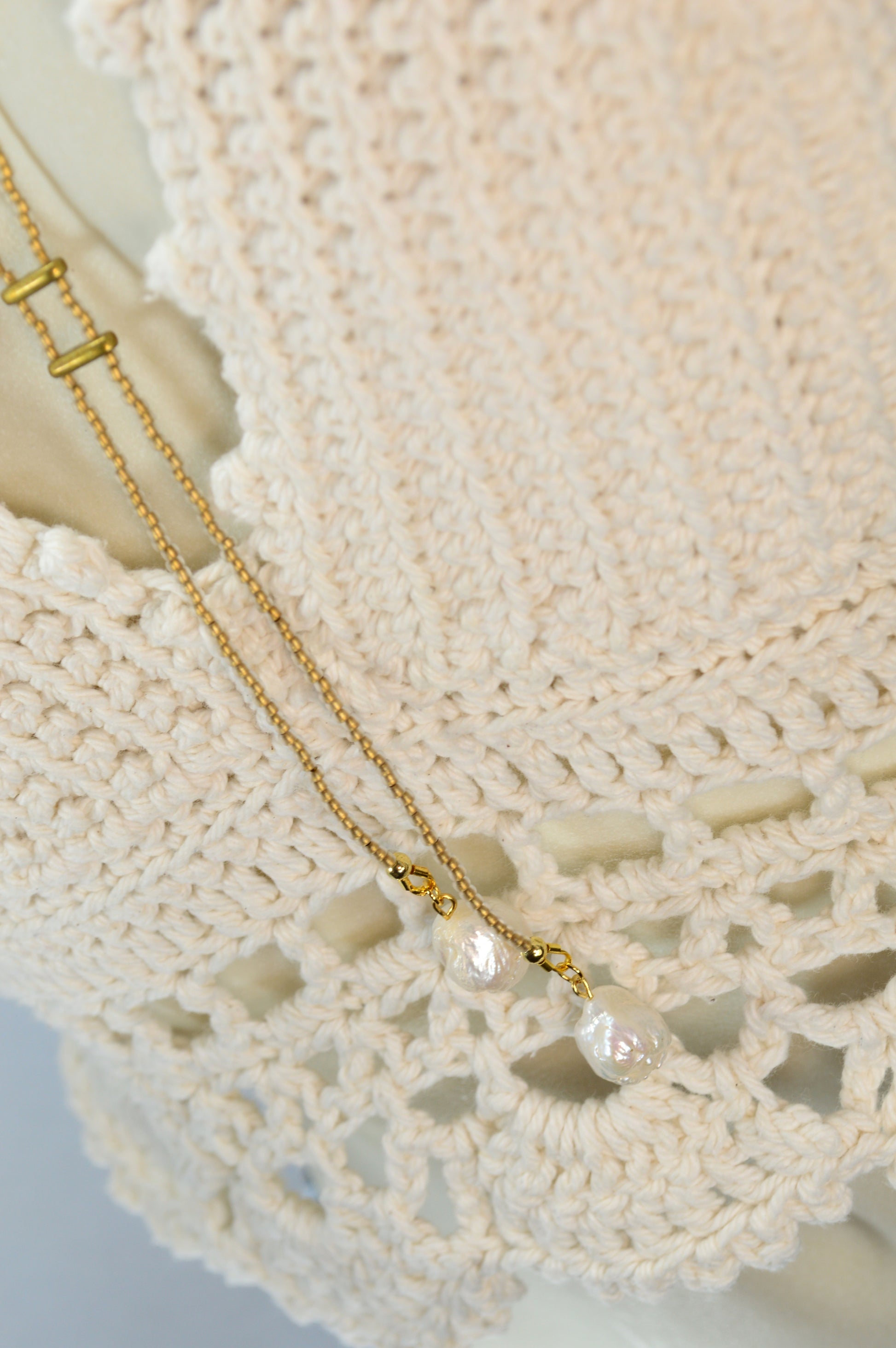 Make a subtle yet striking statement with this minimalist Boho Gold Beaded Lariat Necklace. Handcrafted with warm golden glass beads and finished with two lustrous baroque freshwater pearls, this Y-shaped necklace wraps beautifully around the neck for versatile styling.