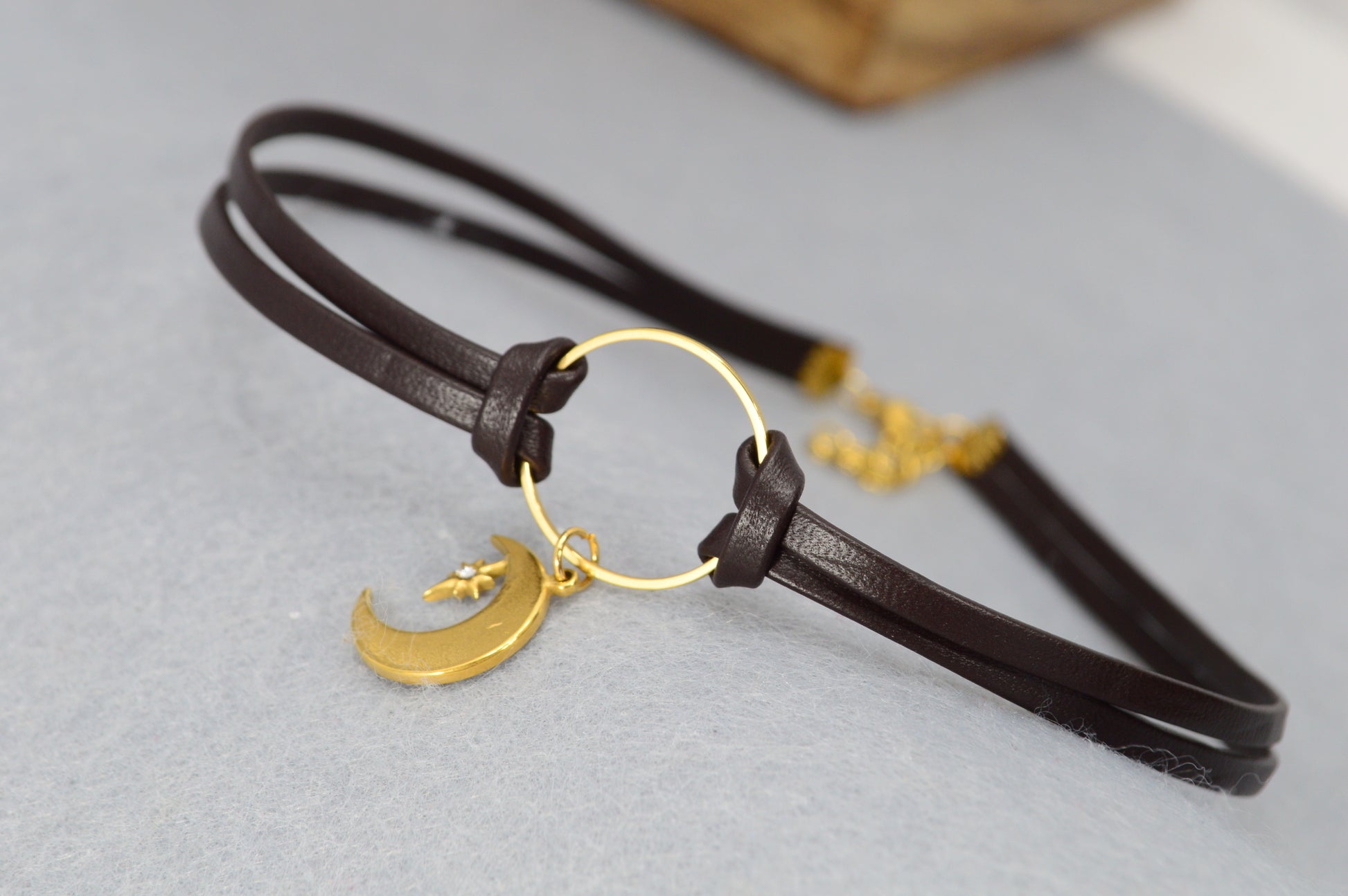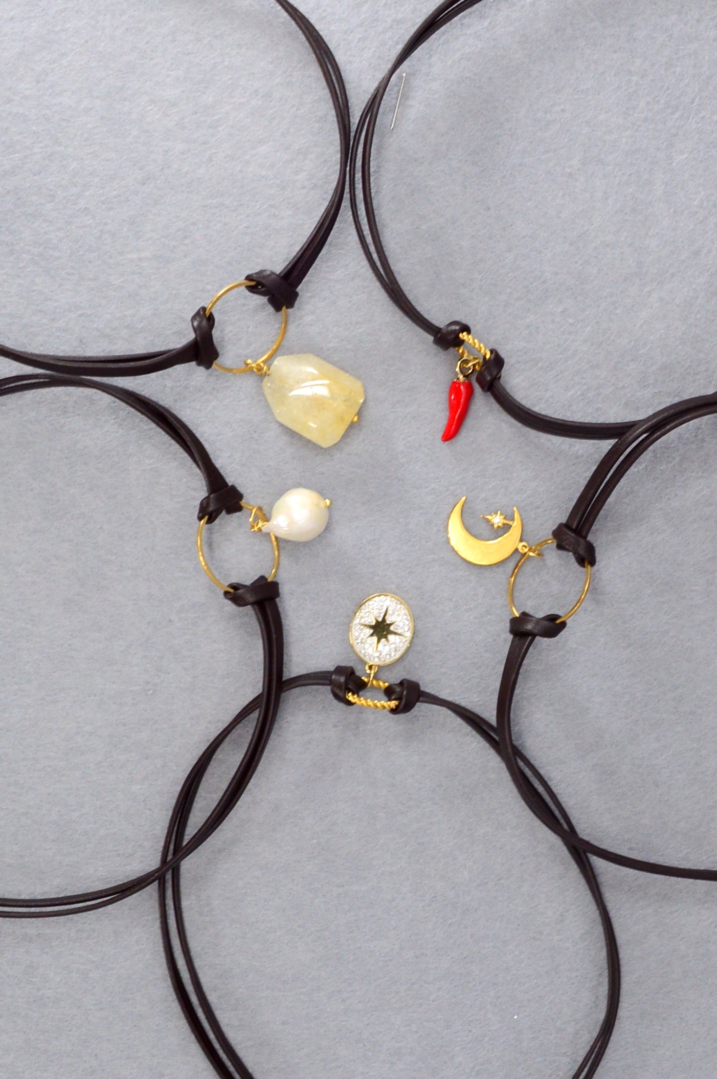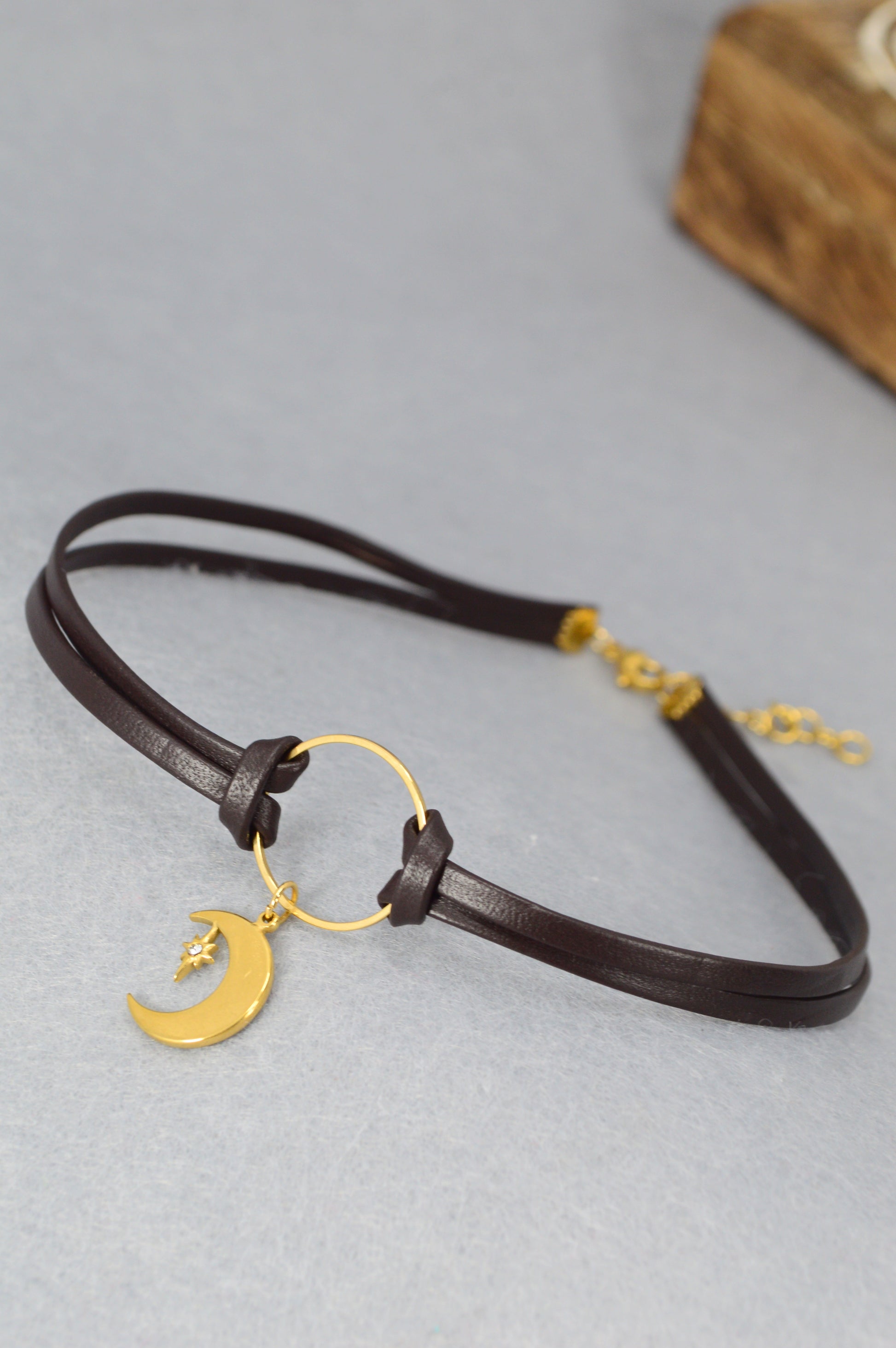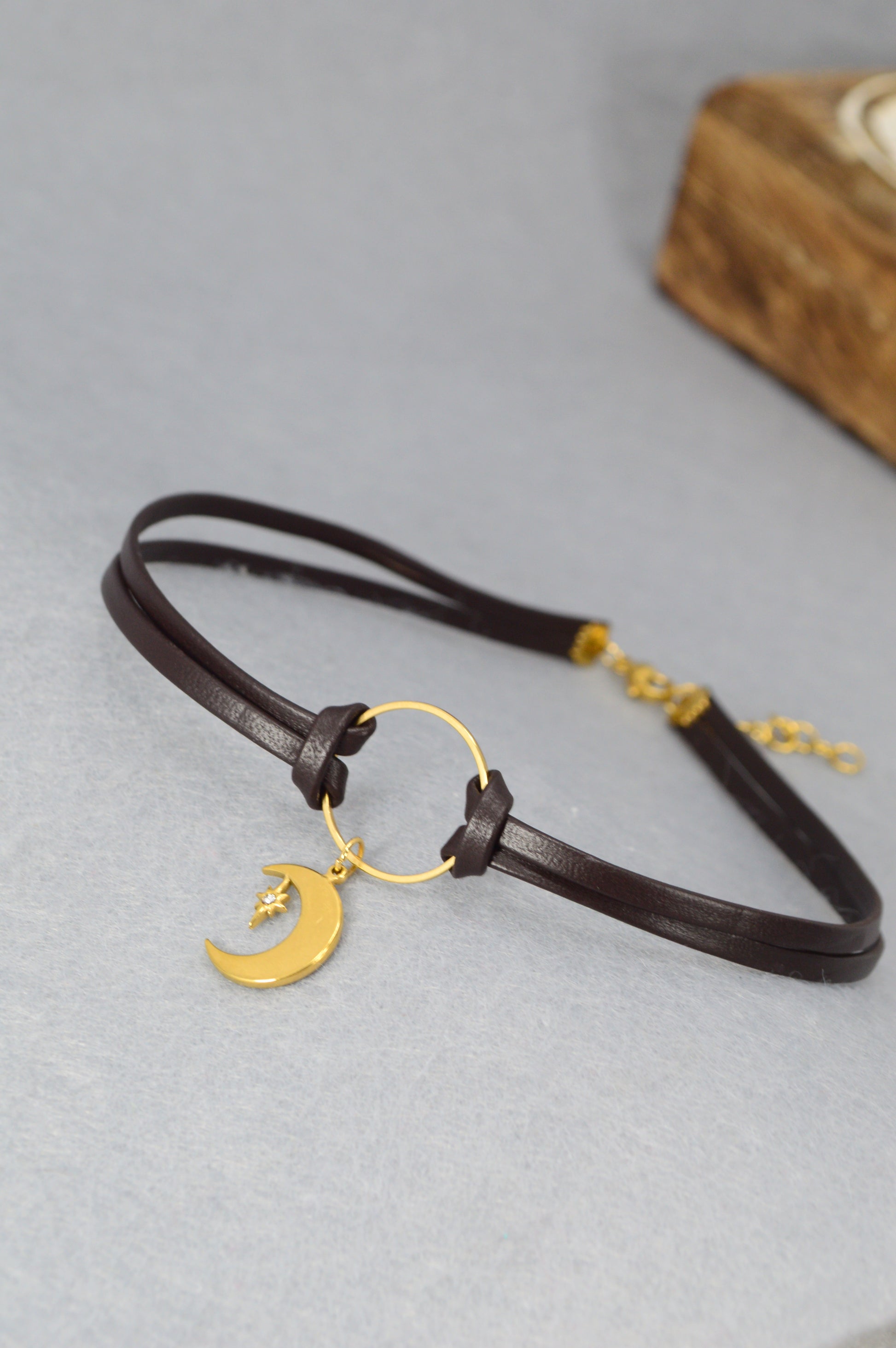 Boho Leather Choker Necklace – Gold Accents & Charms – Moon, Pearl, Citrine, Chili, Compass