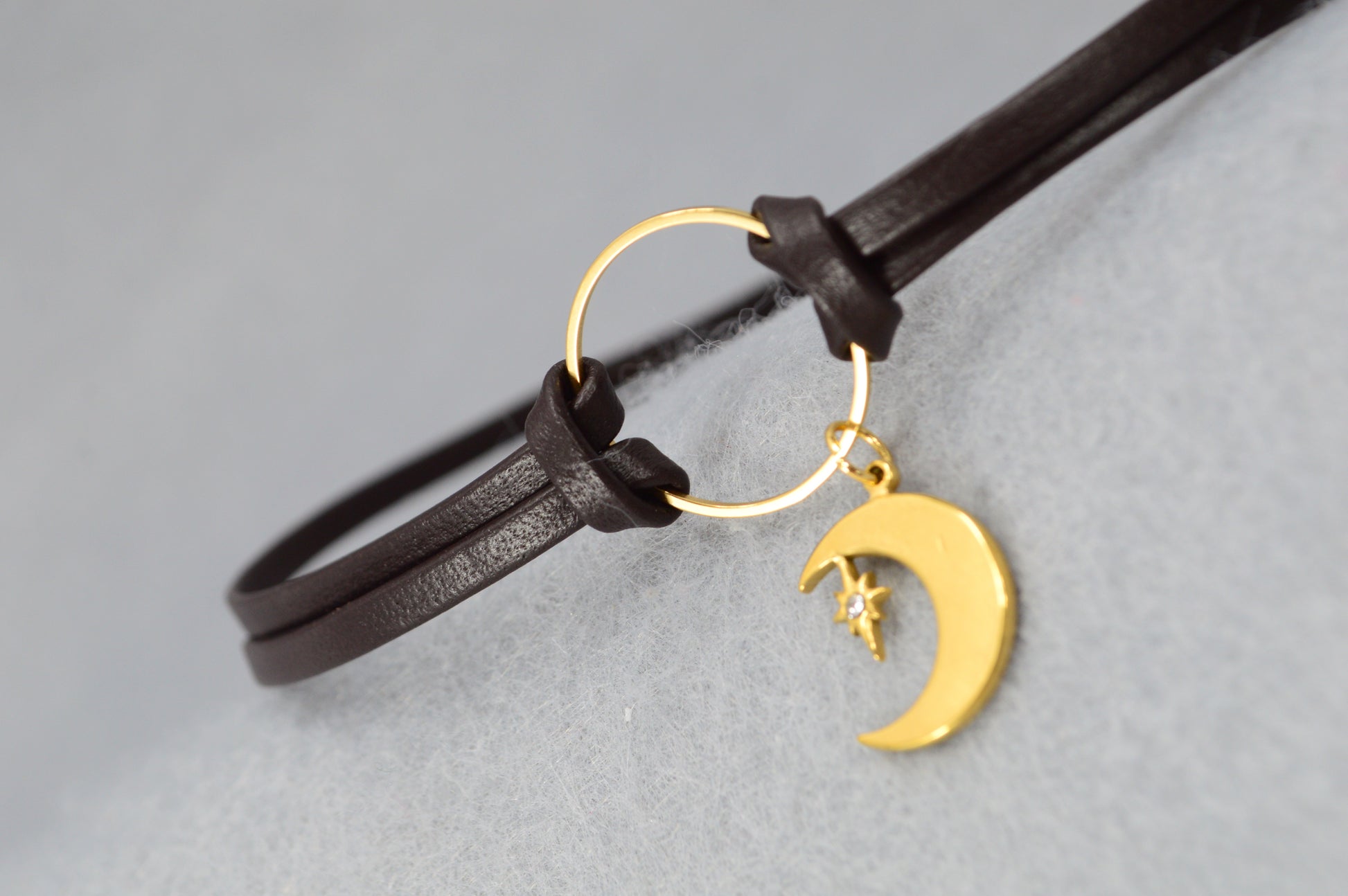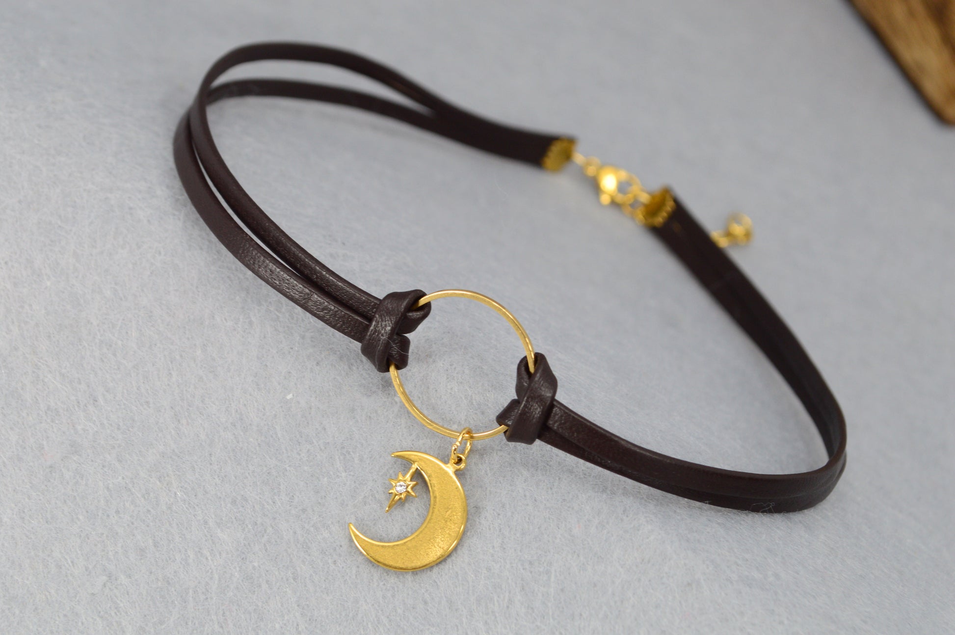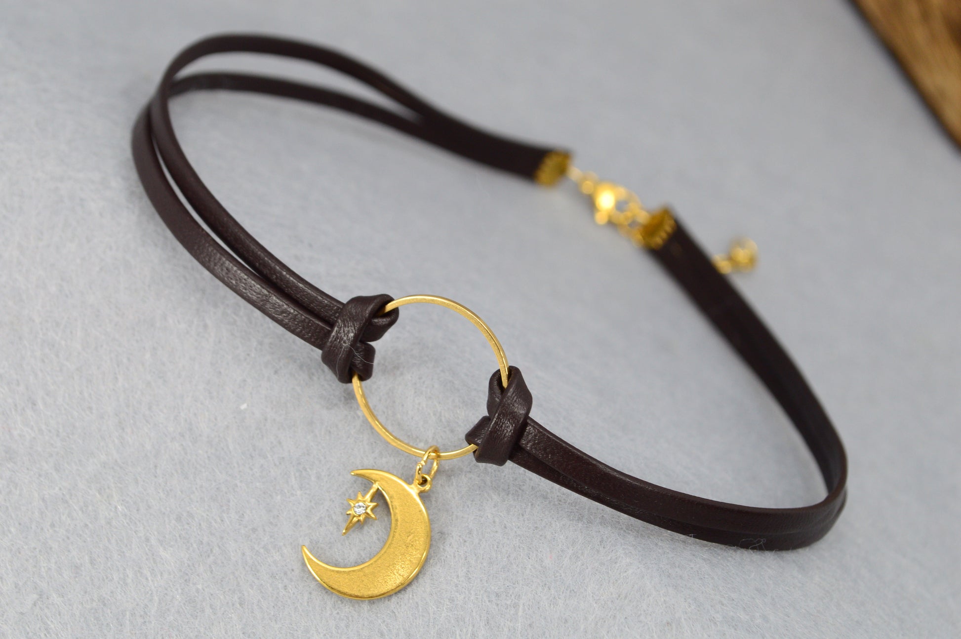 Boho Leather Choker Necklace – Gold Accents & Charms – Moon, Pearl, Citrine, Chili, Compass
