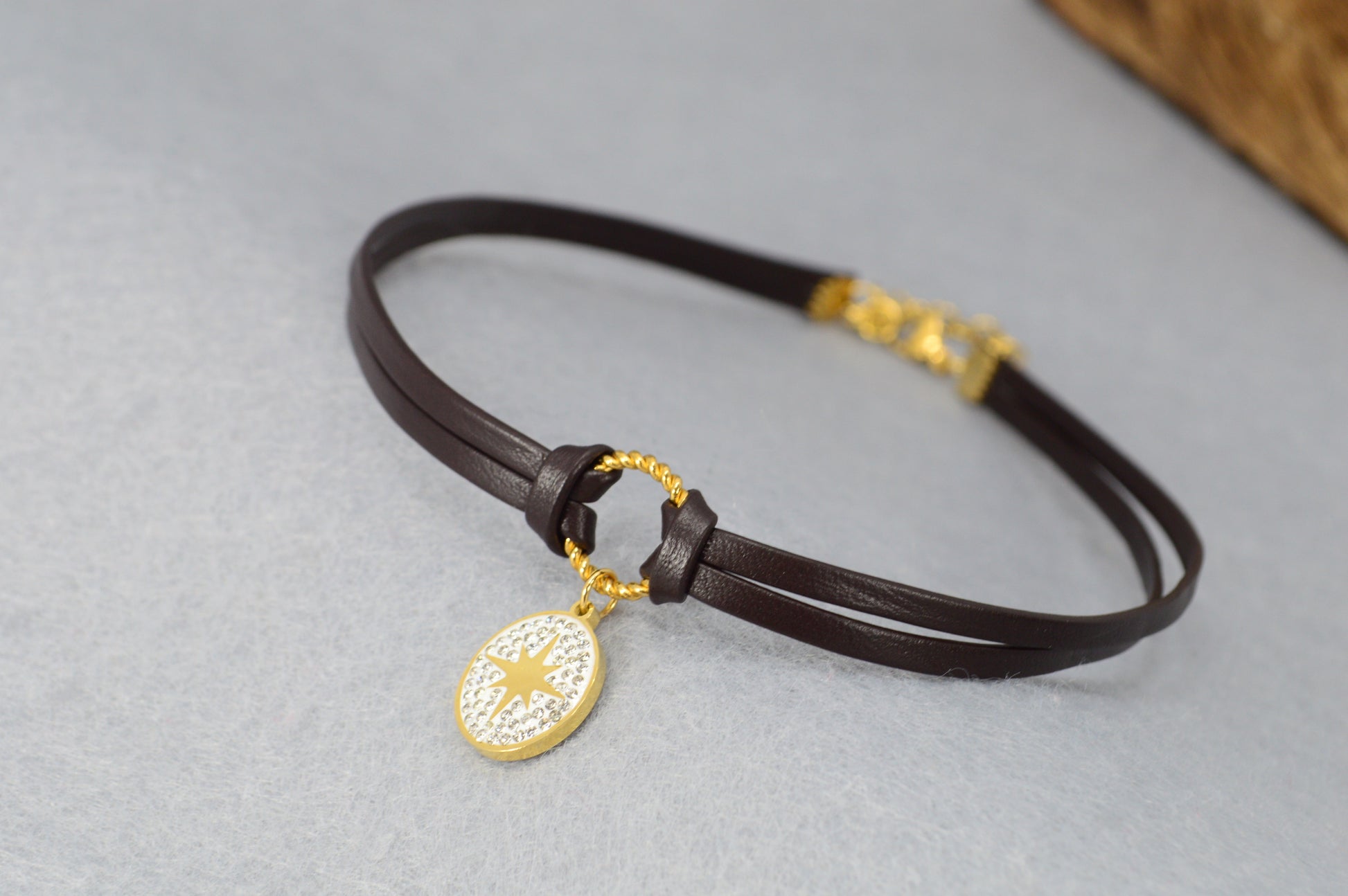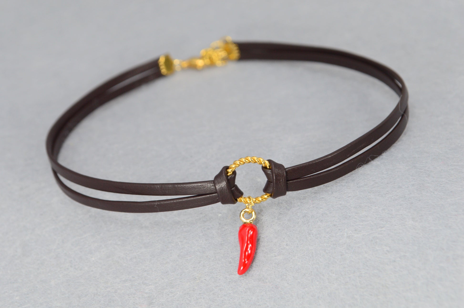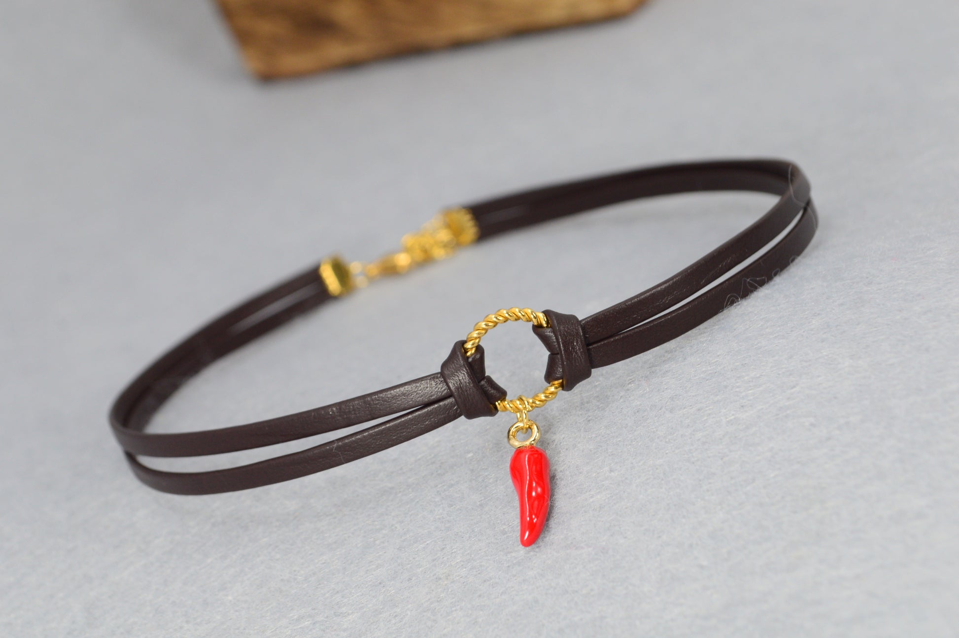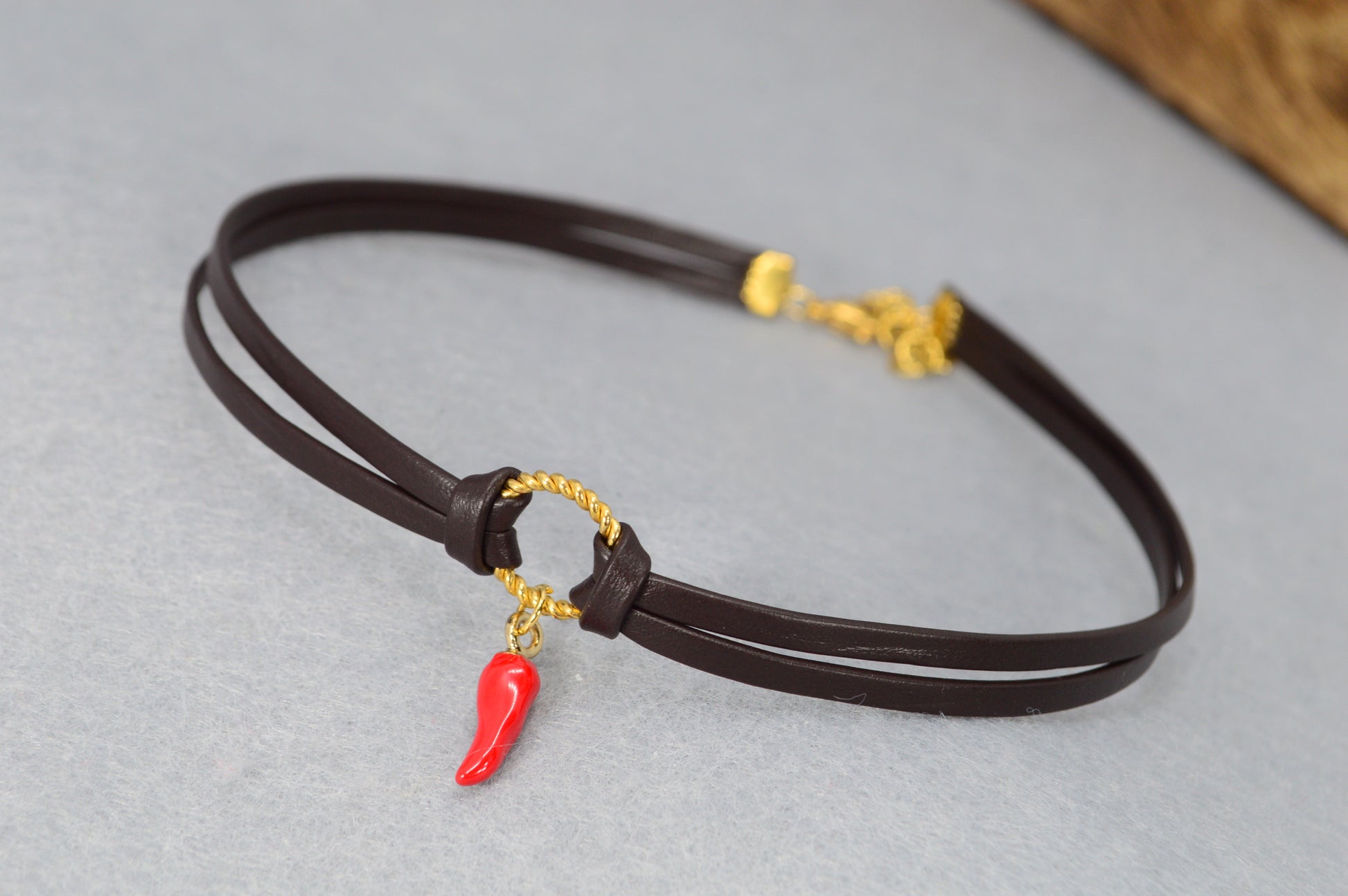 Boho Leather Choker Necklace – Gold Accents & Charms – Moon, Pearl, Citrine, Chili, Compass
