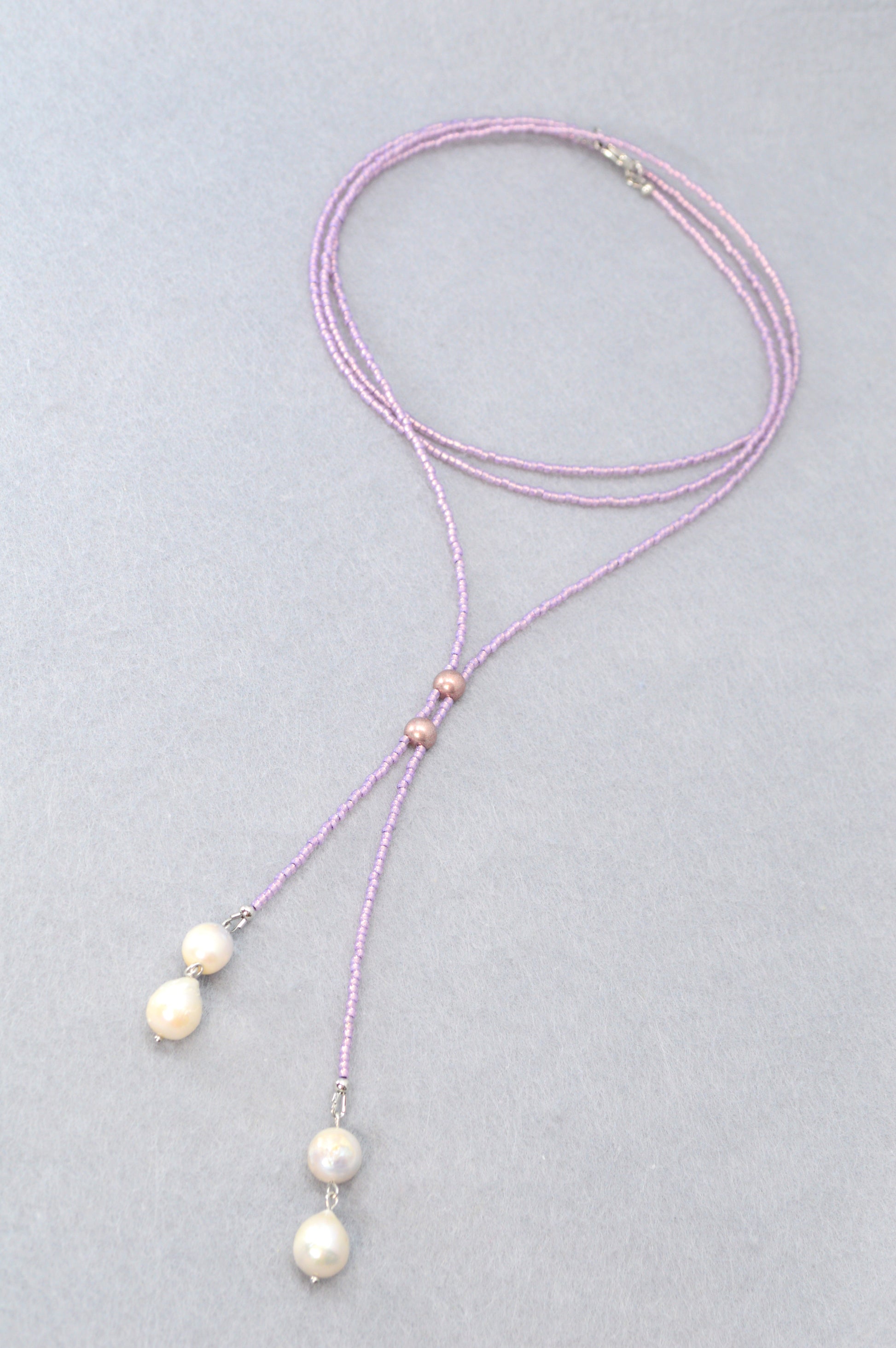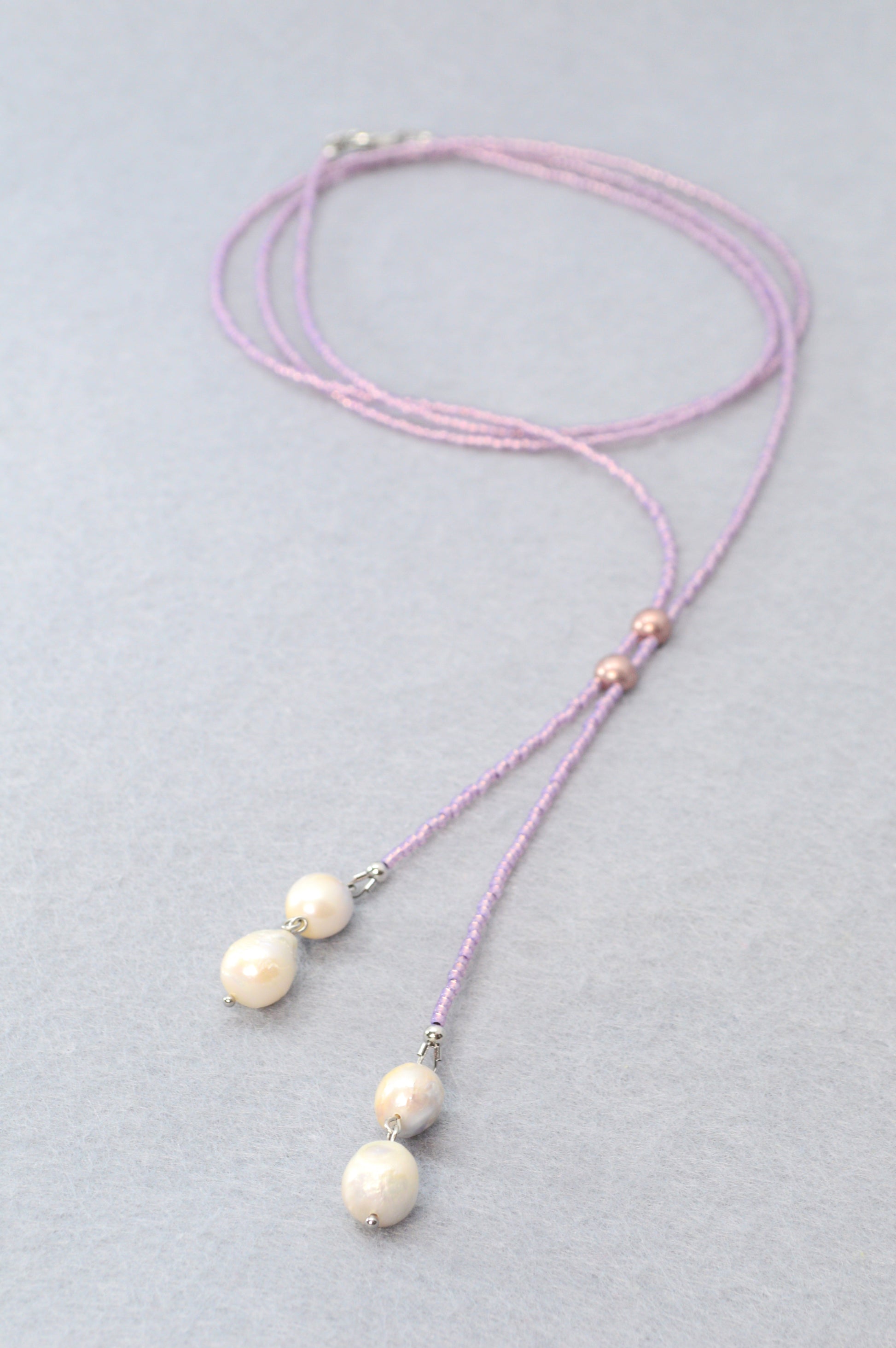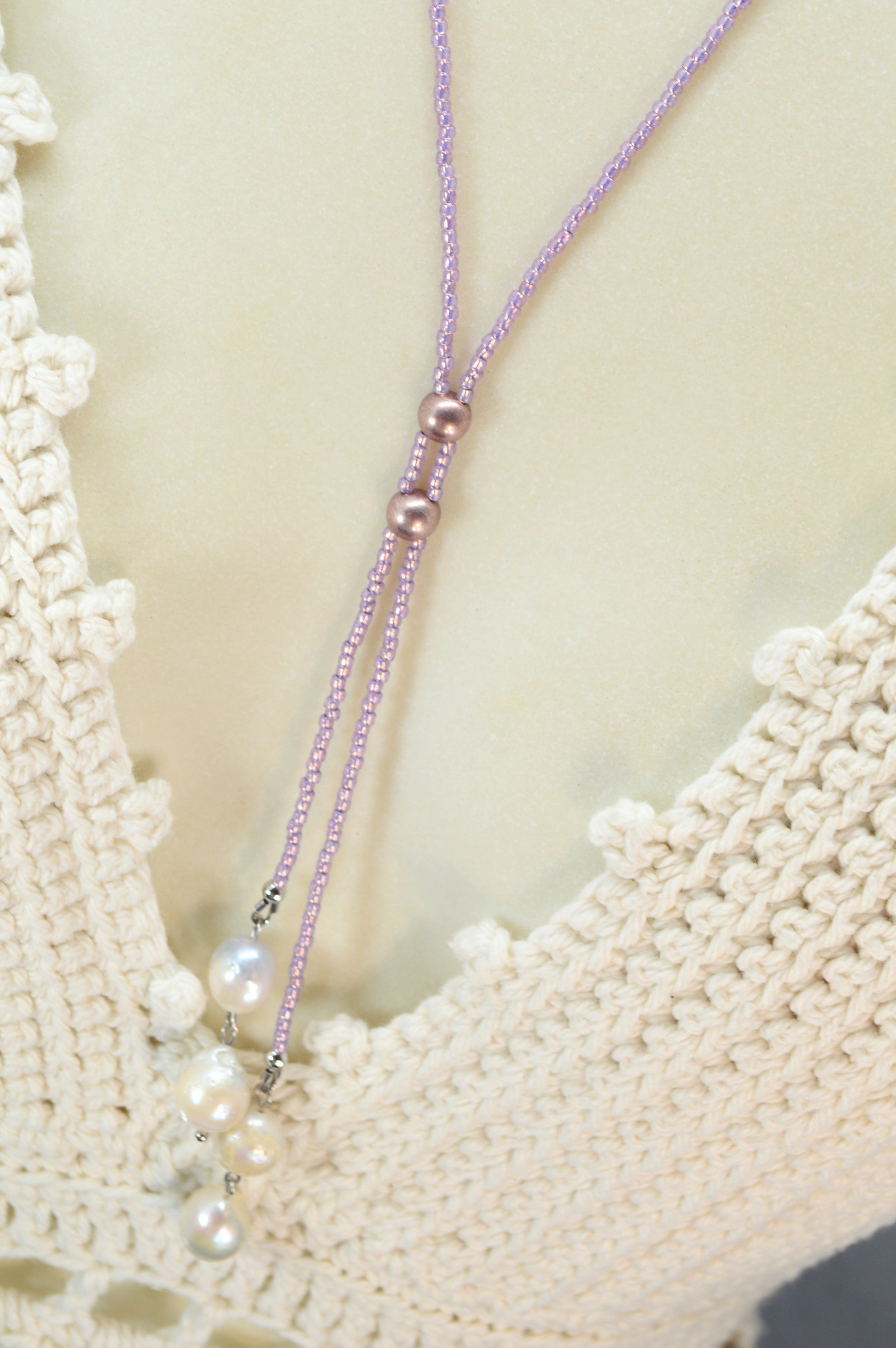 Boho Lilac Beaded Lariat Necklace – Handmade Wrap Y Necklace with Freshwater Pearls and Rose Accents – Feminine Layered Jewelry