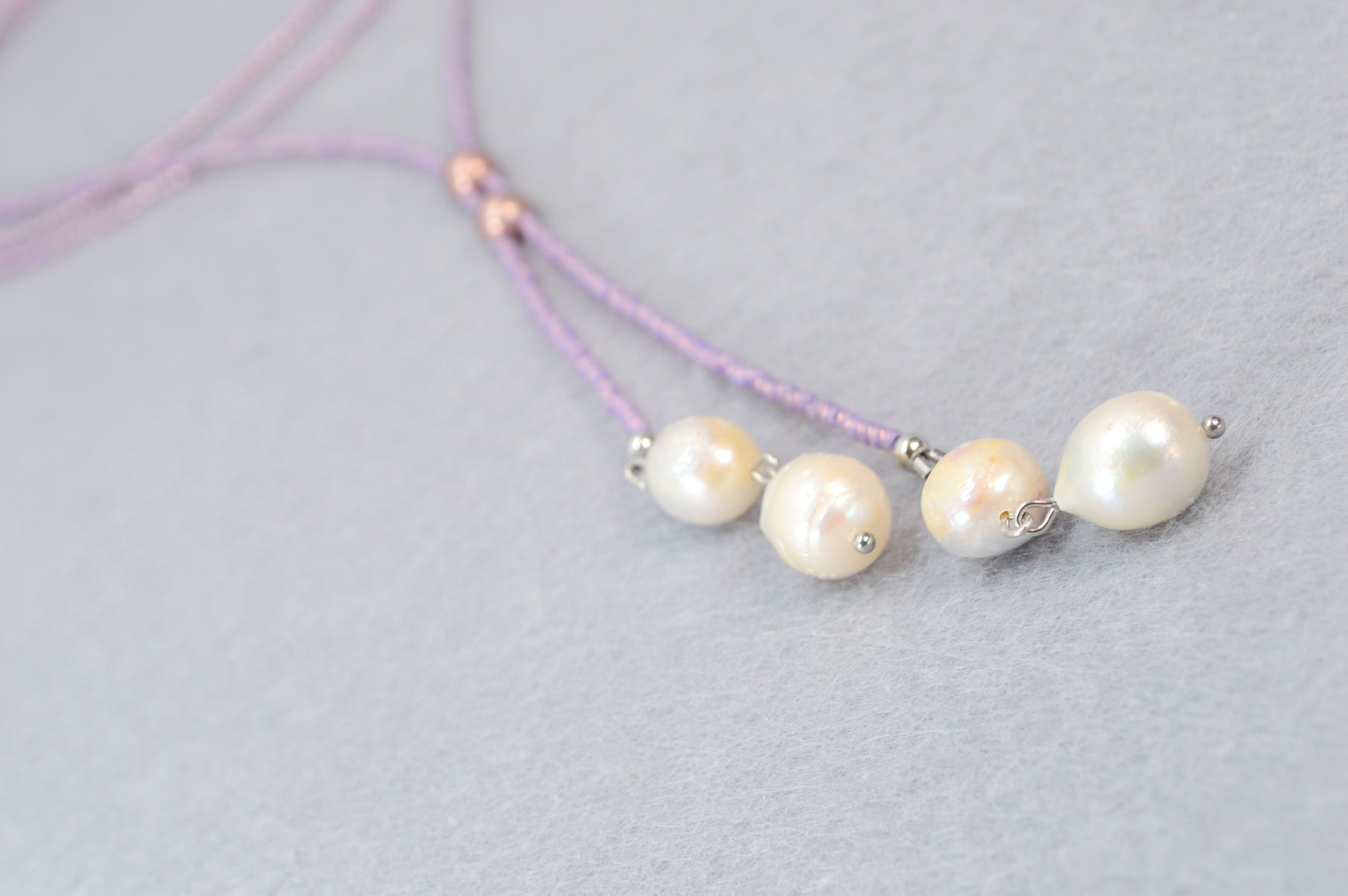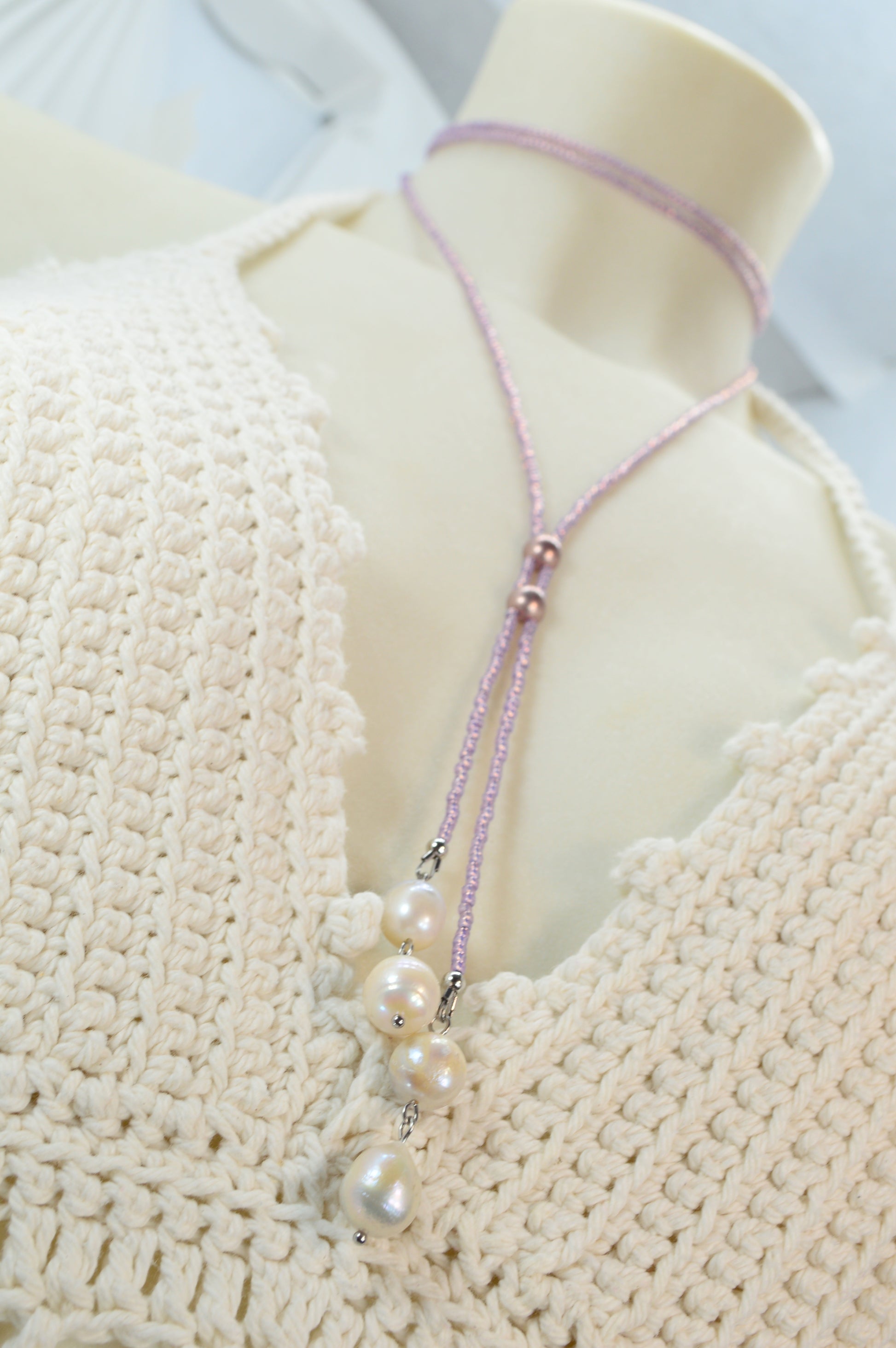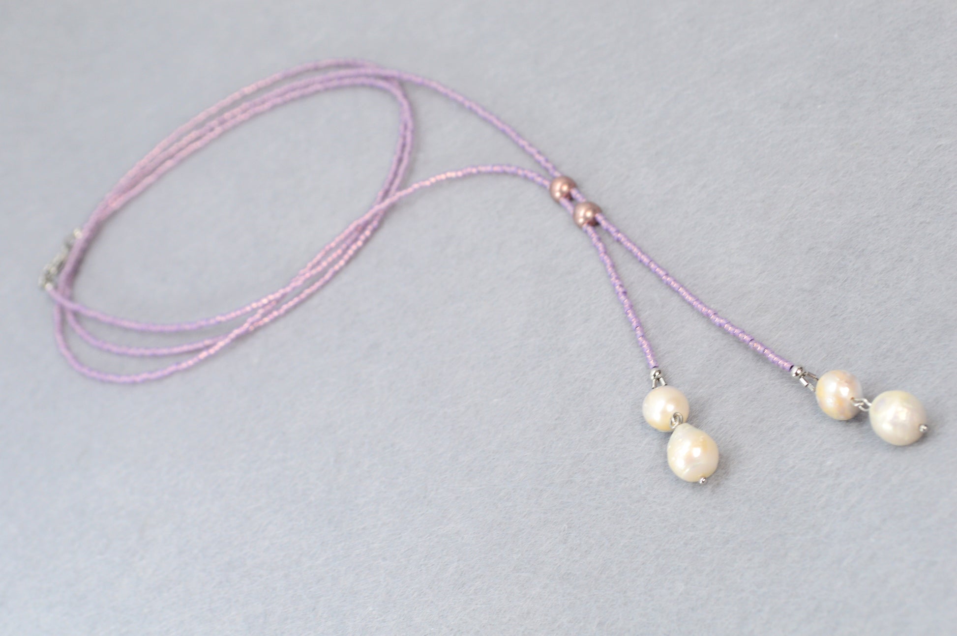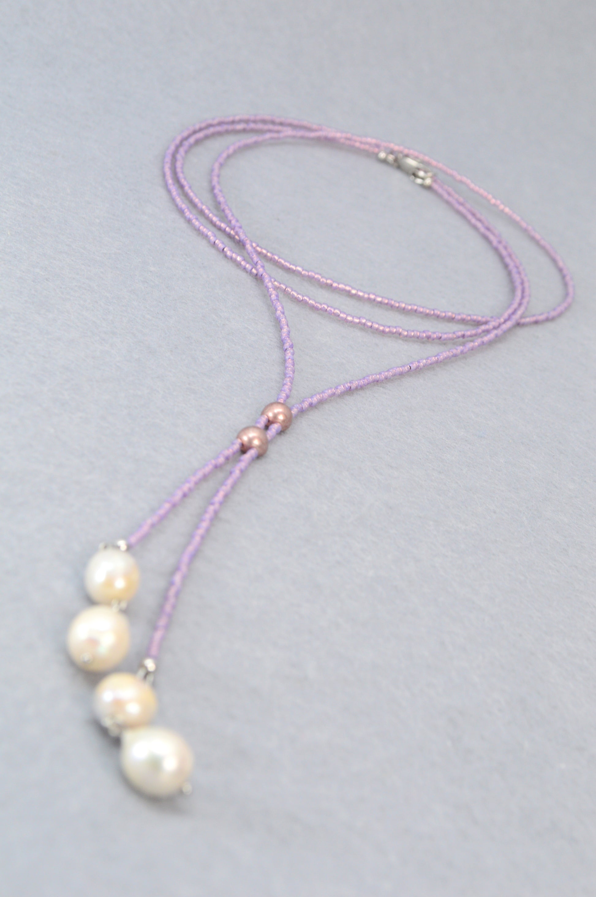 Boho Lilac Beaded Lariat Necklace – Handmade Wrap Y Necklace with Freshwater Pearls and Rose Accents – Feminine Layered Jewelry