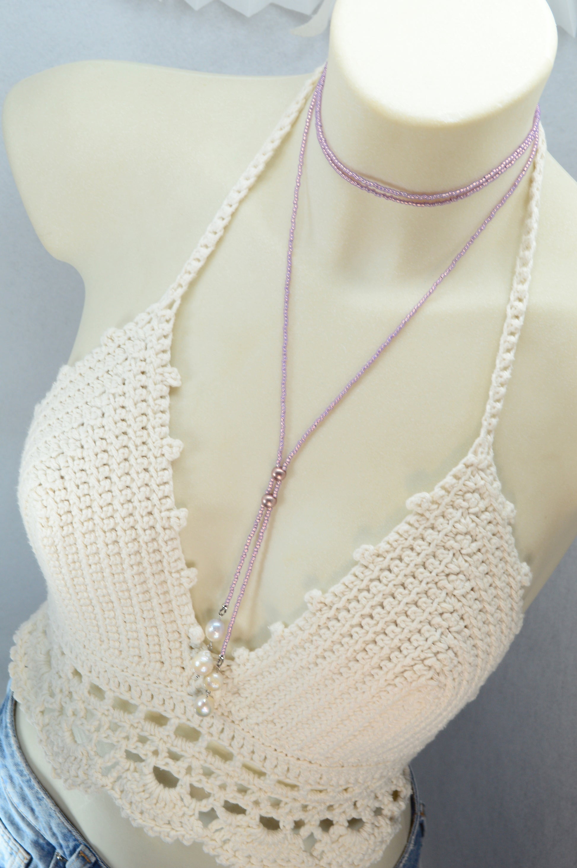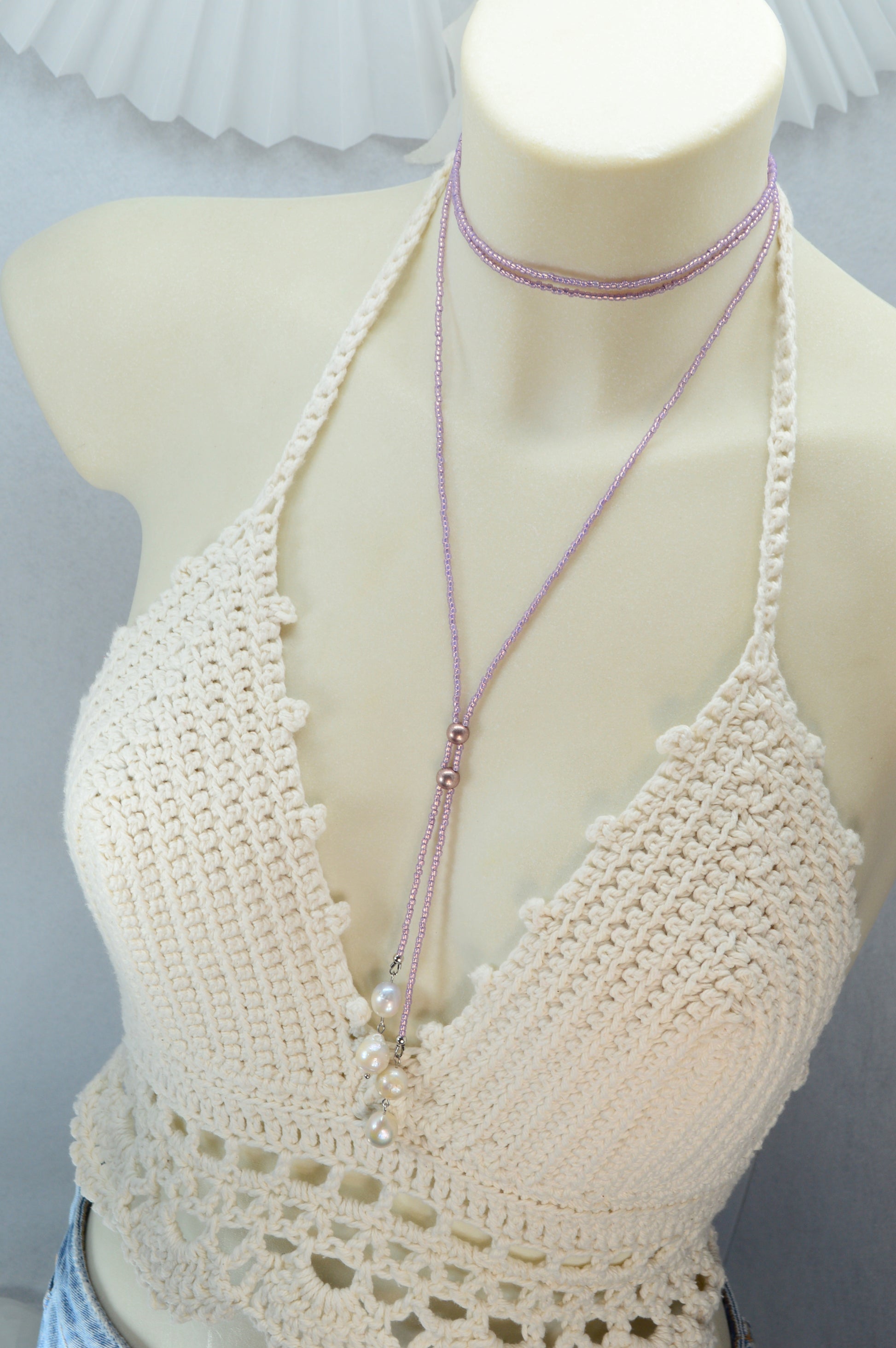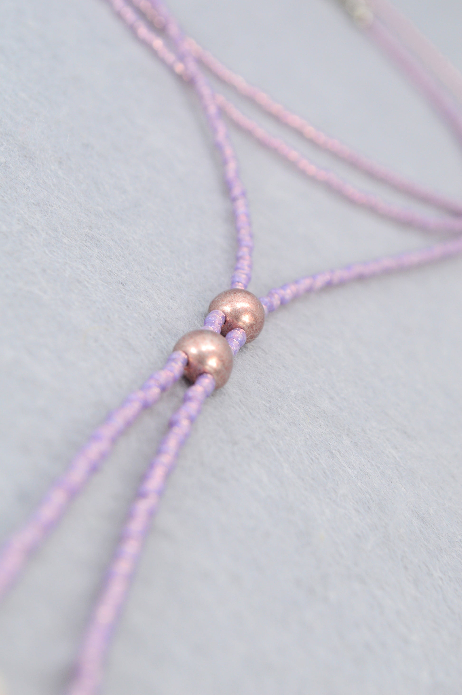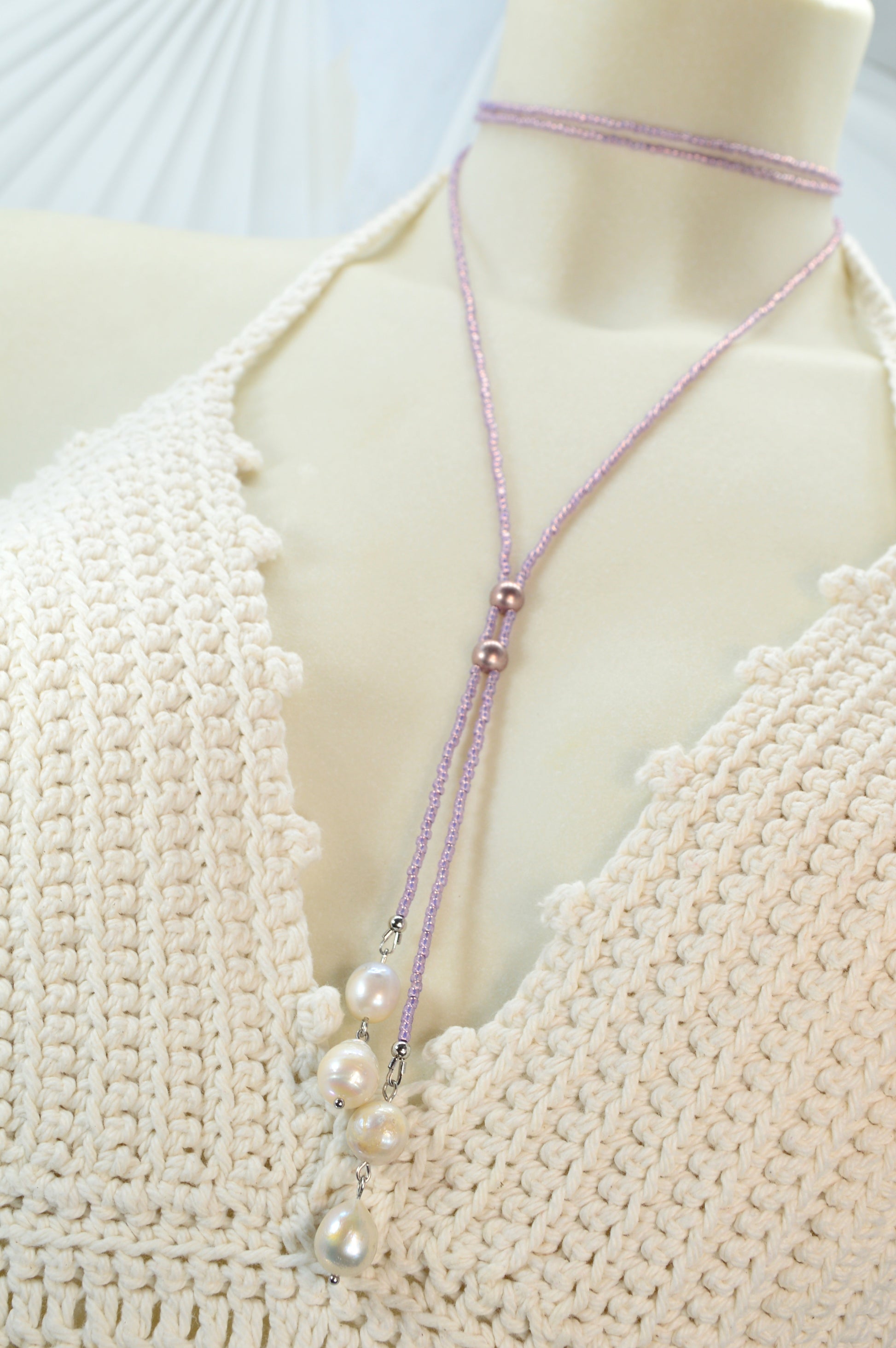This lilac beaded lariat necklace is a true boho statement piece. Handmade with love, it features tiny glass seed beads in soft lilac tones, adorned with lustrous freshwater pearls and unique rose-tone accents. The wrap Y-design allows for versatile styling — wear it as a long lariat, wrapped choker, or layered with other pieces.