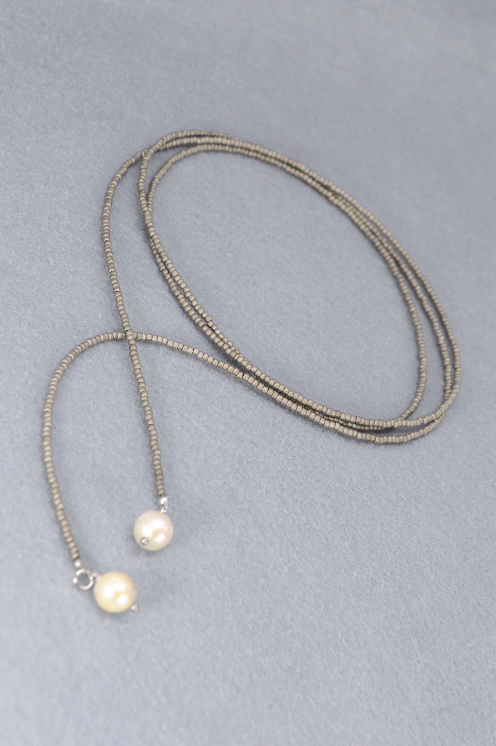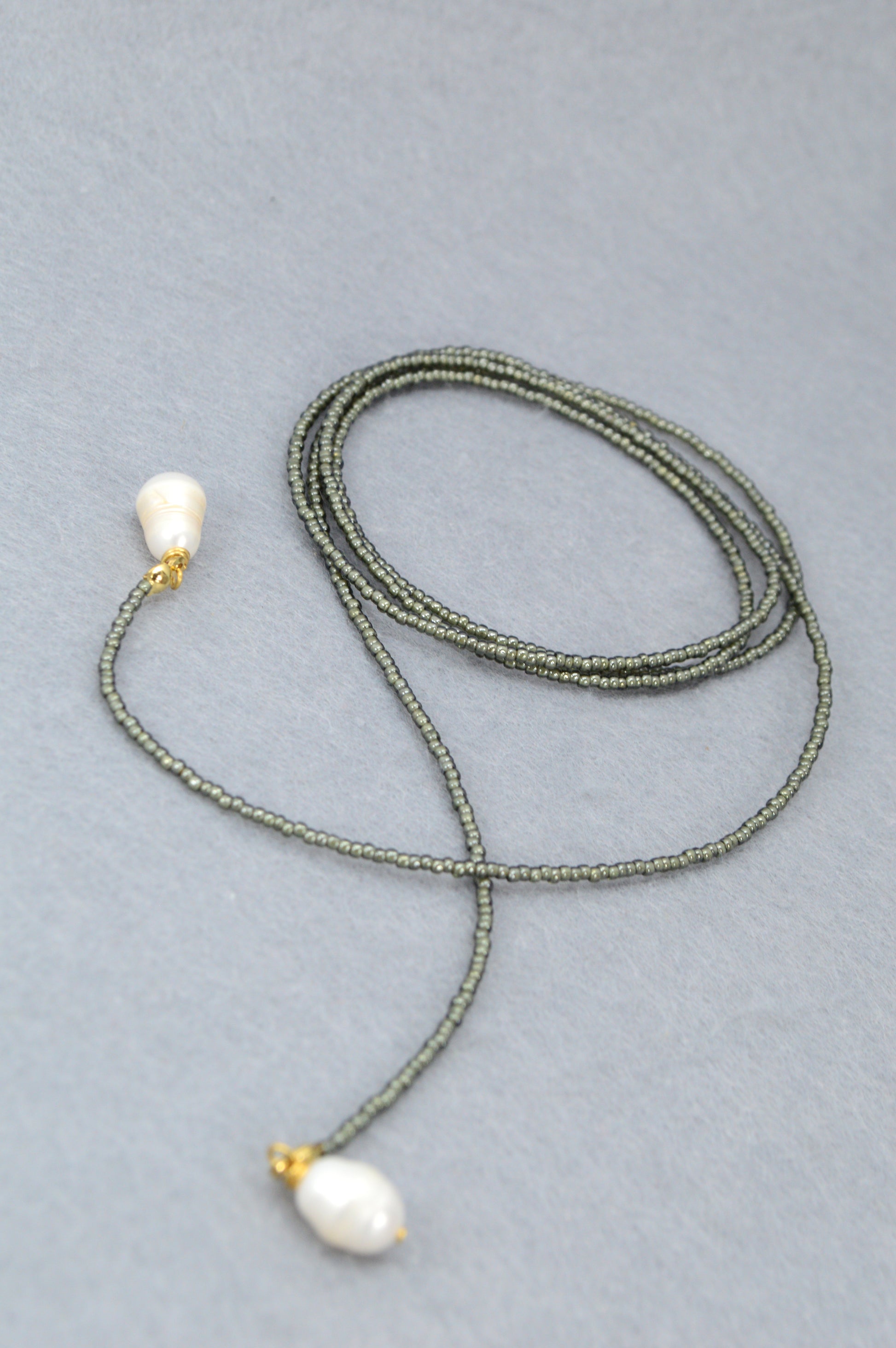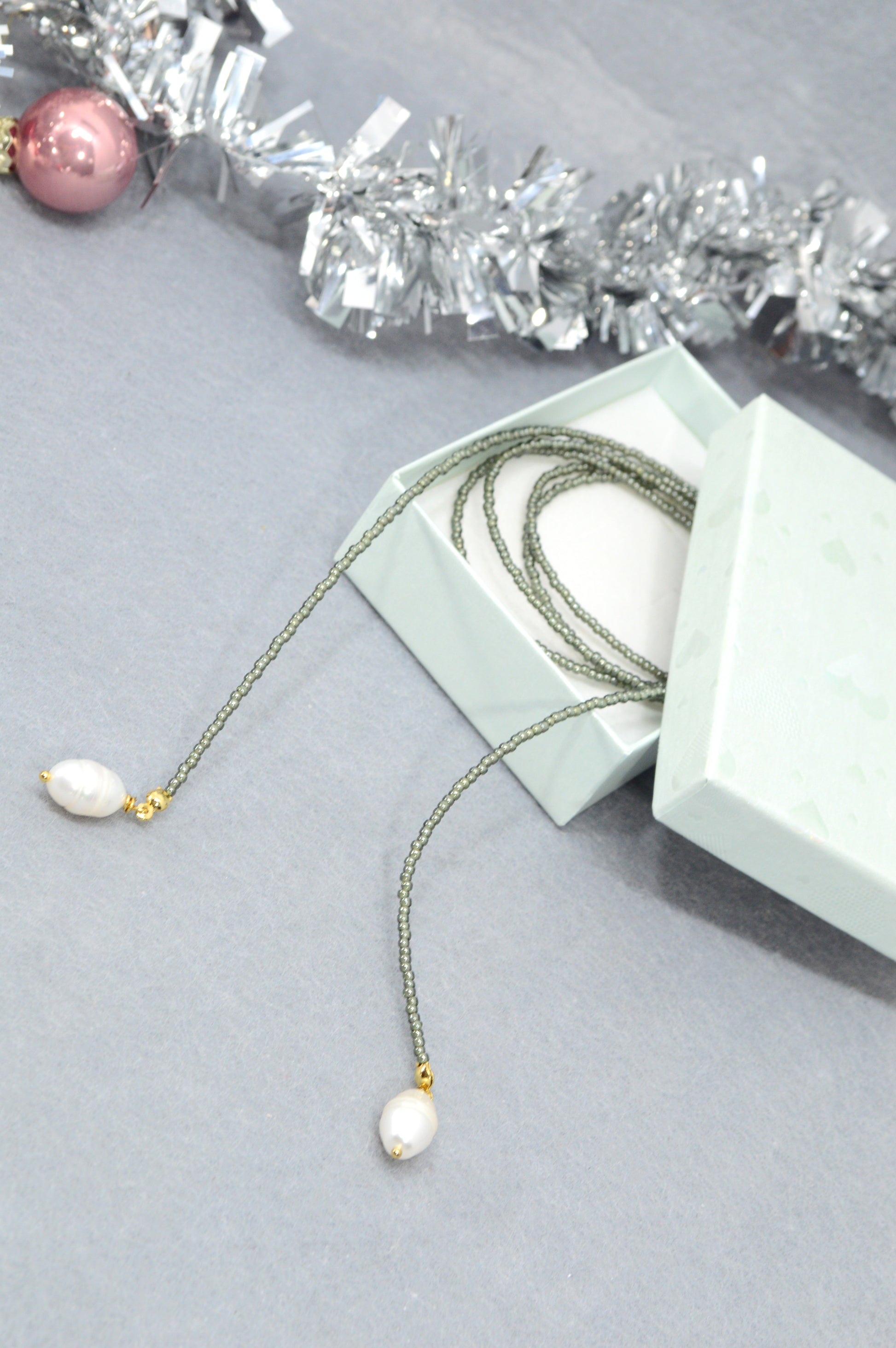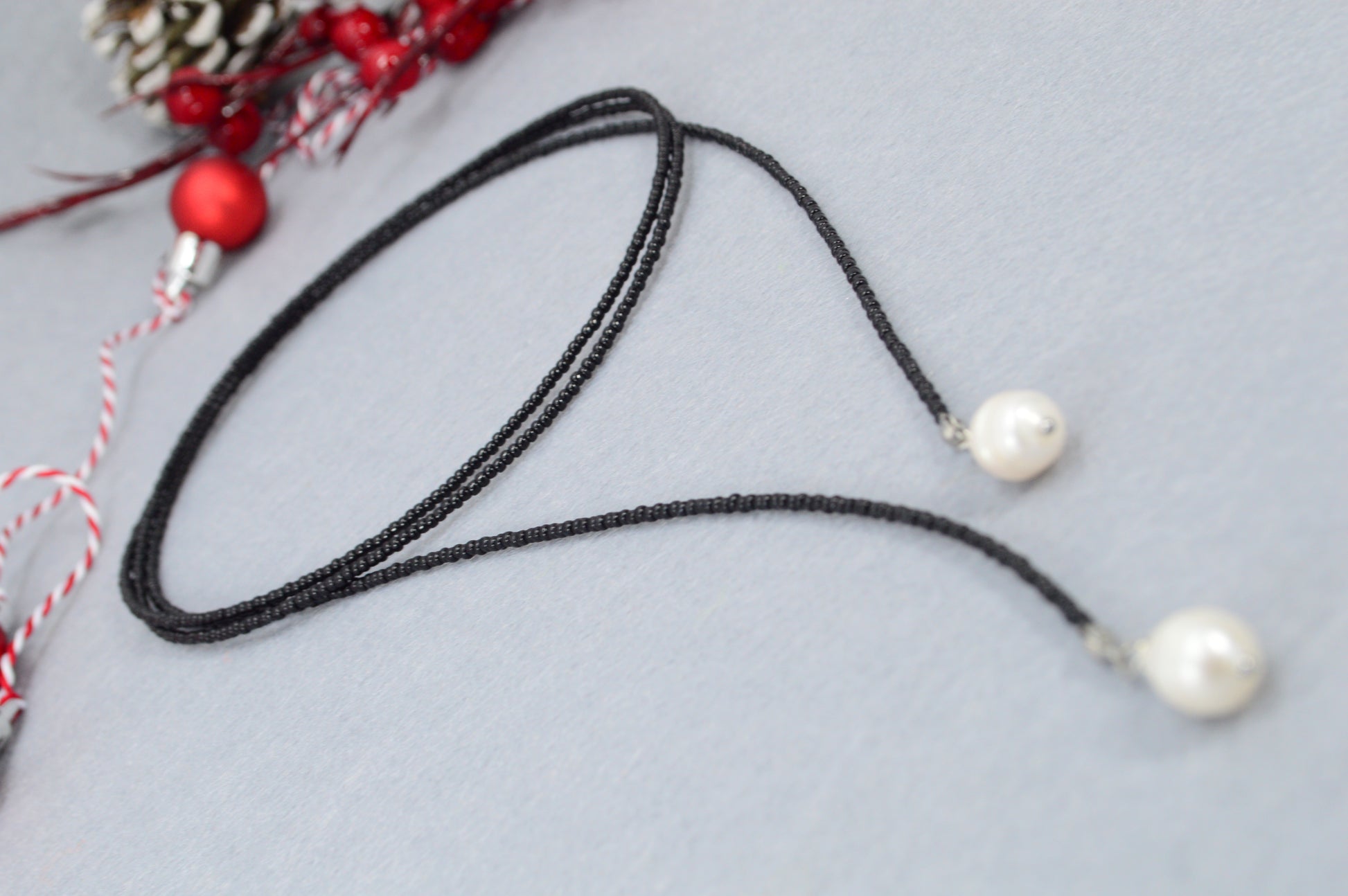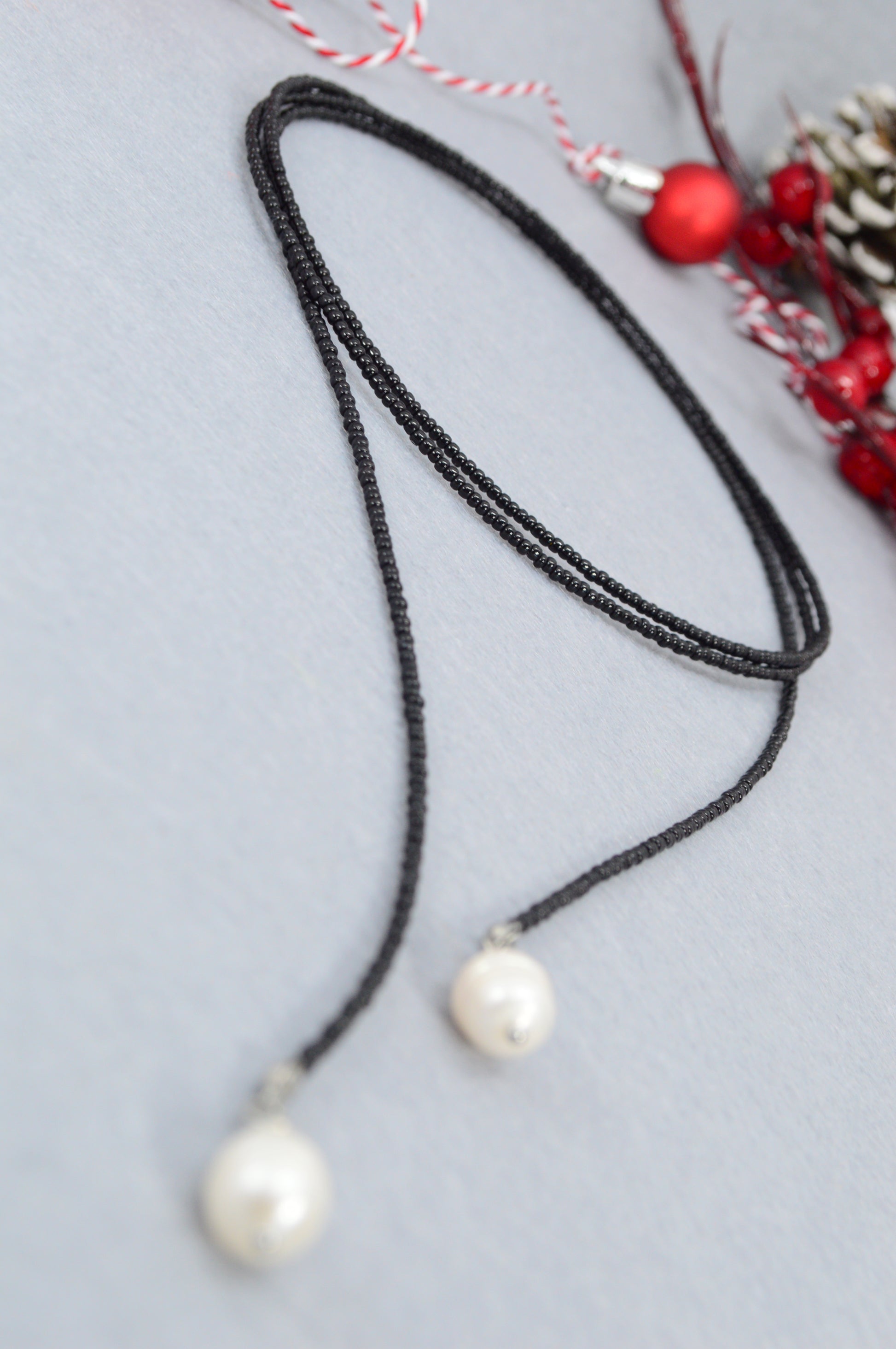 This handmade lariat necklace features beautiful black pearls combined with a sleek long chain, creating a unique boho-inspired Y necklace. Perfect for layering or wearing as a statement piece, it blends elegance and modern fashion.