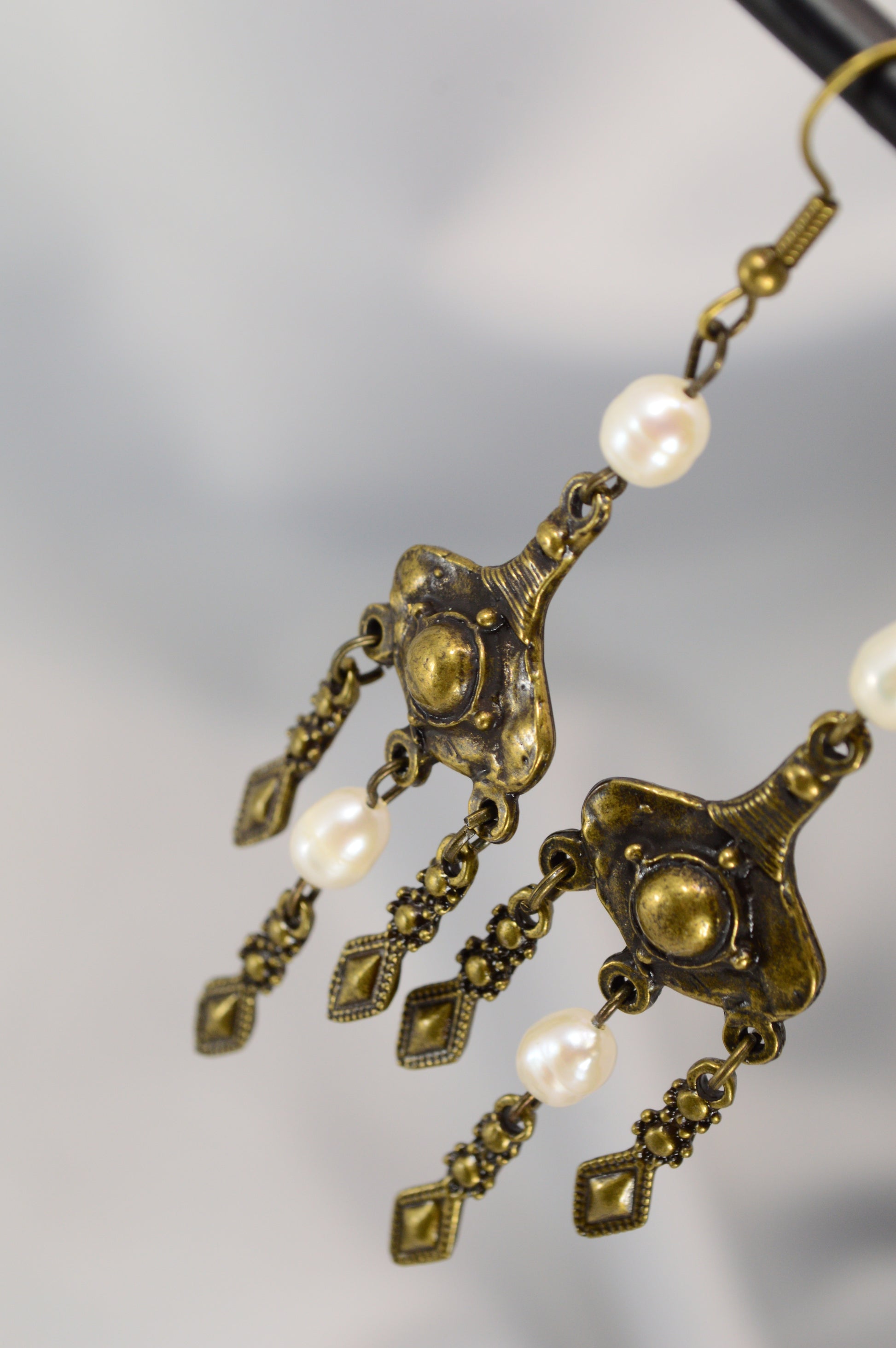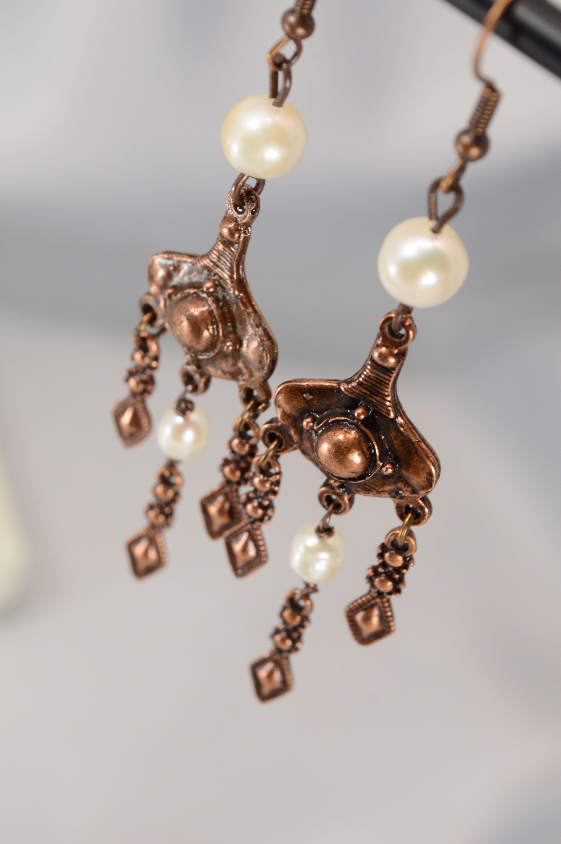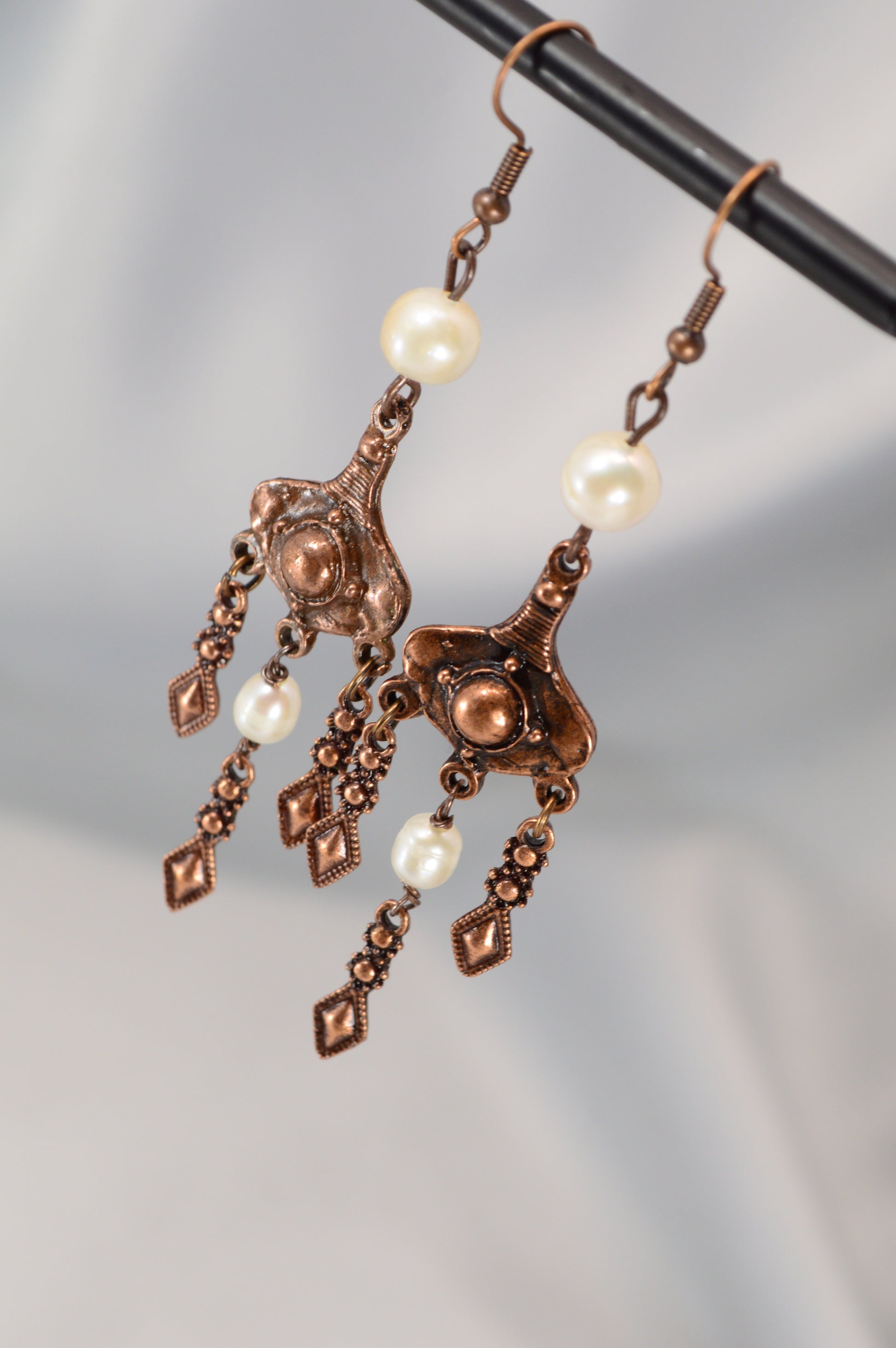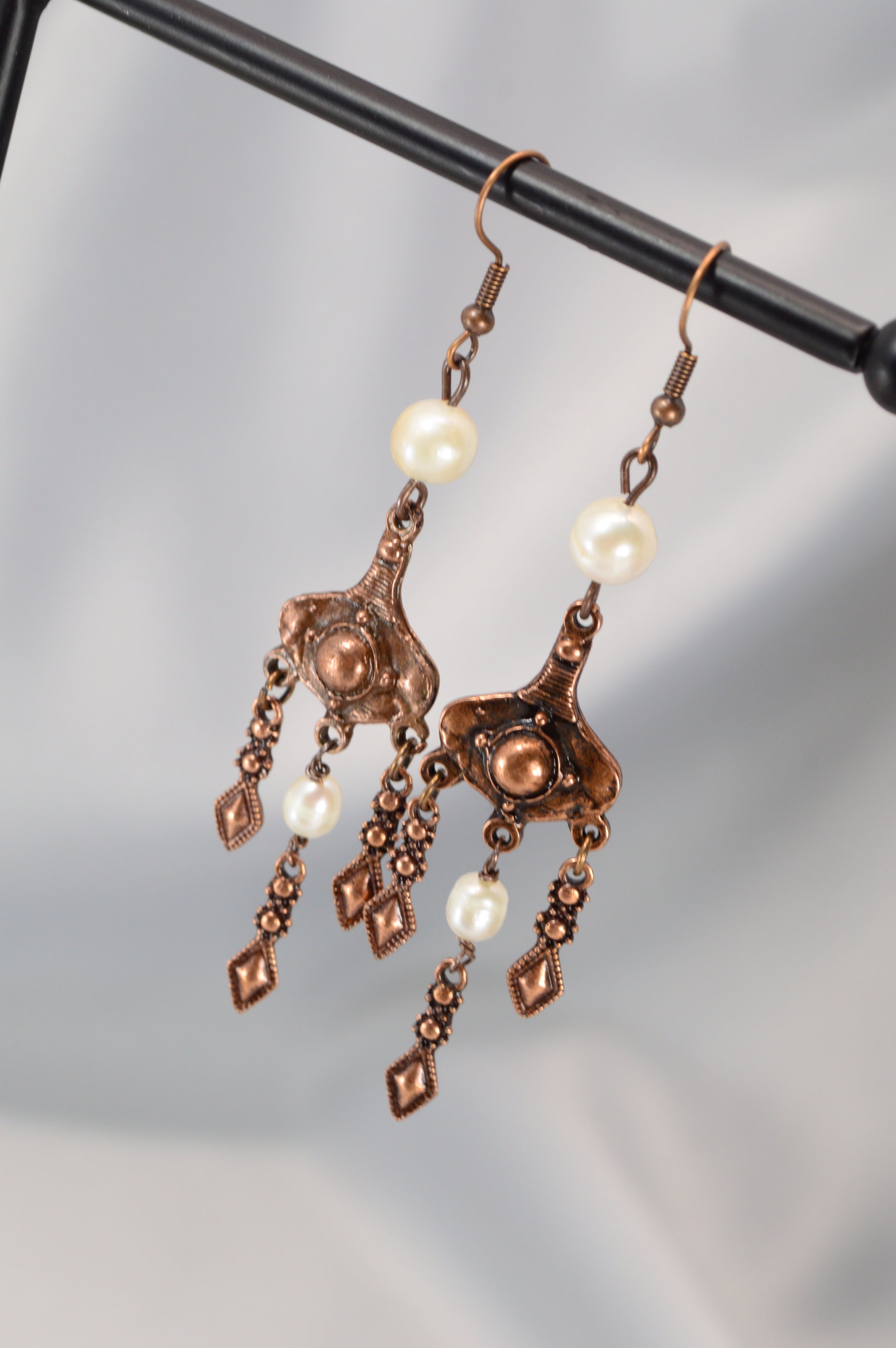 Boho Pearl Dangle Earrings in Bronze & Copper – 8 cm / 3.1