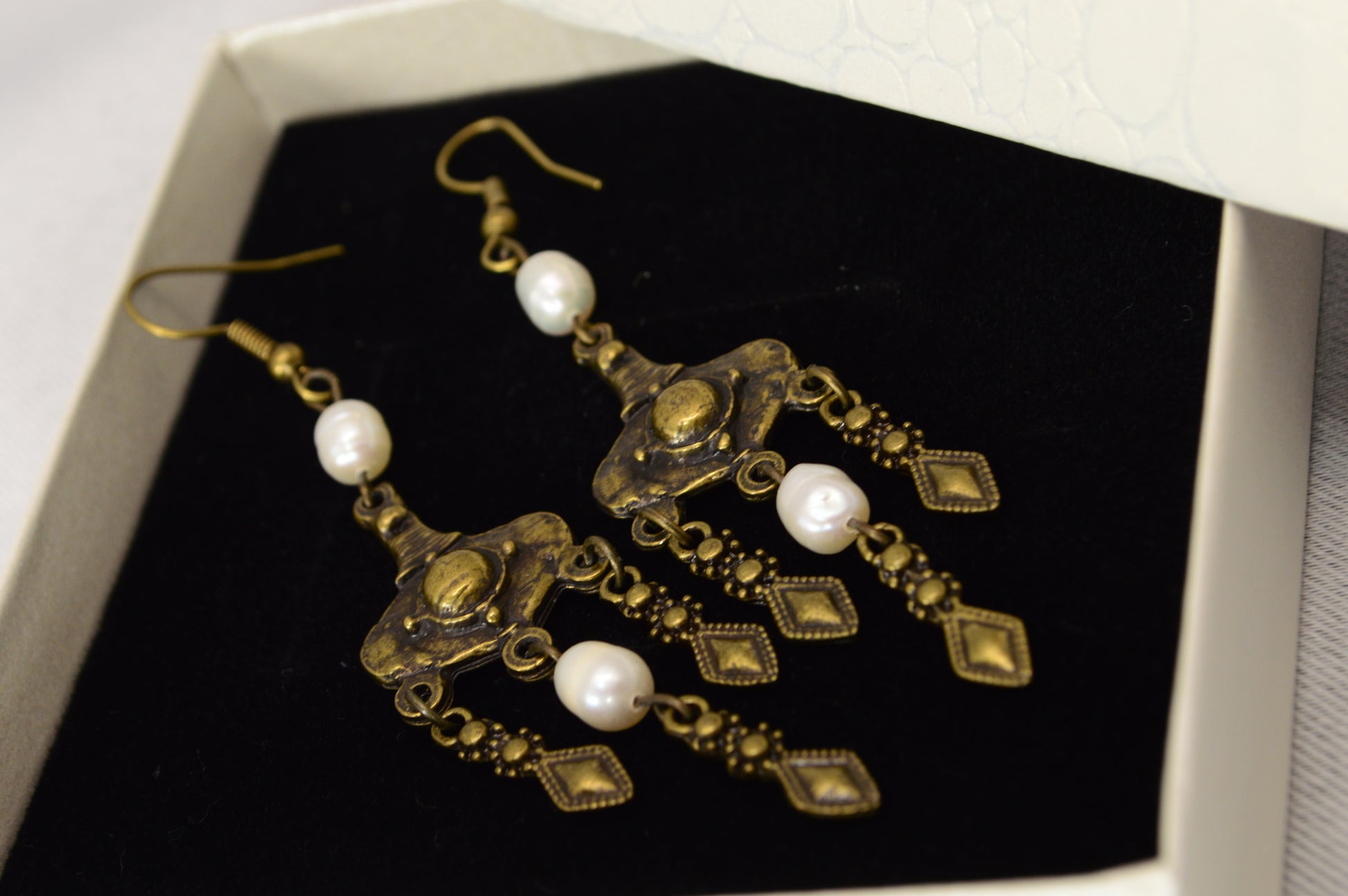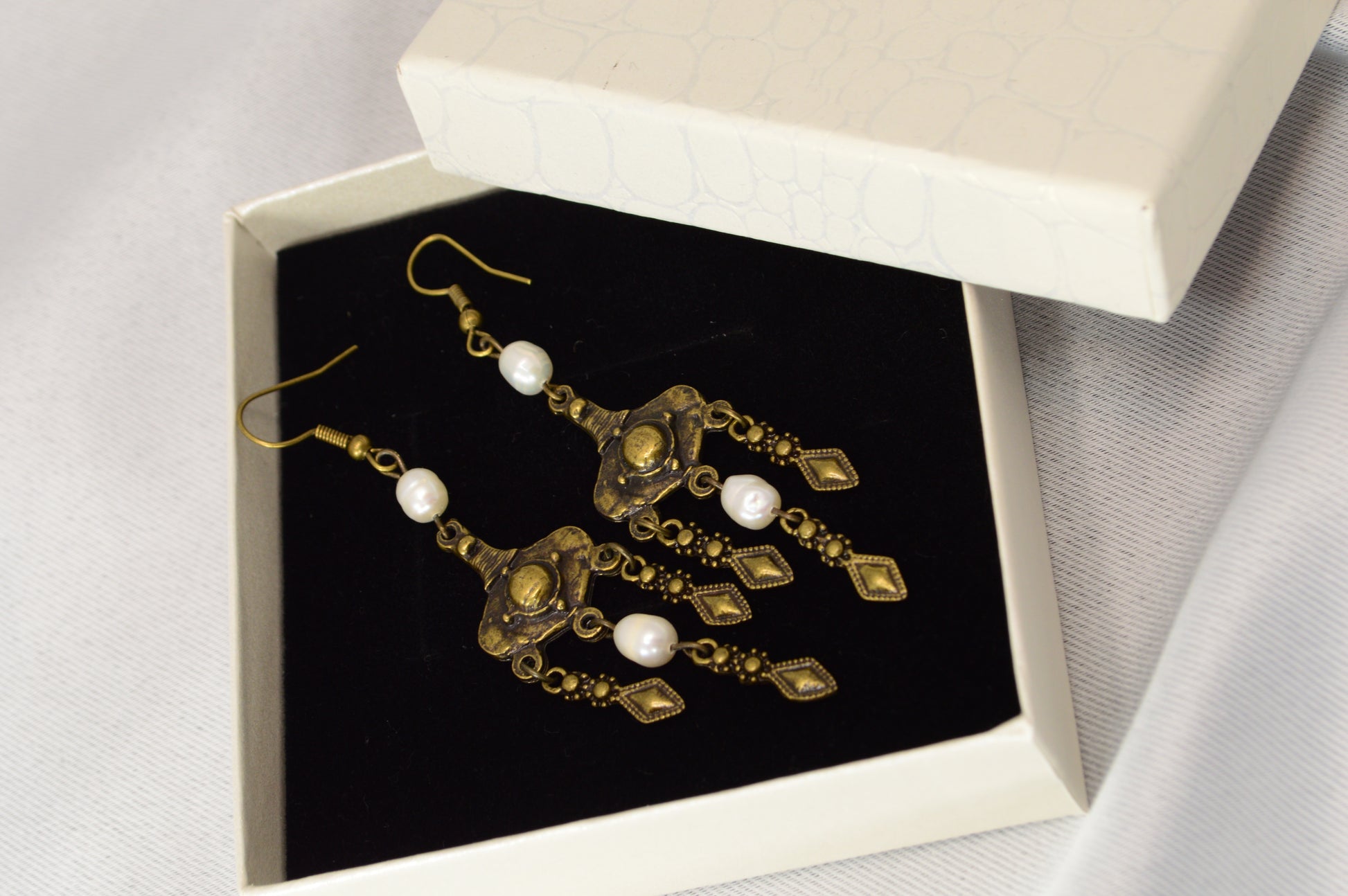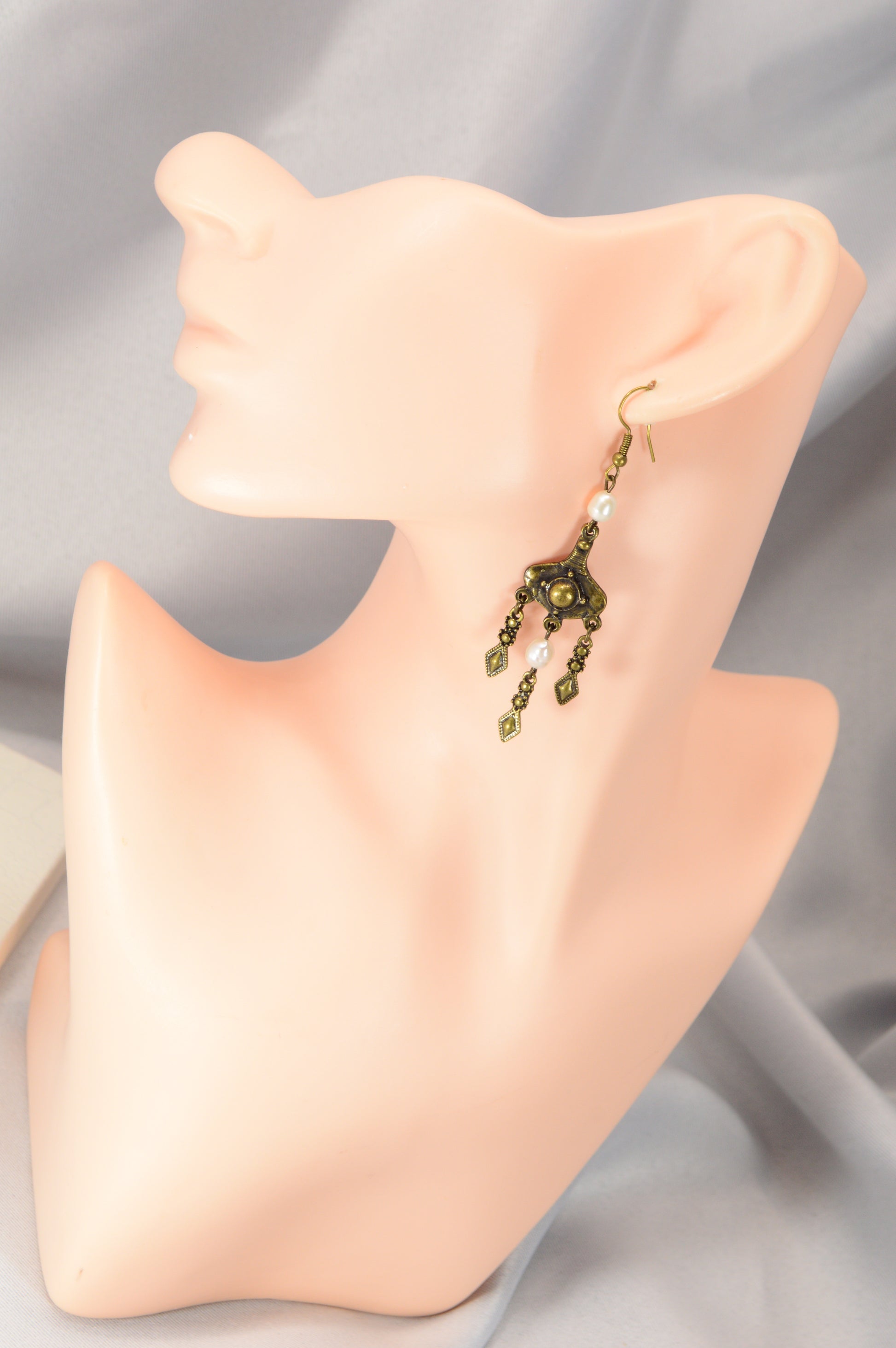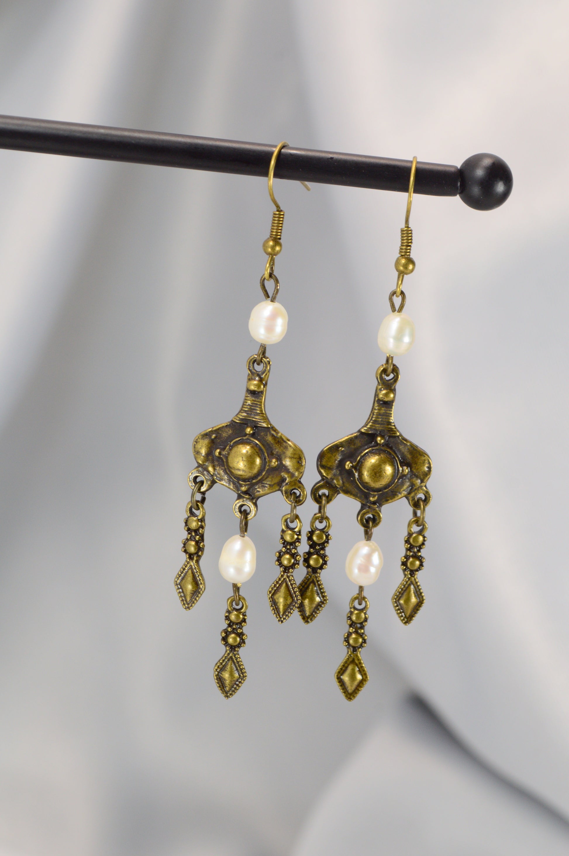 These boho pearl dangle earrings feature an ornate vintage-inspired design with delicate detailing and soft movement, available in two warm finishes — antique bronze and rustic copper. Measuring 8 cm (3.1"), they create an elegant elongated silhouette with natural pearl accents that add a soft glow and elevate the ethnic, gypsy, tribal aesthetic. Perfect for bohemian outfits, festival looks, romantic dresses or earthy everyday styles. A beautiful gift for anyone who loves expressive, handcrafted-feel jewelry with a retro charm. Bronze adds a deep, old-world warmth, while the copper finish brings a rich artisan mood that pairs effortlessly with natural tones and textured fabrics.
