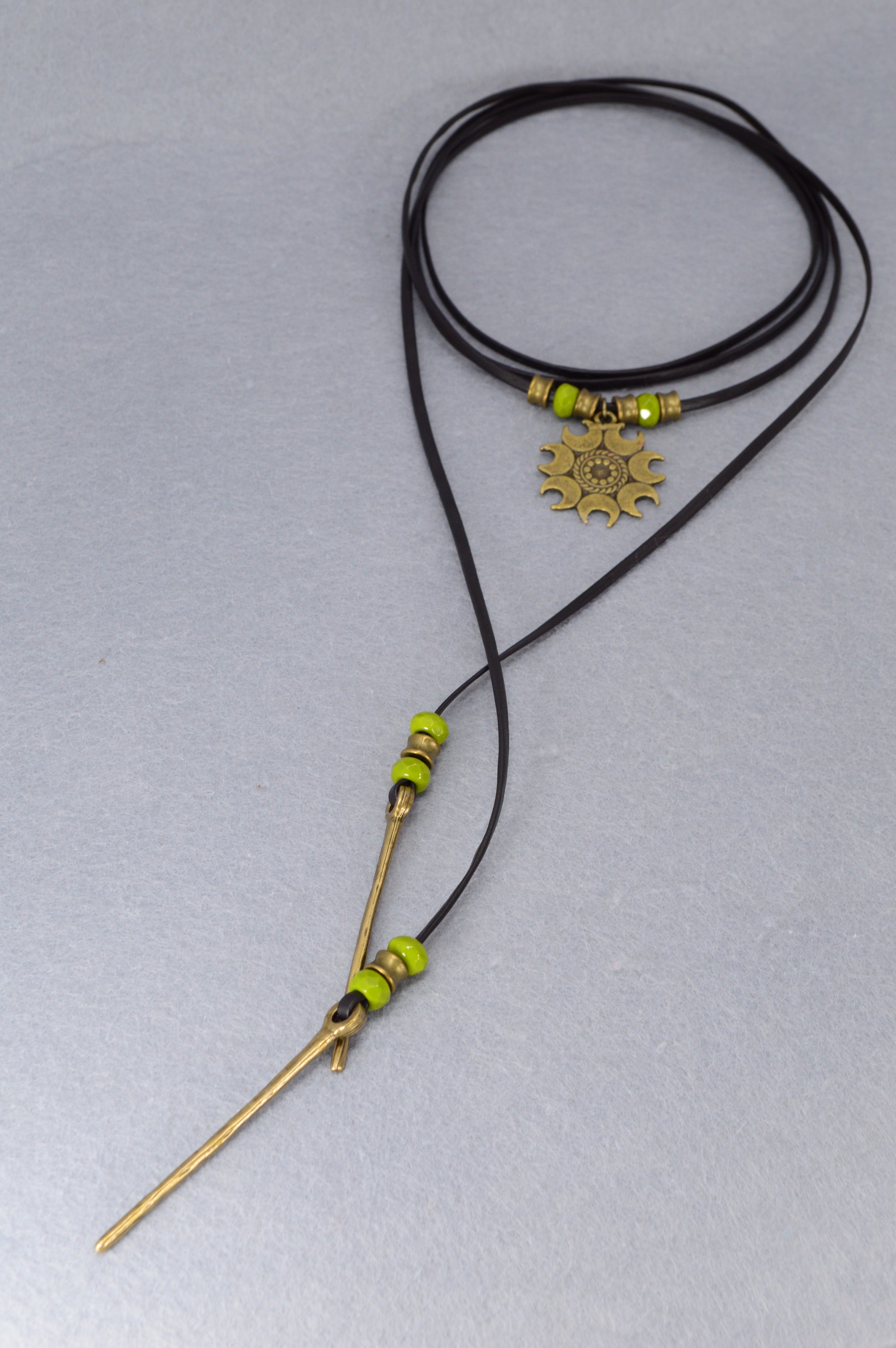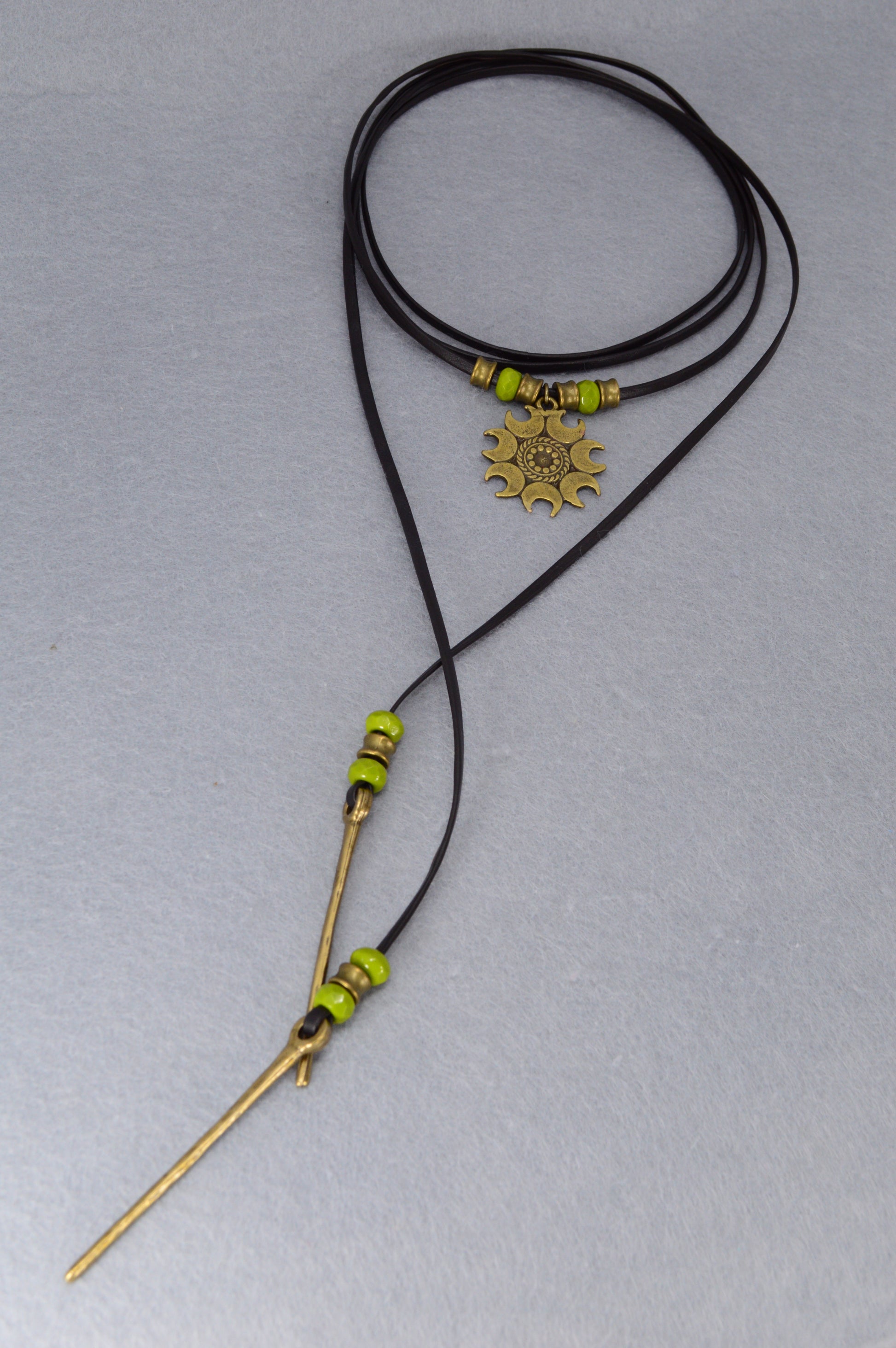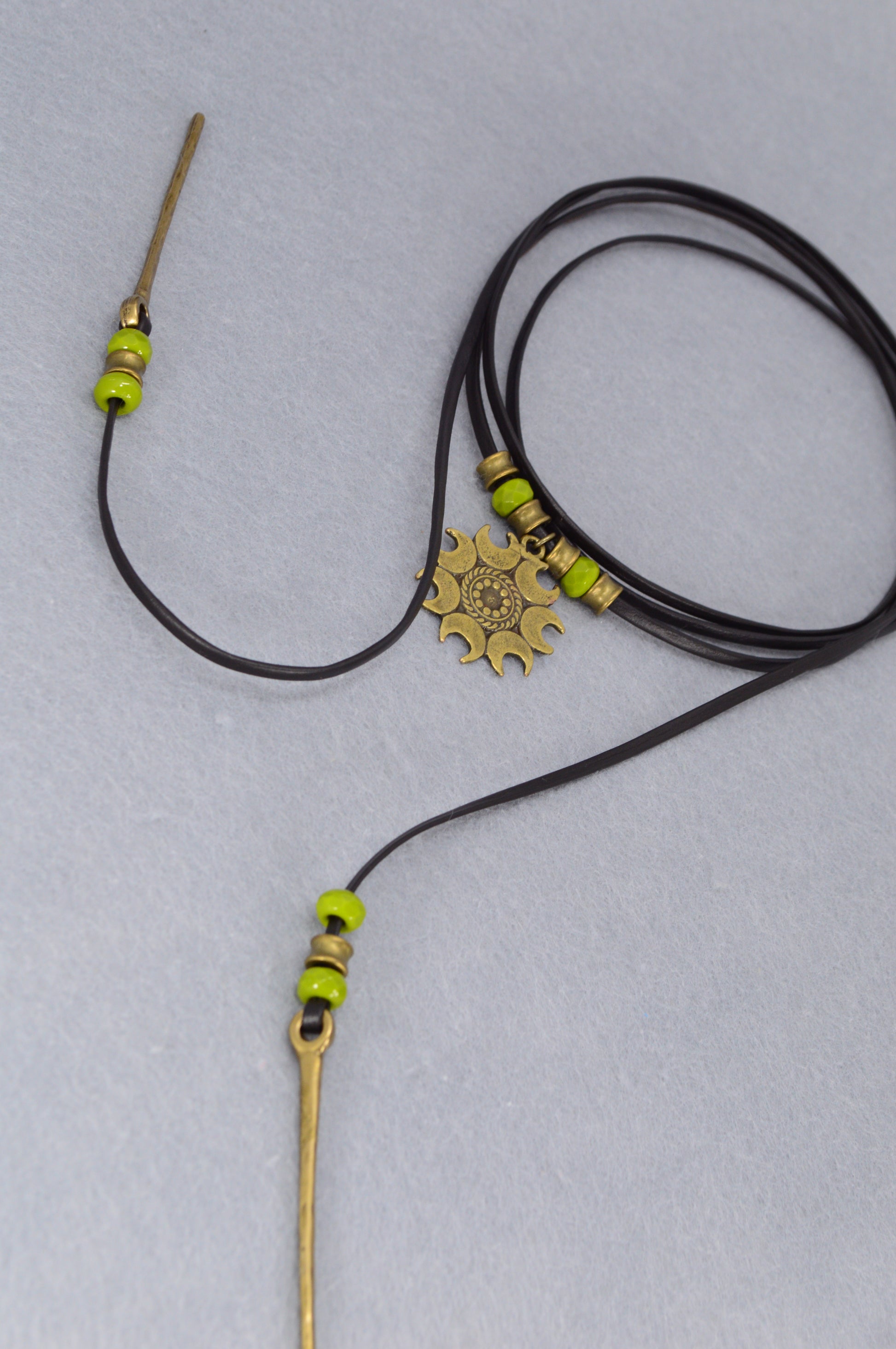 Handcrafted with a bold antique bronze sun pendant, earthy green beads, and rustic golden spikes, this piece carries the energy of freedom, warmth, and adventure. The soft black leather cord wraps effortlessly around your neck, giving you endless styling options – wear it as a long boho lariat, a festival choker, or a layered gypsy necklace.