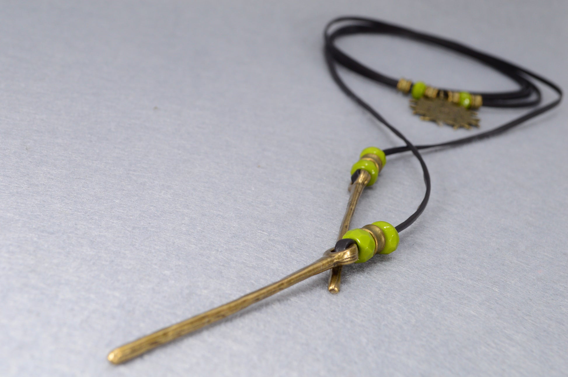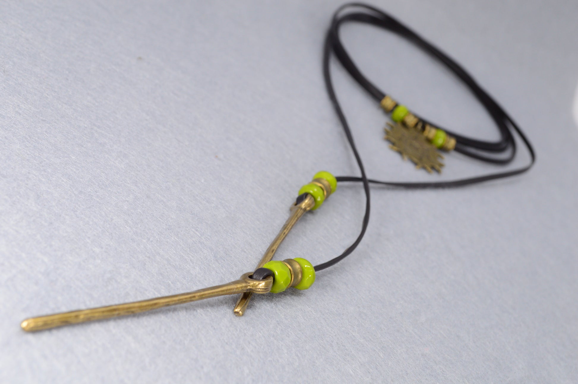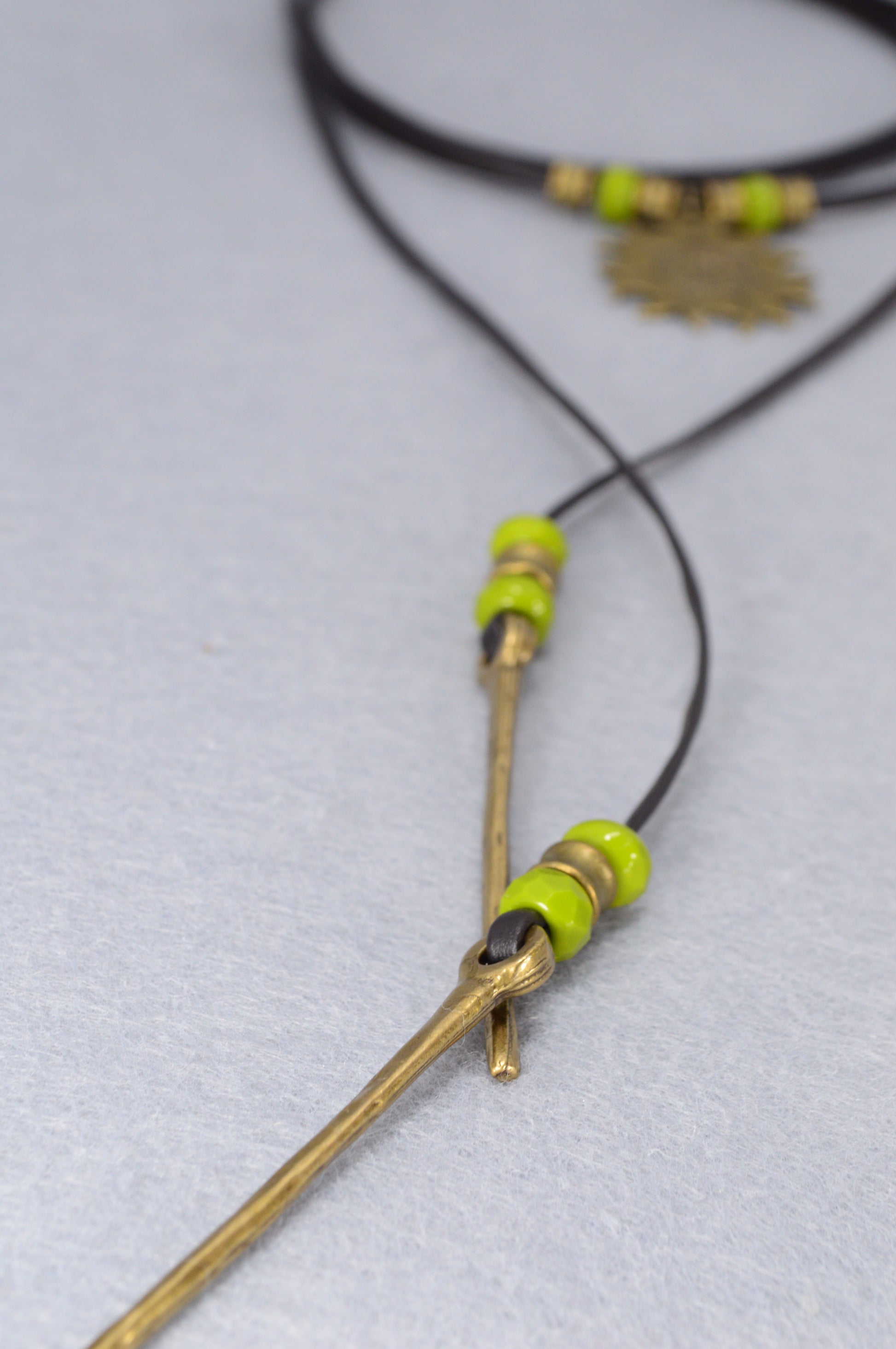 Handcrafted with a bold antique bronze sun pendant, earthy green beads, and rustic golden spikes, this piece carries the energy of freedom, warmth, and adventure. The soft black leather cord wraps effortlessly around your neck, giving you endless styling options – wear it as a long boho lariat, a festival choker, or a layered gypsy necklace.
