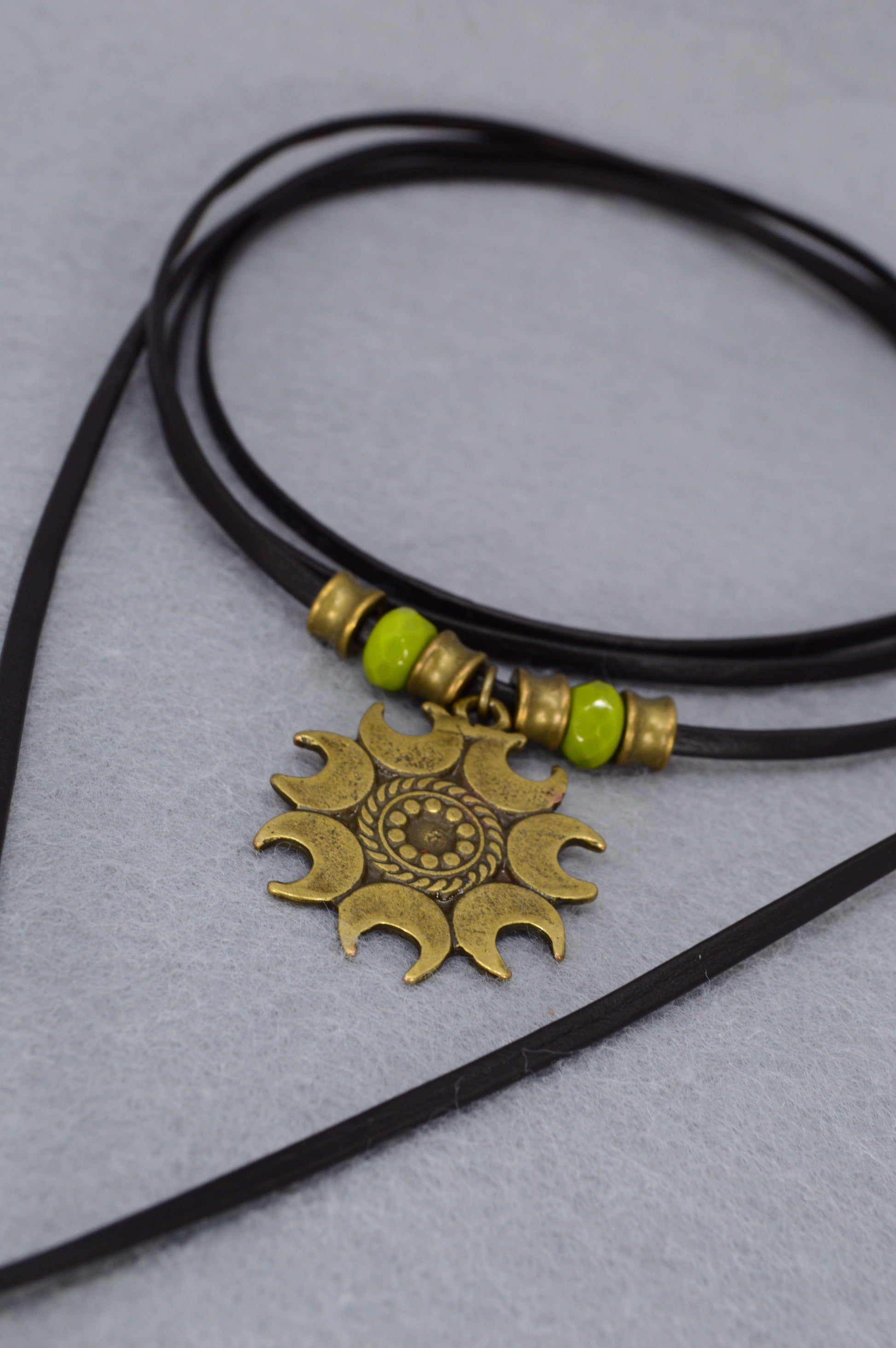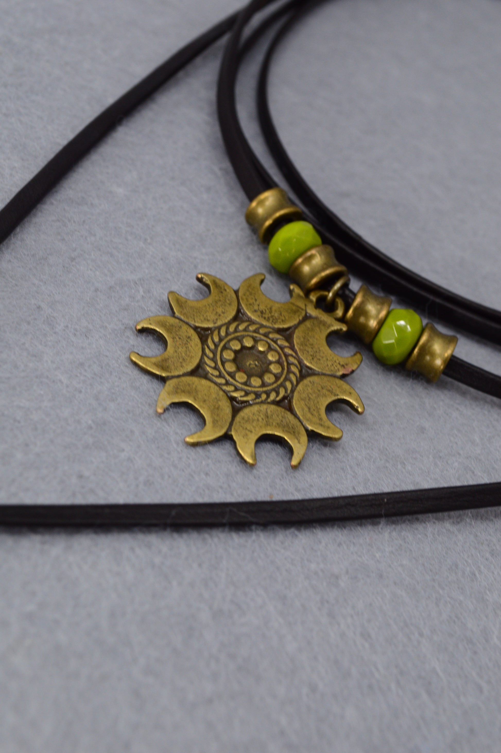 Boho Sun Pendant Leather Wrap Necklace – Festival Jewelry with Green Beads, Hippie Gypsy Style