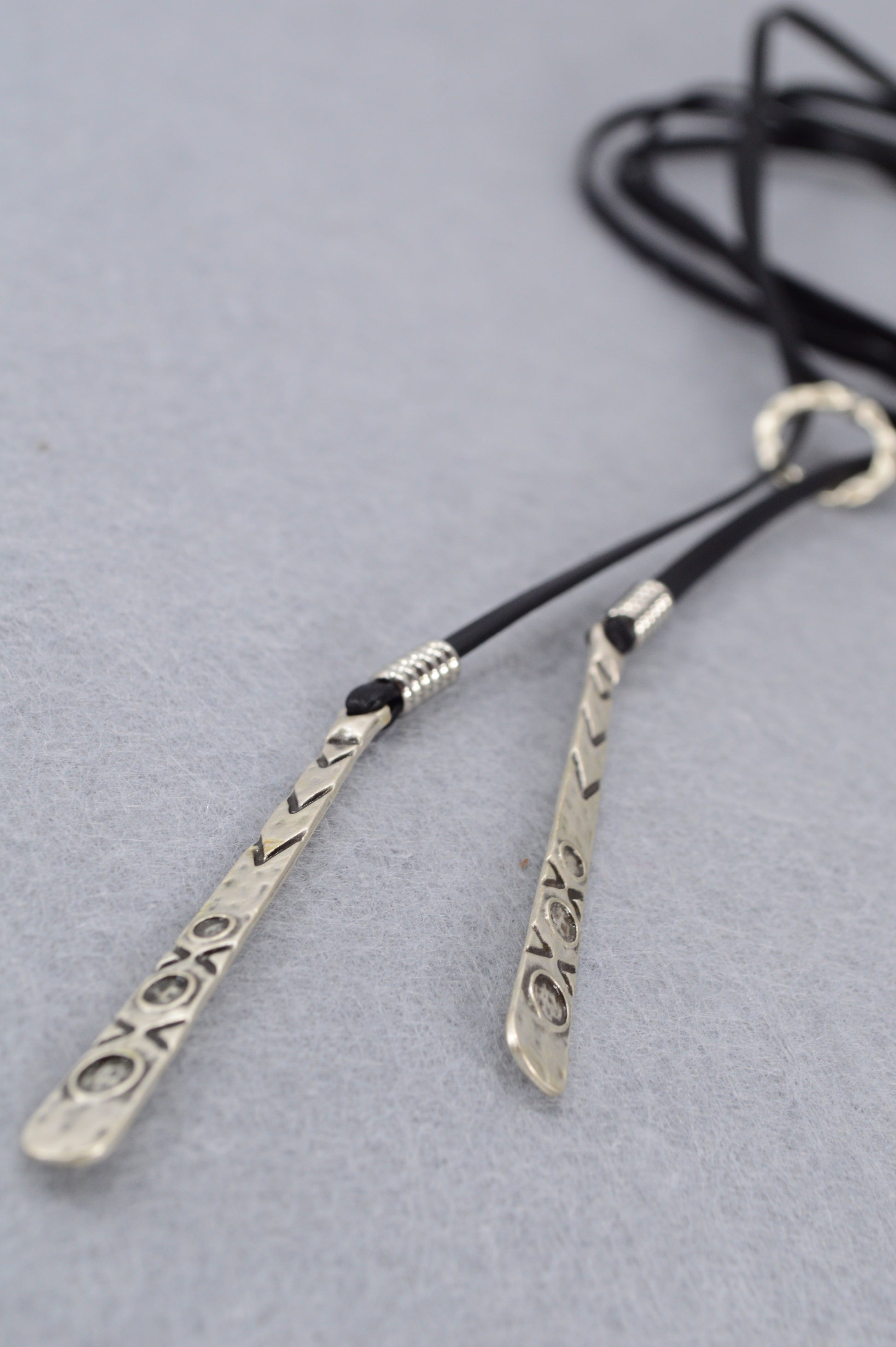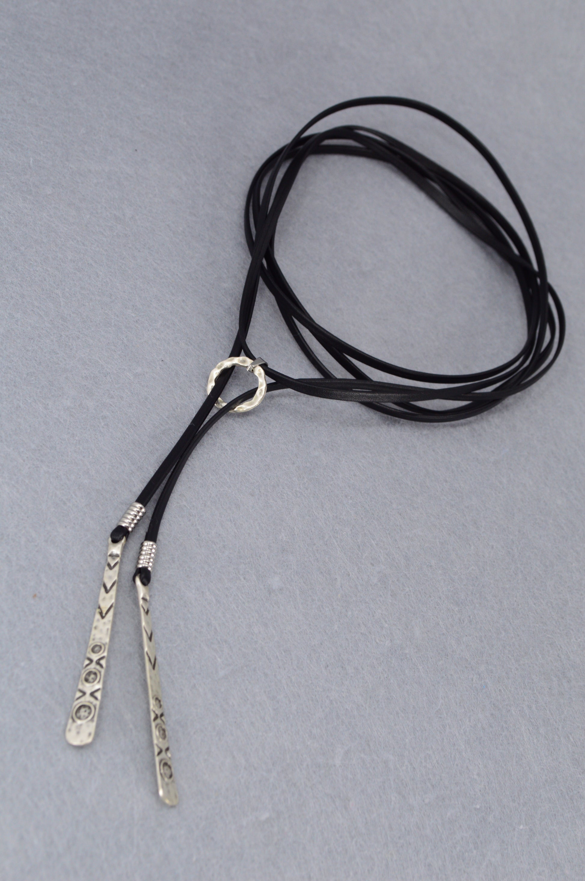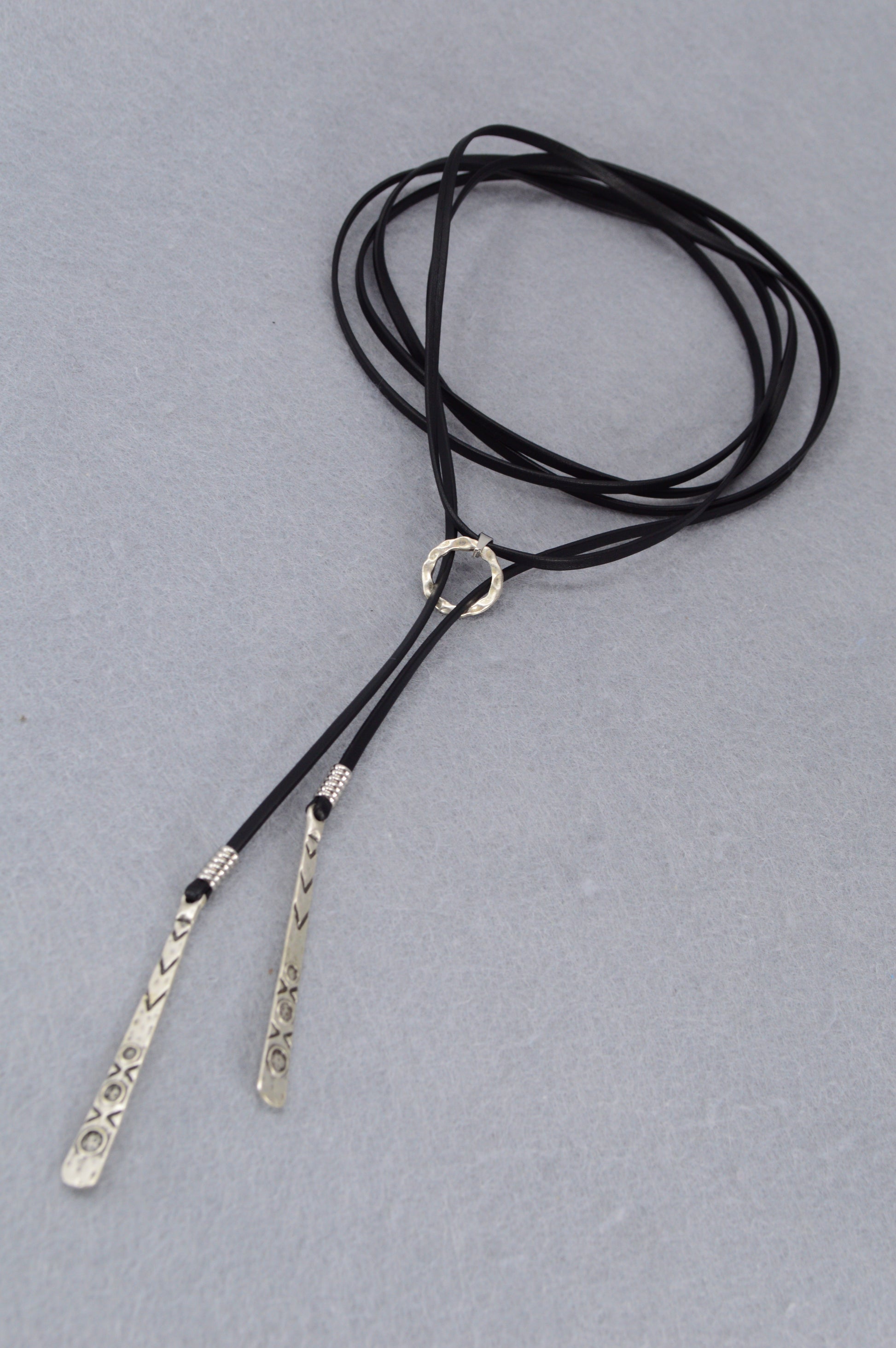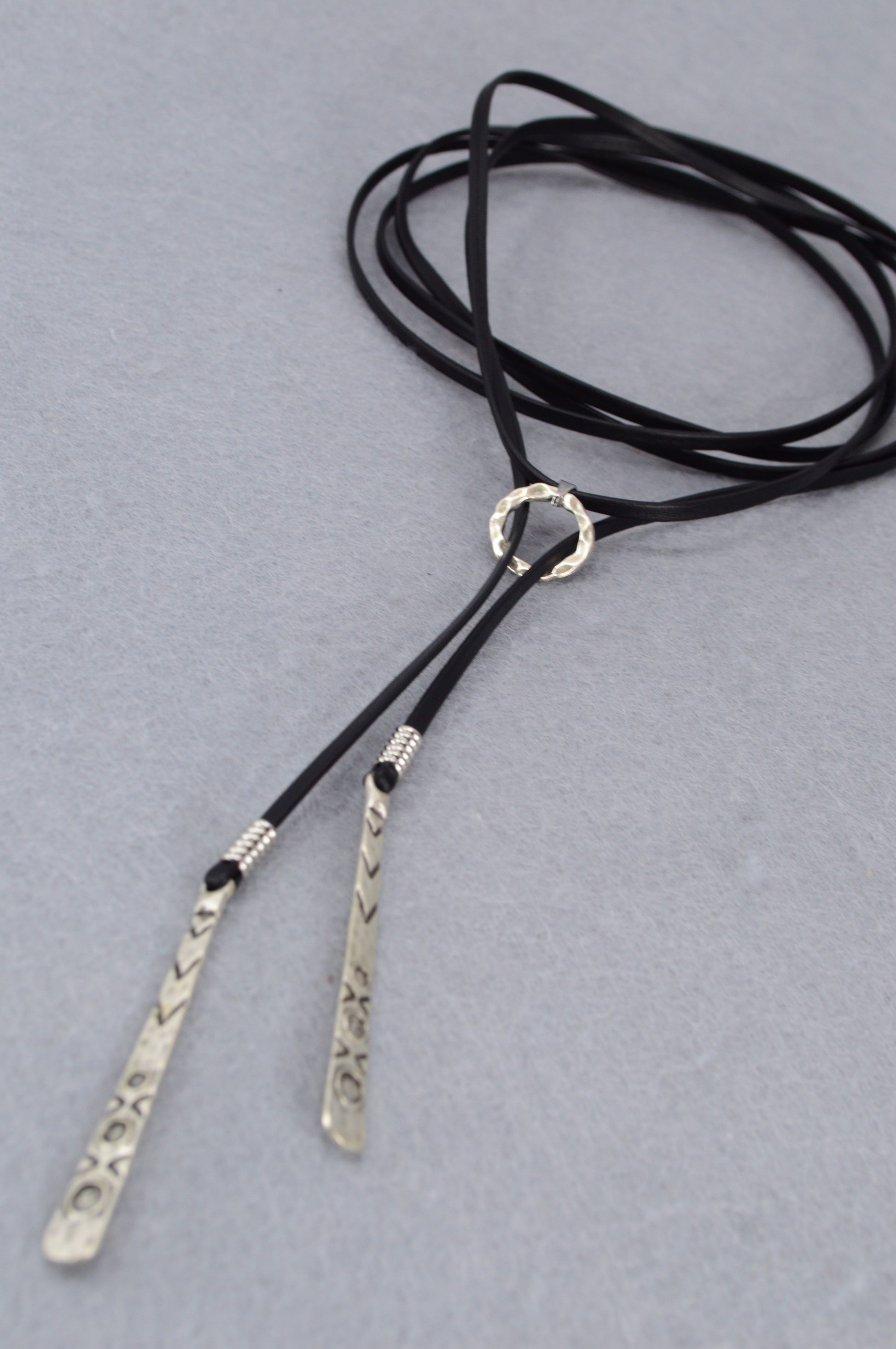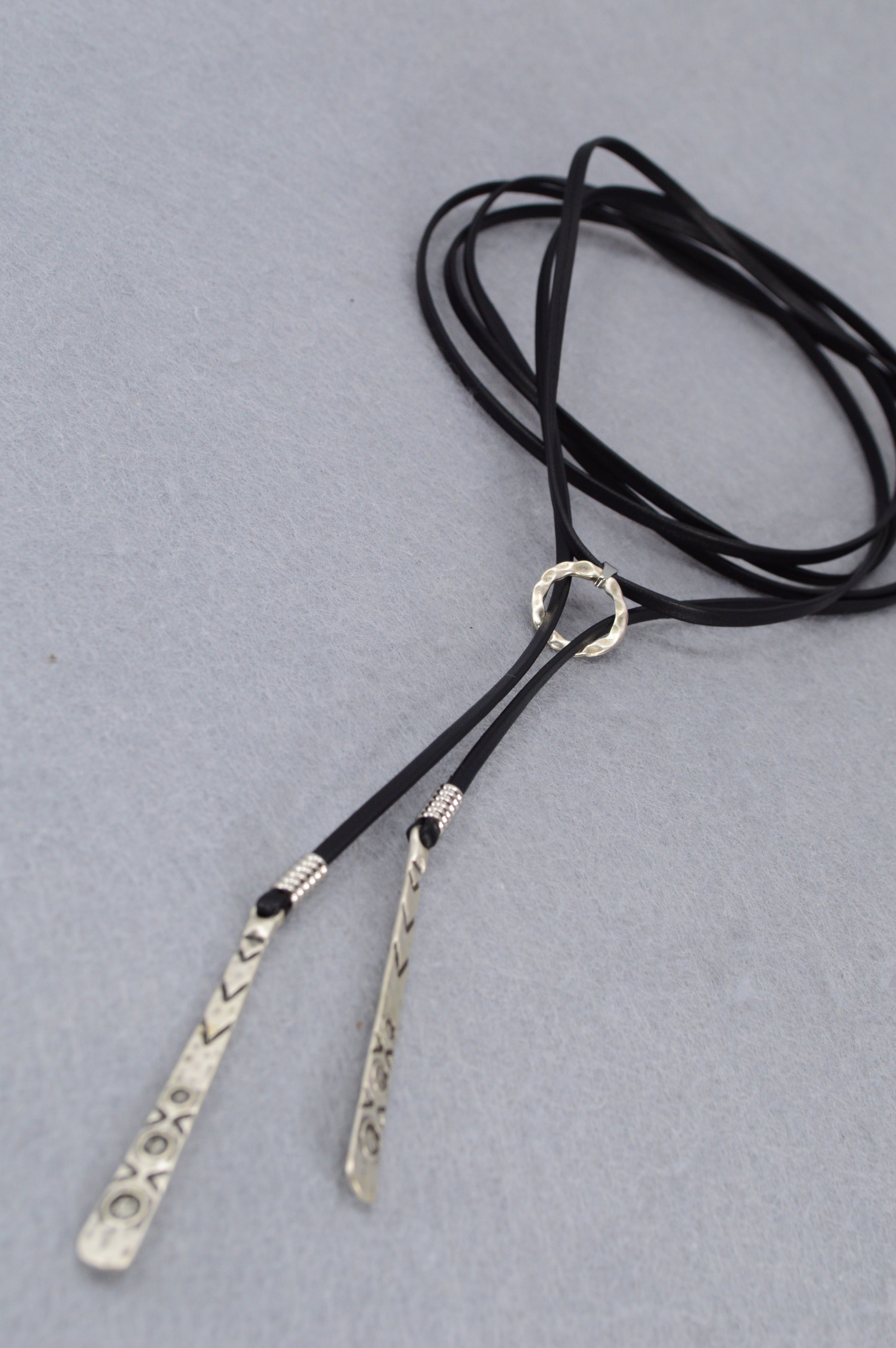 Add a bold and stylish accent to your outfit with this boho leather choker featuring two engraved tribal silver-tone pendants. The minimalist black leather cord is paired with a hammered silver circle centerpiece, giving the necklace a trendy layered look.