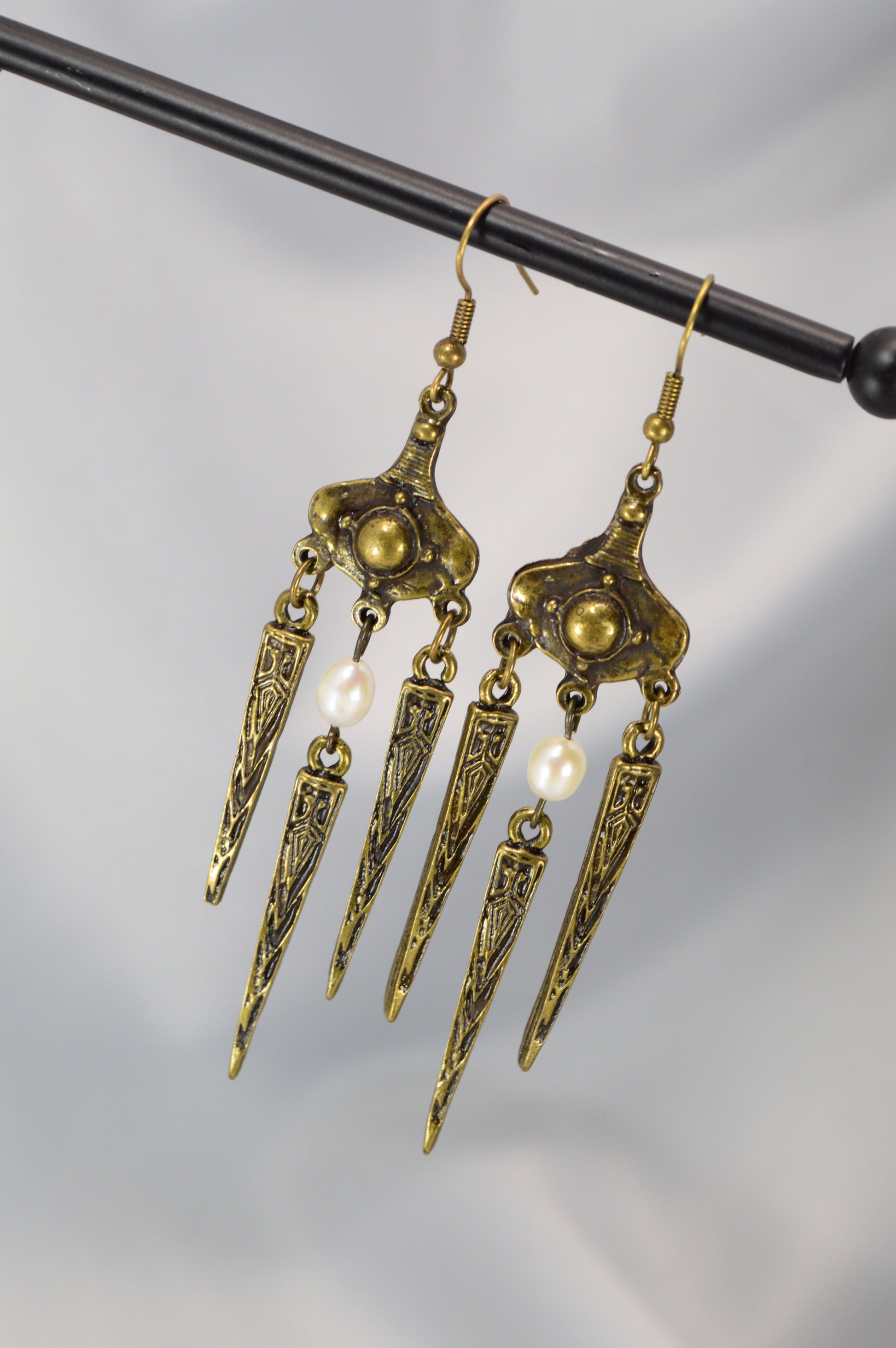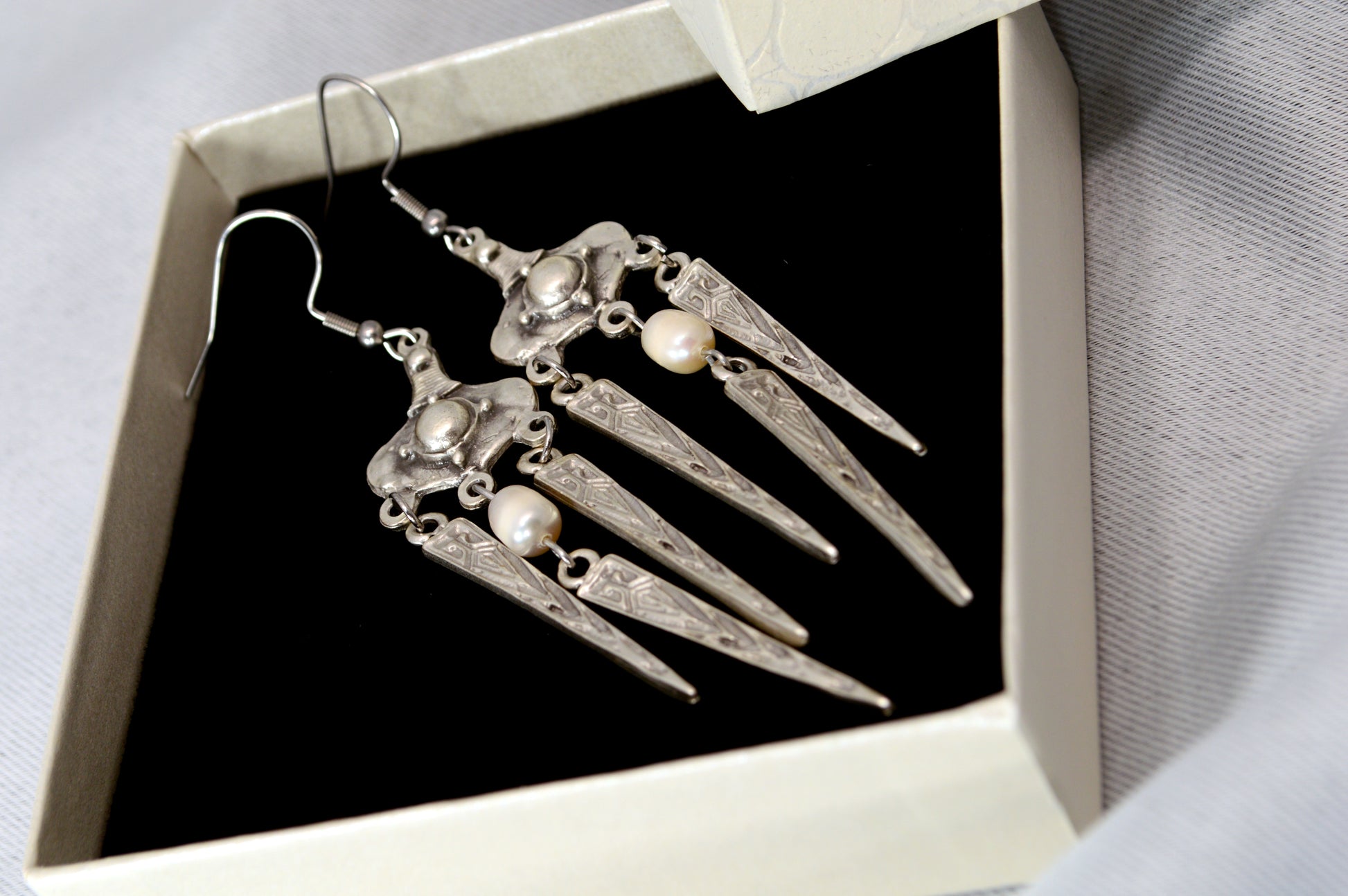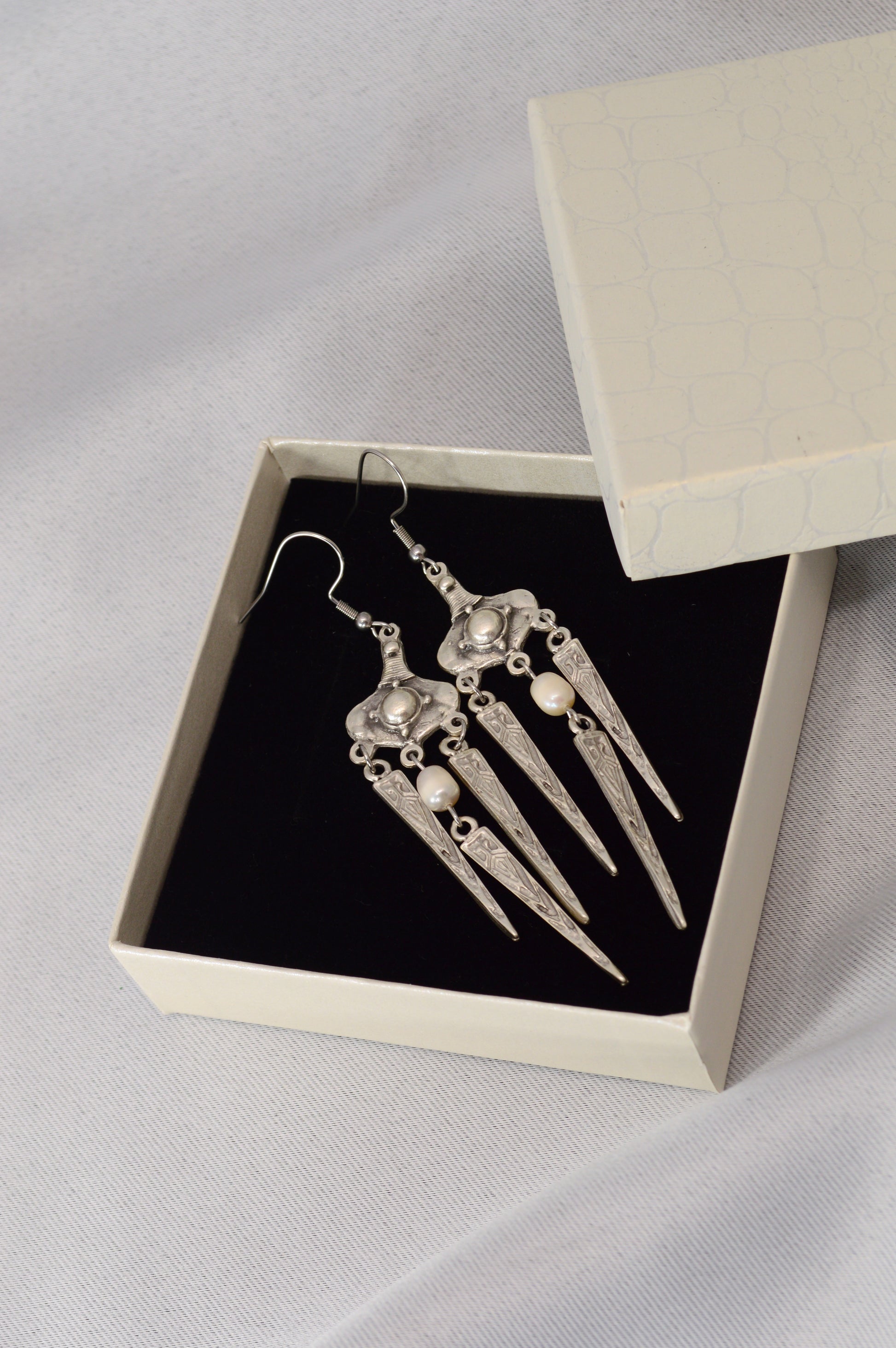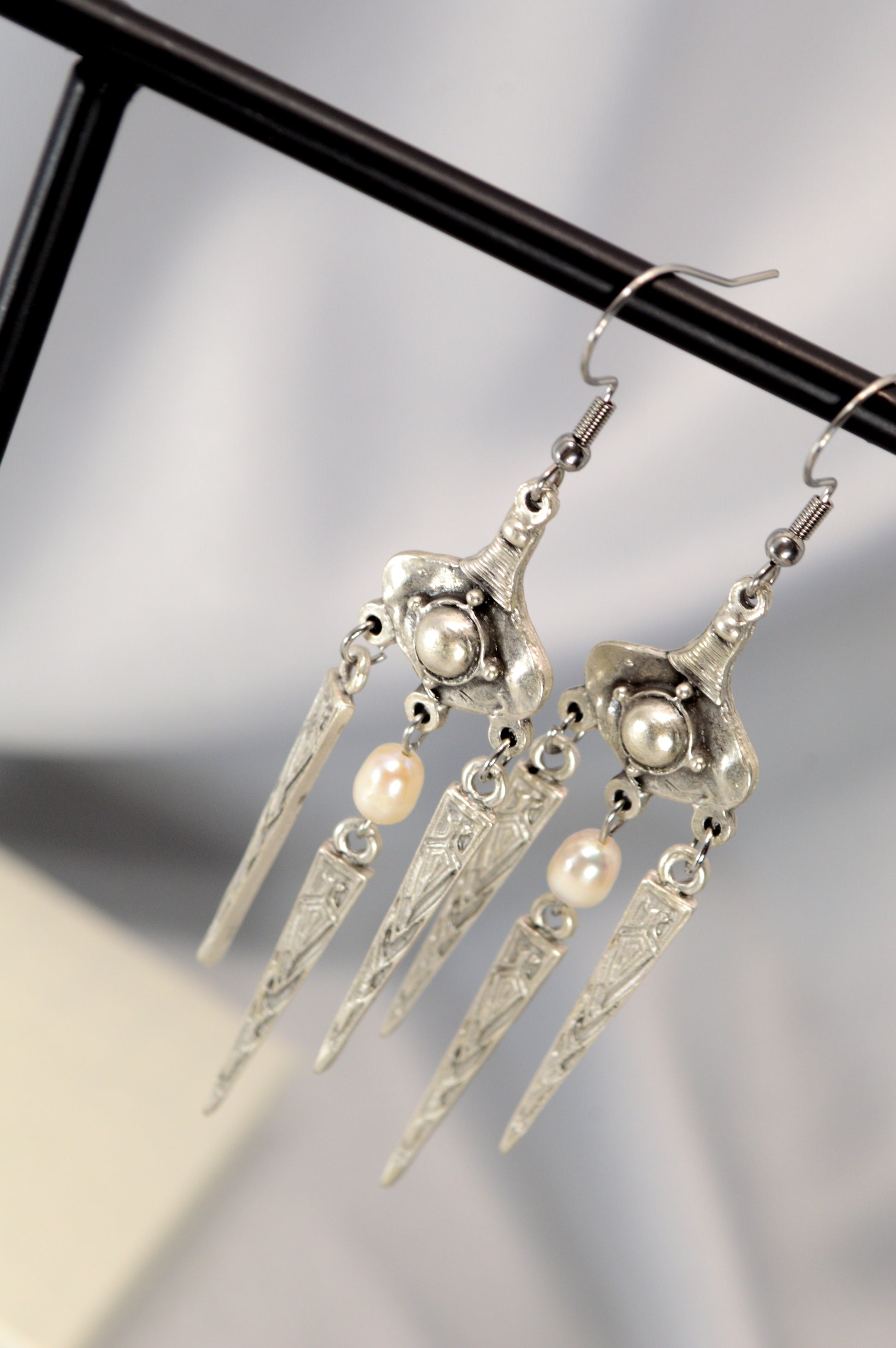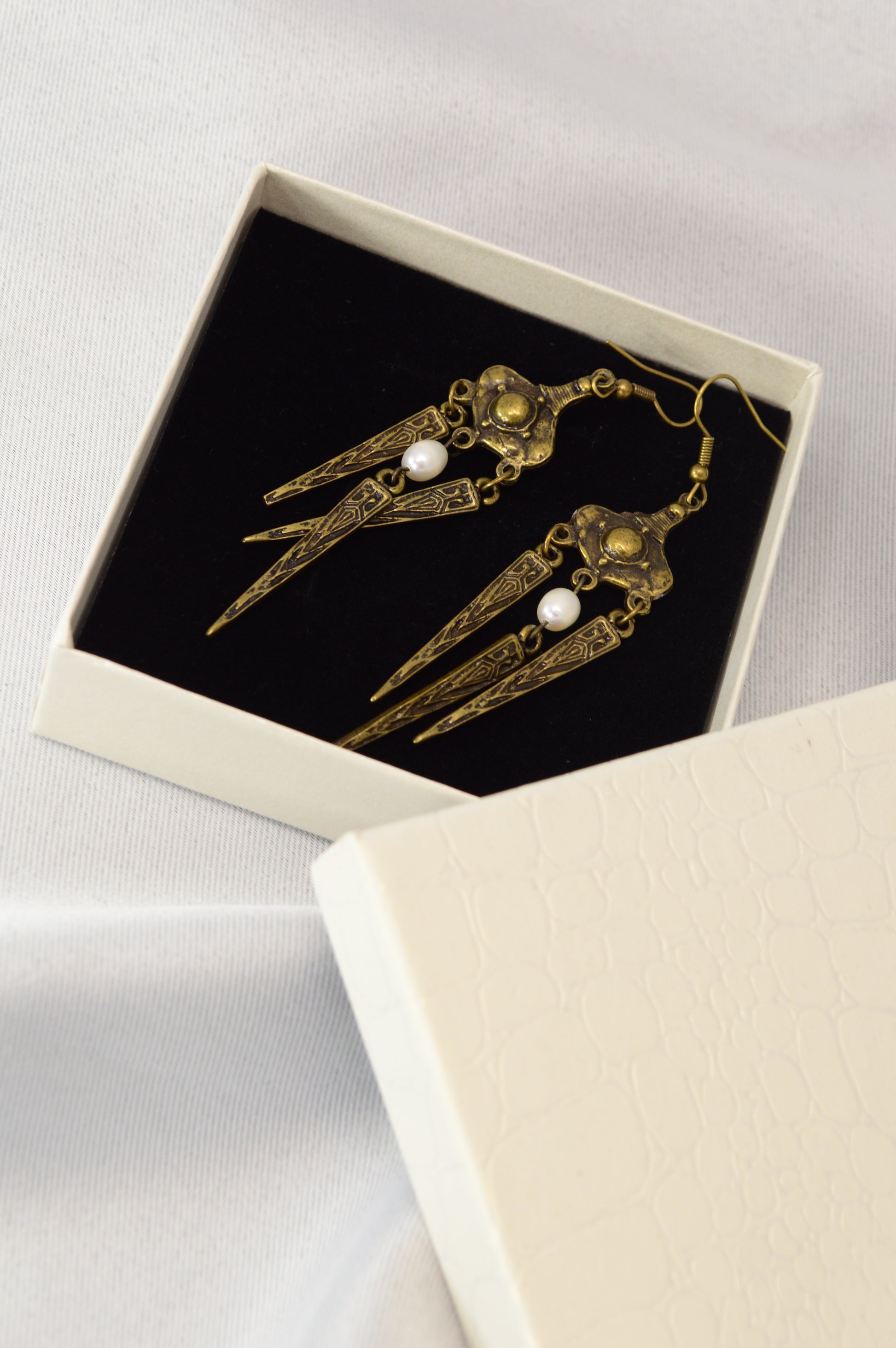 These boho tribal-inspired dangle earrings combine a sculpted vintage design with natural pearl accents, available in two expressive finishes — bright antique silver and warm aged bronze. The elongated geometric drops create elegant movement and give the earrings a handcrafted ethnic, gypsy and festival character. Perfect as a gift for anyone who loves unique statement jewelry with artistic flair. Ideal for festivals, weekend markets, beach trips or adding a bold accent to an evening outfit. The silver version brings a cool shimmering tone, while the bronze finish offers a deeper, earthy vintage mood — both pairing effortlessly with flowy dresses, knitwear and minimalist looks.