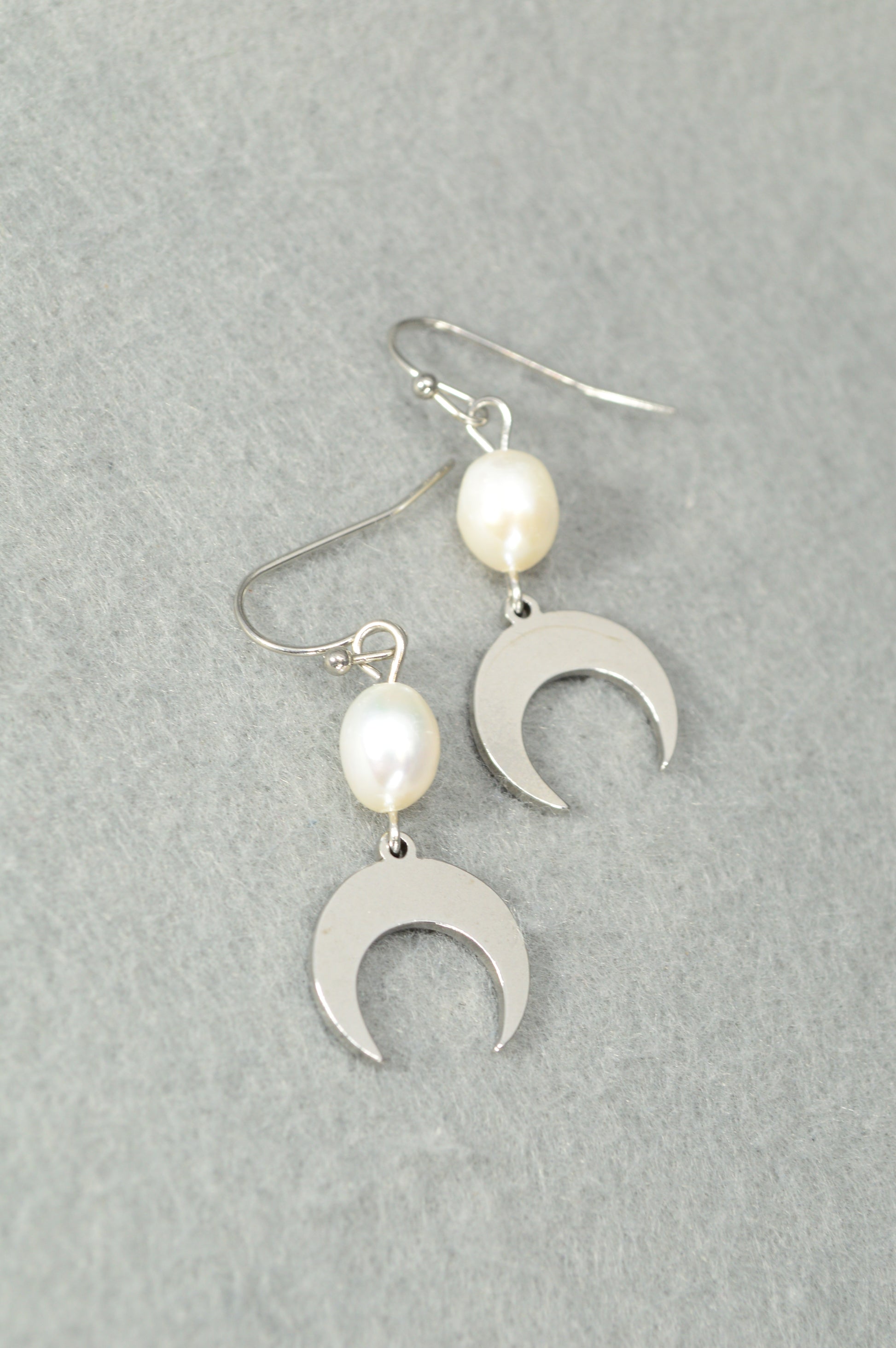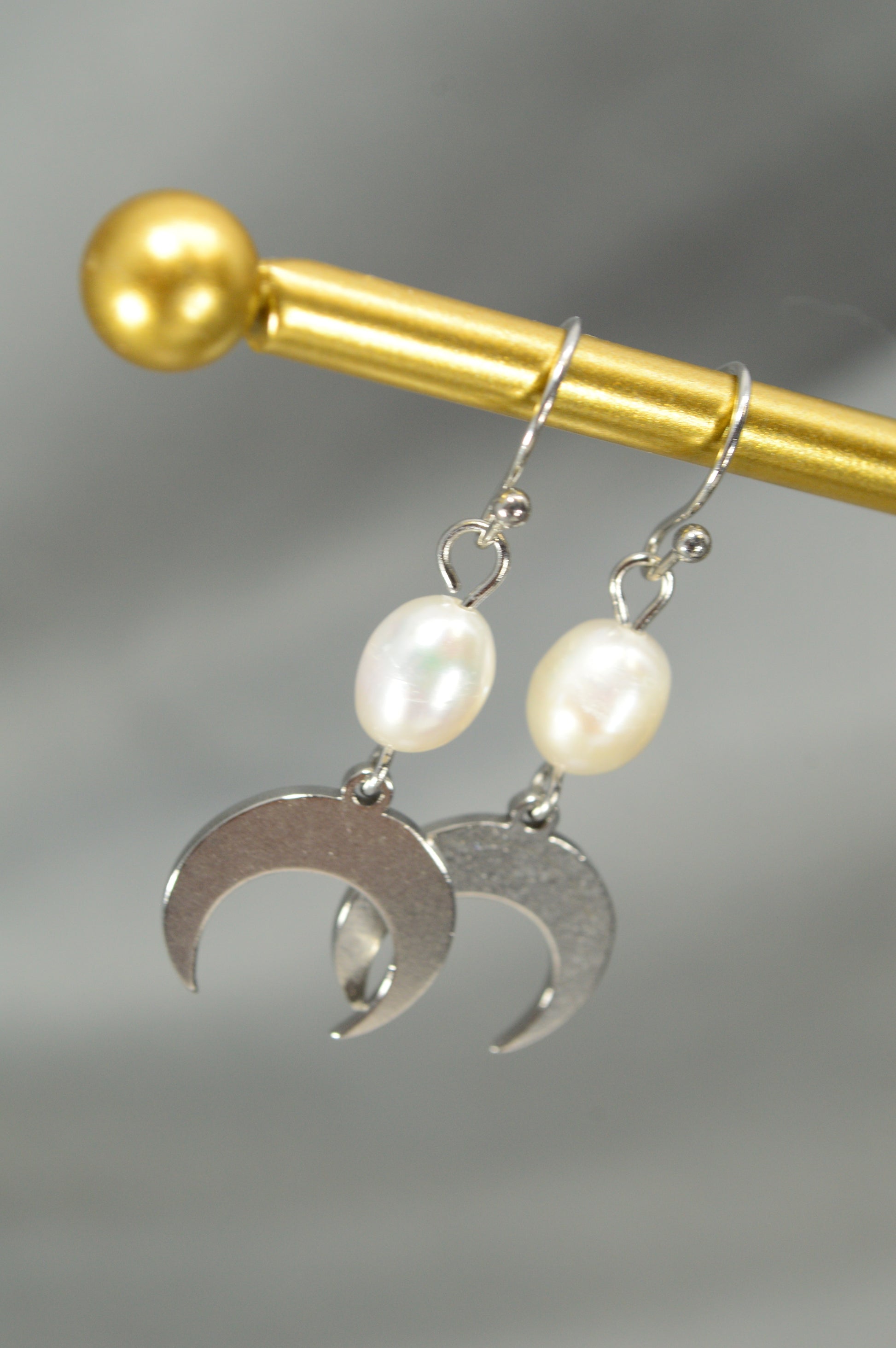 Elegant celestial earrings featuring polished stainless steel crescent moon charms paired with natural freshwater pearls. The combination of smooth silver-tone metal and soft pearl glow creates a delicate, feminine look with a modern touch. Lightweight and comfortable for everyday wear, yet stylish enough for special occasions. Perfect for moon lovers, minimalists, and anyone who enjoys simple jewelry with a touch of magic.