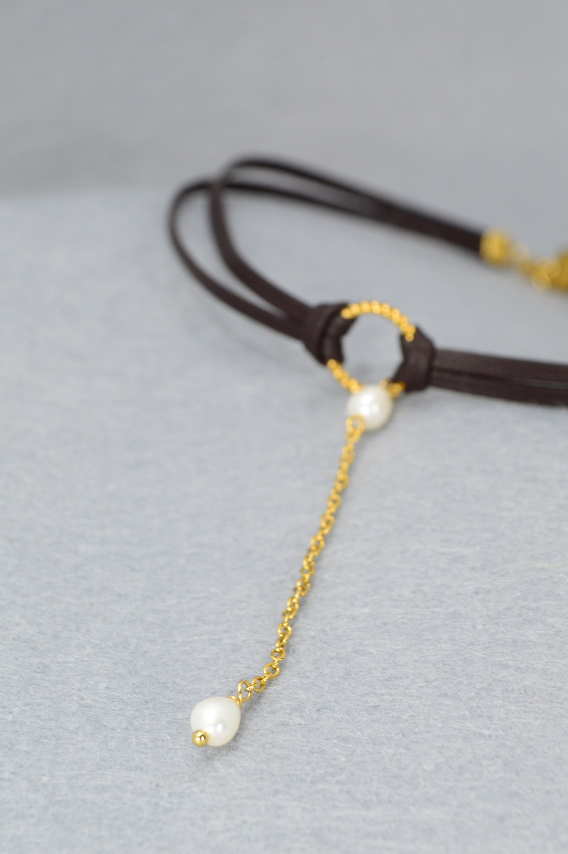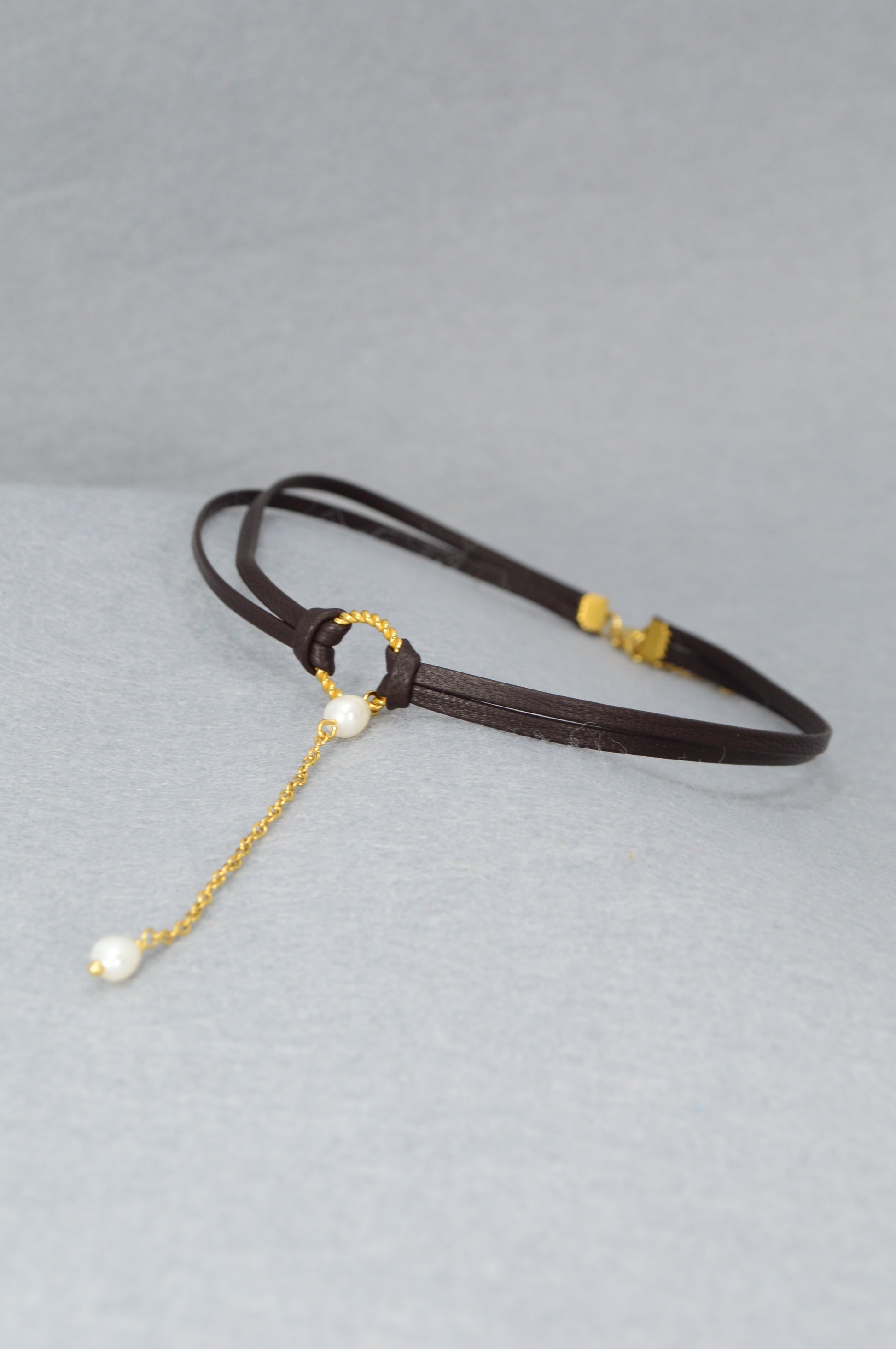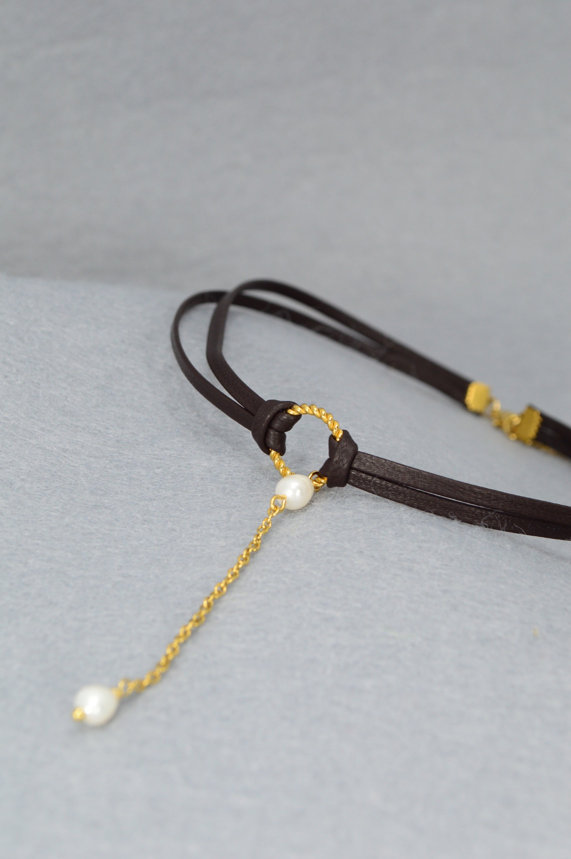 Dare to be different with this dark brown leather choker accented by a twisted gold ring and delicate freshwater pearl drops.