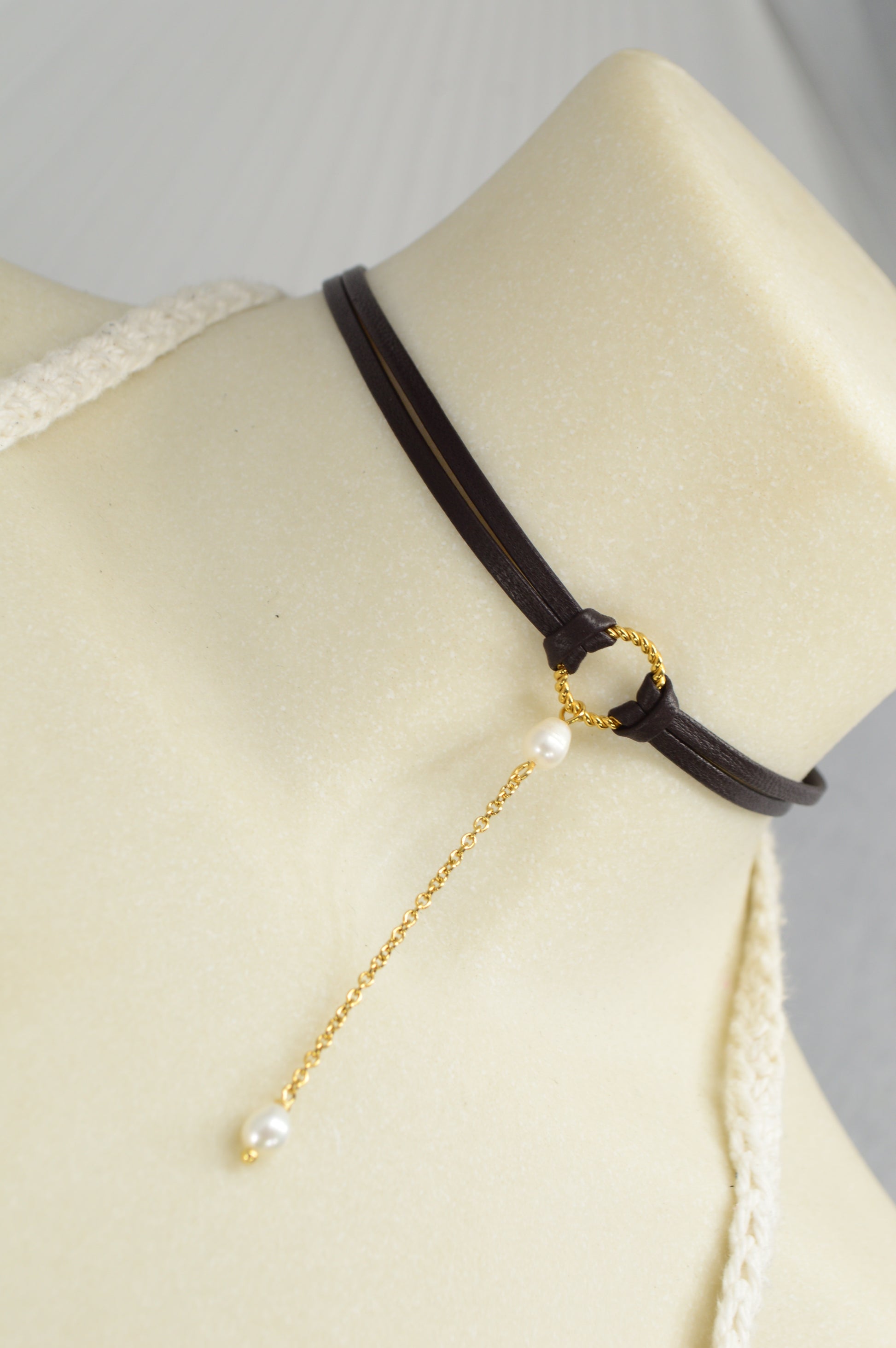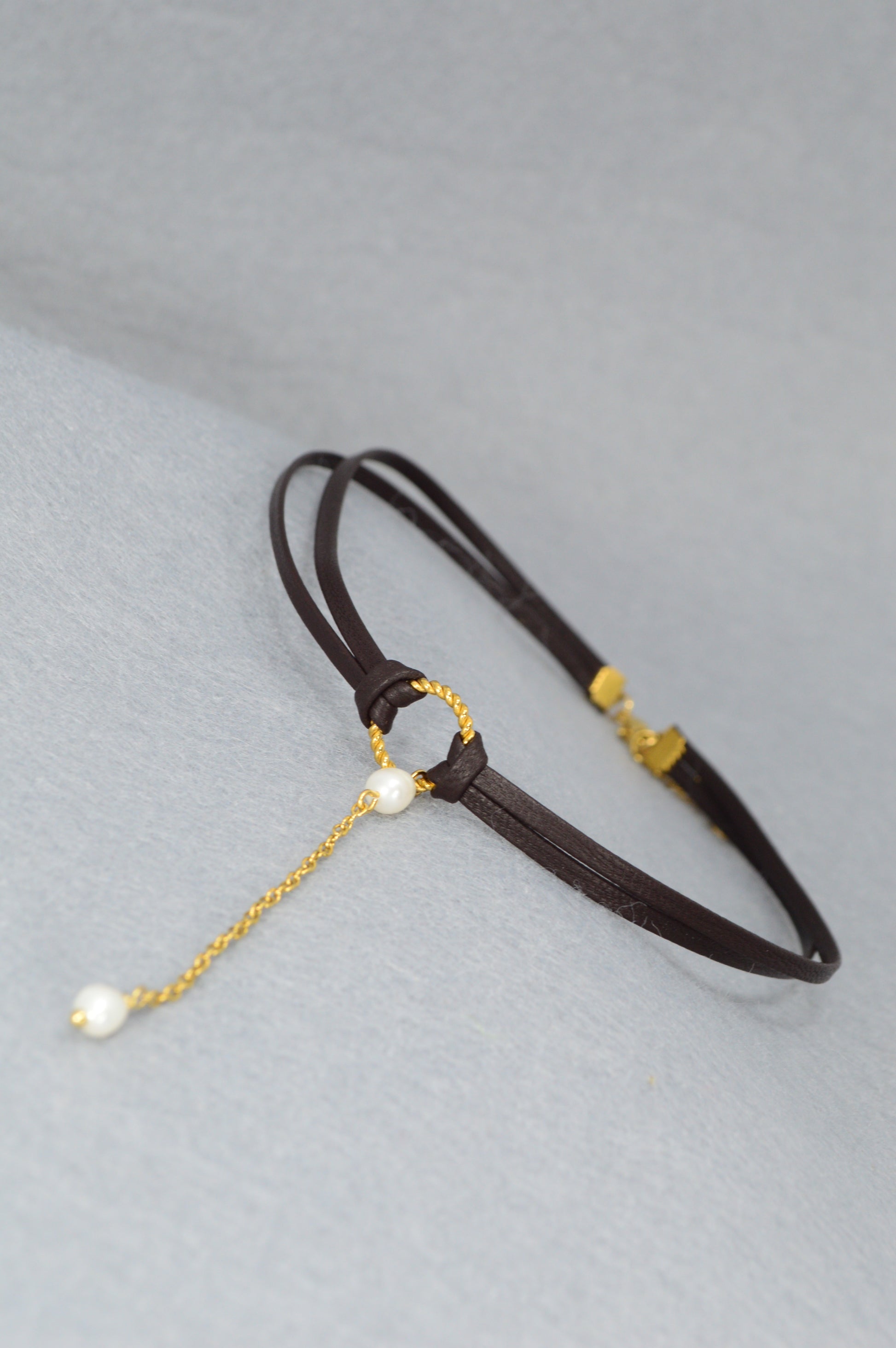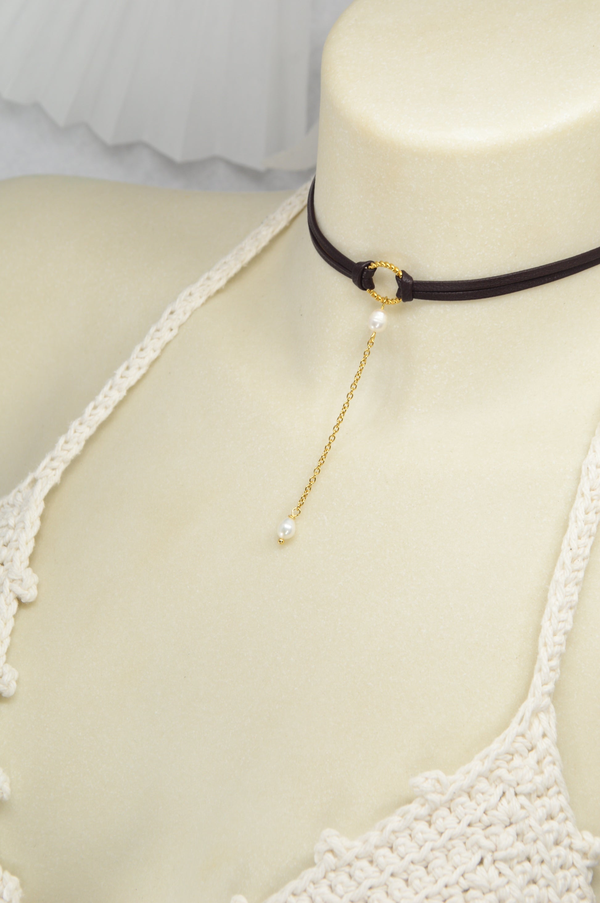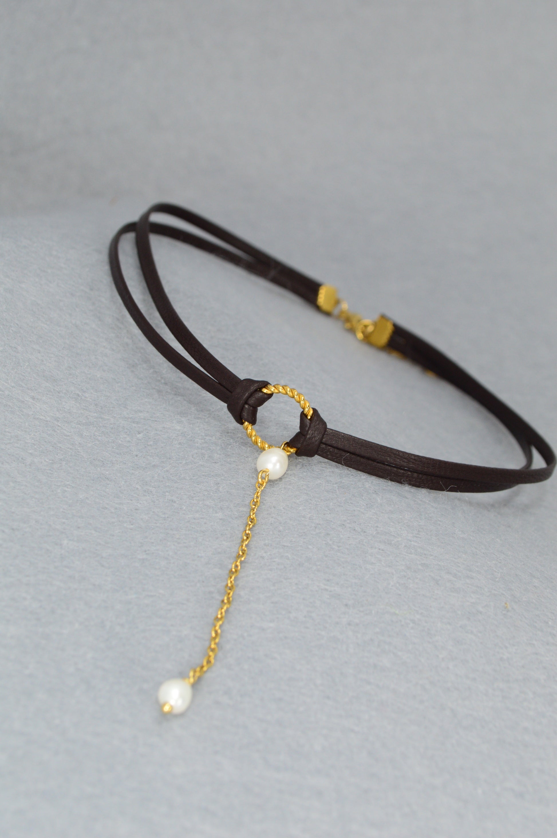 Dare to be different with this dark brown leather choker accented by a twisted gold ring and delicate freshwater pearl drops.