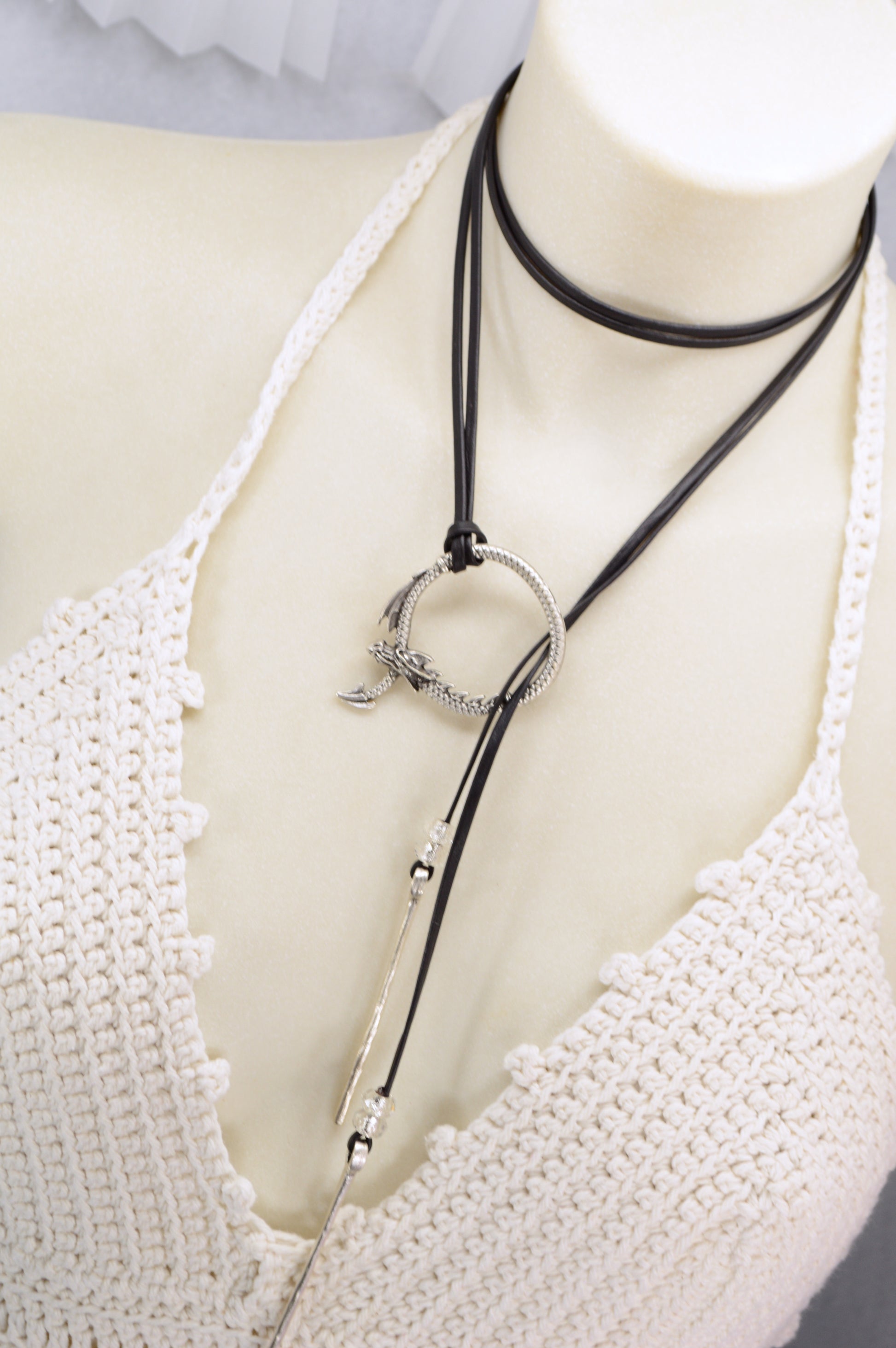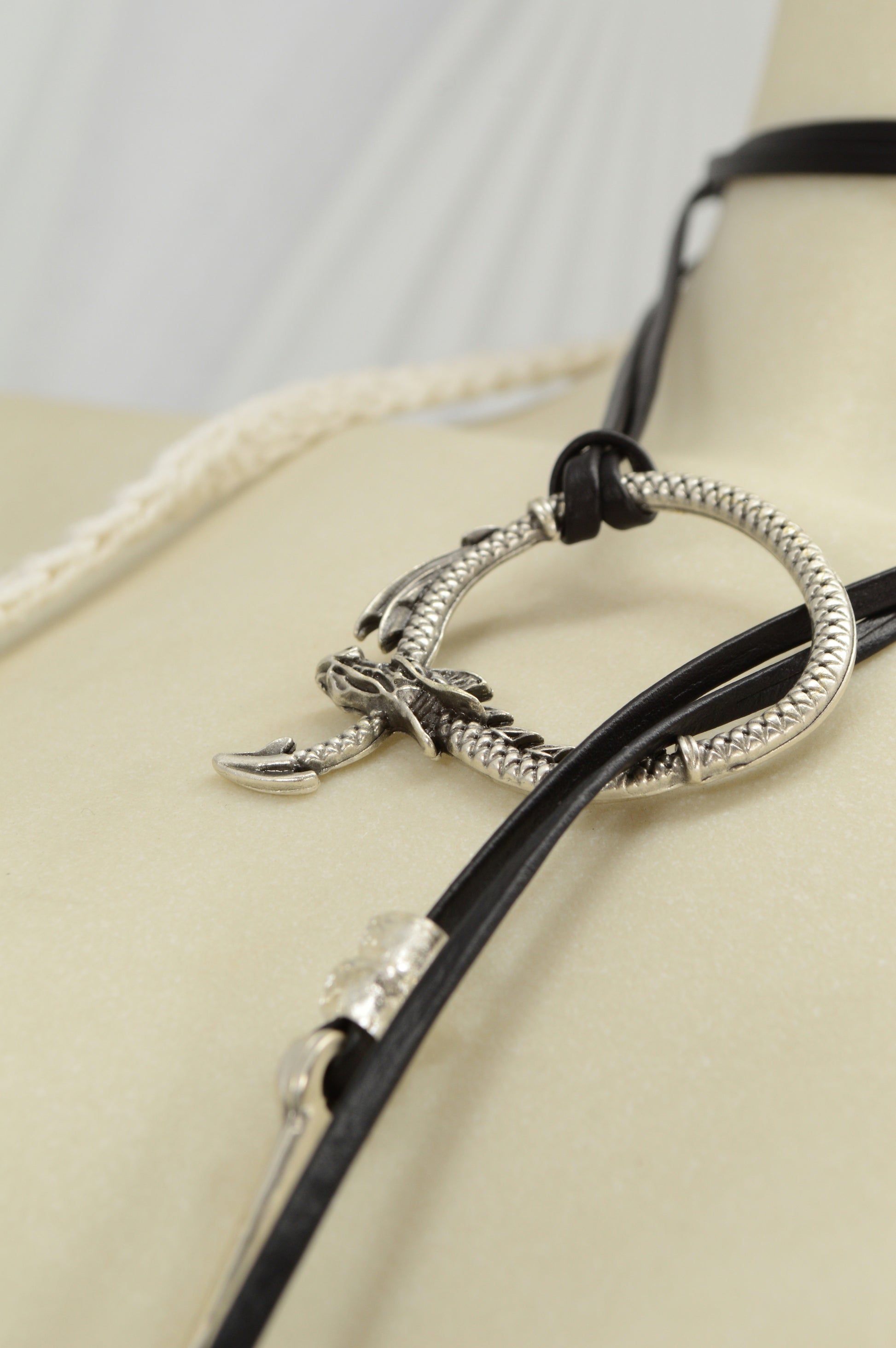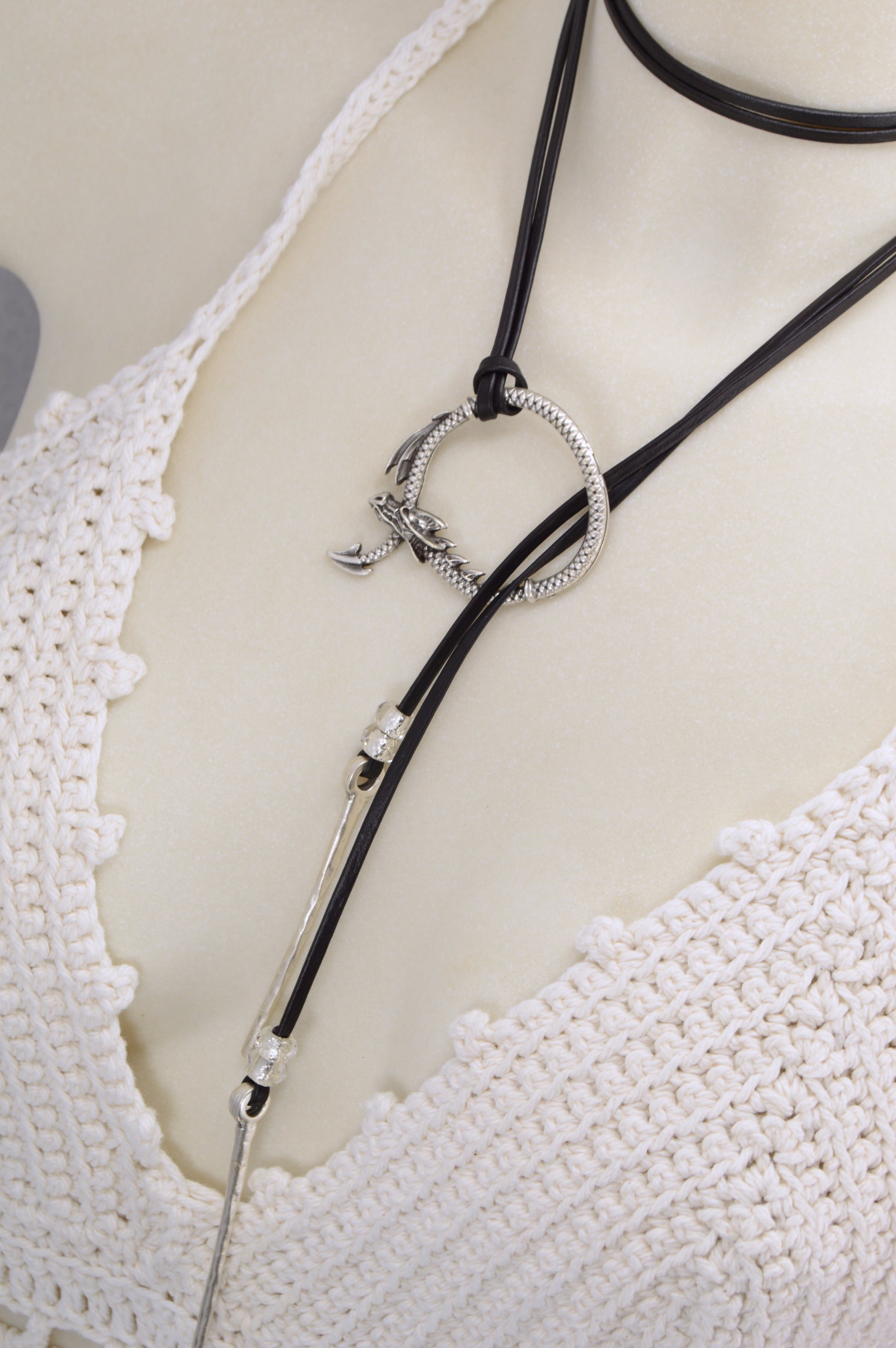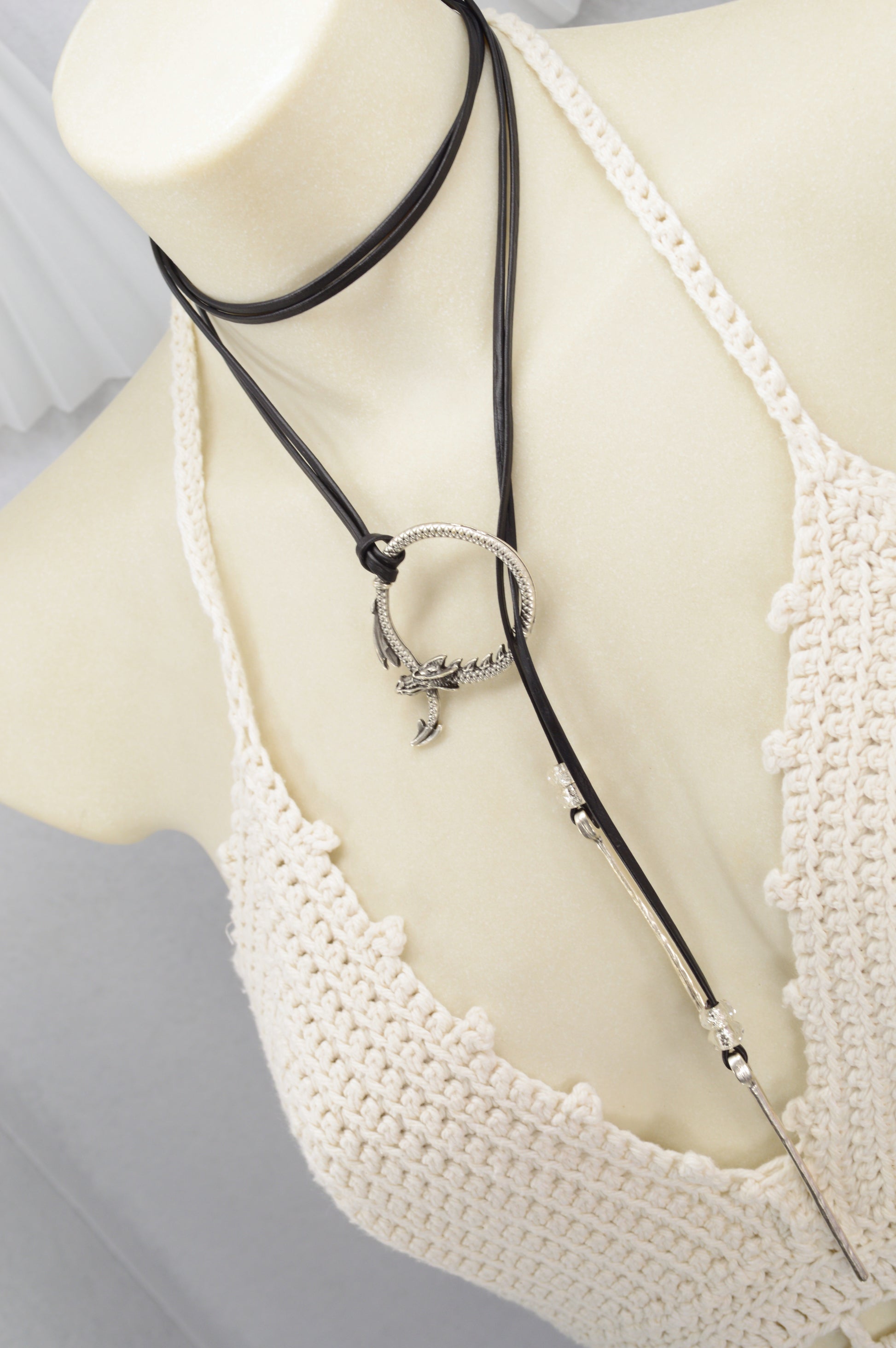 Dragon Circle Necklace | Boho Leather Choker with Silver Dragon Charm