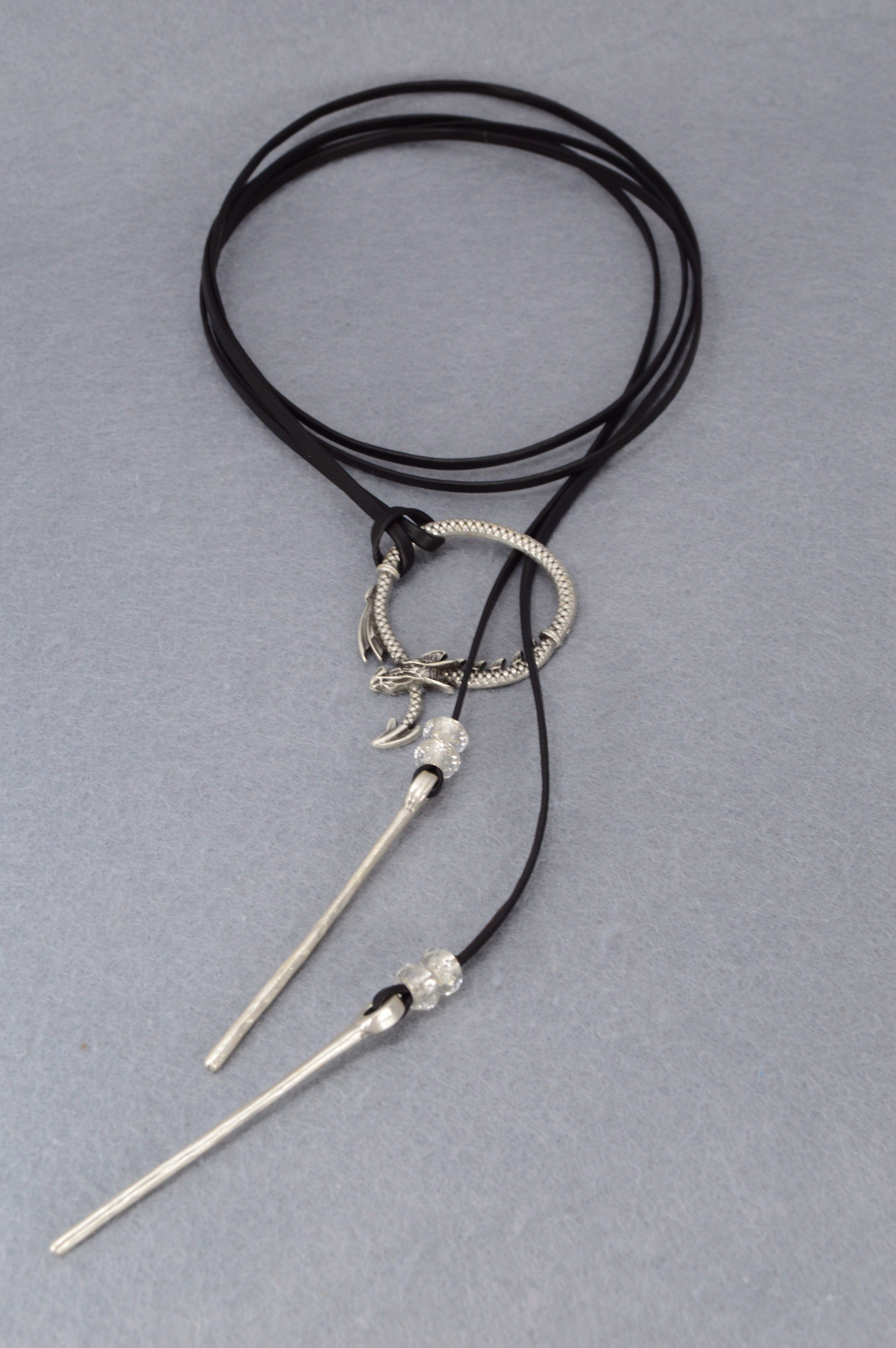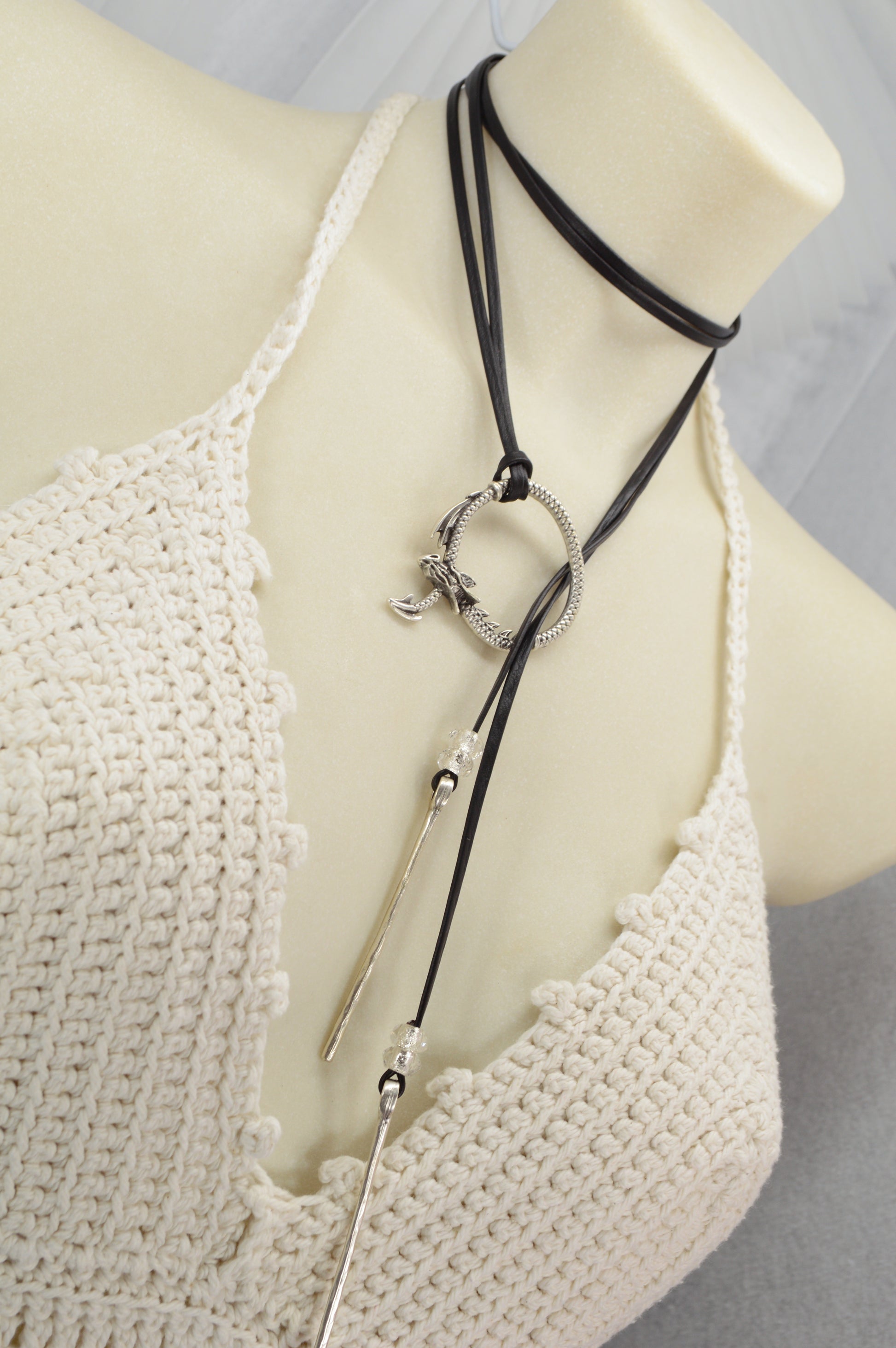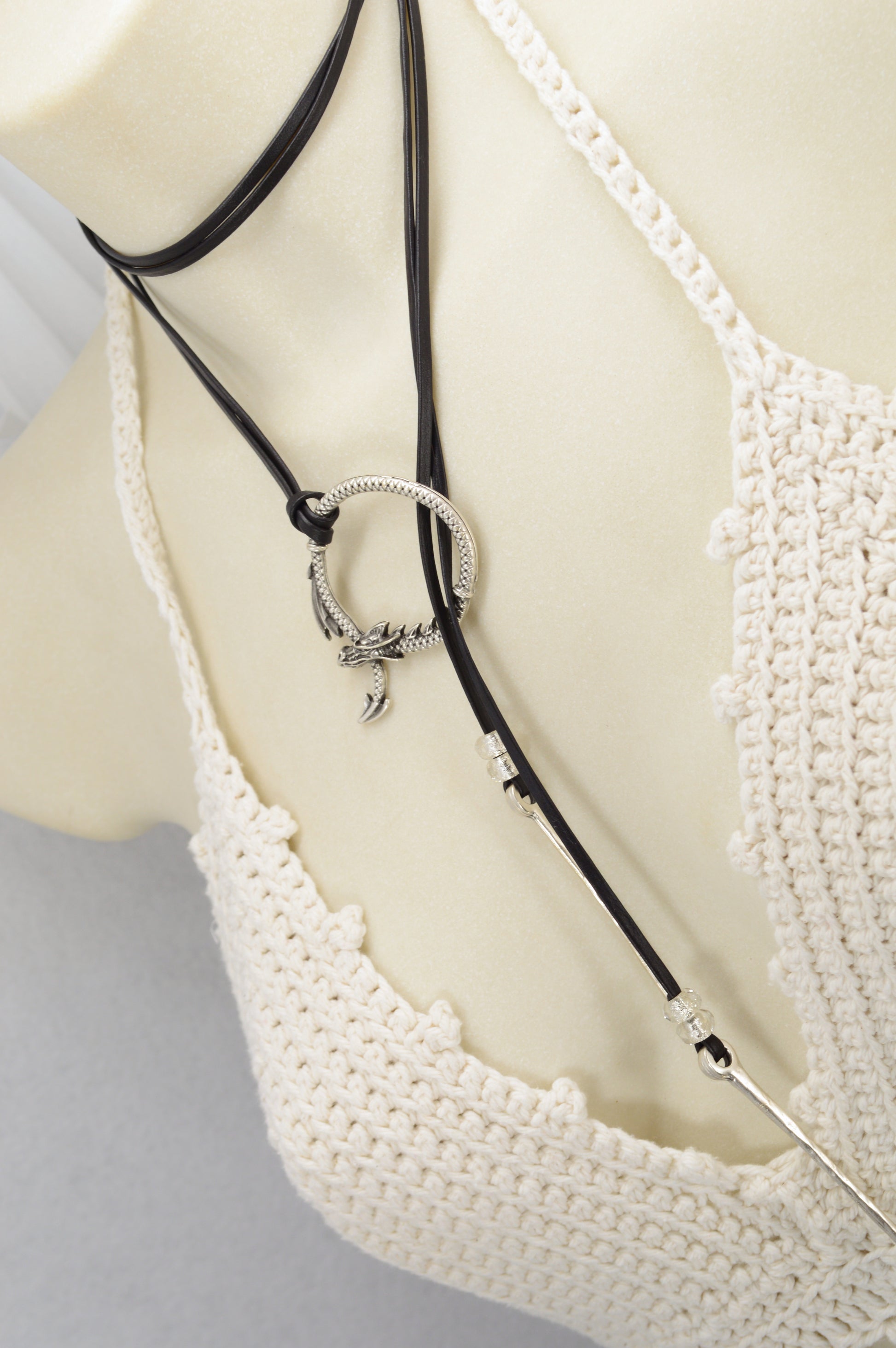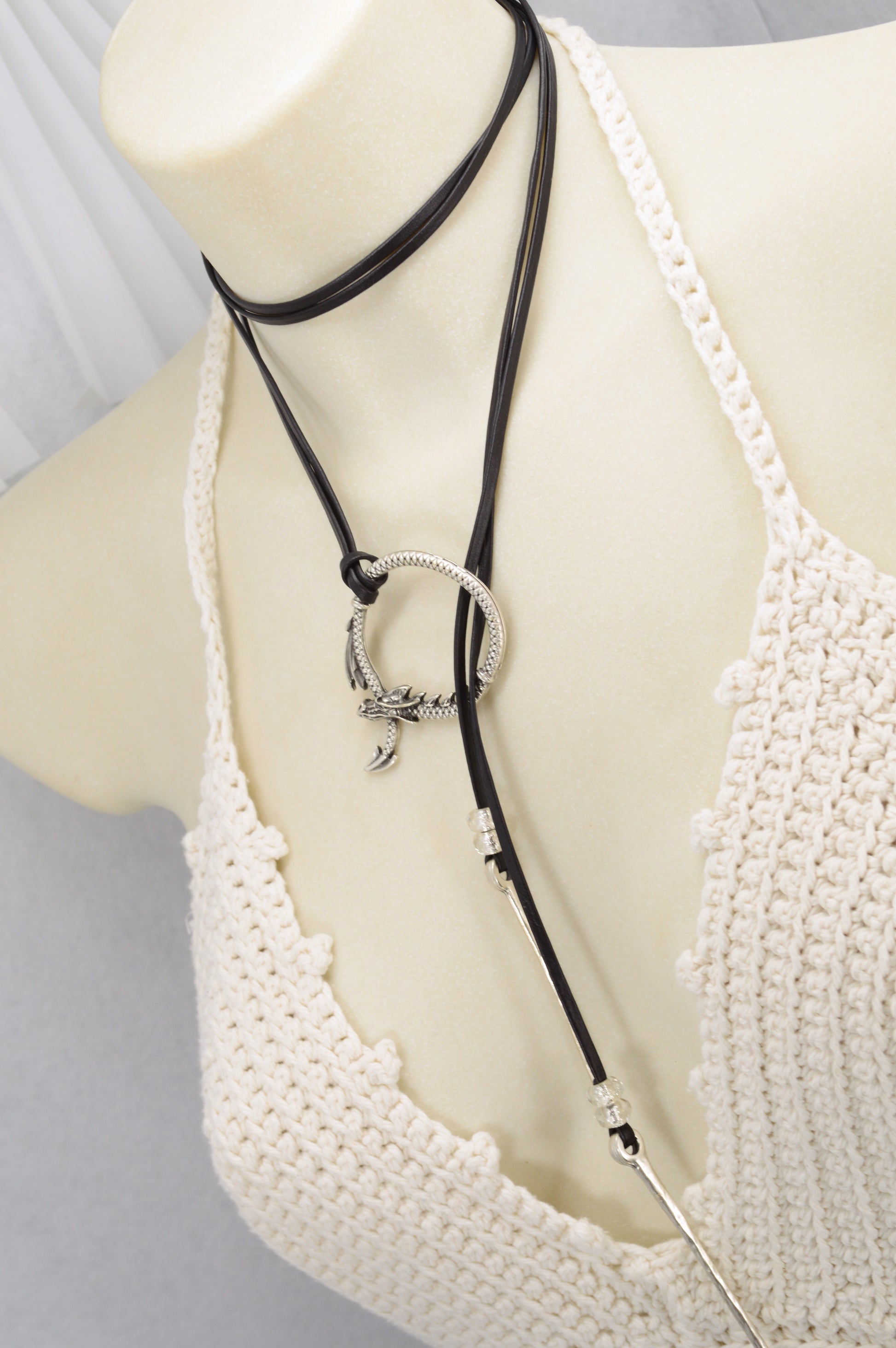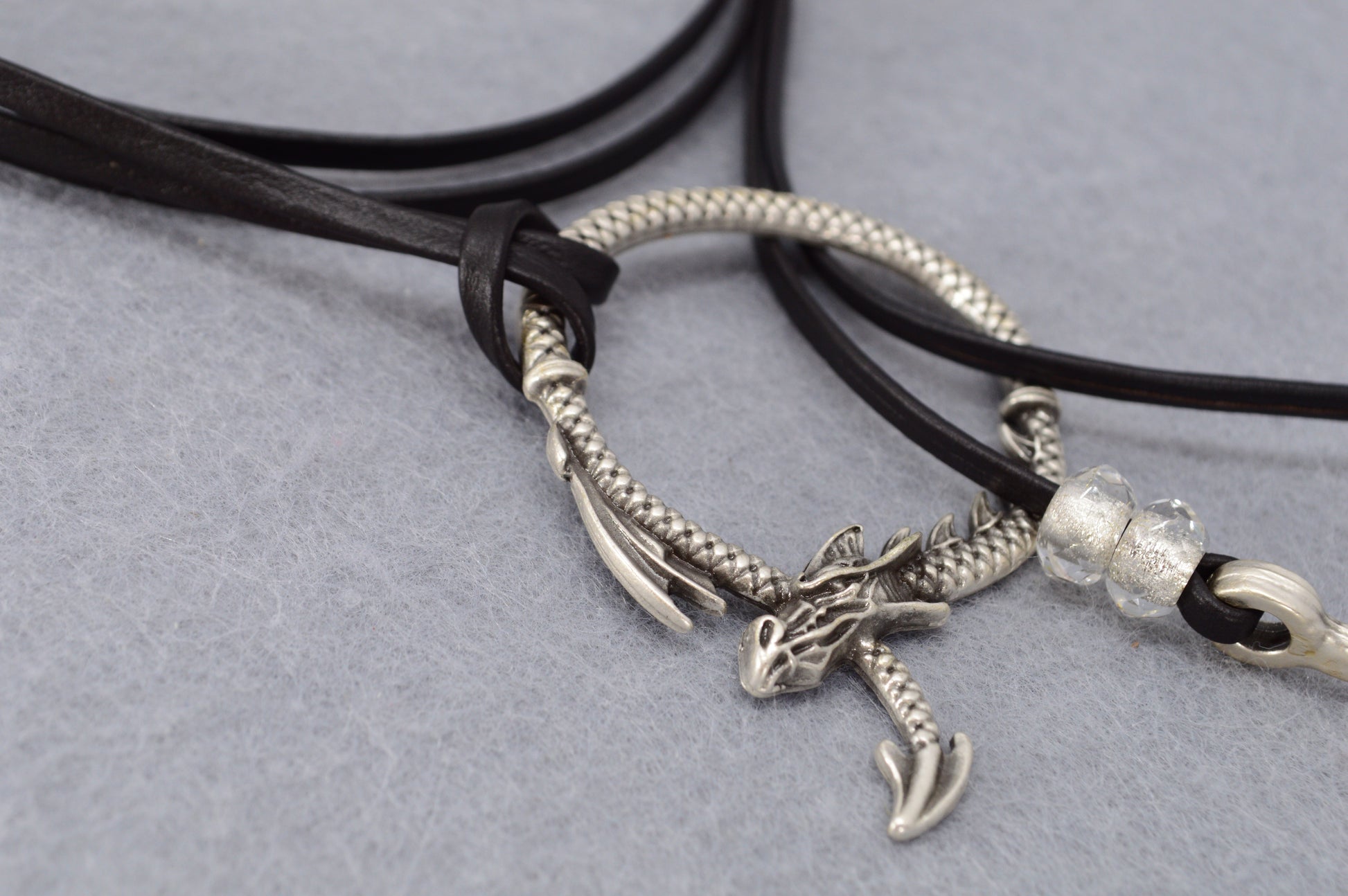 Dragon Circle Necklace | Boho Leather Choker with Silver Dragon Charm