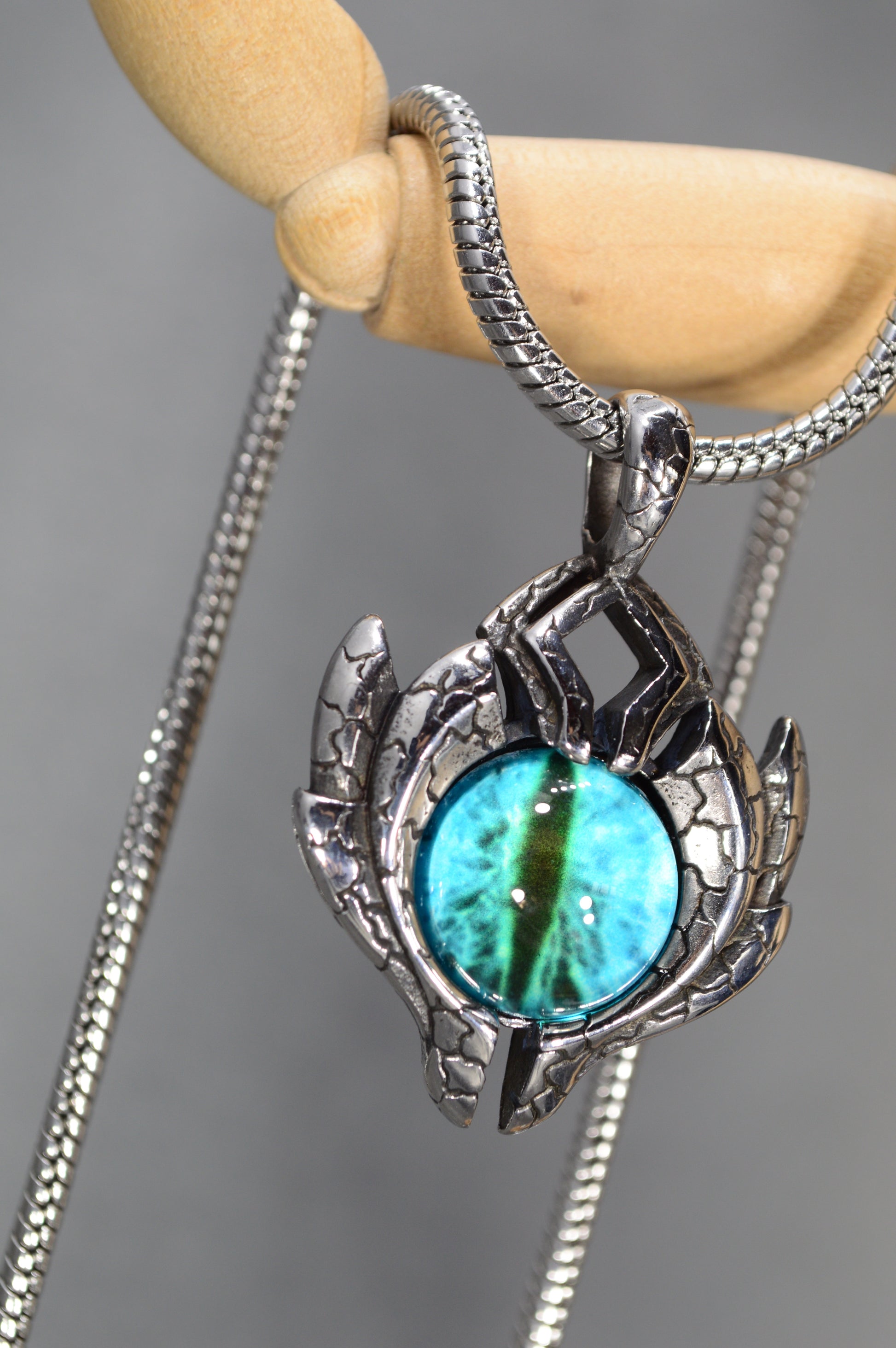 Striking fantasy-style necklace featuring a vivid blue dragon eye set inside a dark, textured claw-like frame. The glass eye has a mesmerizing, realistic look with deep color and detail, making the pendant truly stand out. Crafted from durable stainless steel, the piece hangs on a strong, comfortable chain perfect for daily wear. A bold accessory for dragon lovers, fantasy fans, gamers, and anyone drawn to mystical or powerful creature symbolism. Great gift idea for him or her.