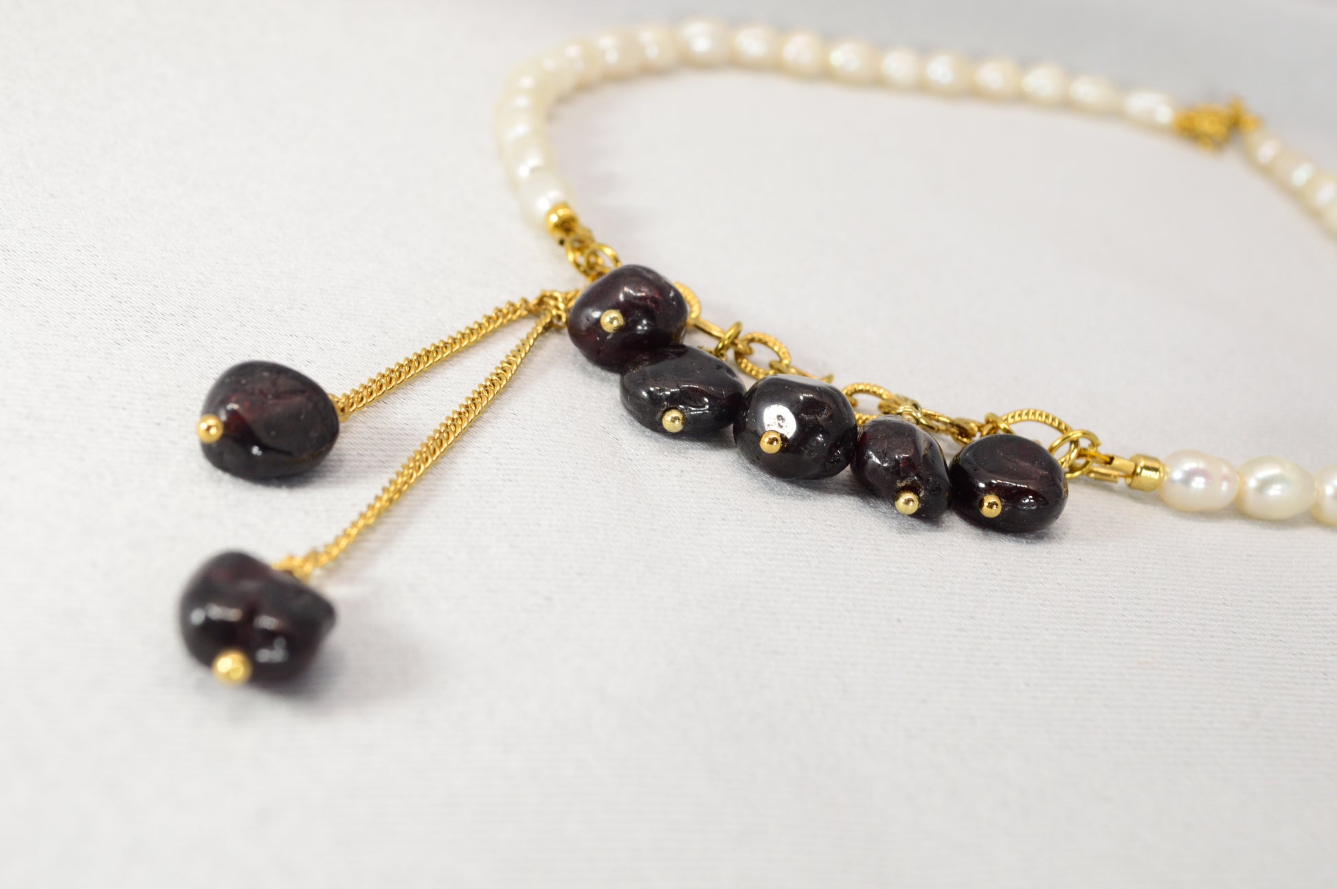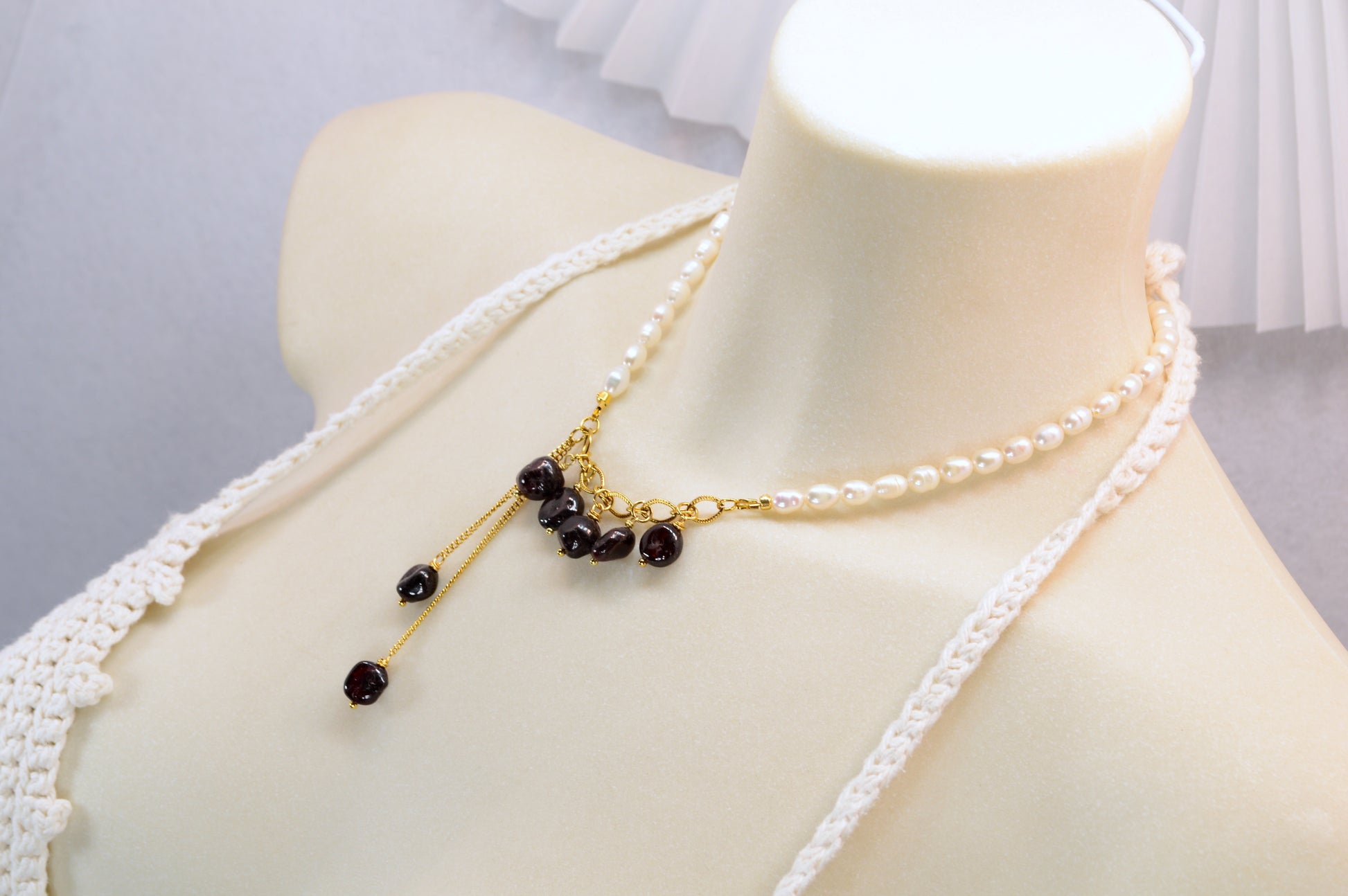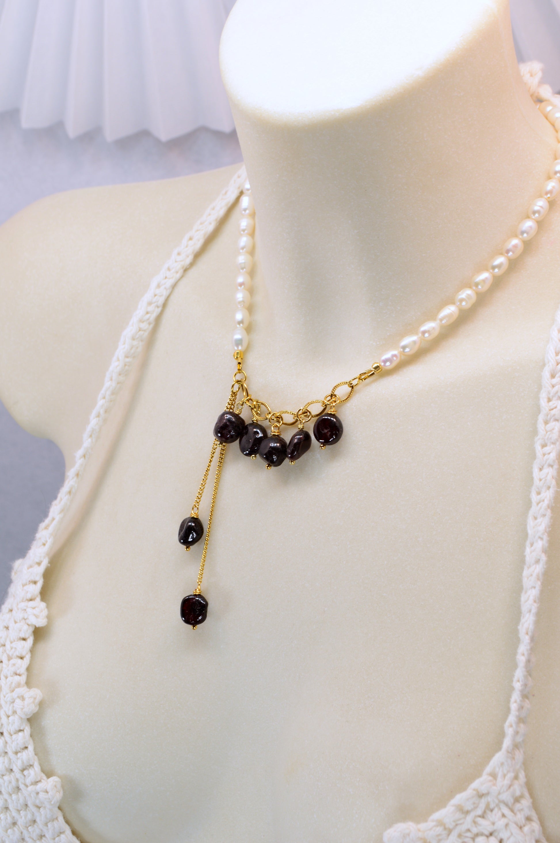 Elegant necklace combining creamy freshwater pearls with deep, glossy garnet beads and gold stainless steel chain details. The contrast between the soft pearls and rich dark stones creates a bold feminine statement that still feels refined and wearable. Available in 16", 17" or 18" lengths, perfect for layering or wearing as a standout piece. Ideal for evening looks, special occasions, gifting, or adding a touch of luxury to a simple outfit like a black dress, satin top, or white blouse.
