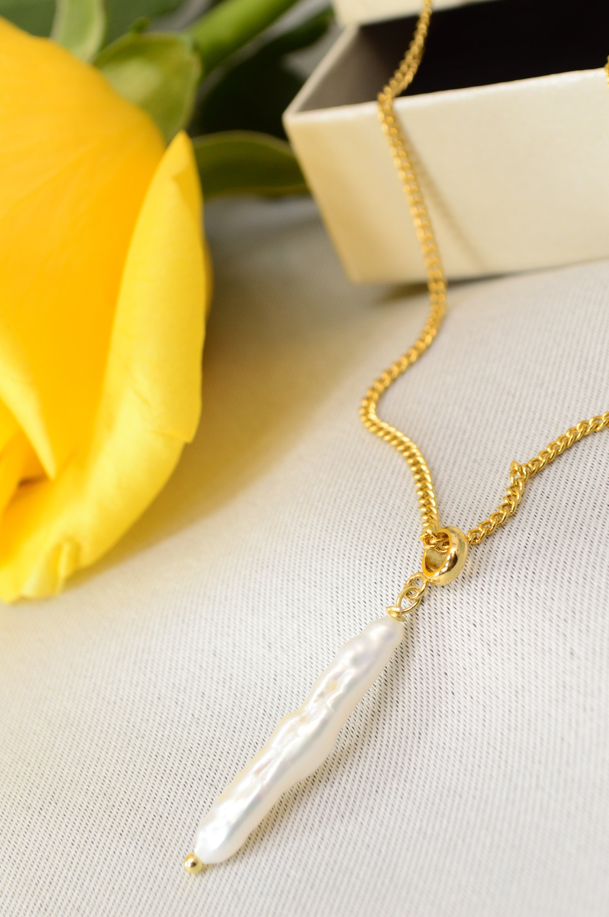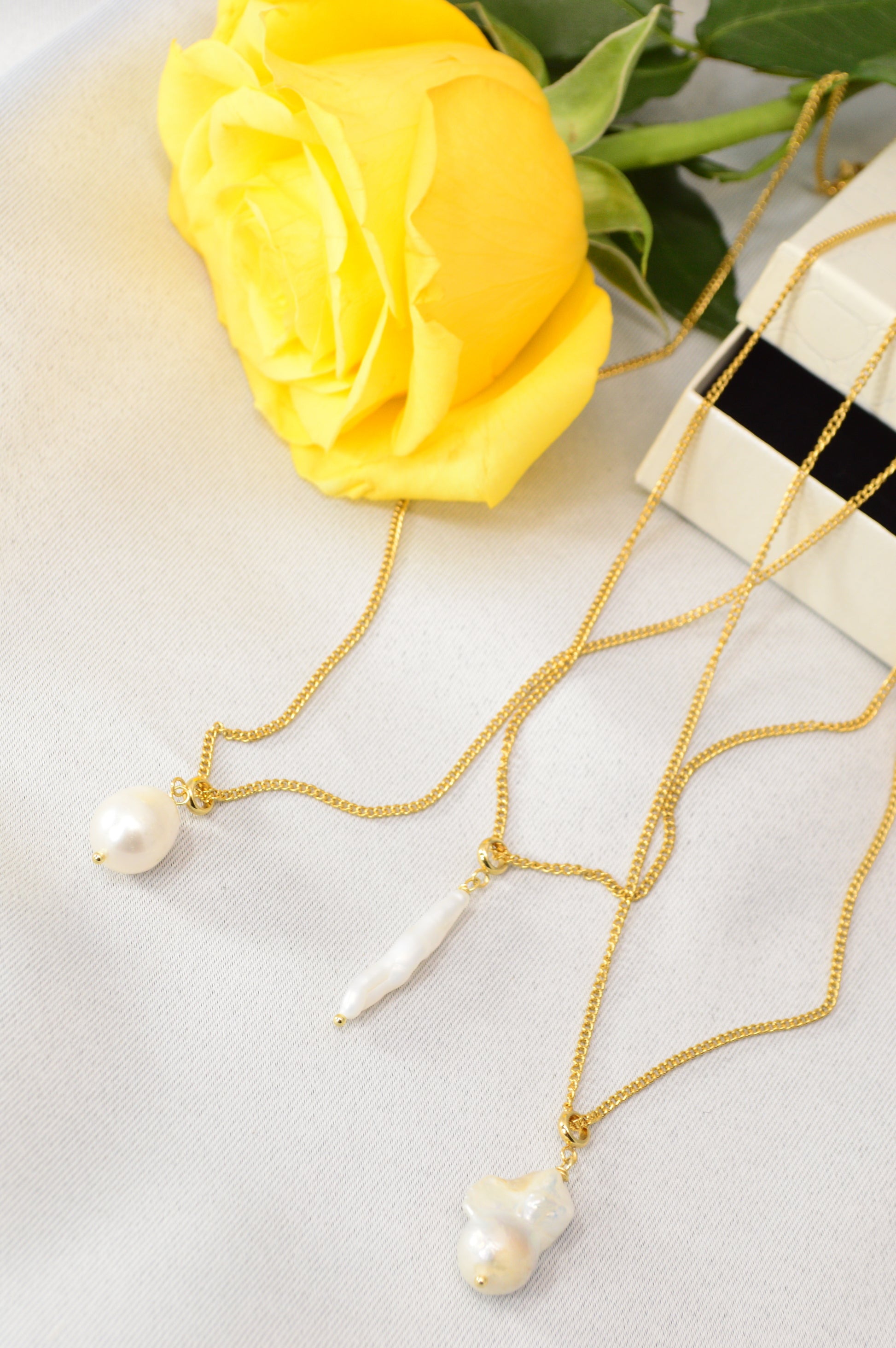 Minimalist freshwater pearl necklace on a gold stainless steel chain, featuring three natural pearl shapes: classic round, long stick, and organic baroque. Each pendant has its own soft sheen and elegant irregularity, making the necklace feel refined and modern at the same time. Perfect for everyday wear, office looks, romantic outfits and gifting someone who loves timeless jewelry. Wear solo for a clean minimalist vibe or layer with thin gold chains for a chic curated look.