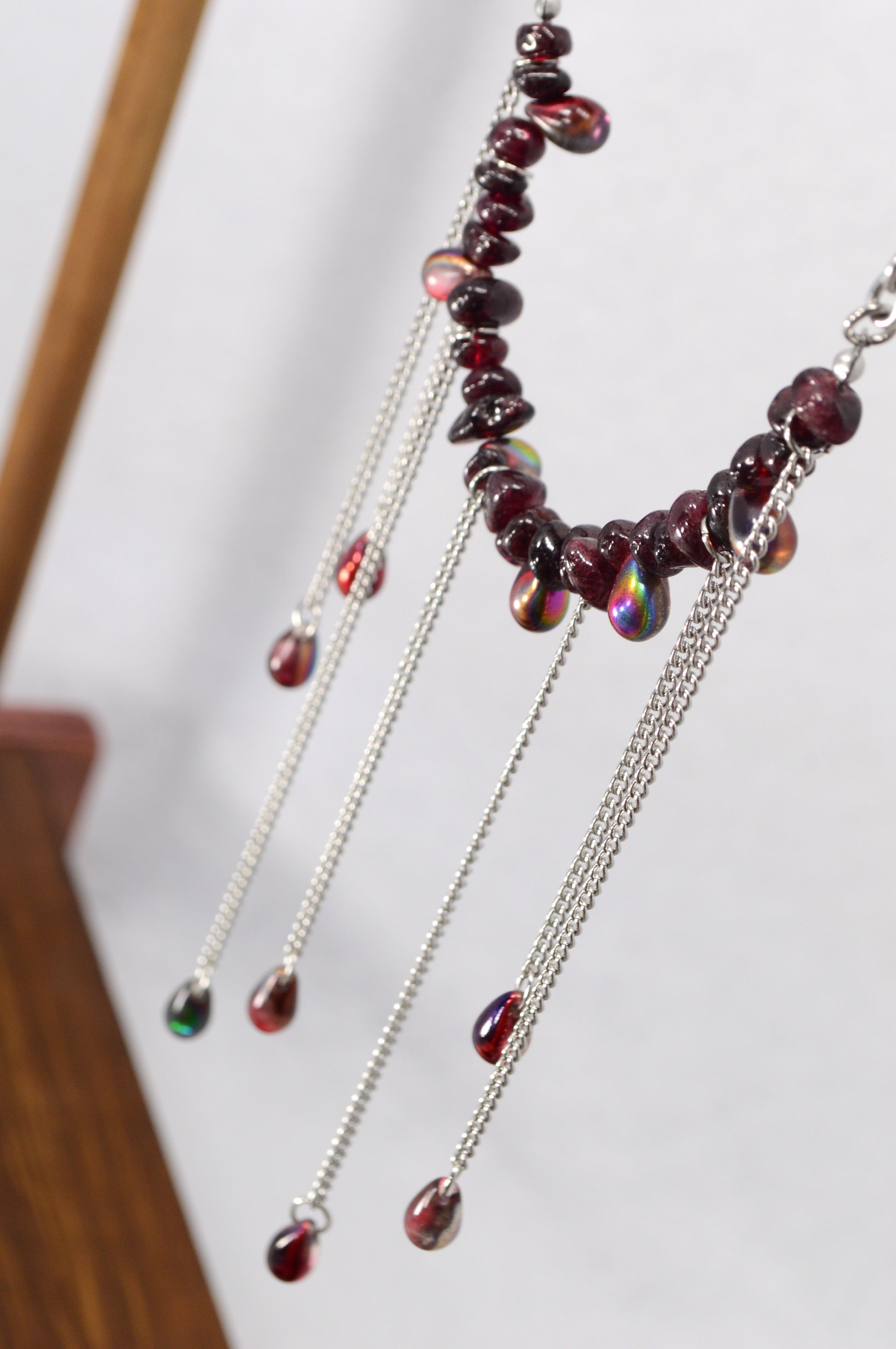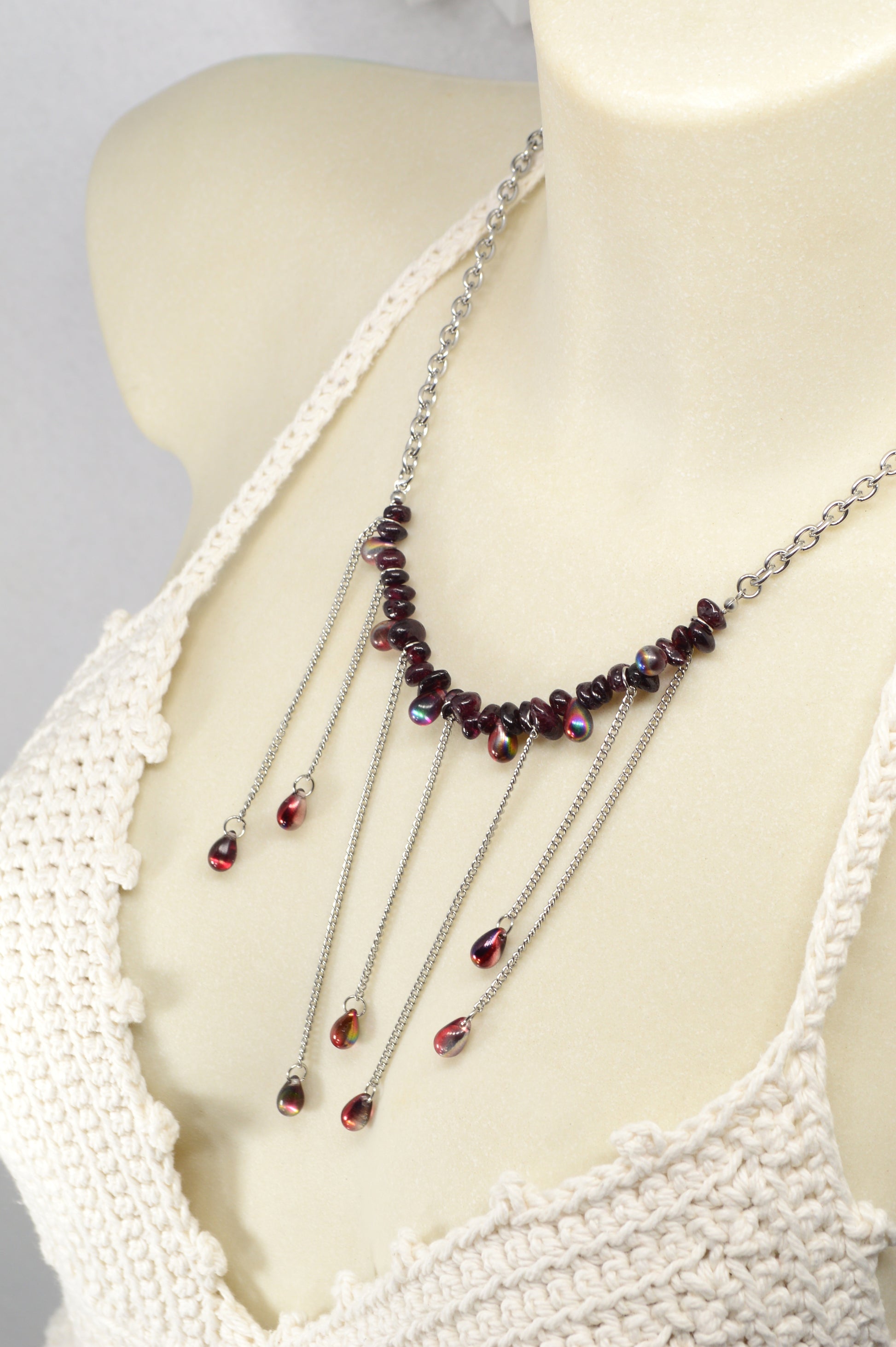 This dramatic statement necklace features deep red garnet beads accented with cascading stainless steel chains and teardrop garnet drops. The layered fringe design creates movement, shine, and a bold, sensual silhouette that beautifully frames the neckline and décolletage. The rich wine tones of natural garnet contrast with cool silver metal, giving the piece a modern gothic-elegant feel. Perfect for evening looks, stage outfits, or fashion-forward styling, this necklace adds depth, sparkle, and striking character to any outfit.