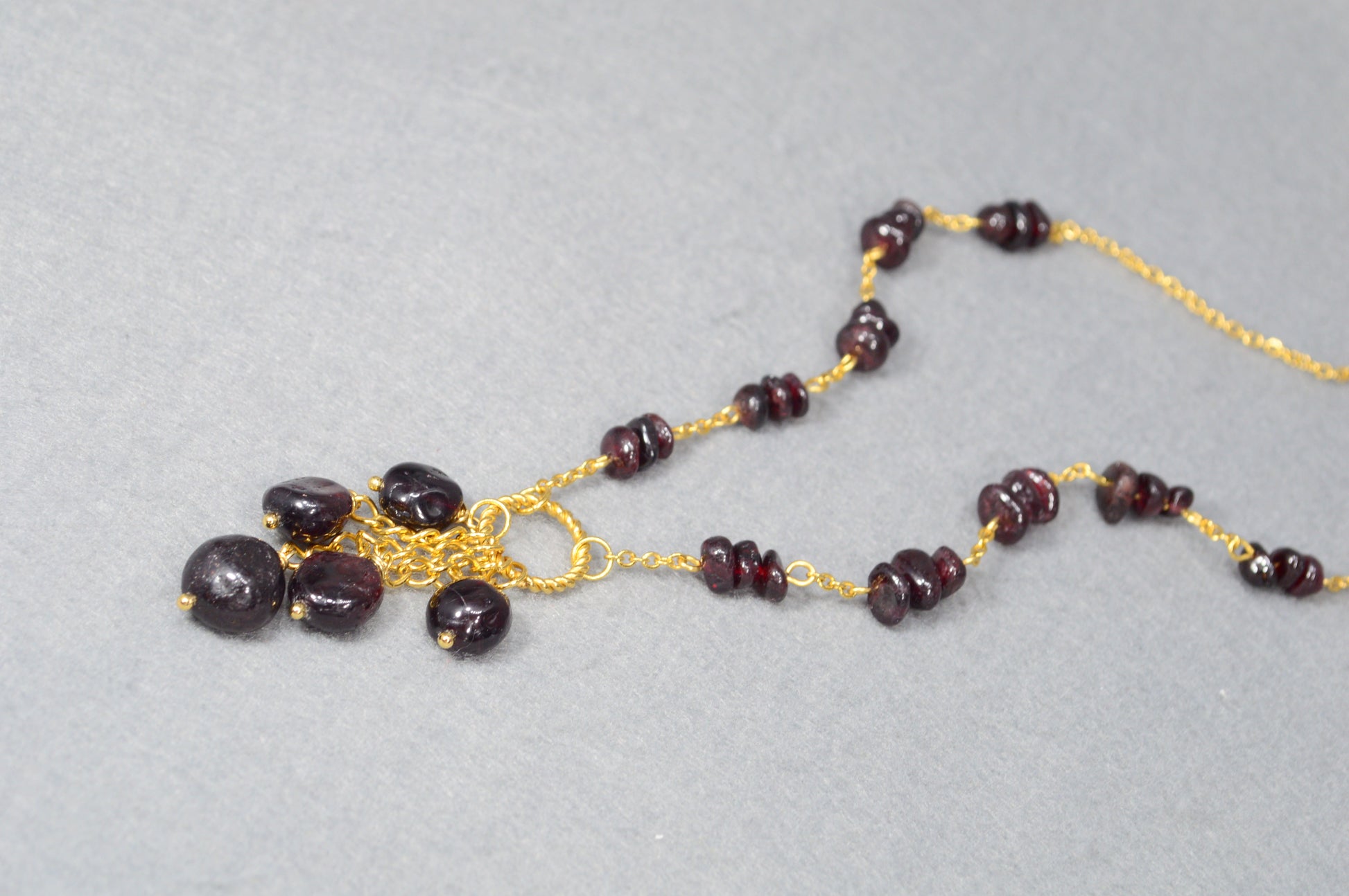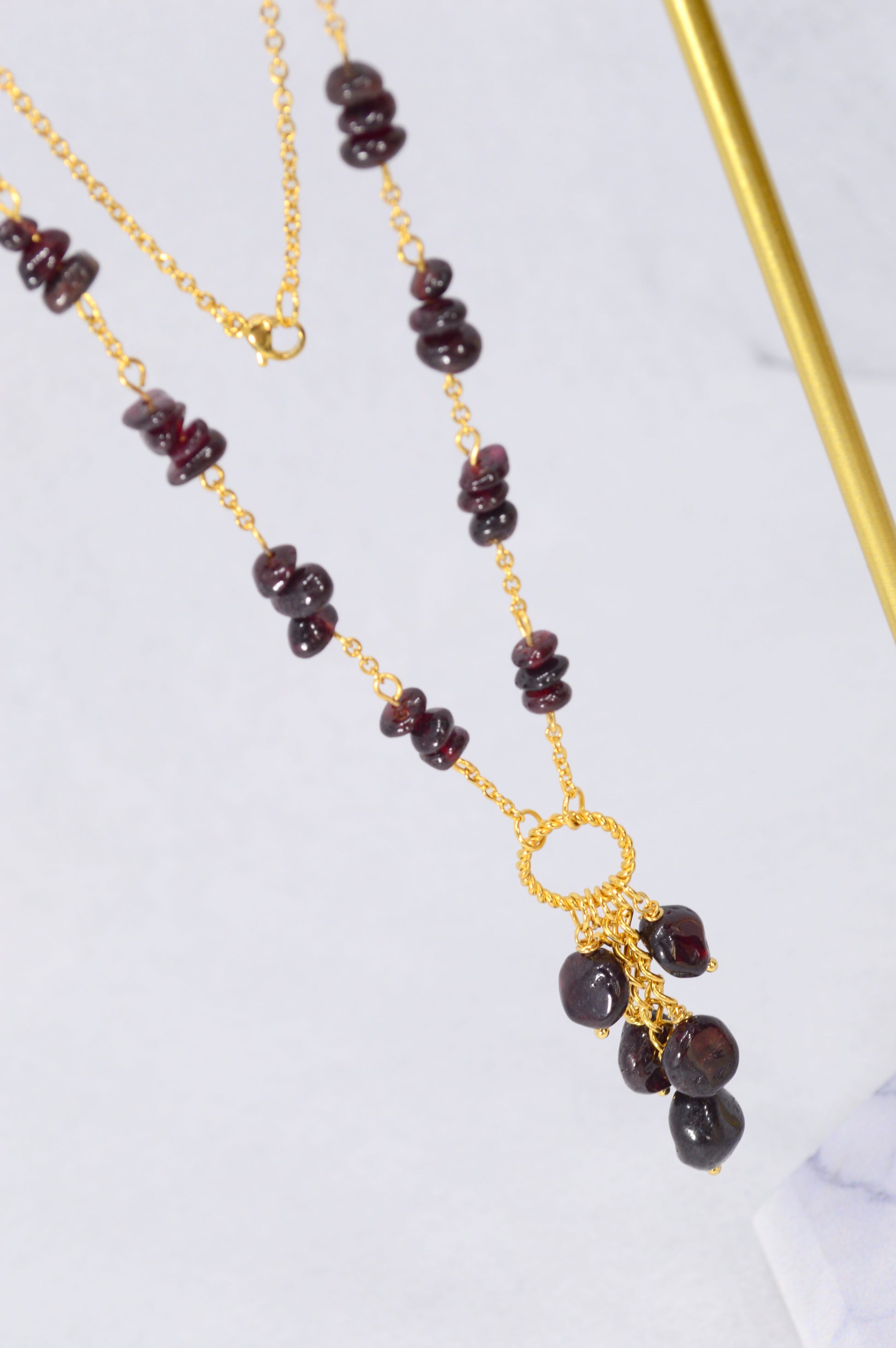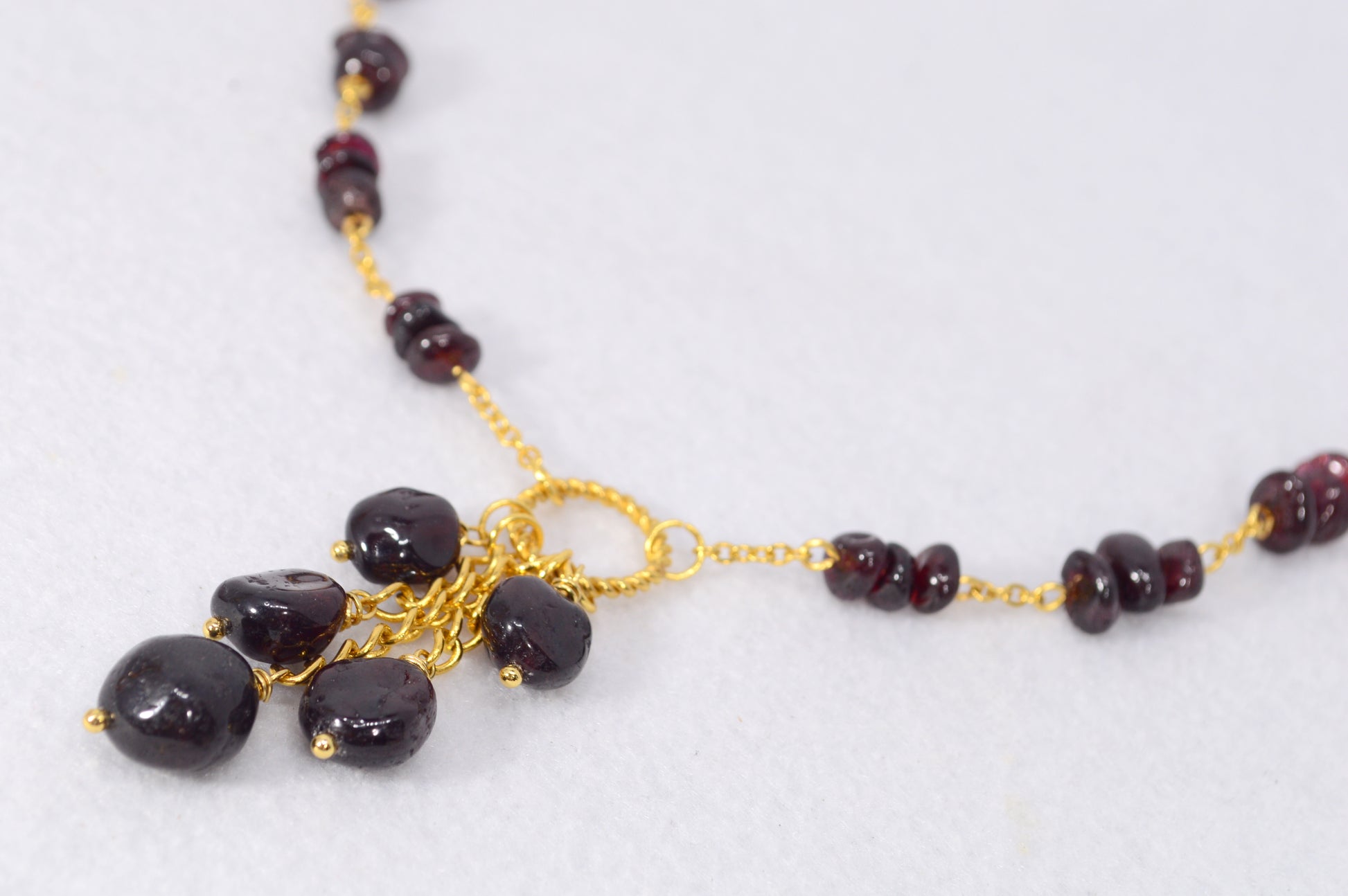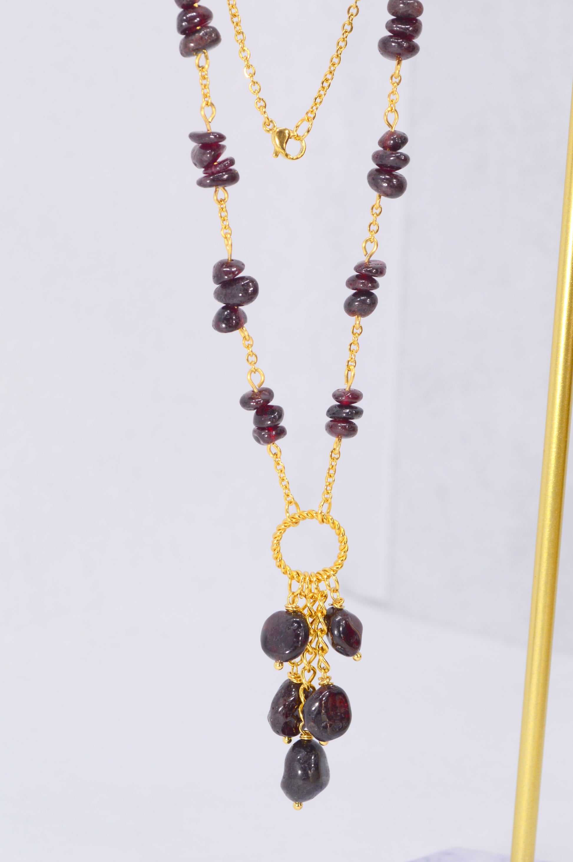 This elegant garnet necklace features deep red natural garnet stones linked with a warm gold-tone chain, creating a rich and luxurious contrast. The design is finished with a cascading cluster of polished garnet drops that add movement and light-catching shine. Garnet is known for its intense color and timeless beauty, making this necklace perfect for evening wear, romantic looks, and sophisticated everyday styling. The combination of fine chain and organic gemstone shapes gives the piece a handcrafted, artisan feel. A striking yet refined statement necklace that highlights the neckline and adds depth, warmth, and character to any outfit.