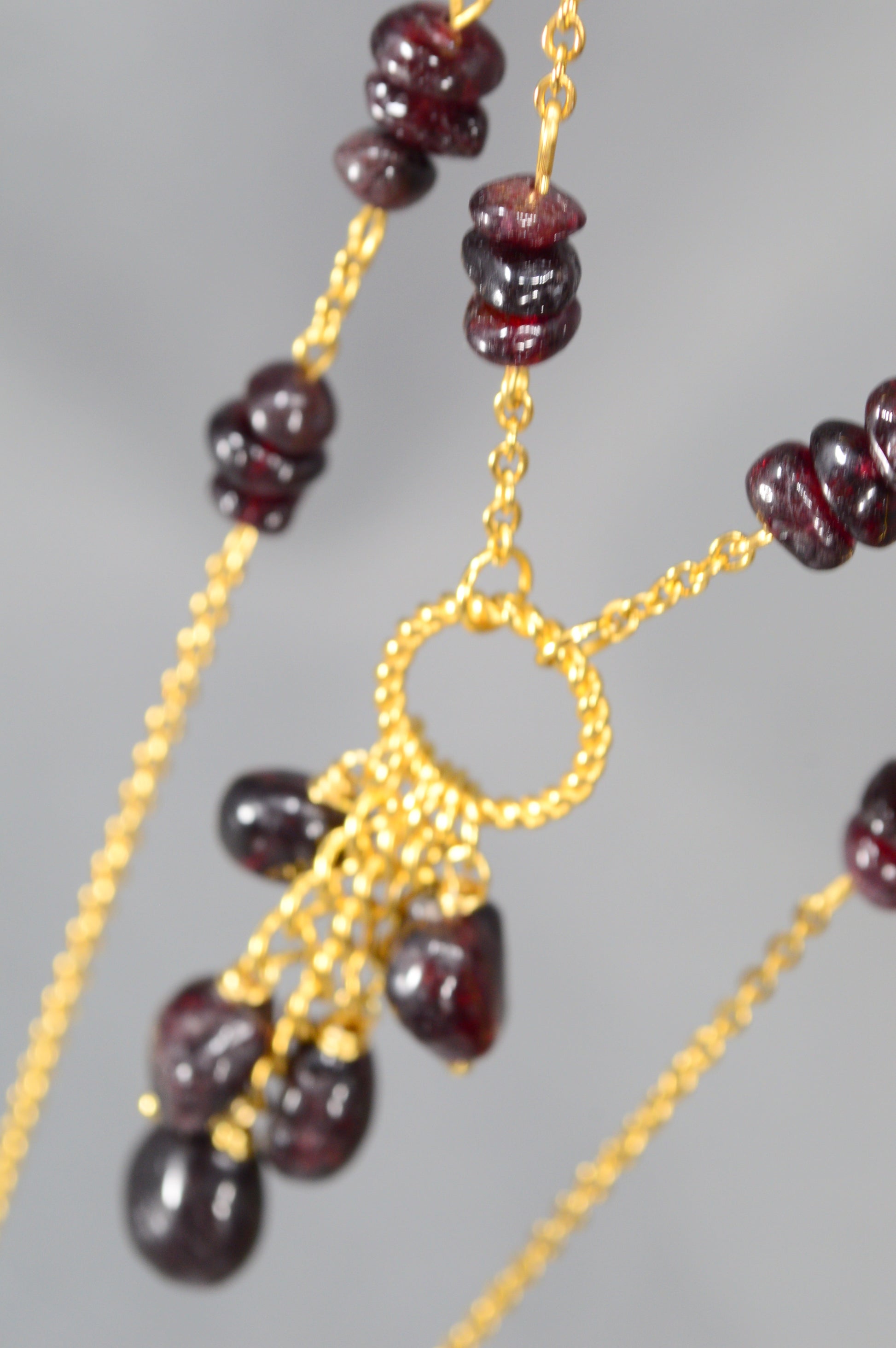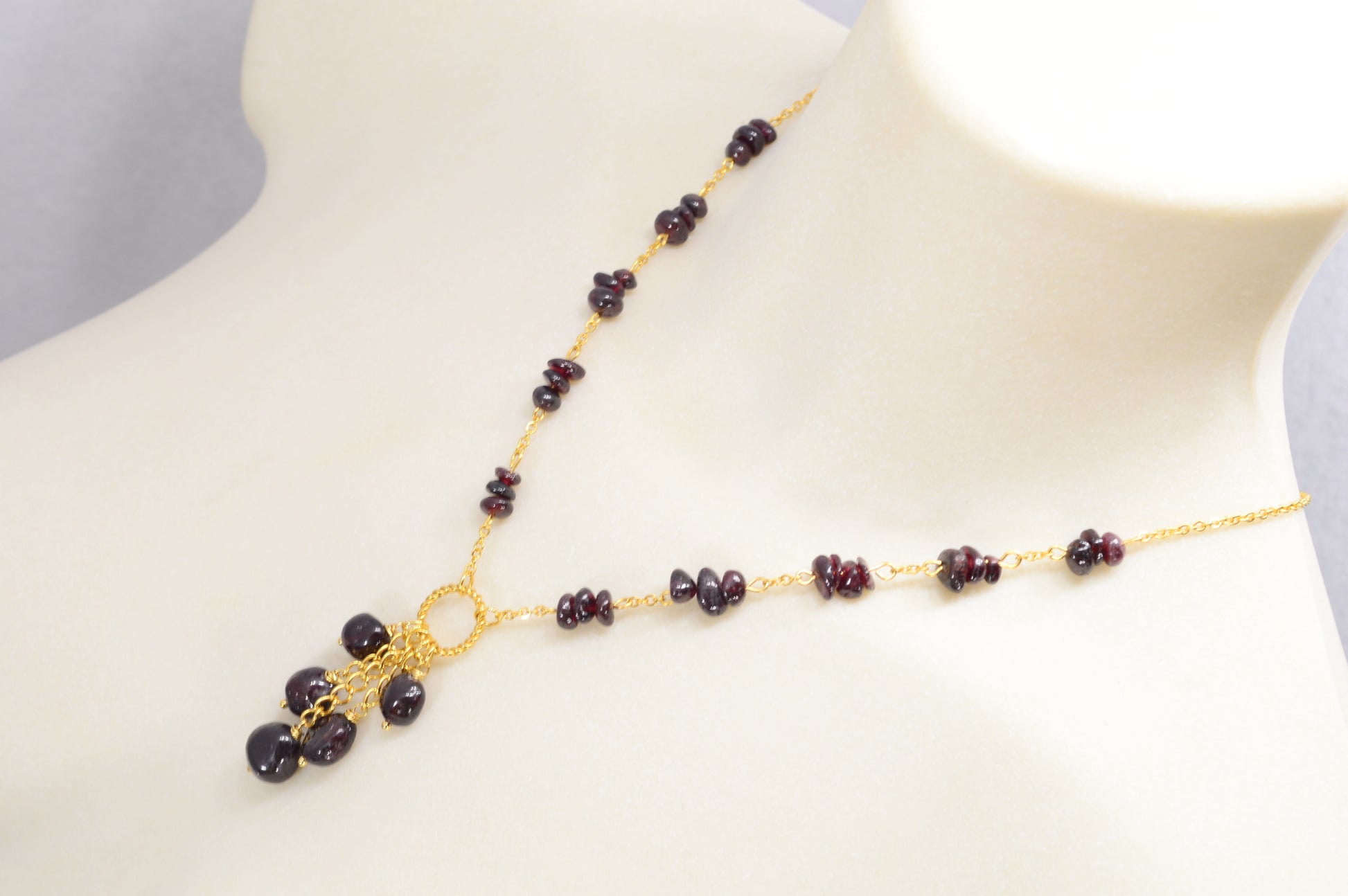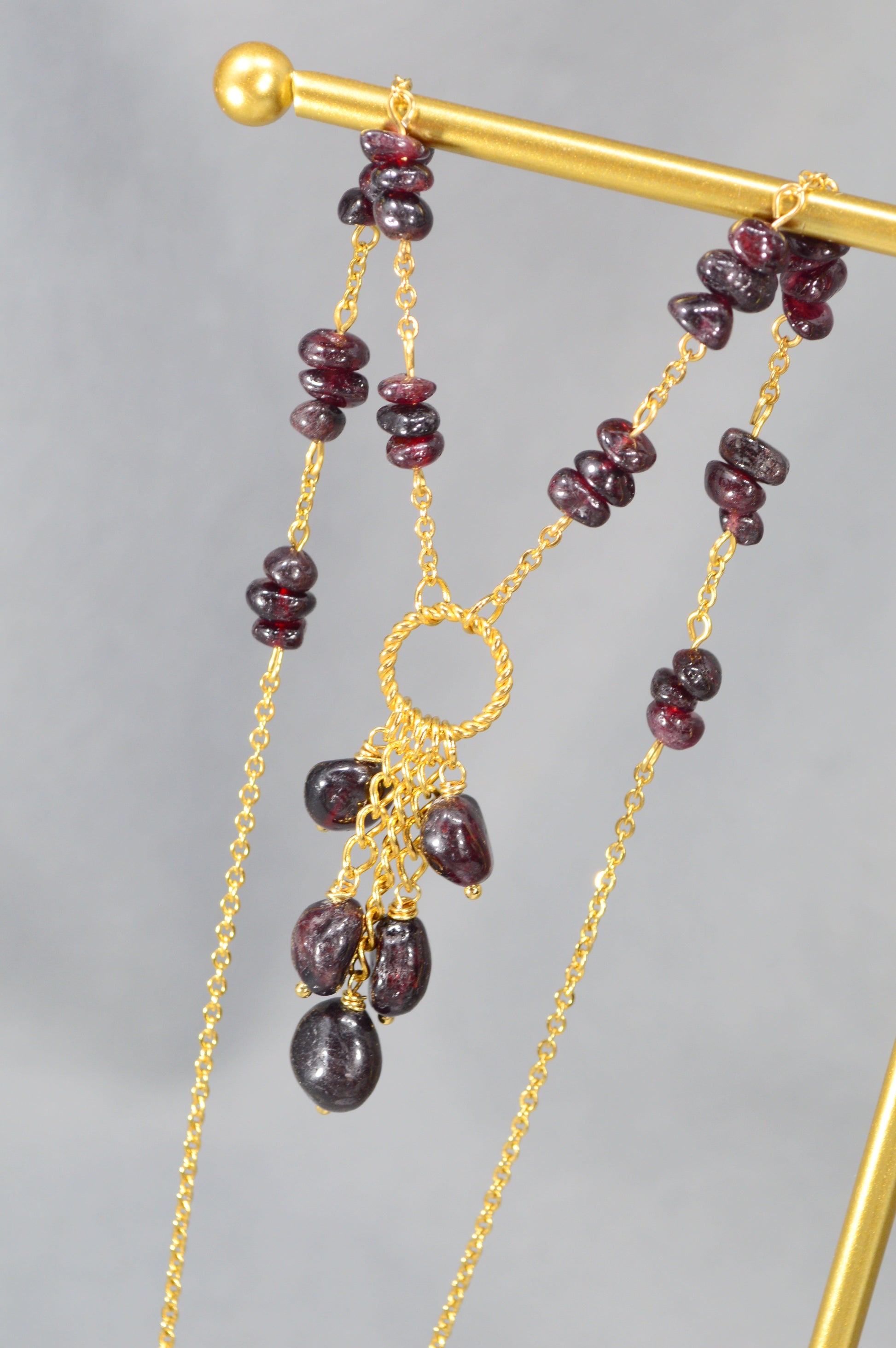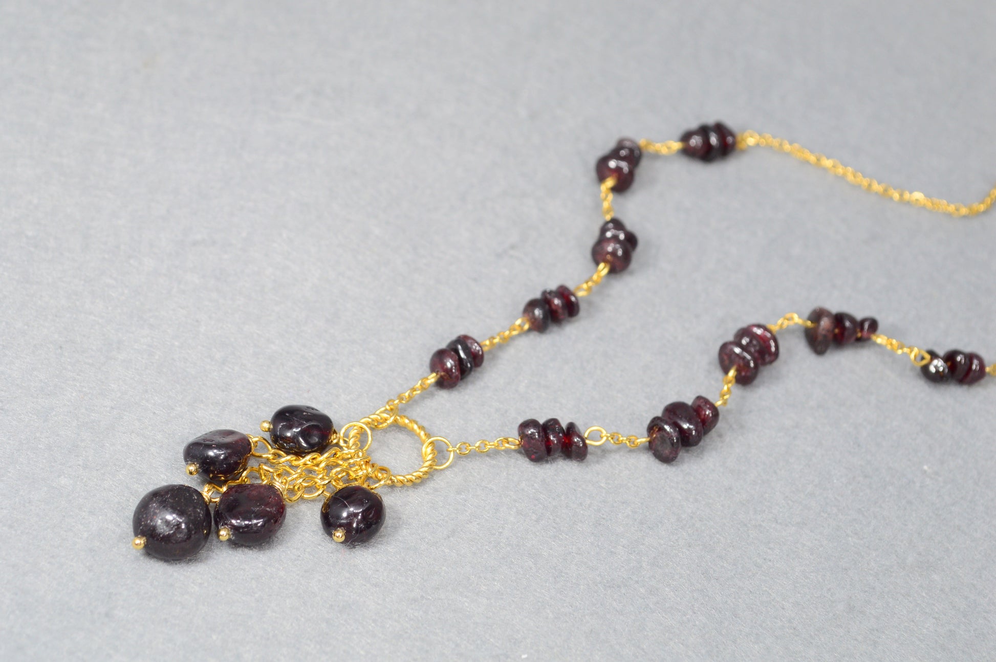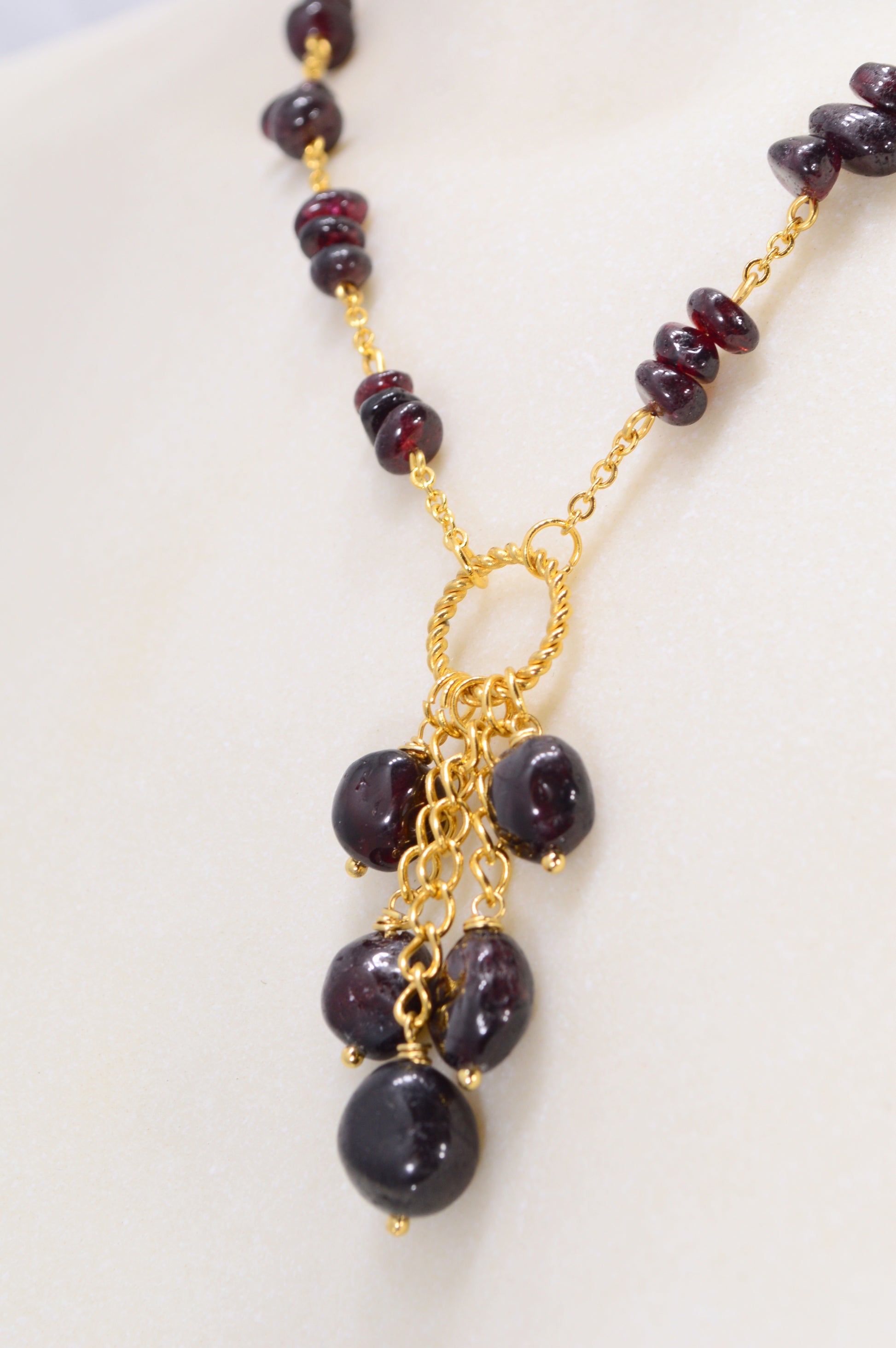 This elegant garnet necklace features deep red natural garnet stones linked with a warm gold-tone chain, creating a rich and luxurious contrast. The design is finished with a cascading cluster of polished garnet drops that add movement and light-catching shine. Garnet is known for its intense color and timeless beauty, making this necklace perfect for evening wear, romantic looks, and sophisticated everyday styling. The combination of fine chain and organic gemstone shapes gives the piece a handcrafted, artisan feel. A striking yet refined statement necklace that highlights the neckline and adds depth, warmth, and character to any outfit.