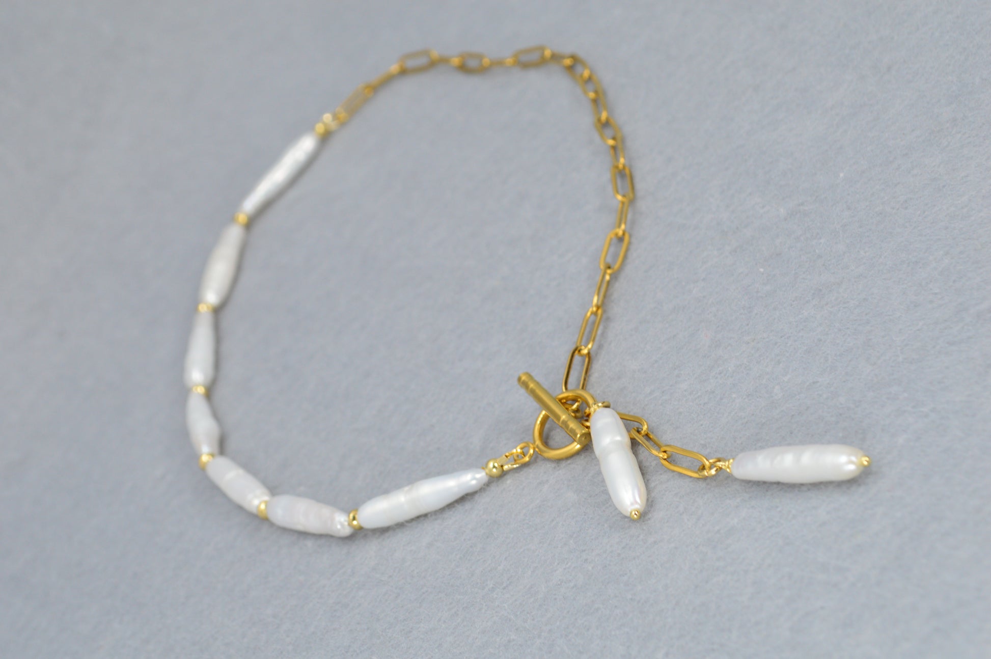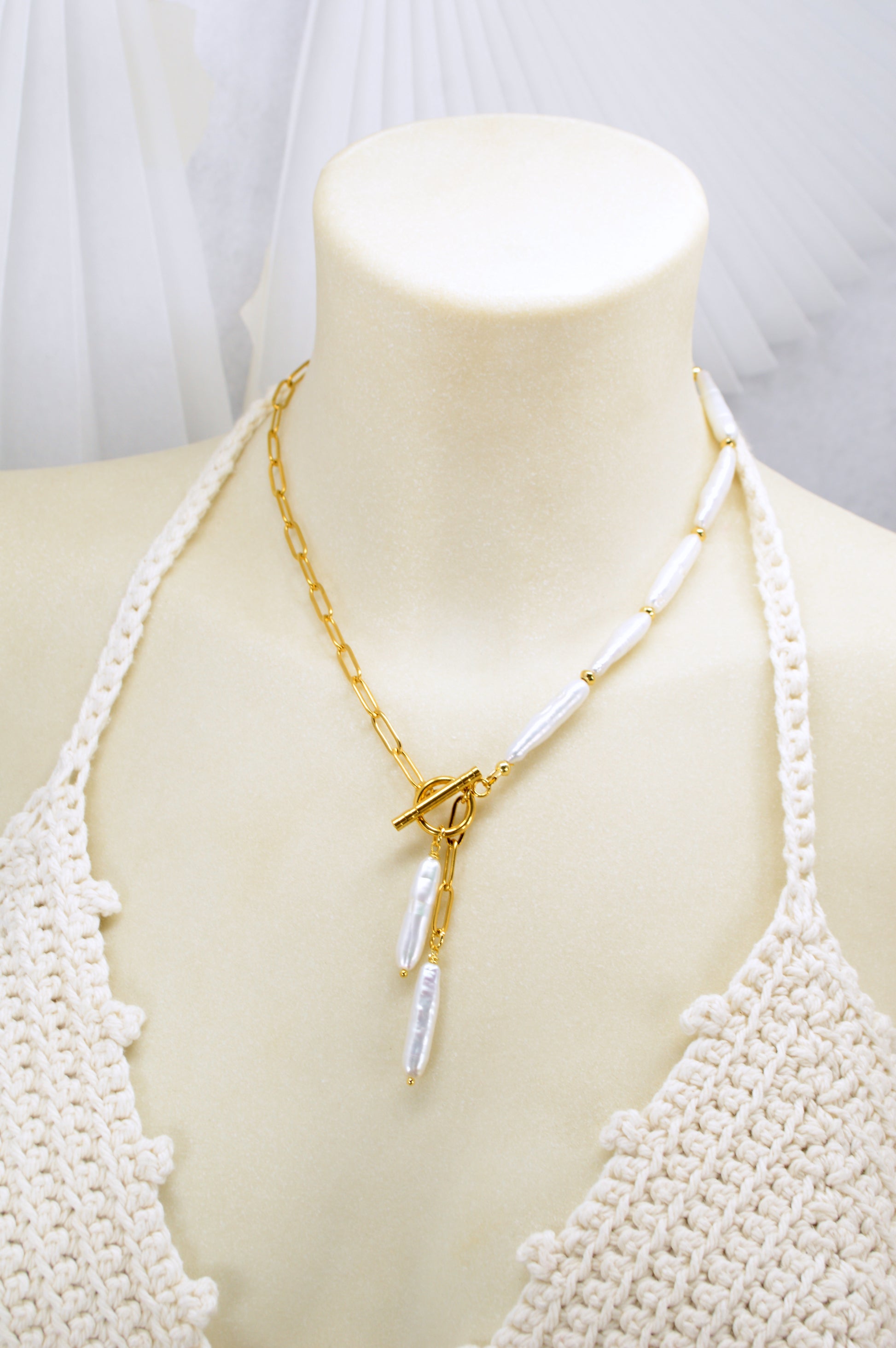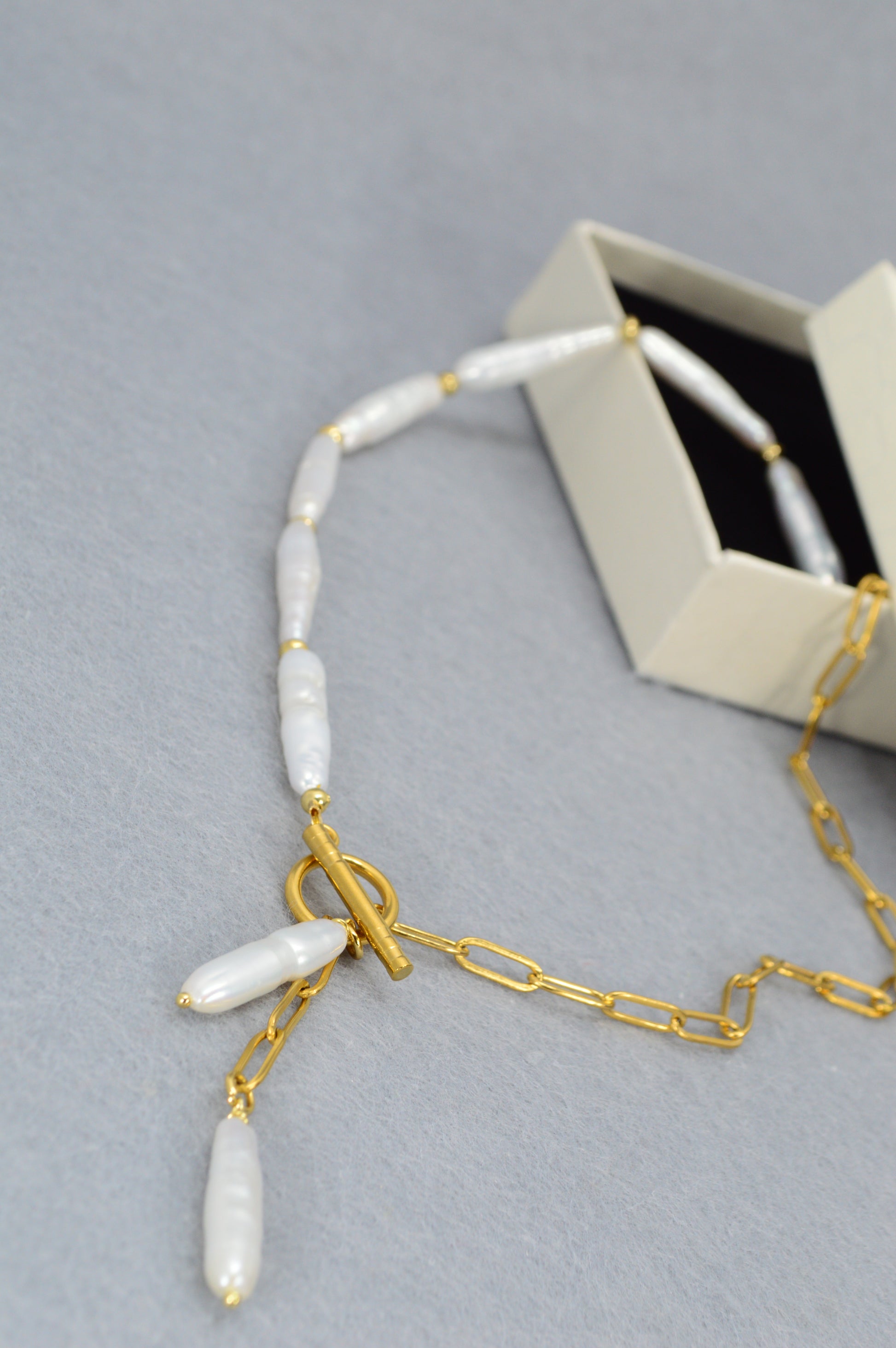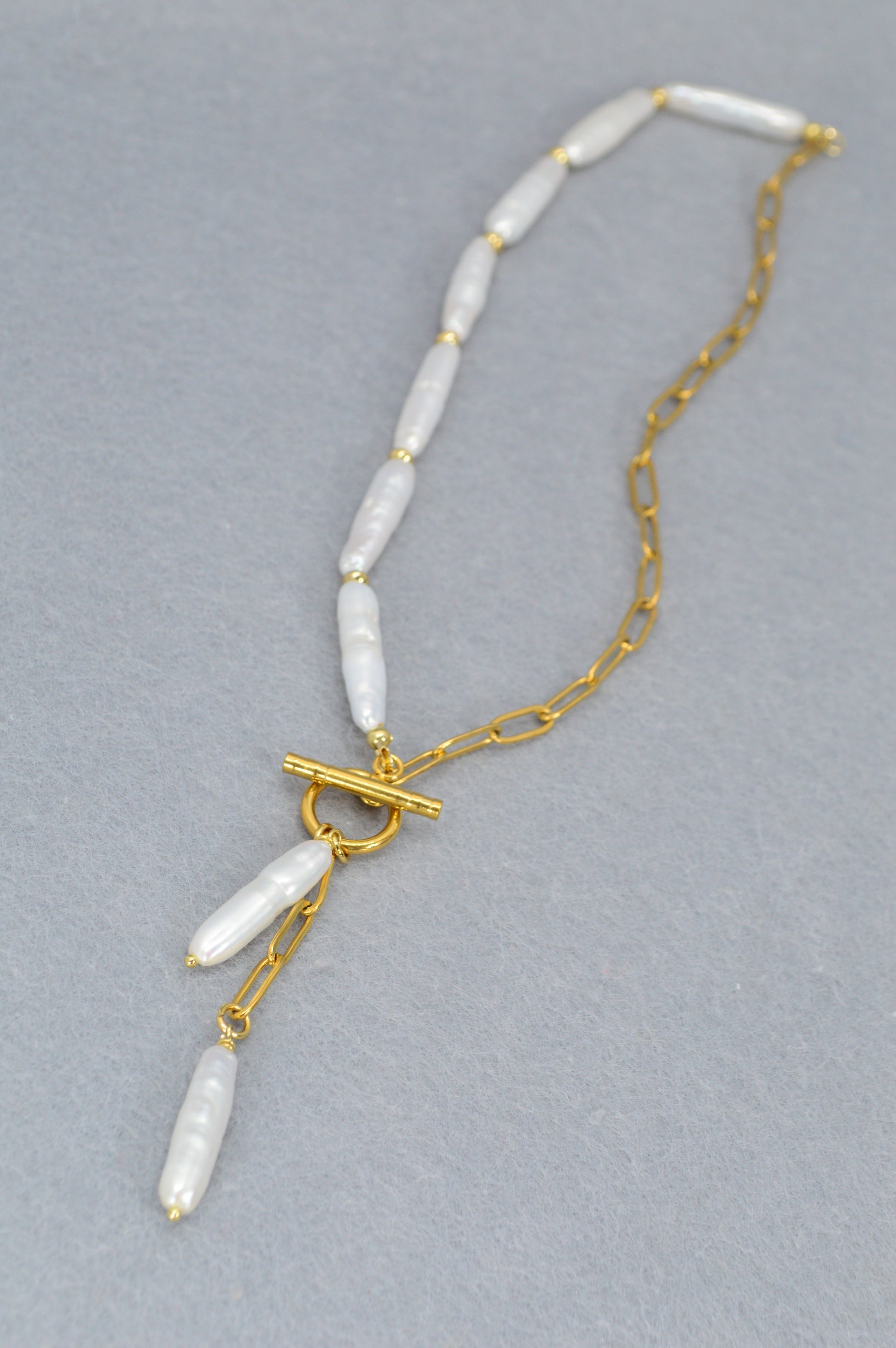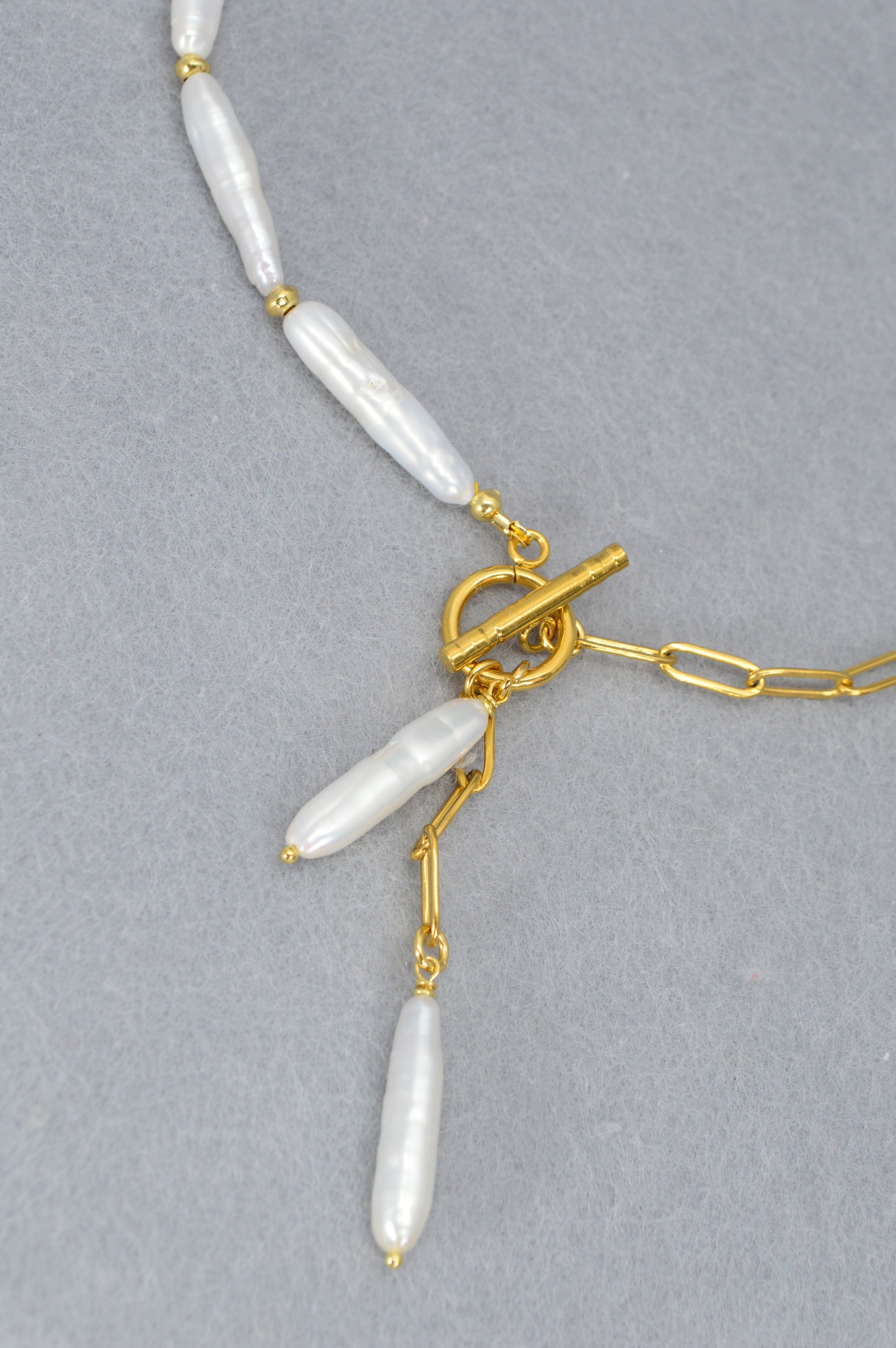 Half of the necklace is crafted from elongated freshwater stick pearls, each separated by delicate gold accents. The other half features a bold gold-plated stainless steel chain.