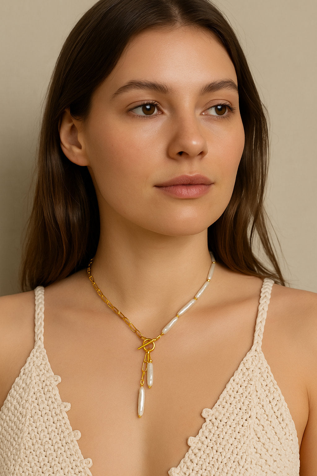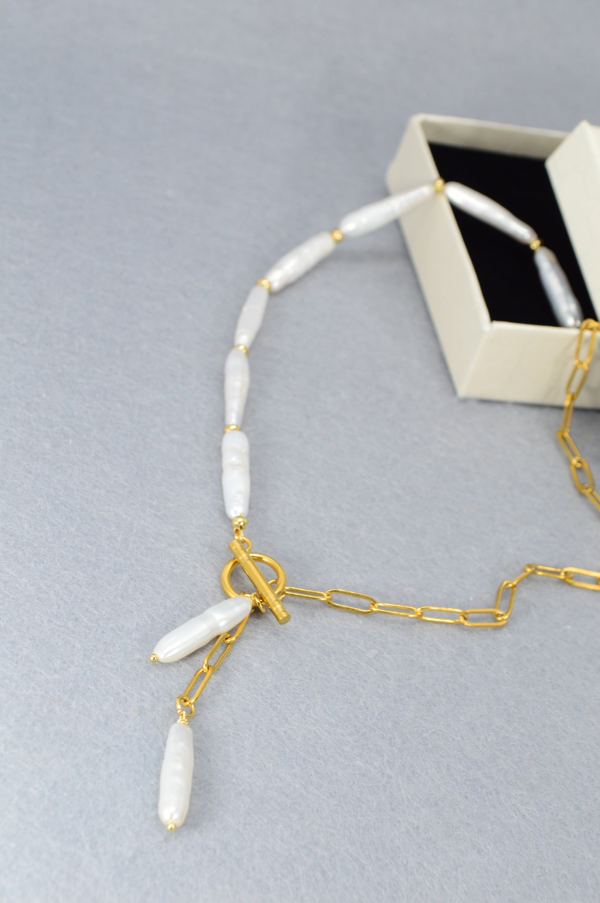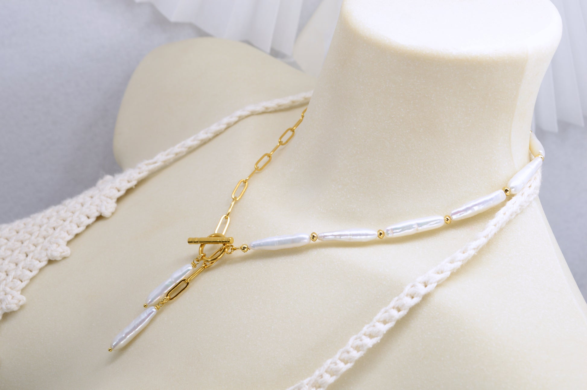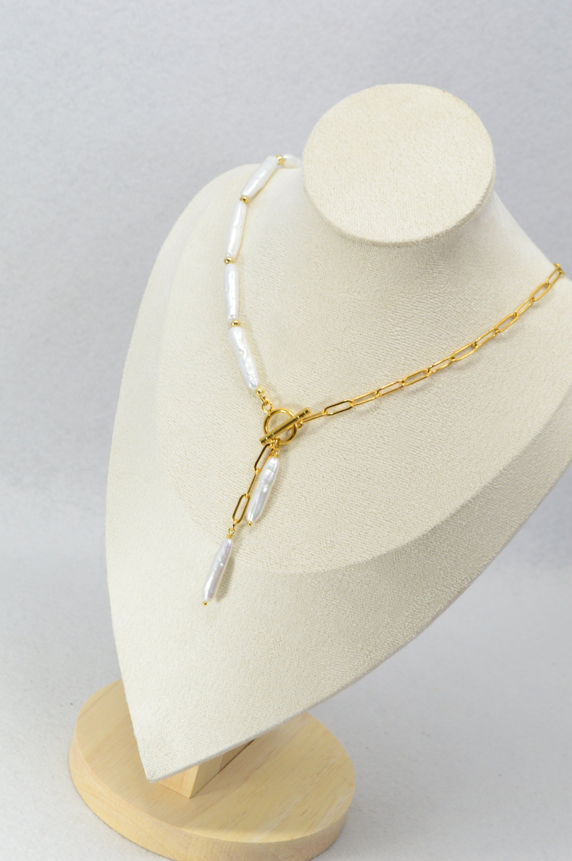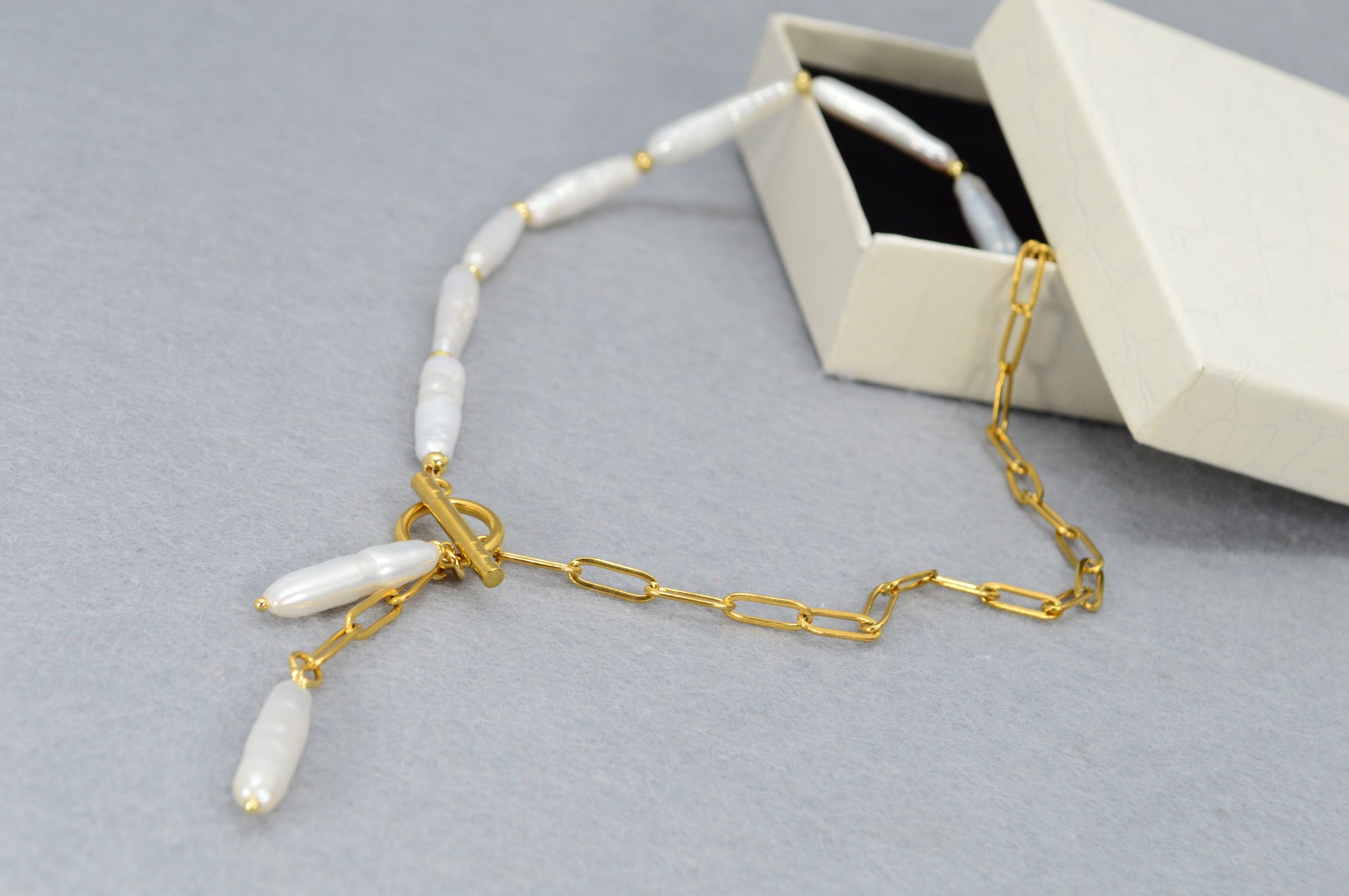 Half of the necklace is crafted from elongated freshwater stick pearls, each separated by delicate gold accents. The other half features a bold gold-plated stainless steel chain.