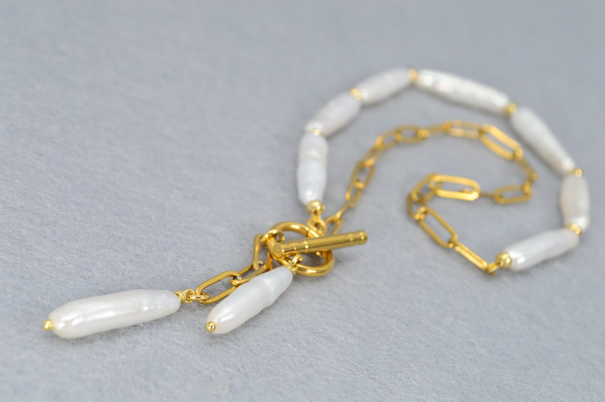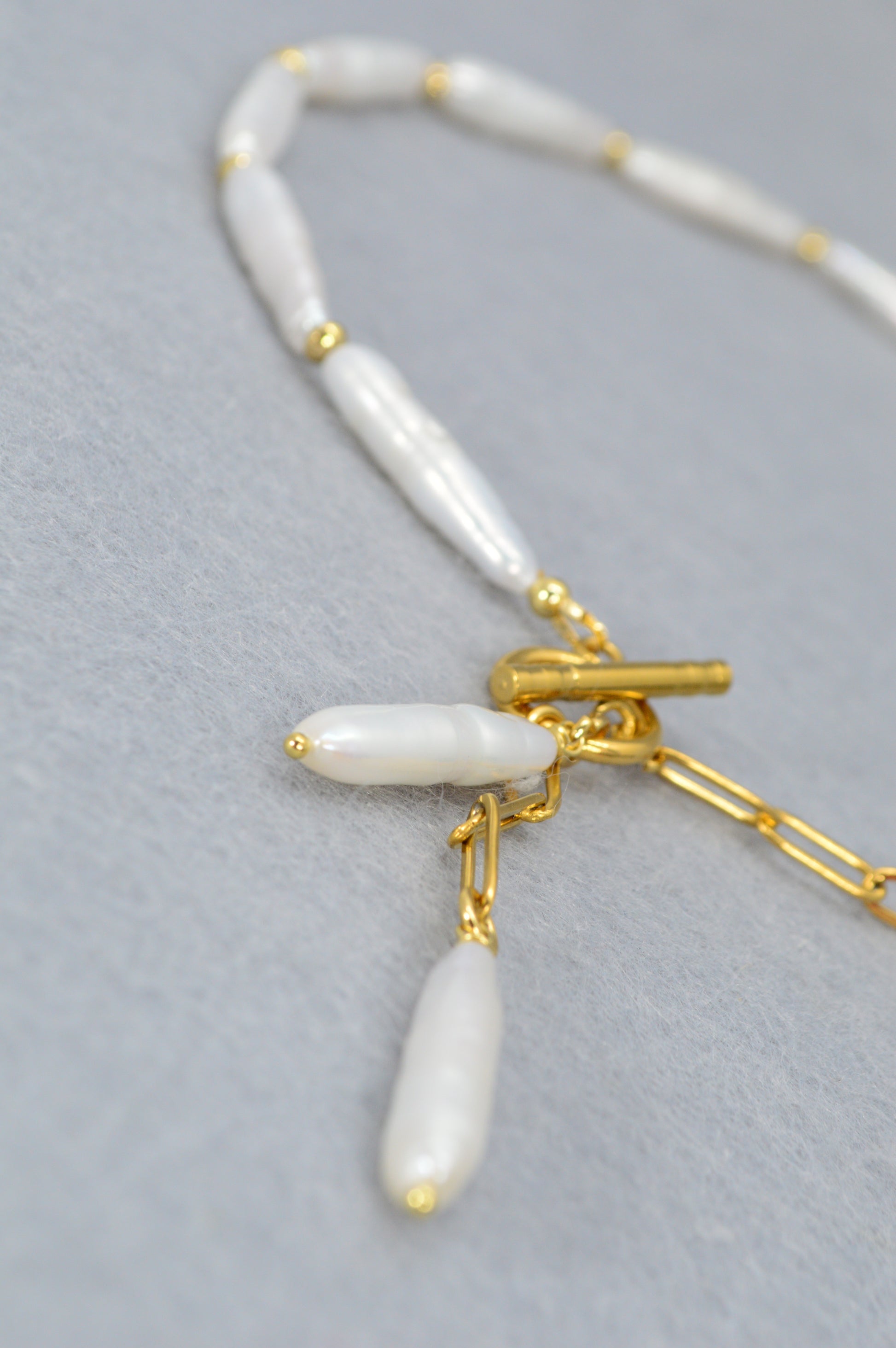 Two unique baroque stick pearls dangle from the toggle clasp, adding movement and individuality to the piece.