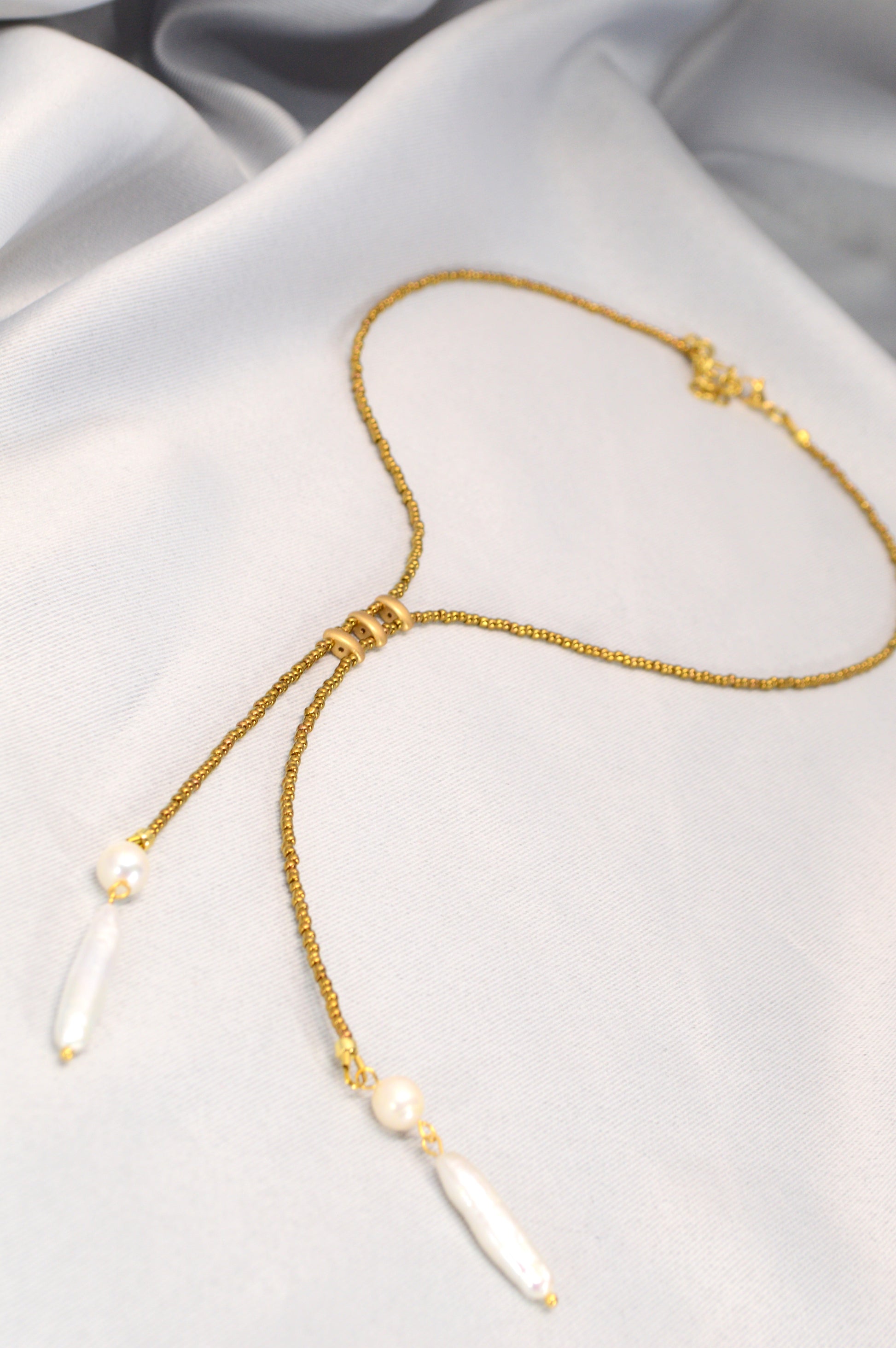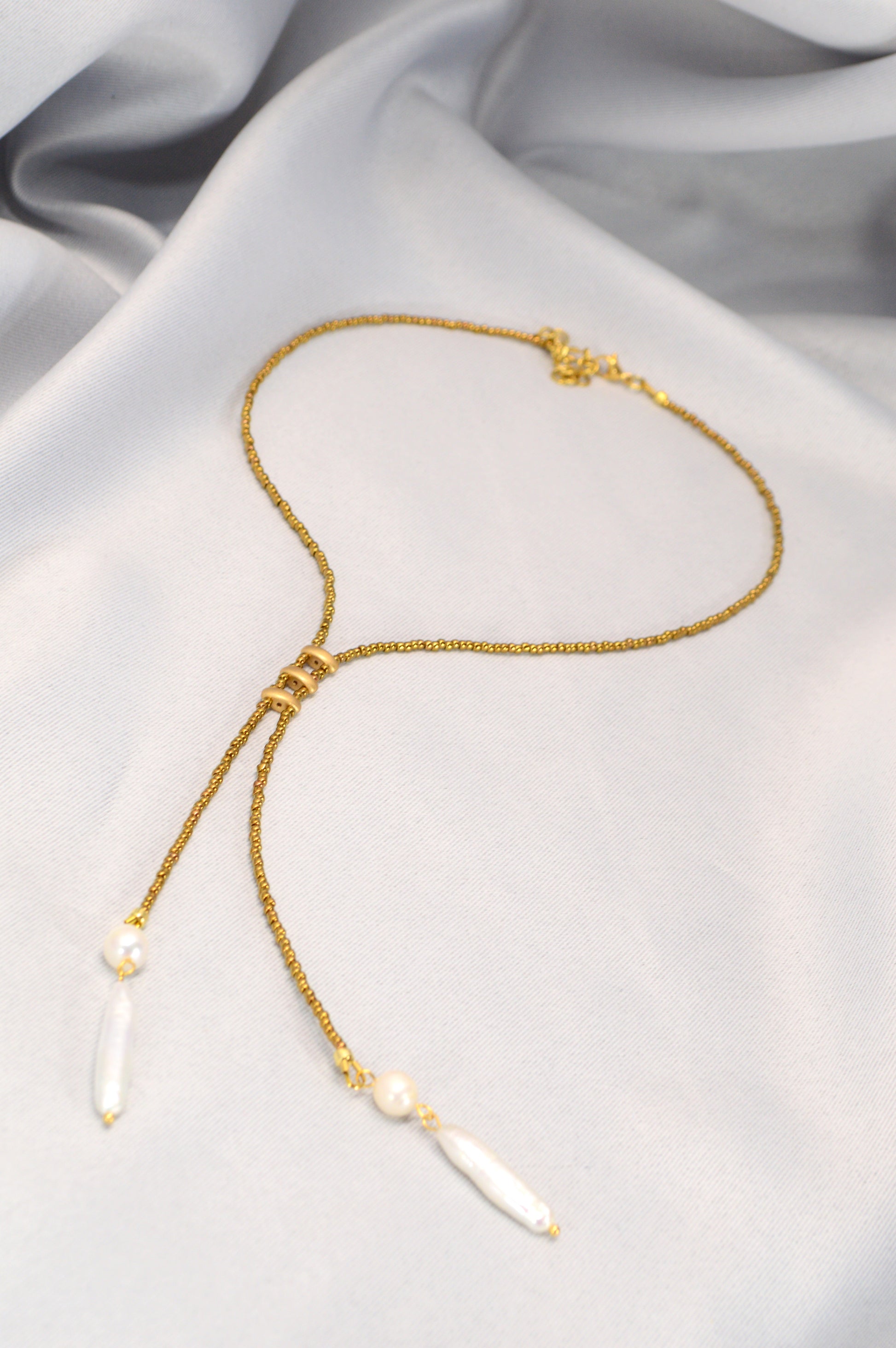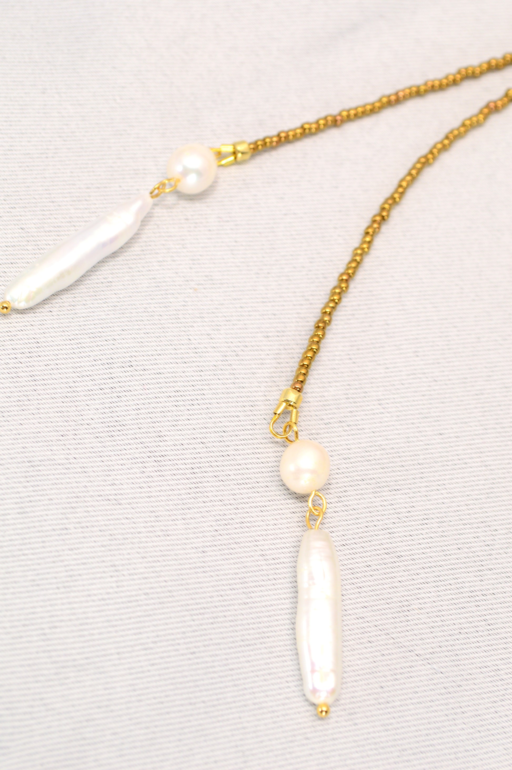 Delicate boho-inspired lariat necklace made with matte gold seed beads and natural freshwater pearls. The two drops feature one stick pearl and one round pearl, giving the piece an elegant, organic look with soft natural shine.