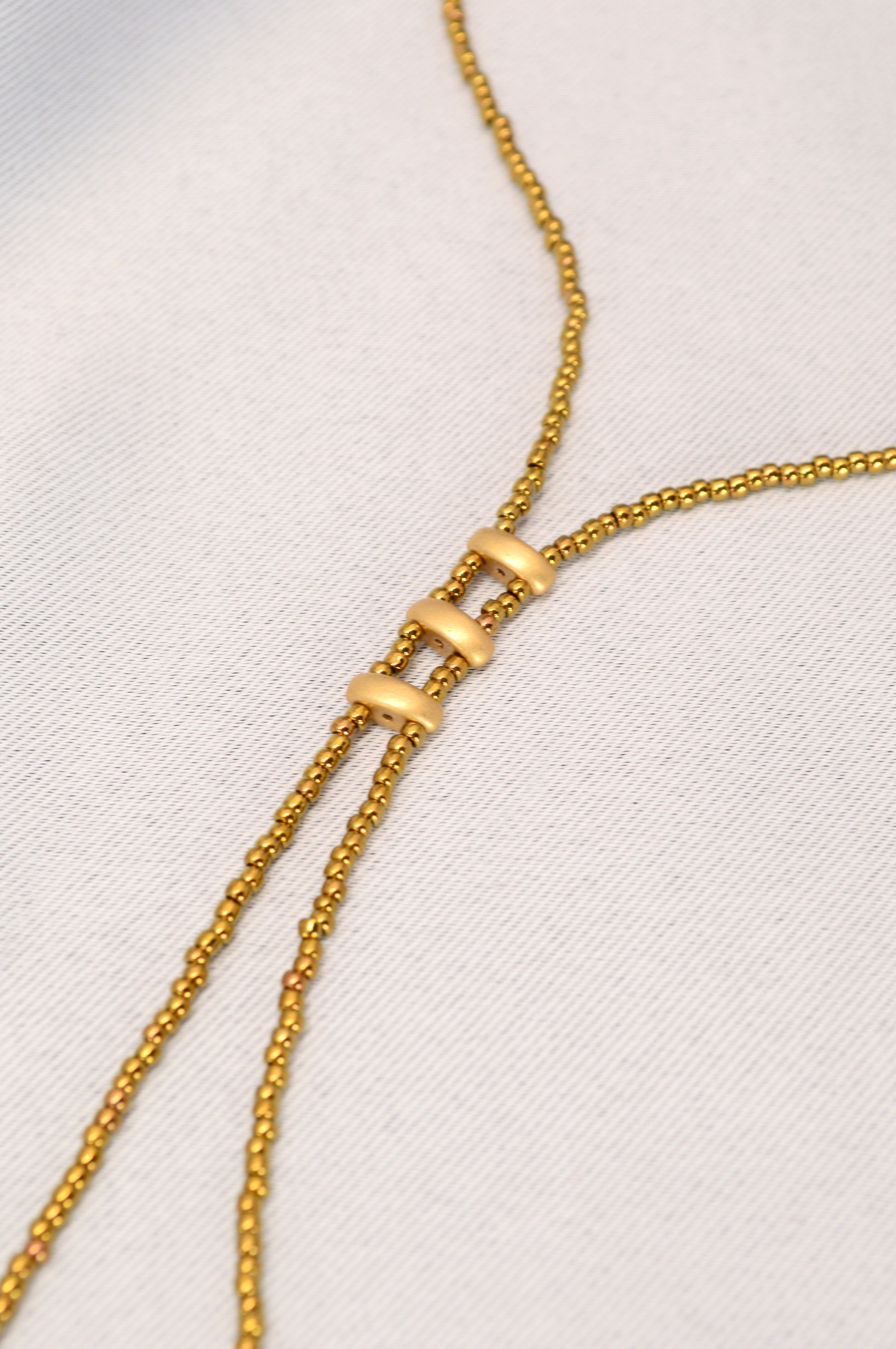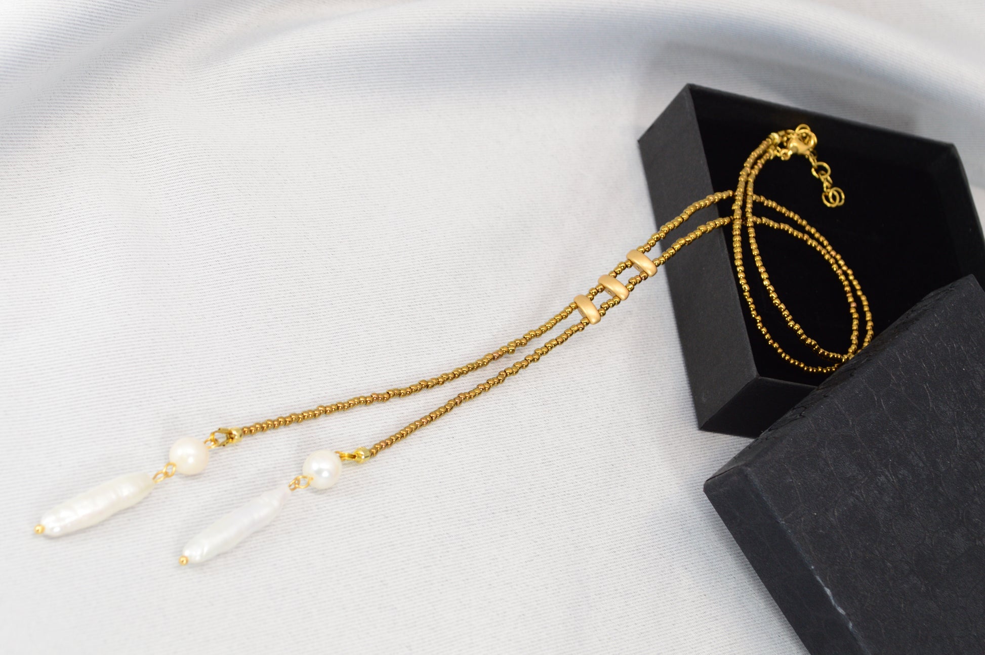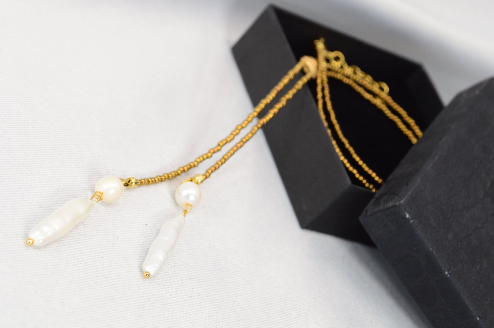 Delicate boho-inspired lariat necklace made with matte gold seed beads and natural freshwater pearls. The two drops feature one stick pearl and one round pearl, giving the piece an elegant, organic look with soft natural shine.