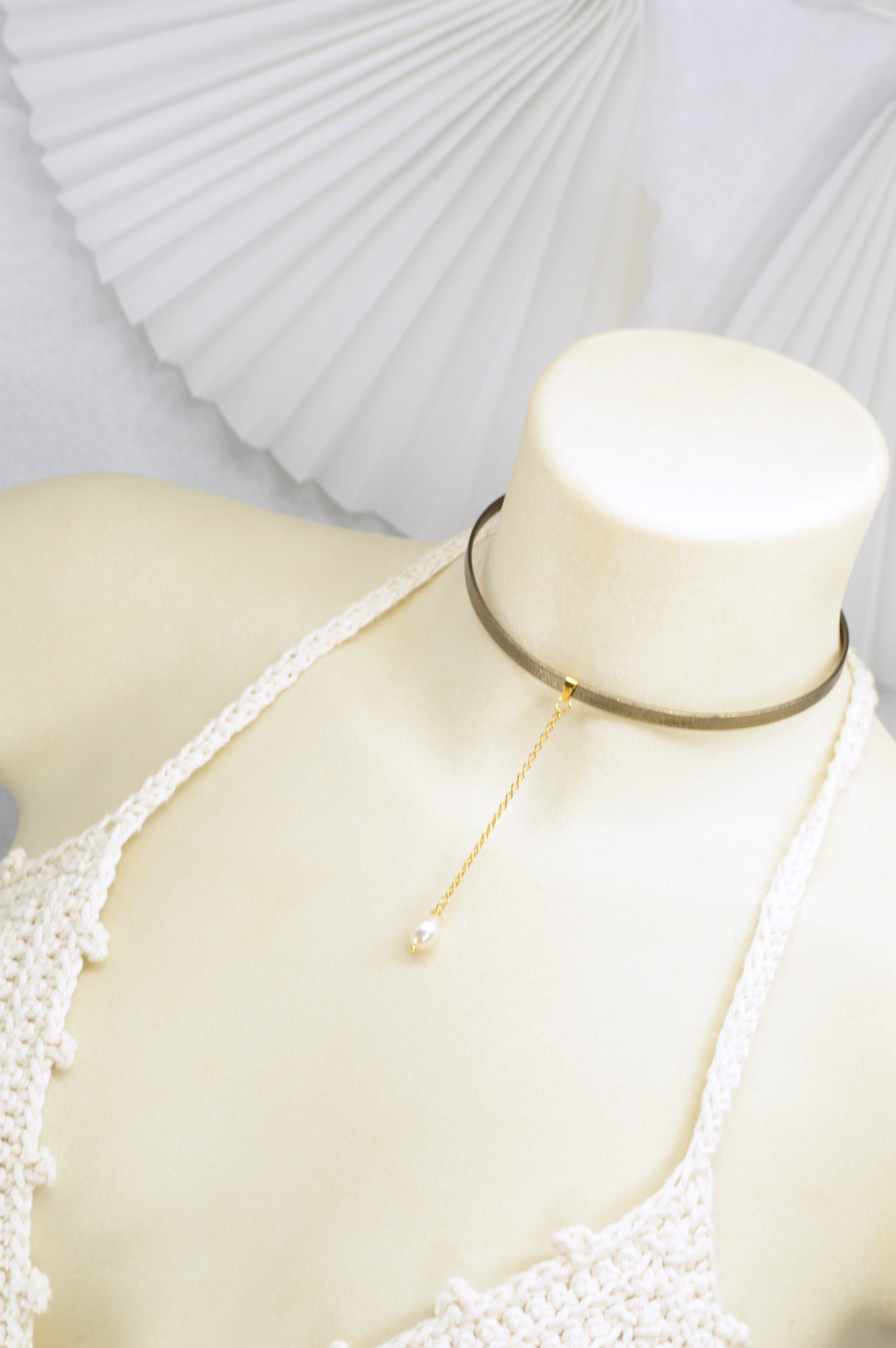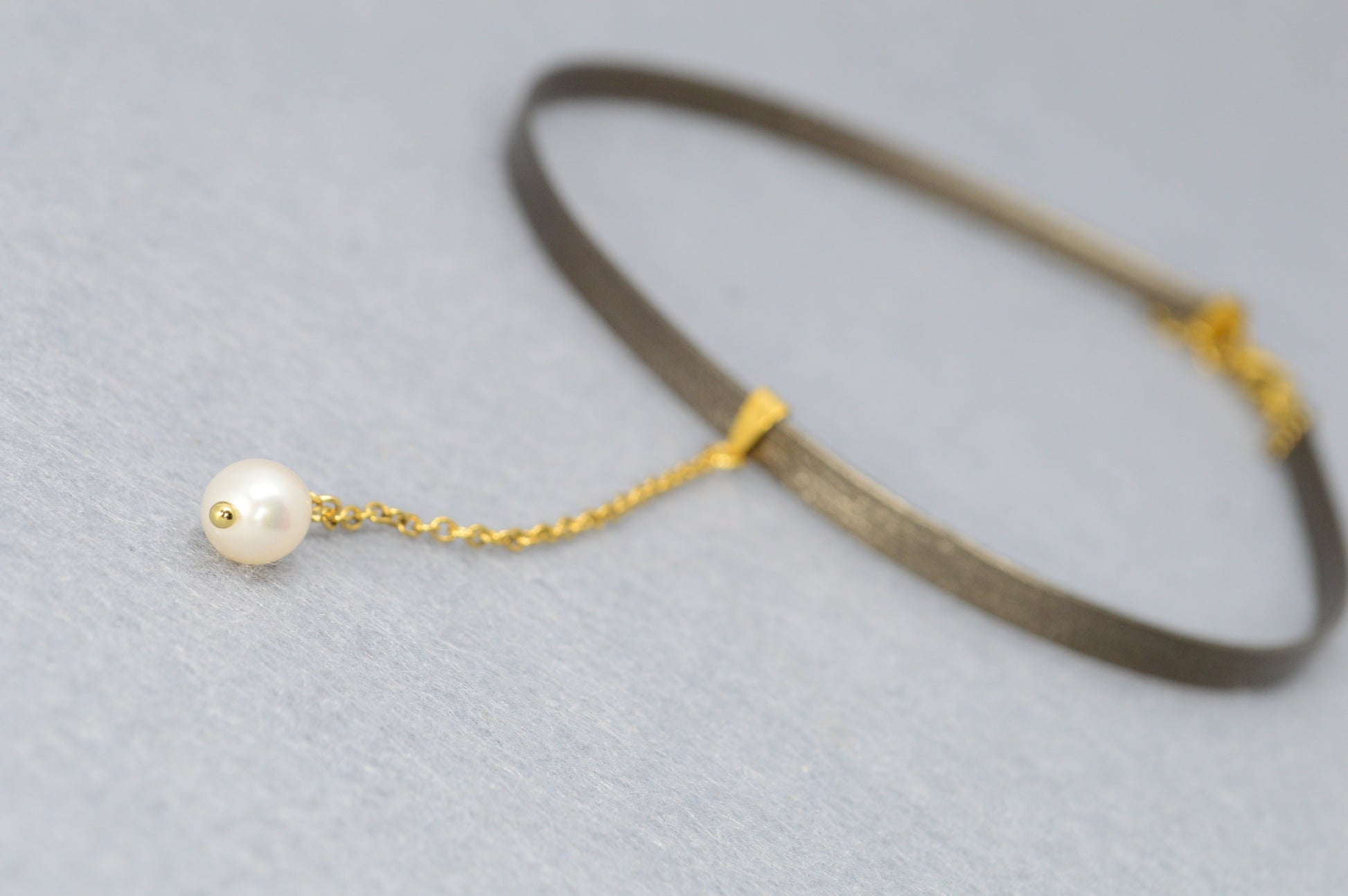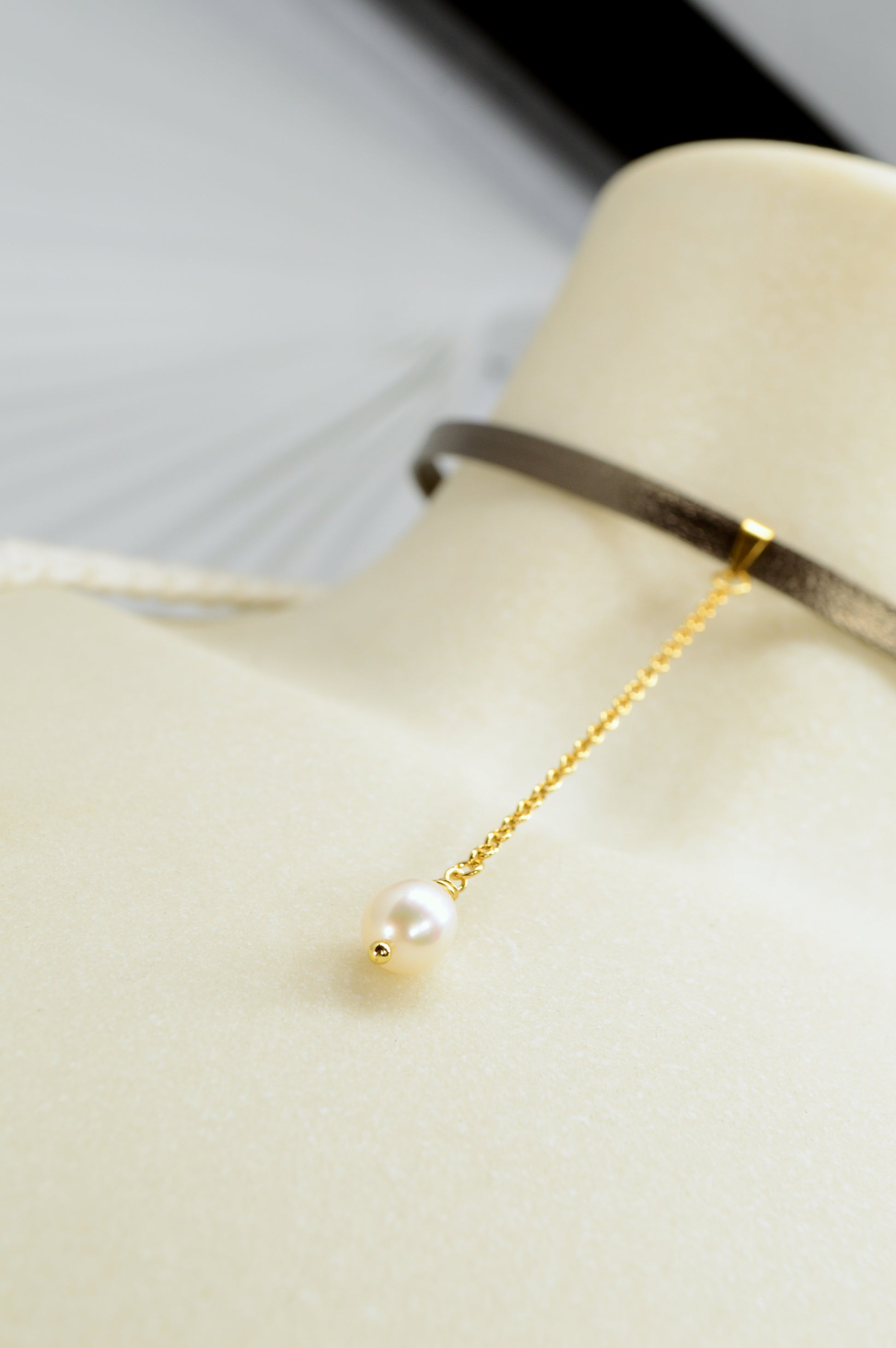Luxurious Contrast: Sleek leather choker meets a delicate gold chain and luminous pearl — edgy and refined all at once.