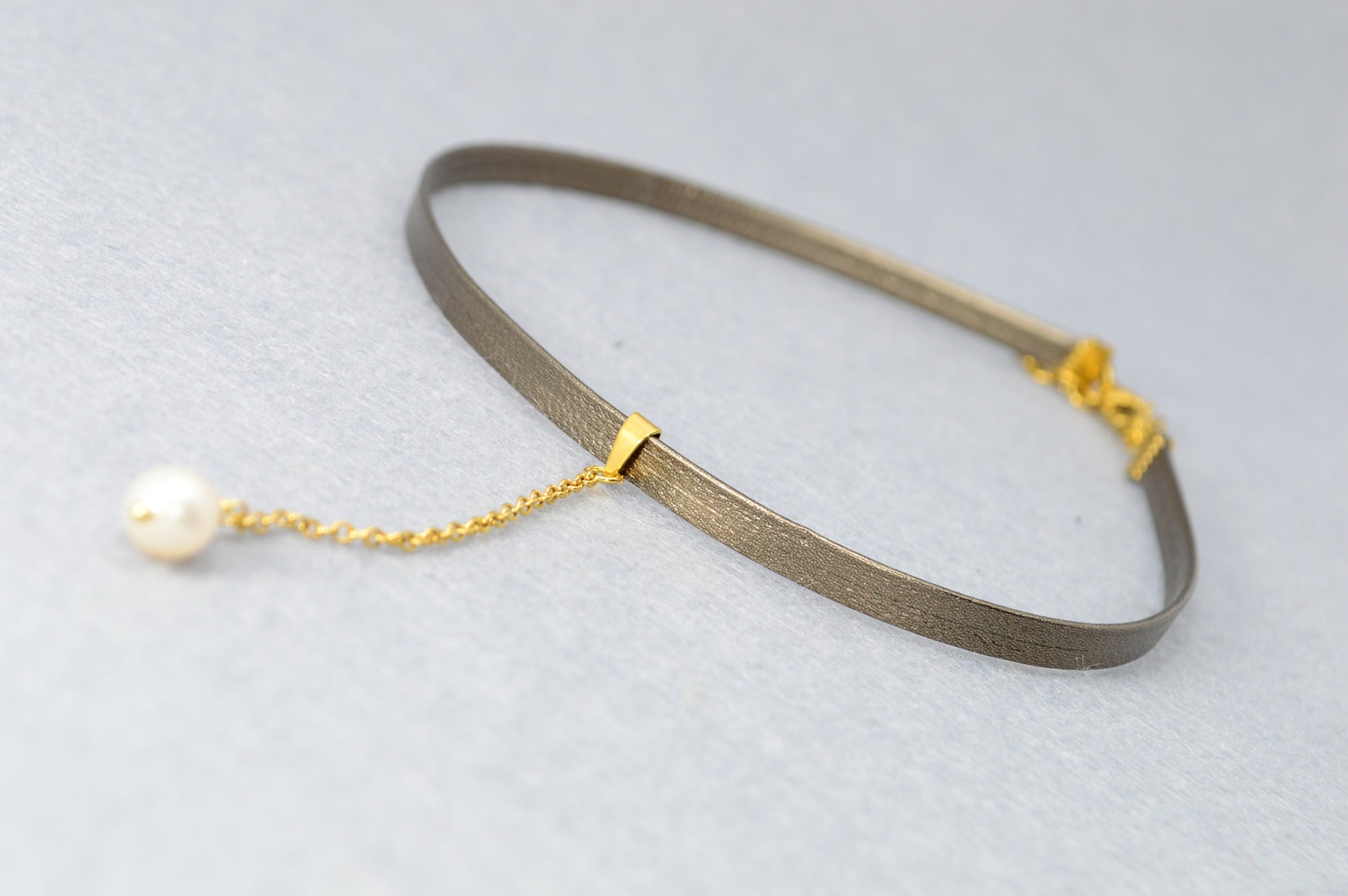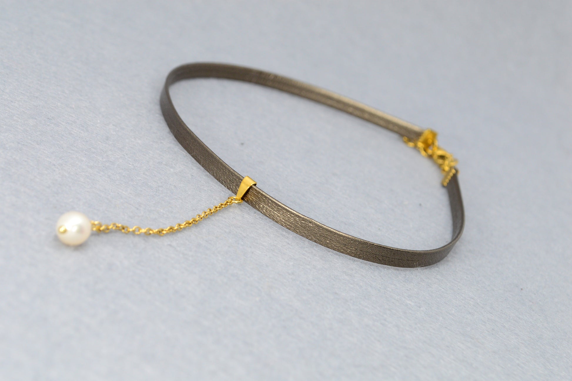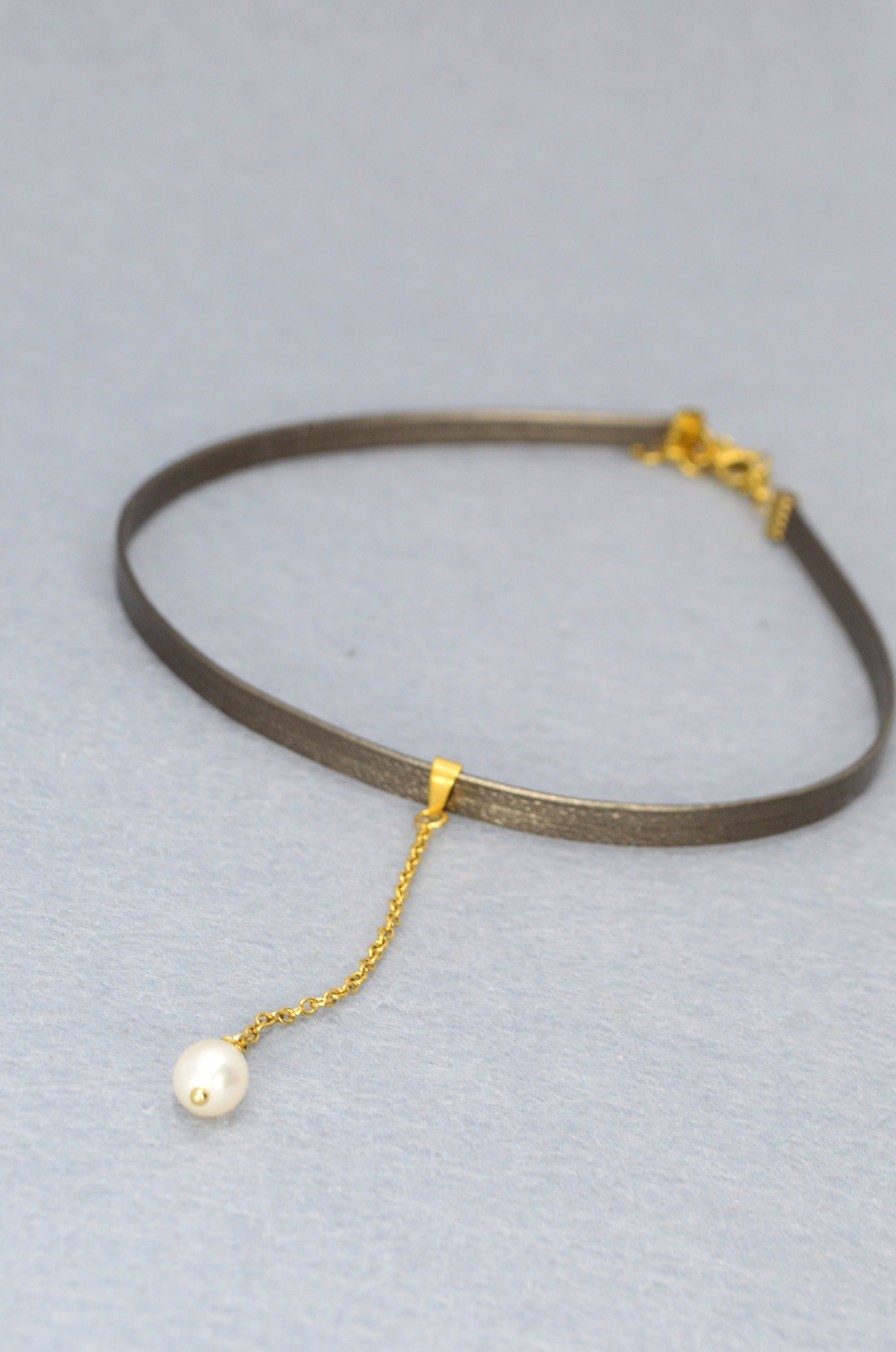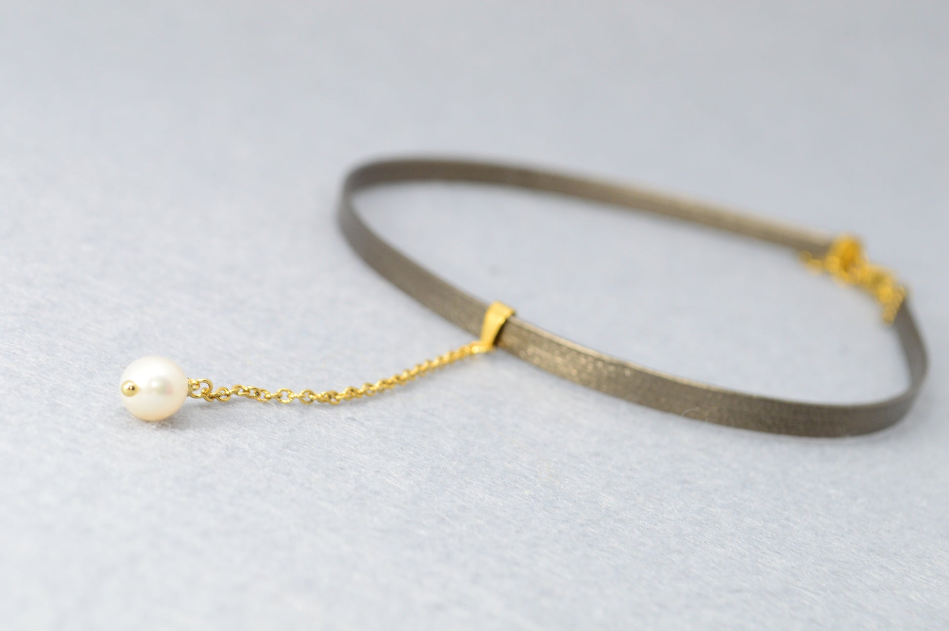 Luxurious Contrast: Sleek leather choker meets a delicate gold chain and luminous pearl — edgy and refined all at once.