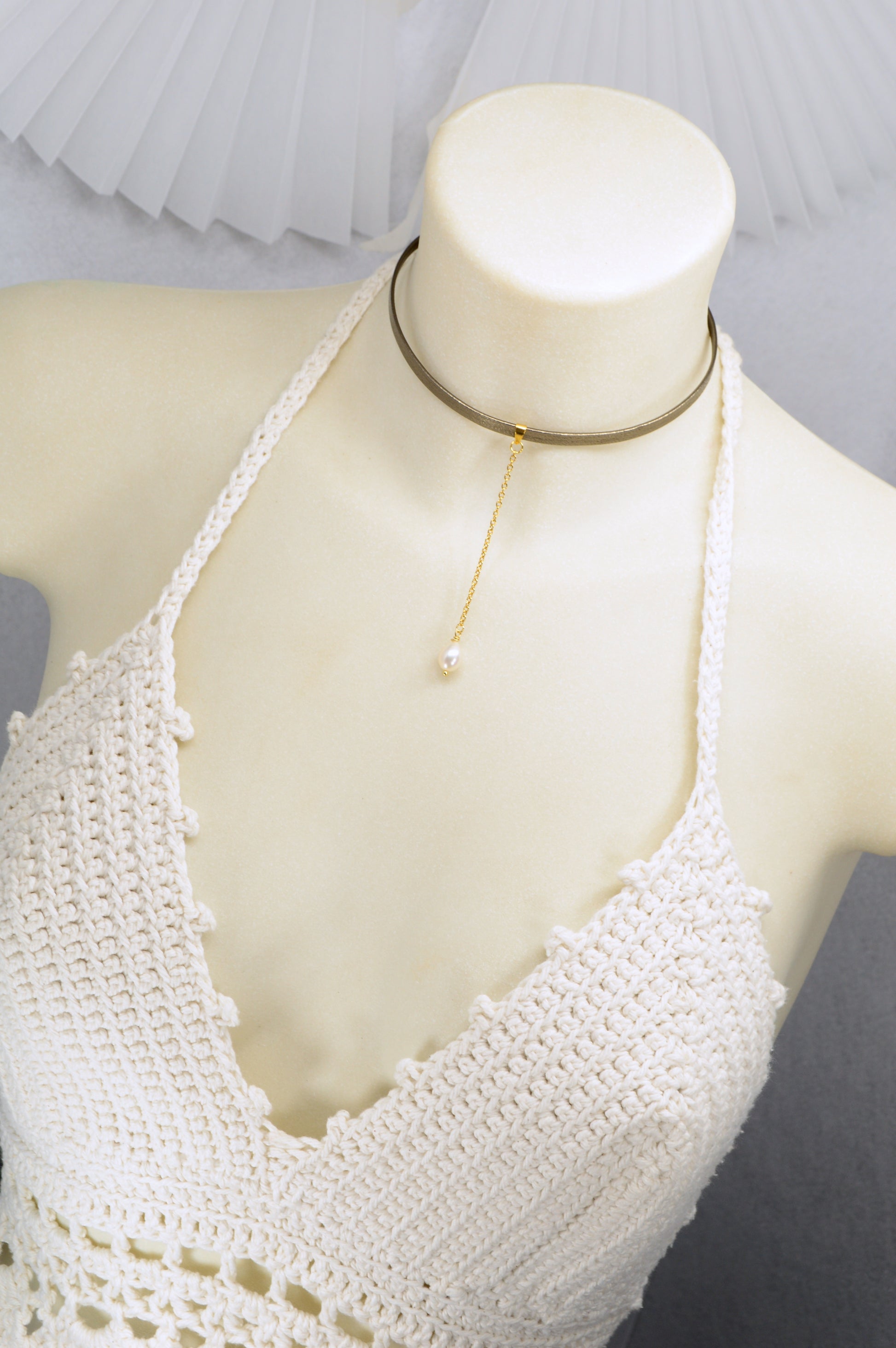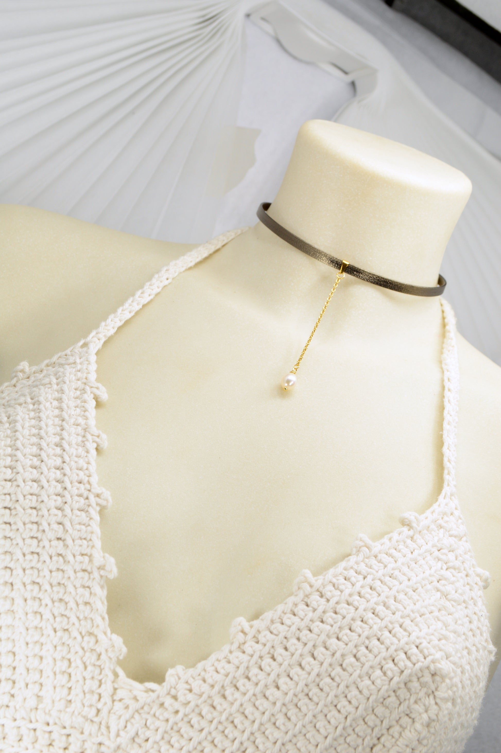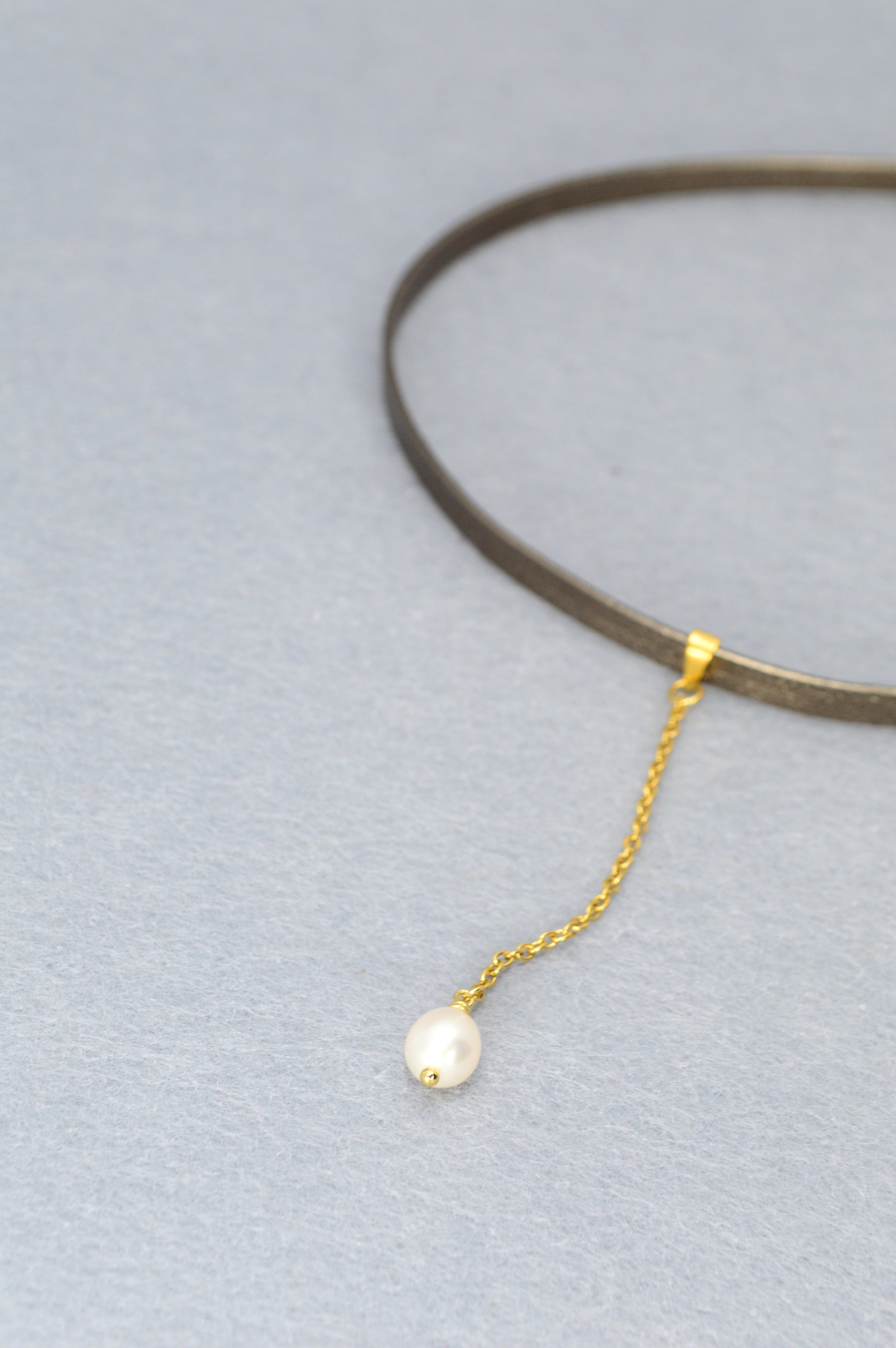 Gold Chain Pearl Drop Choker – Leather Band Necklace | Modern Minimalist Y Choker | Statement Jewelry for Women