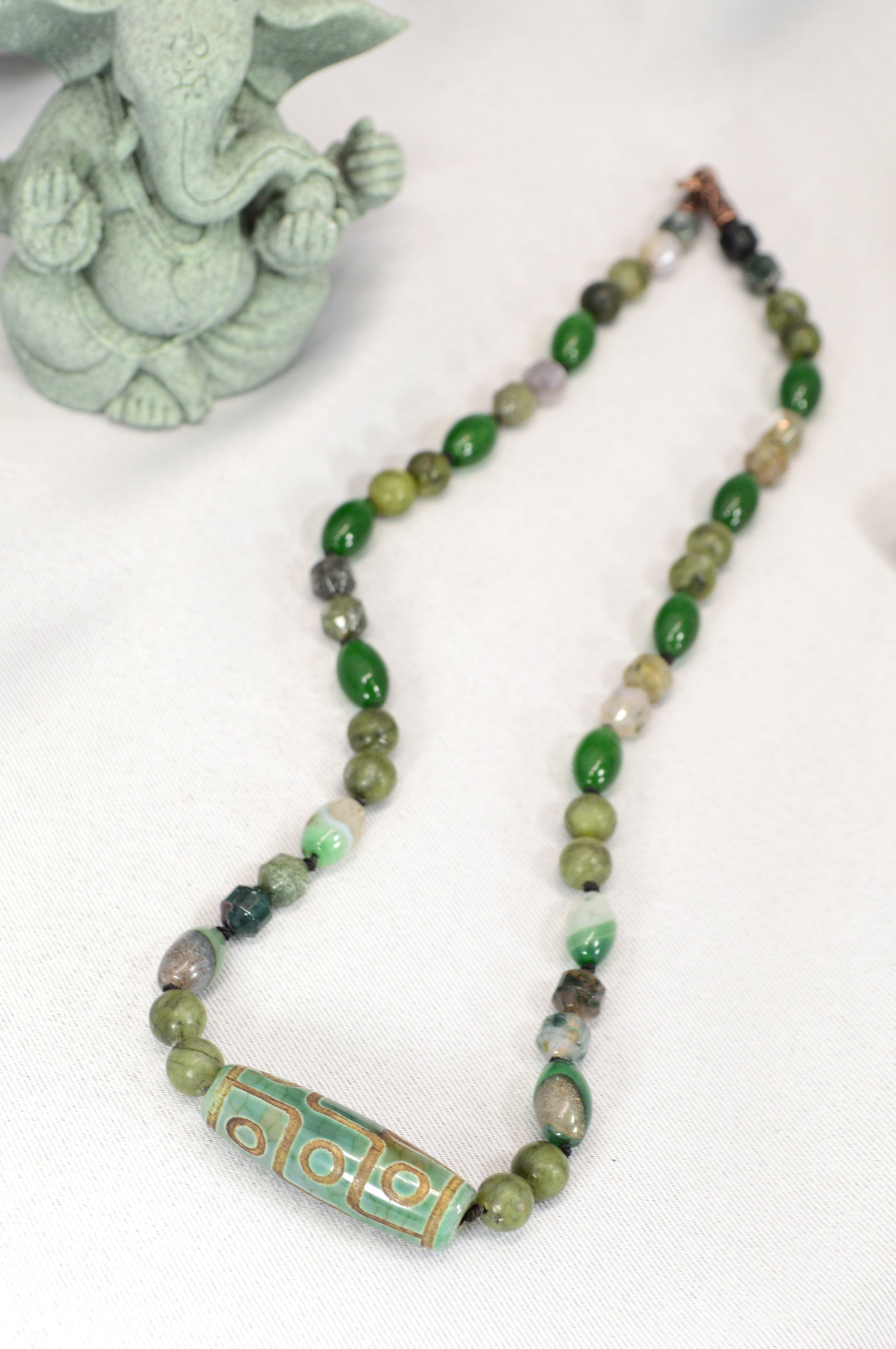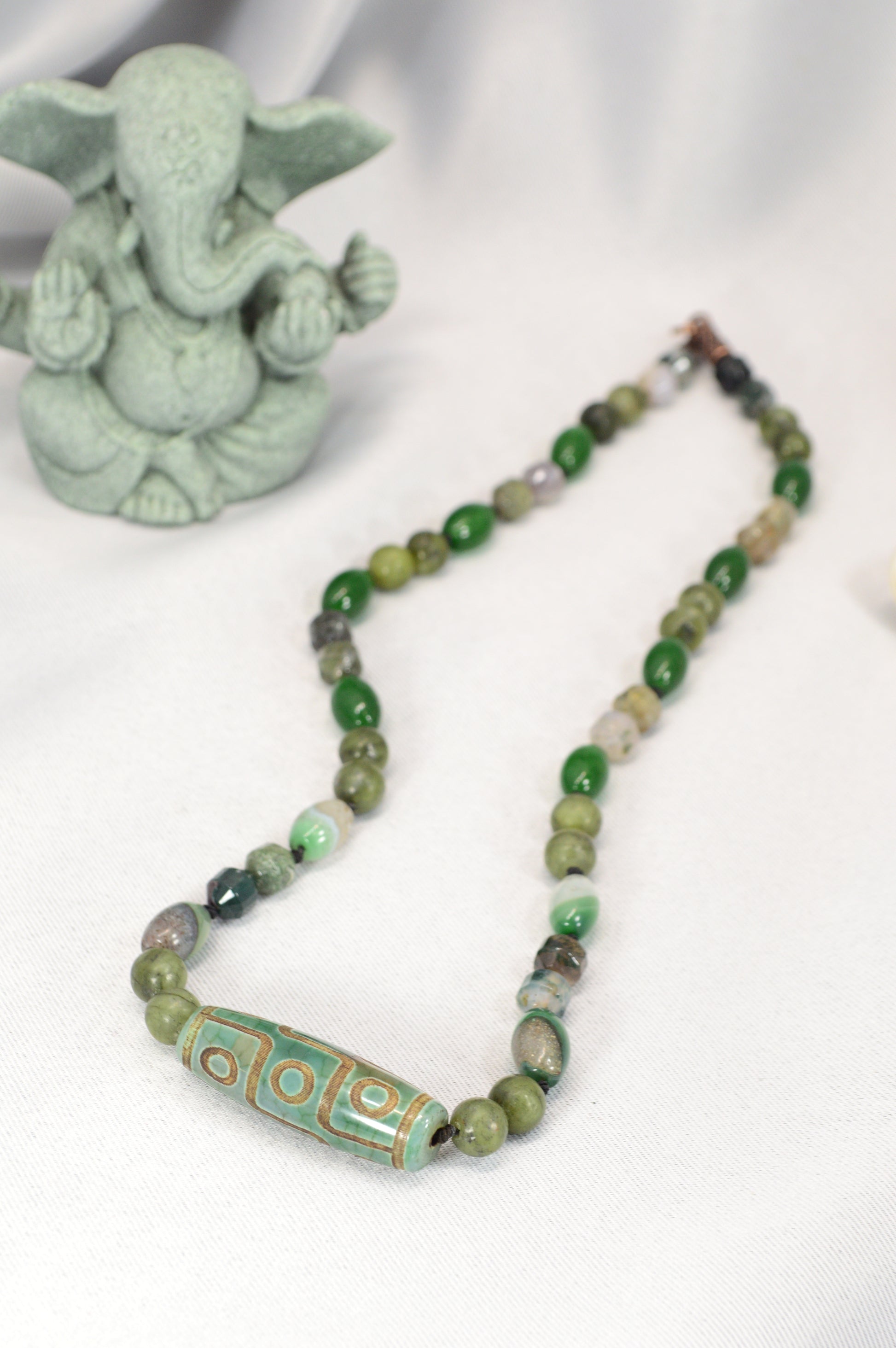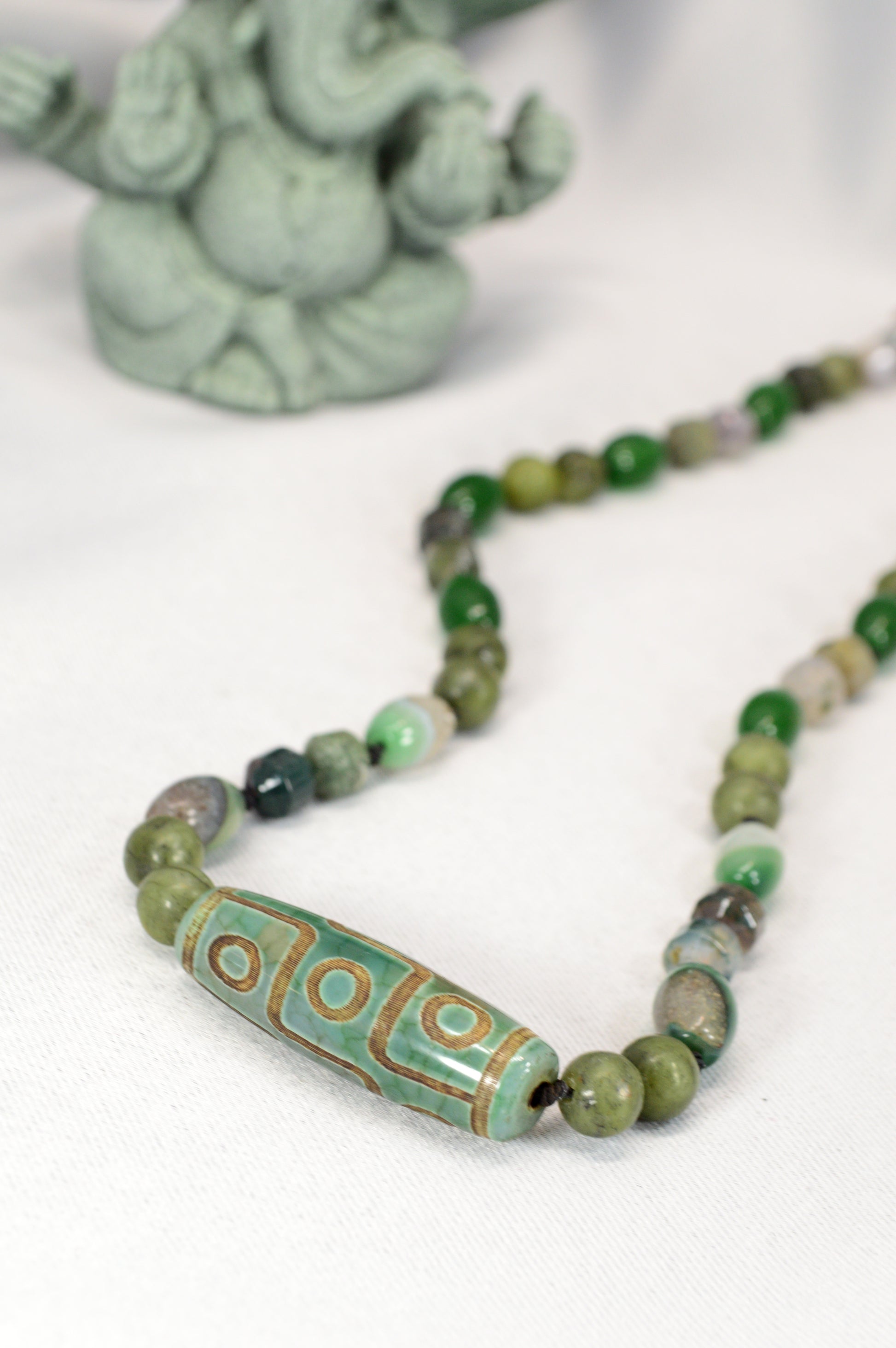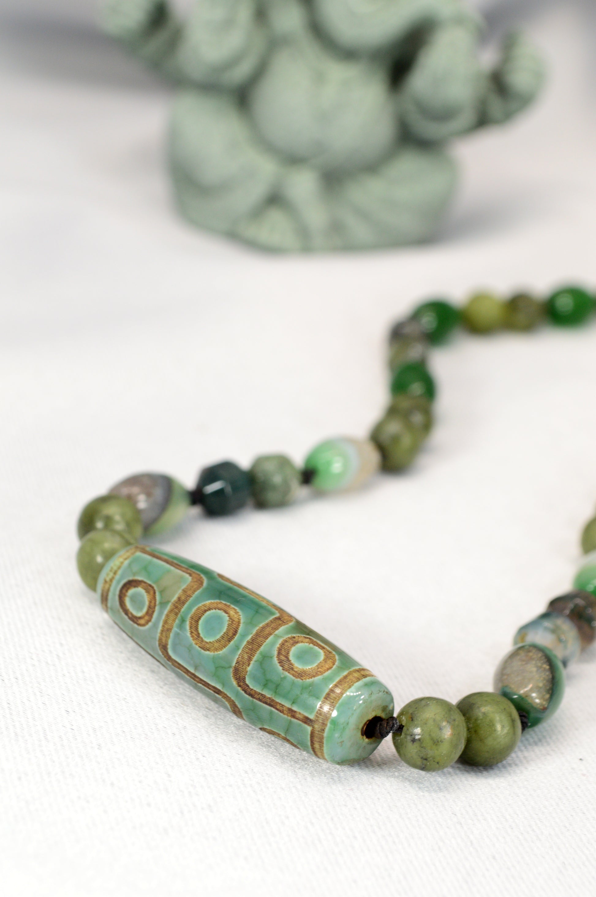 Green Agate, Jade, Esmeralda & Tibetan Dzi Bead Necklace – Boho Healing Stone Jewelry